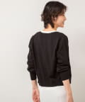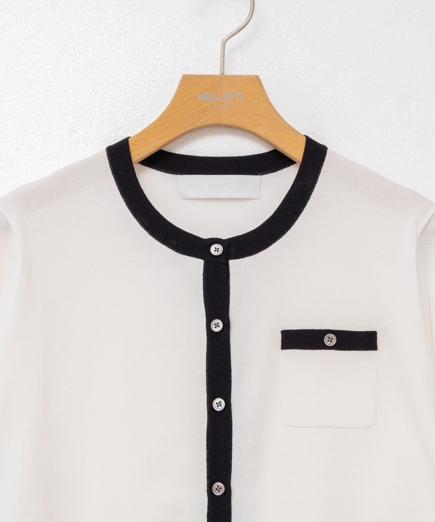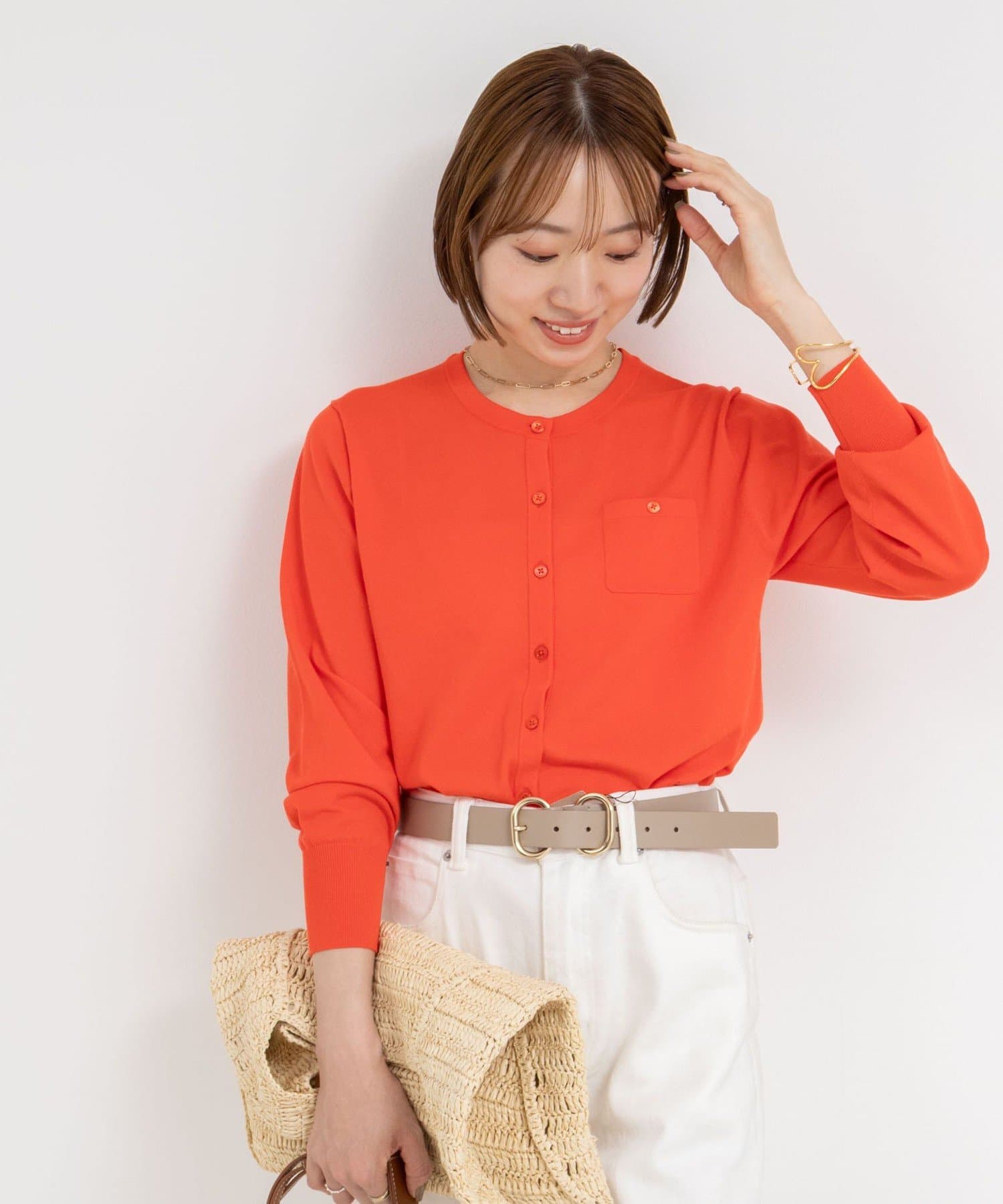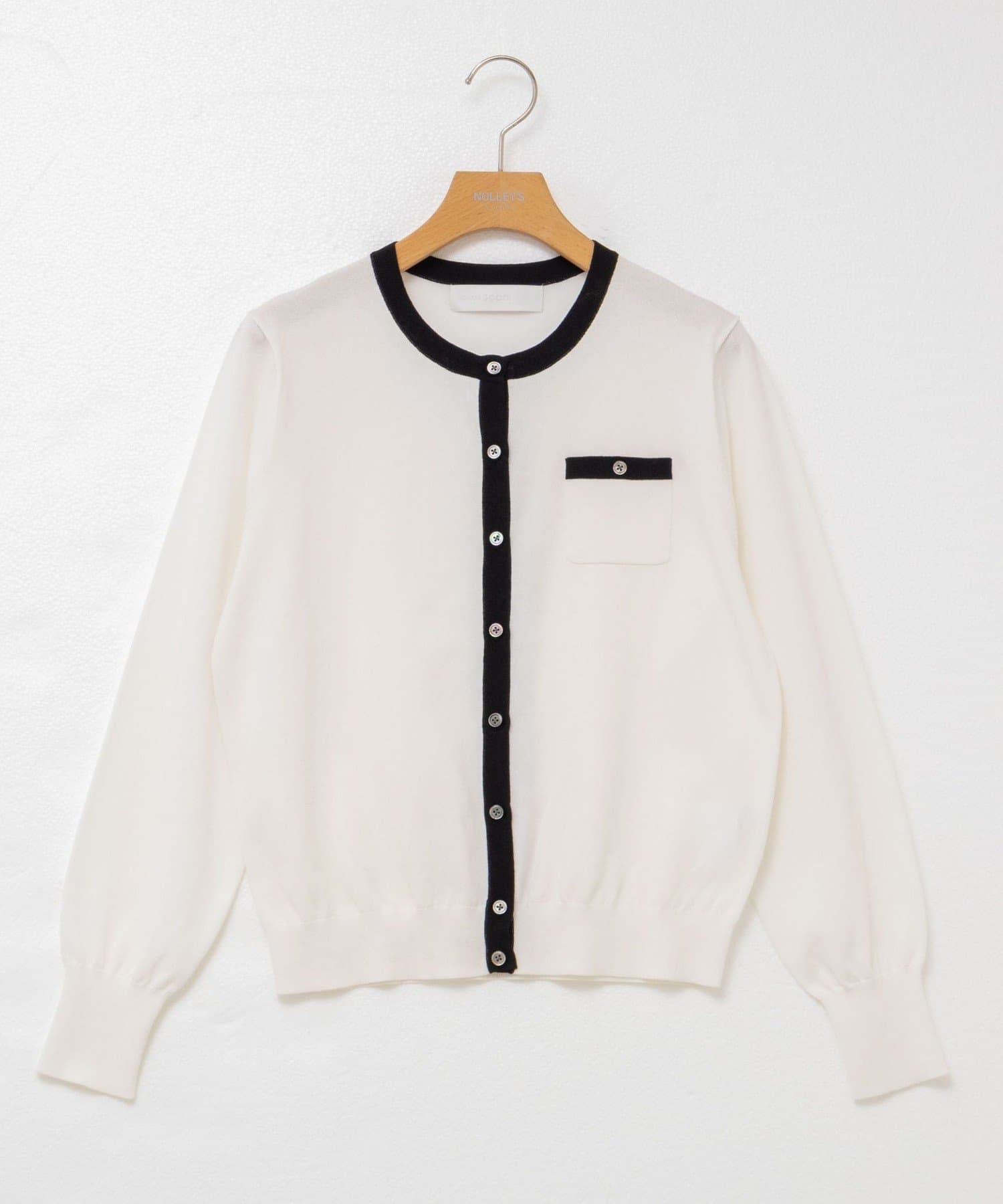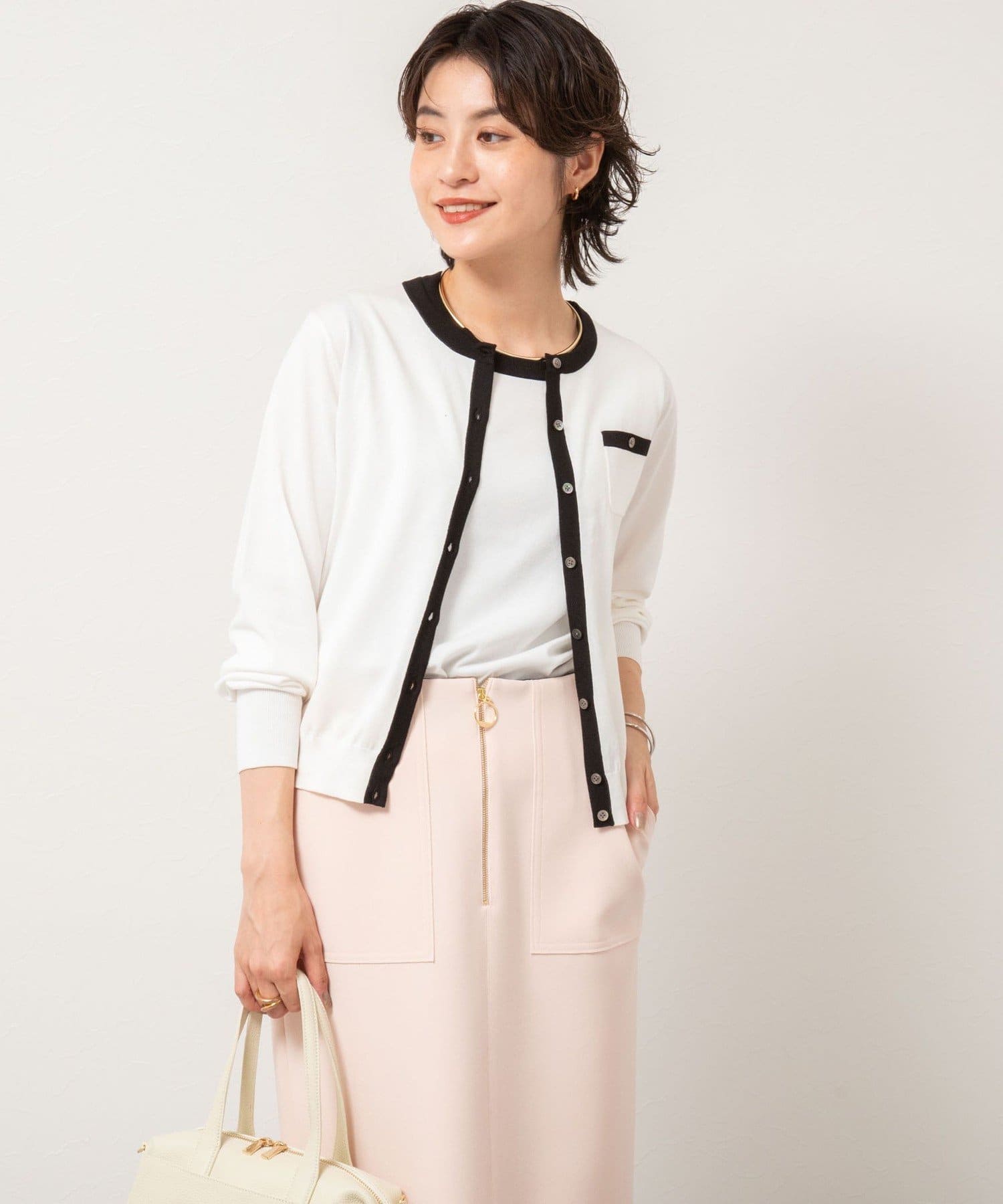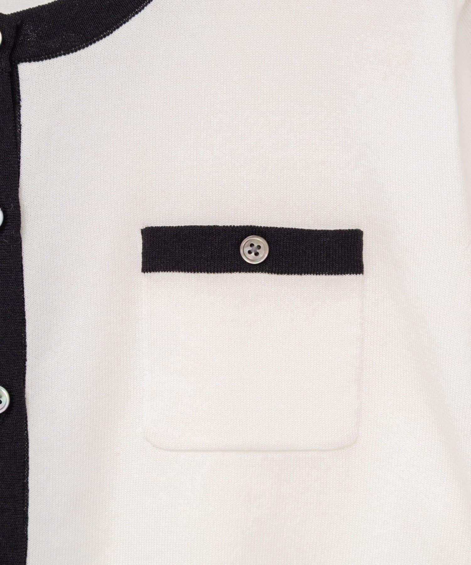 ・胸元の飾りポケットがポイントのコンパクトなクルーネックカーディガン