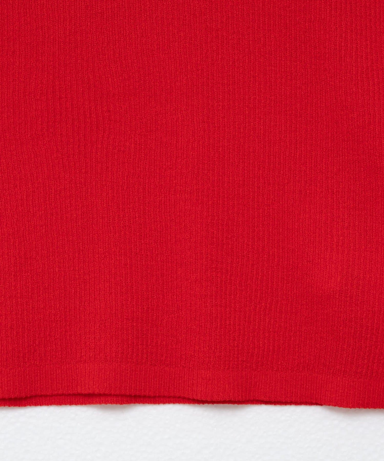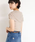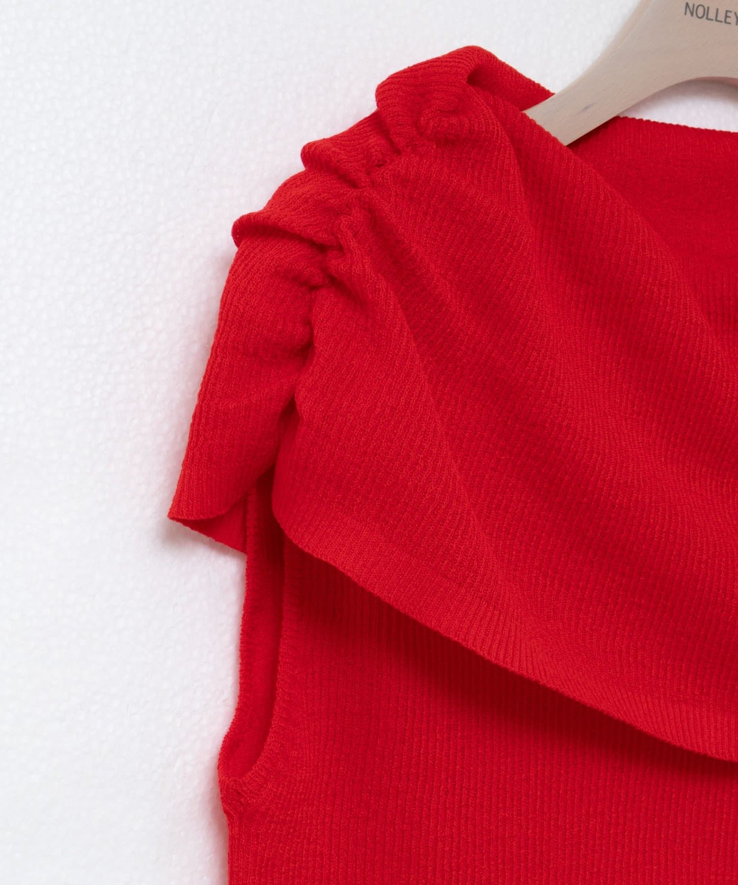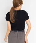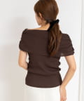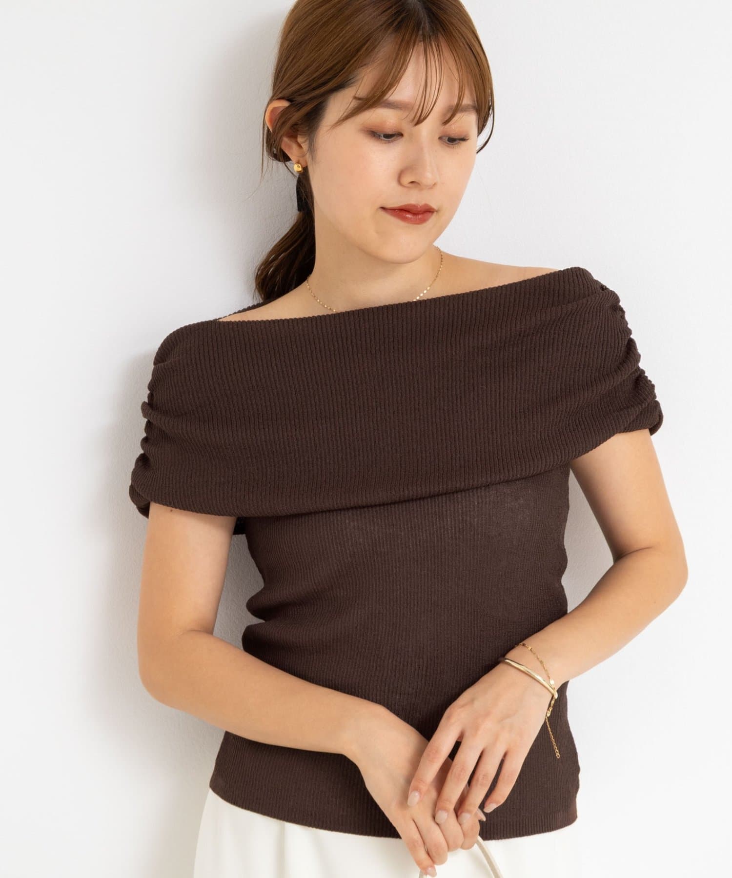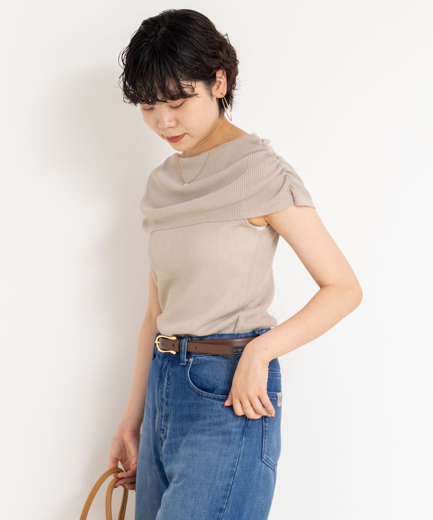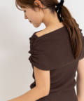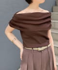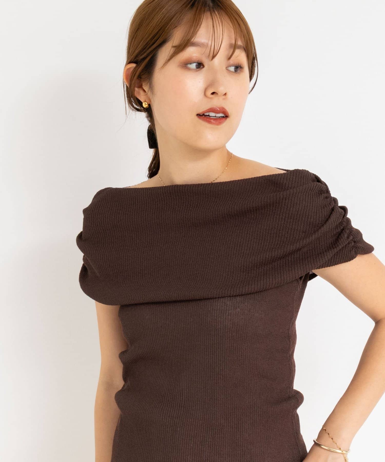 ・衿の内側両脇に細いゴムをたたき付けており、オフショルにしてもホールド感がある仕様
