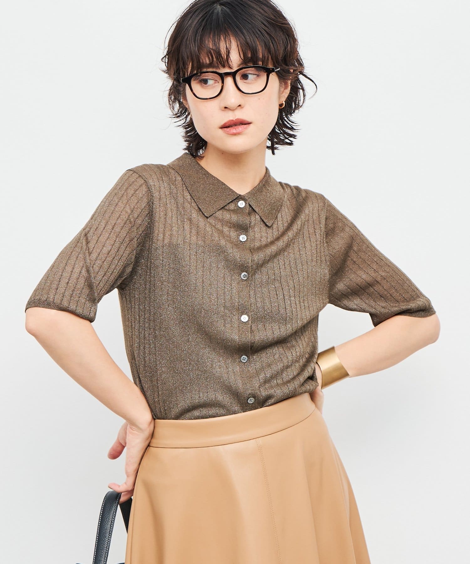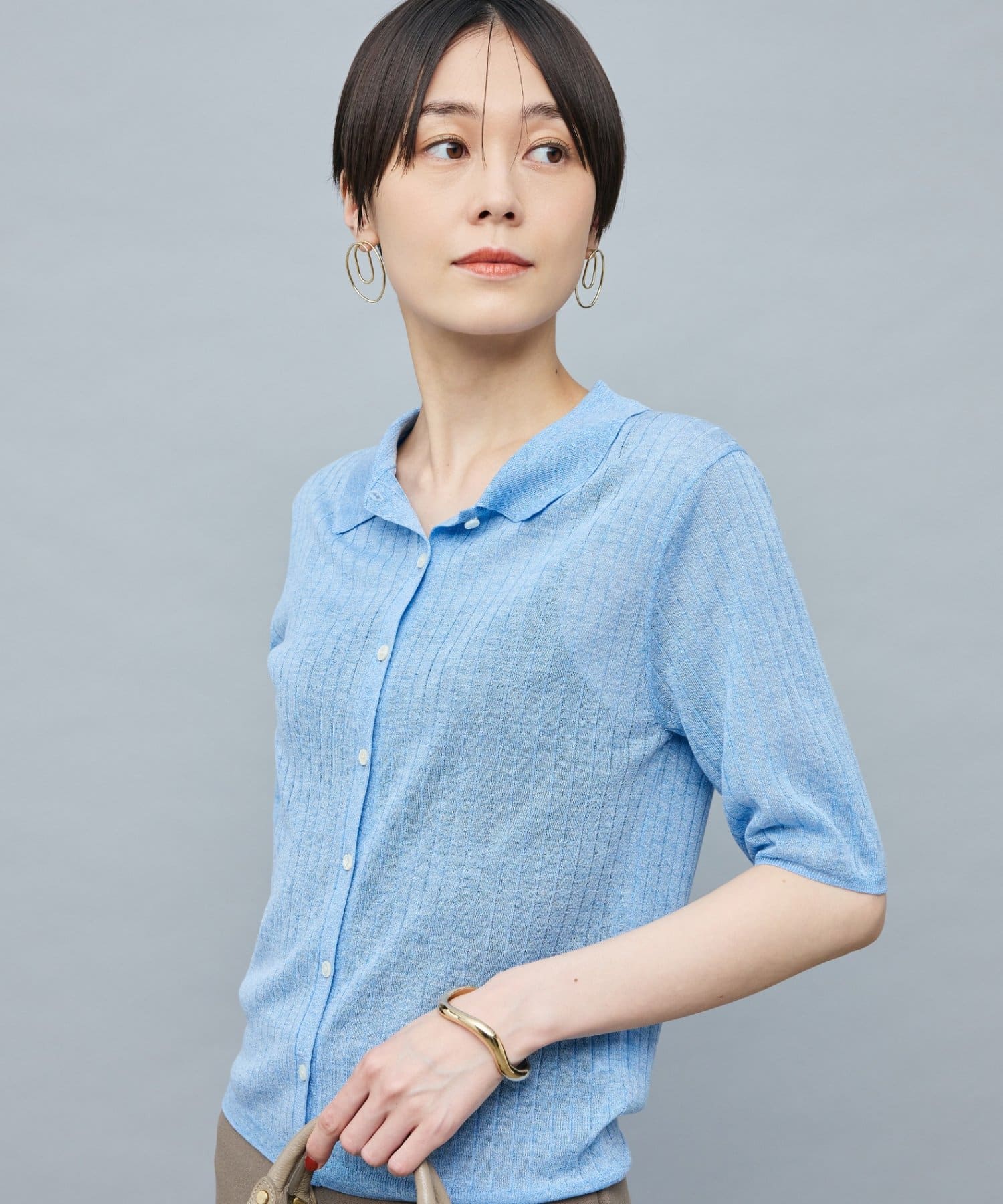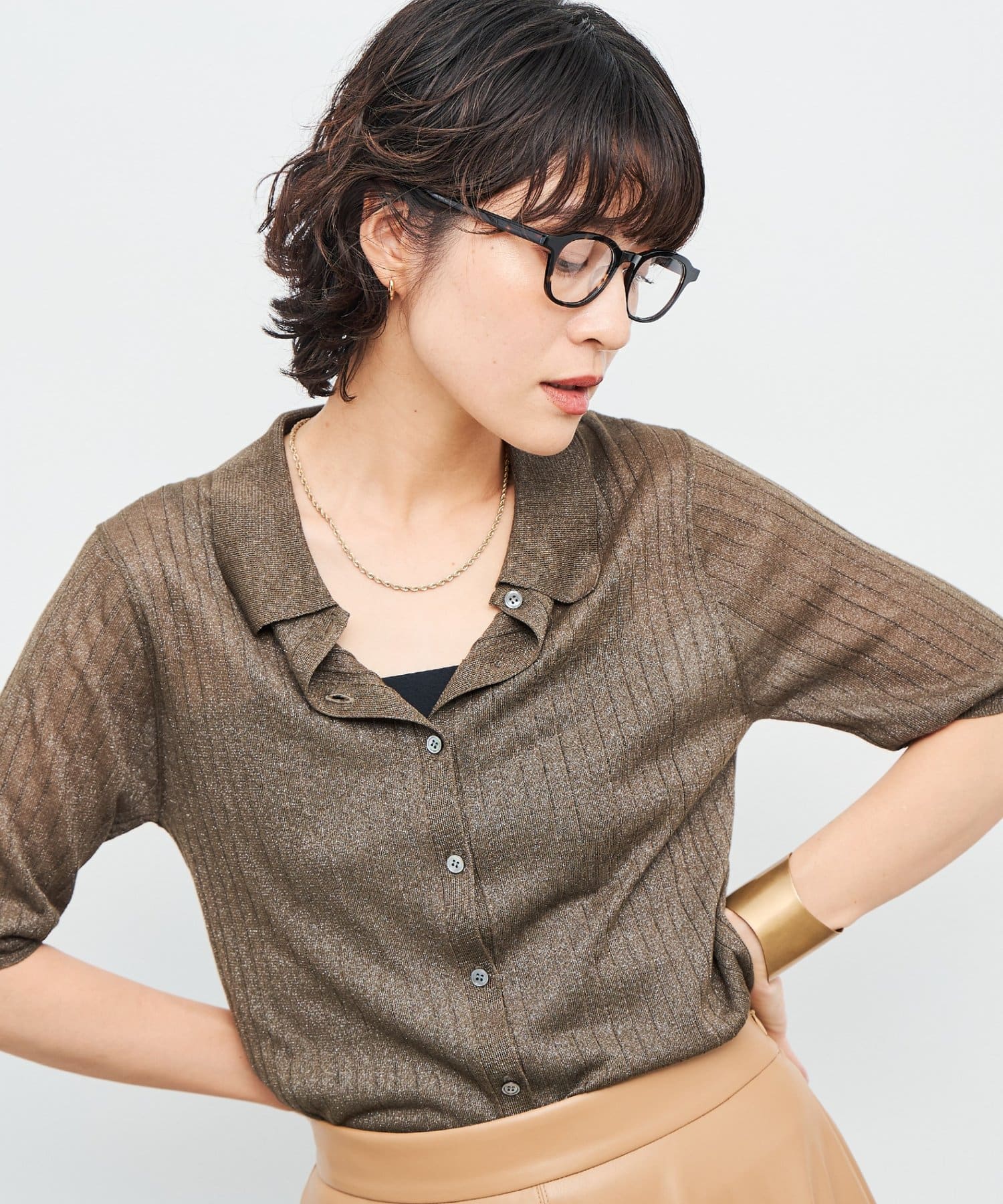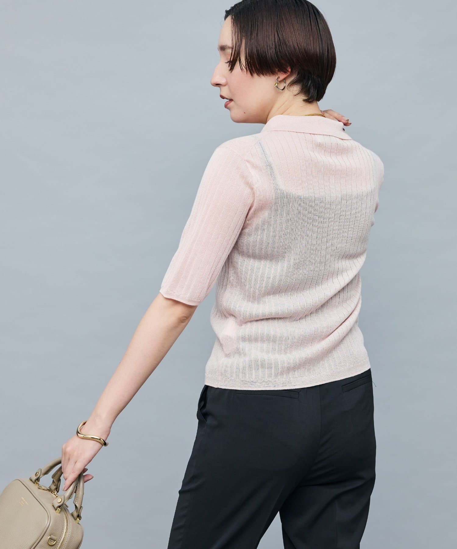 ・光沢とシアー感のある素材を使用したポロ衿カーディガン