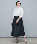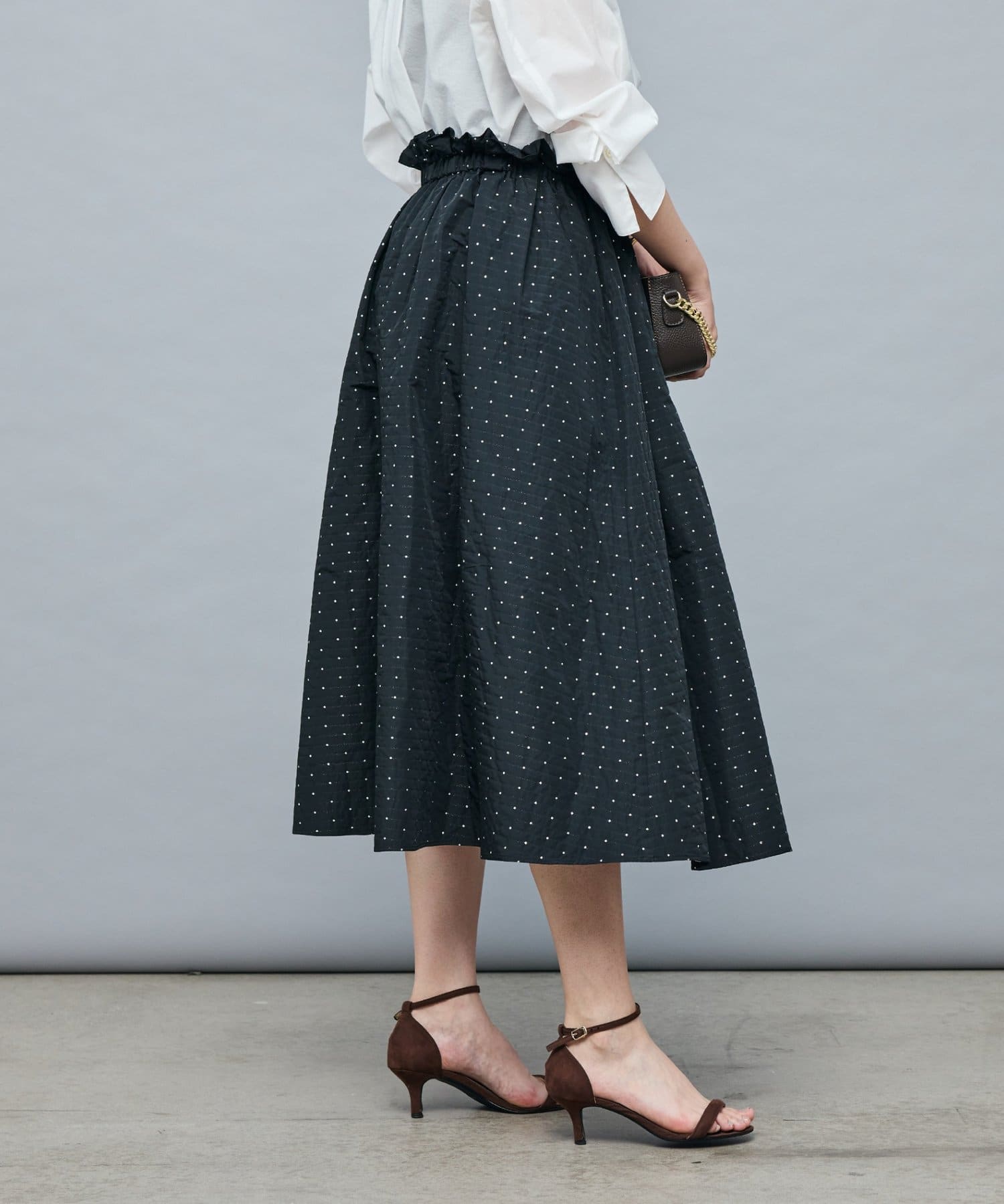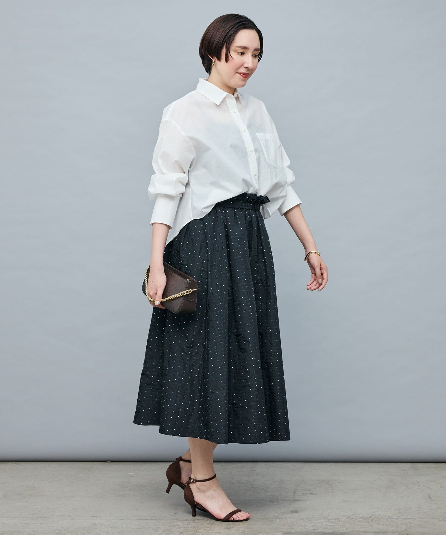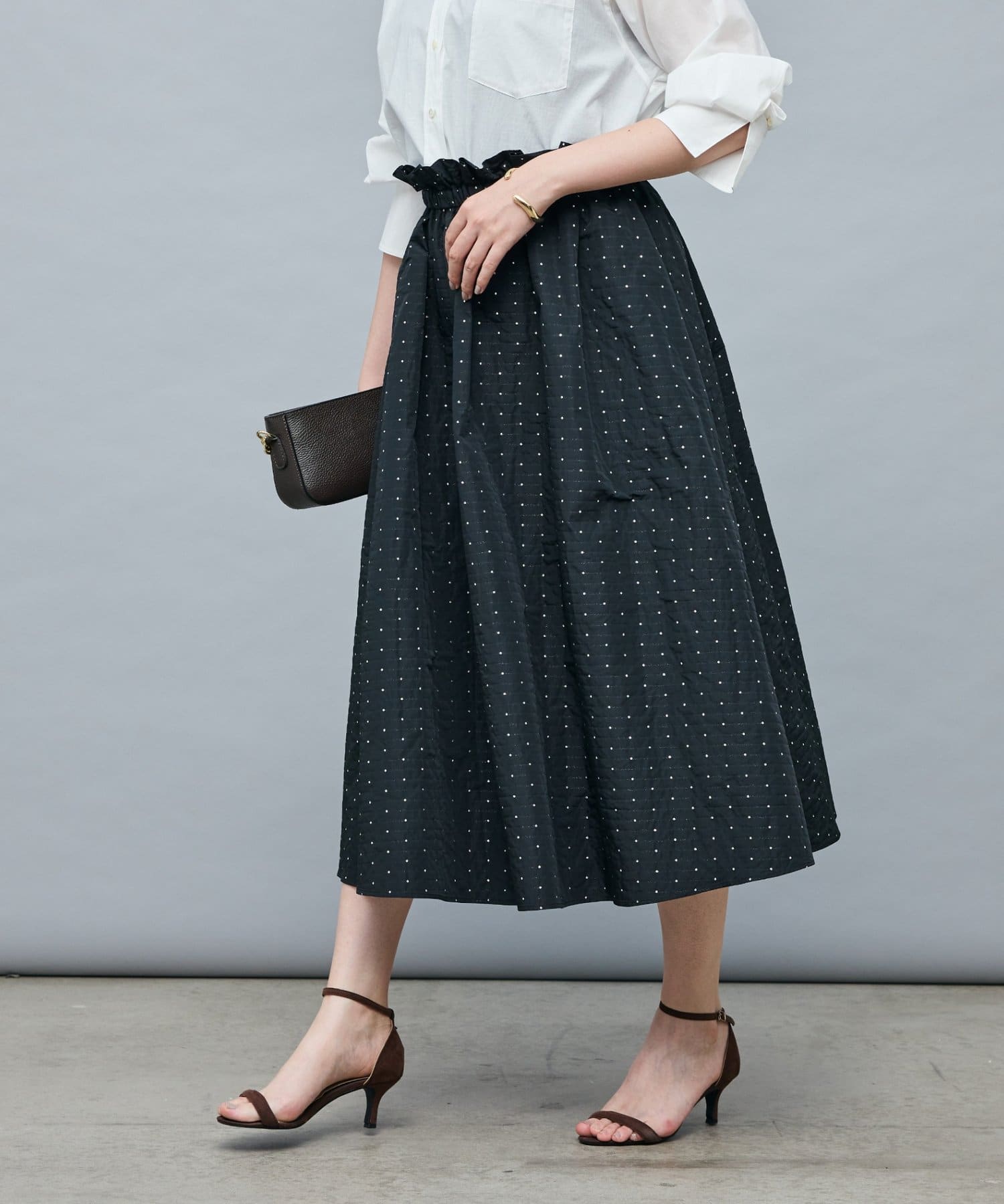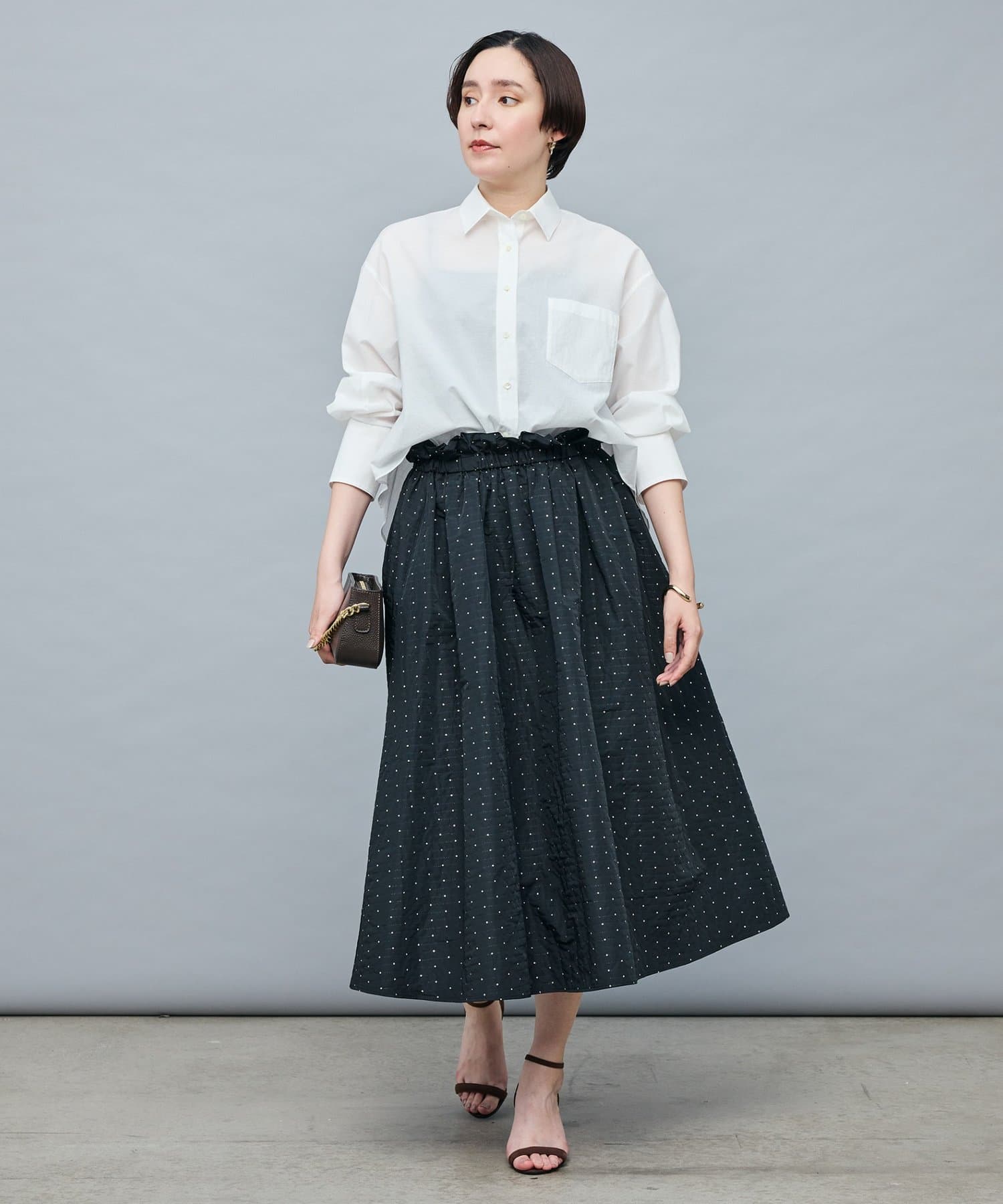 ・ウエストギャザーがポイントで、トップスインした着こなしがおすすめ