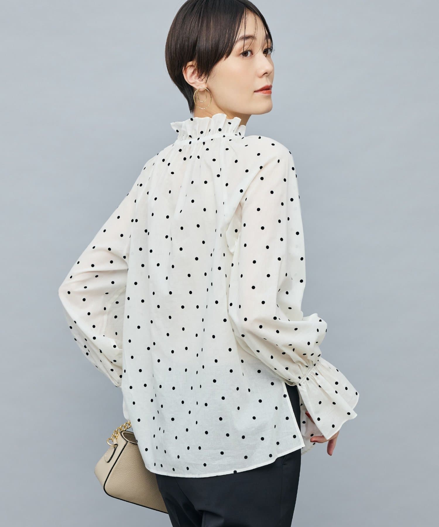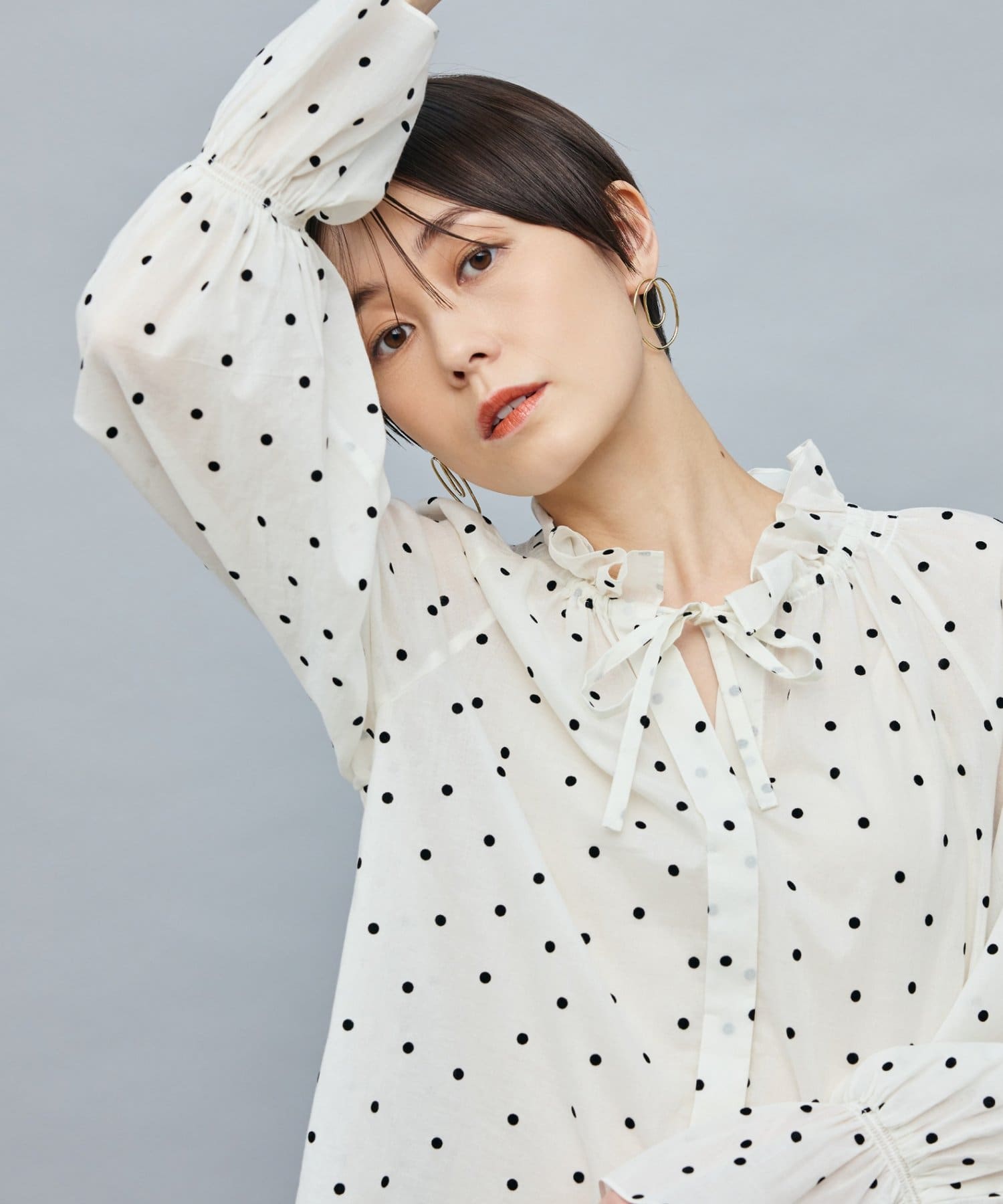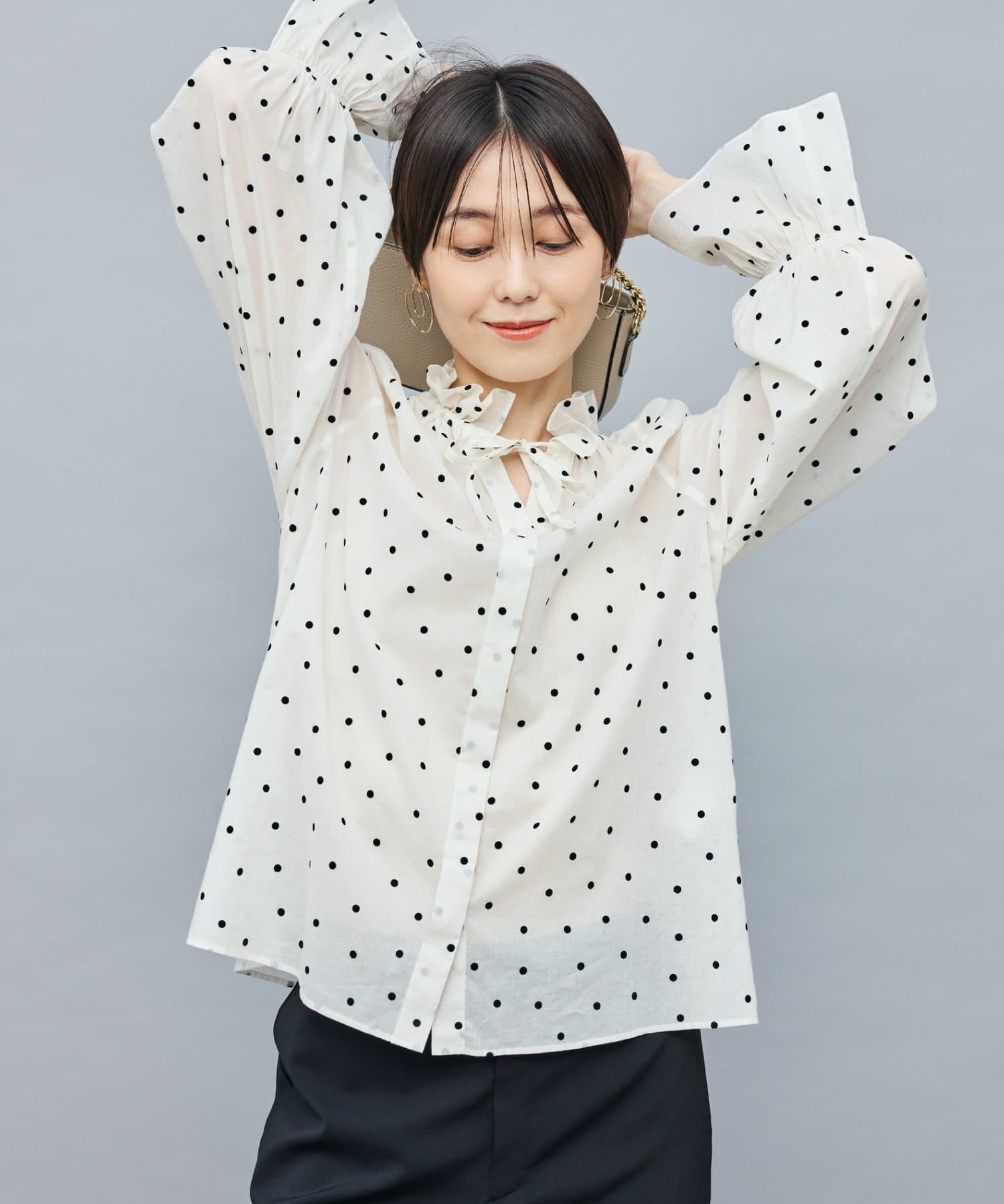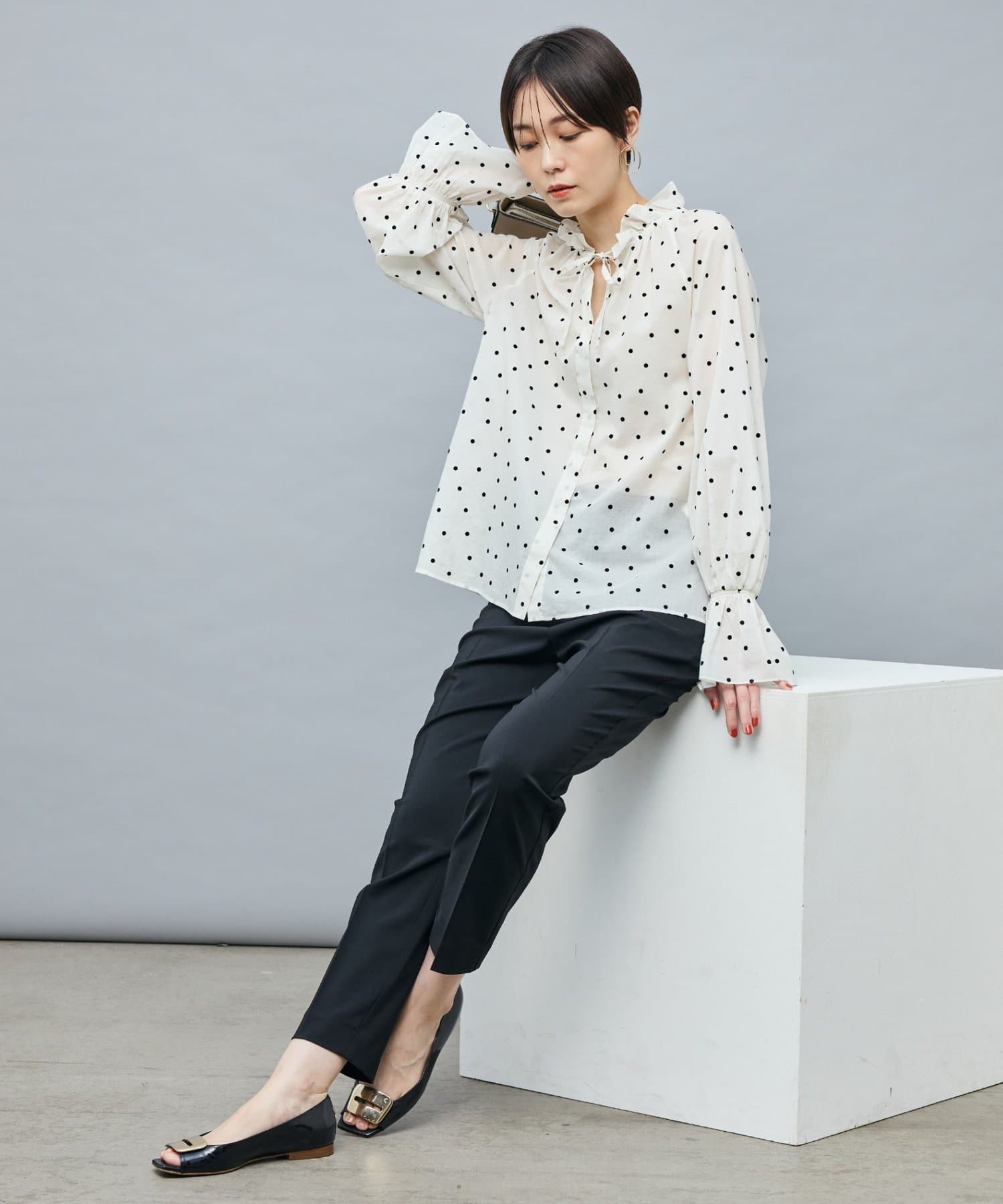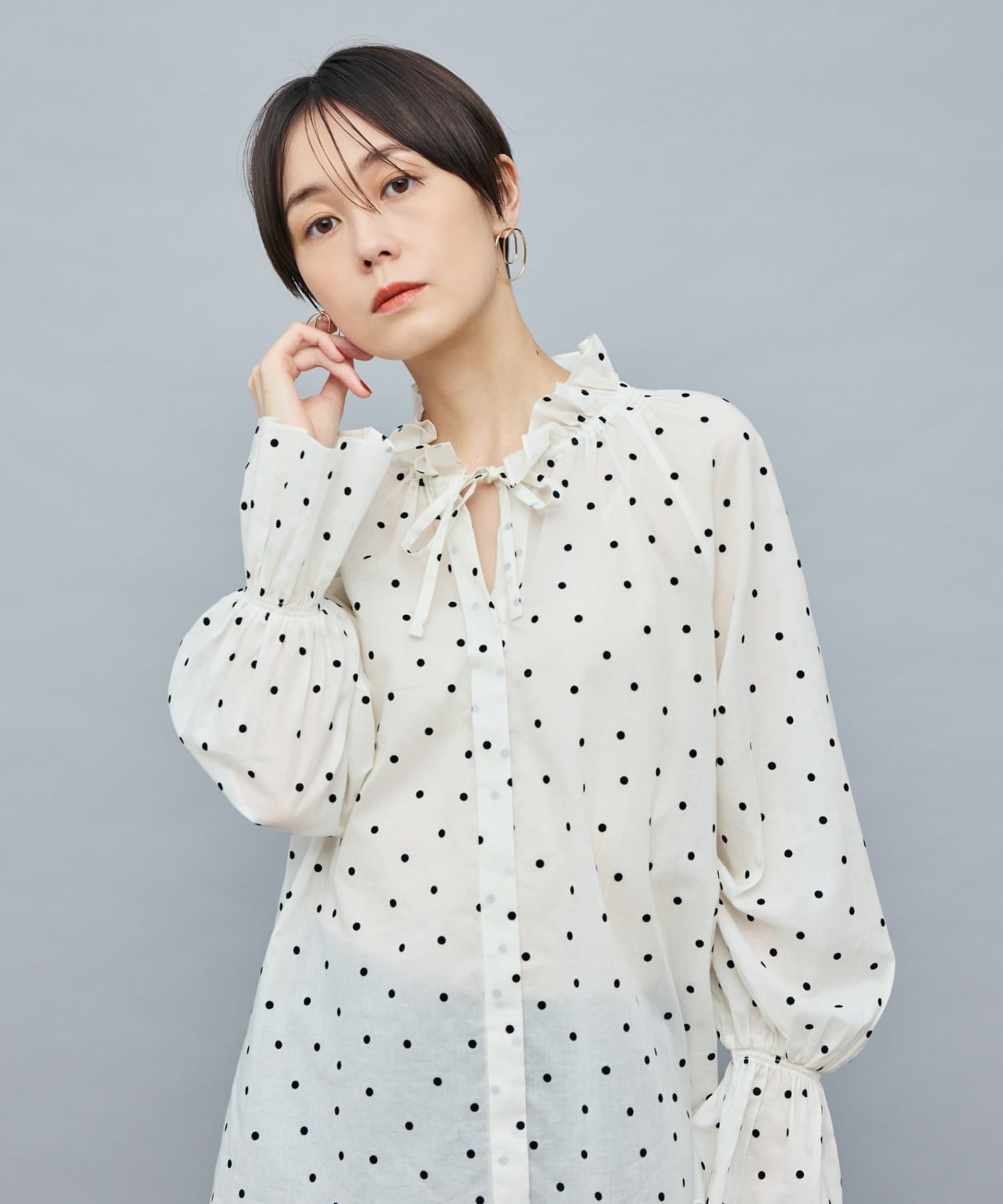 ・フロッキーでドットプリントを施した透け感のあるコットンローン素材を使用したブラウス