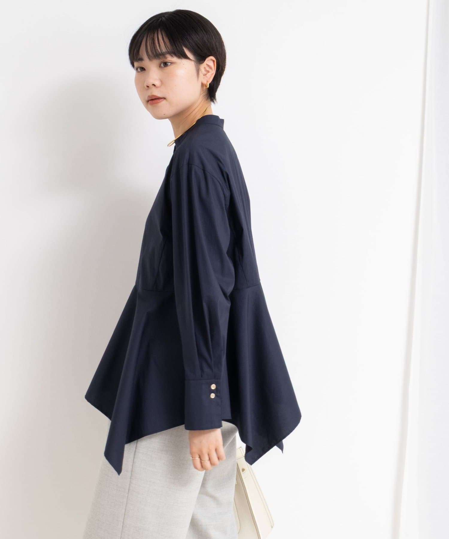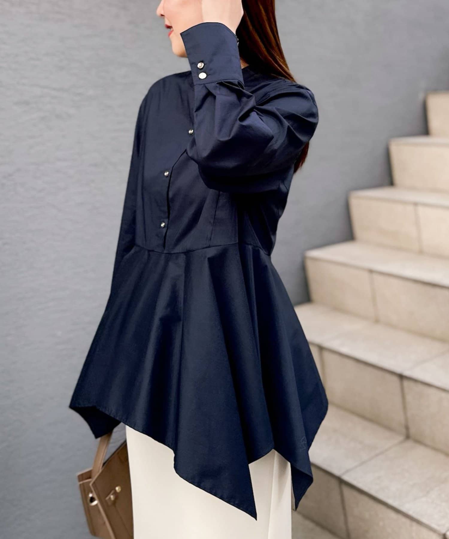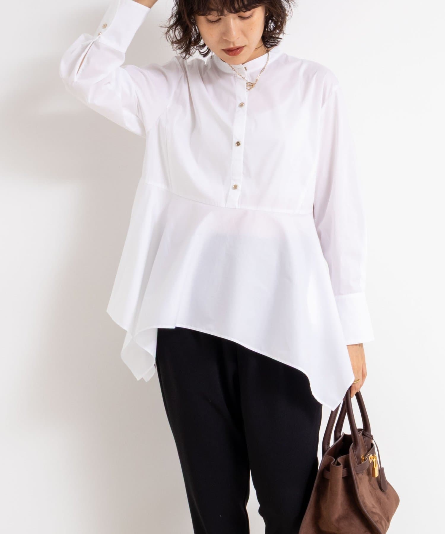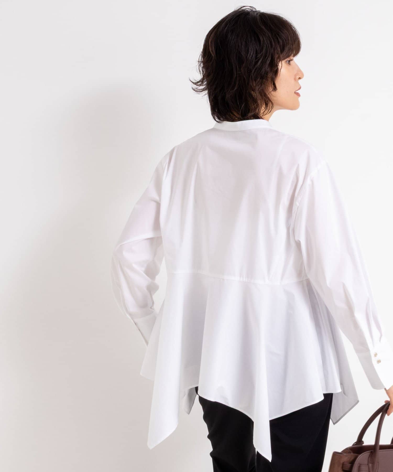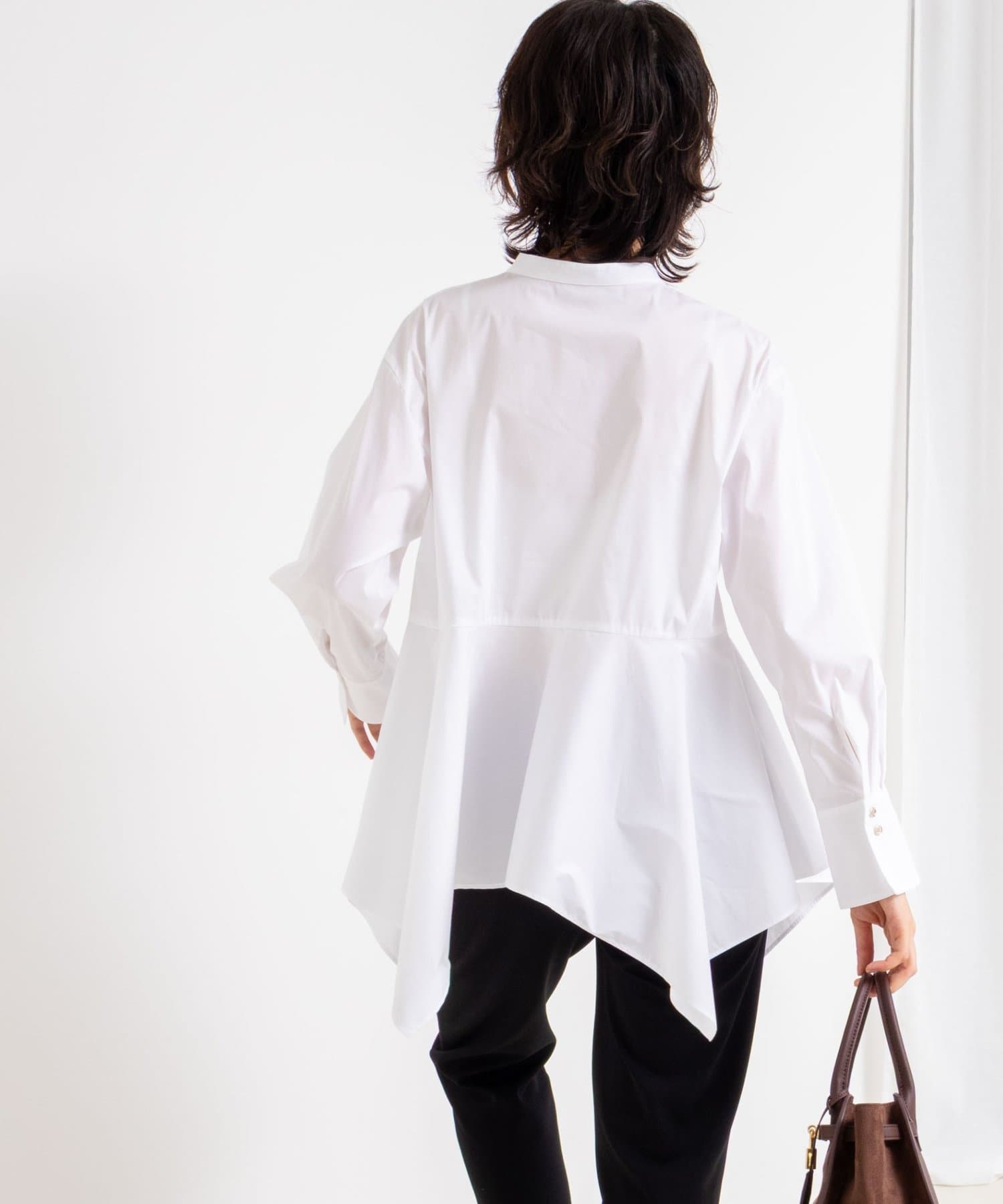 ・ハンカチーフヘムのデザインが目を引く華やかなシャツ