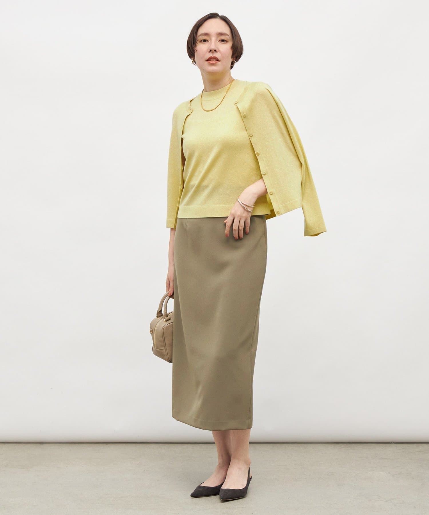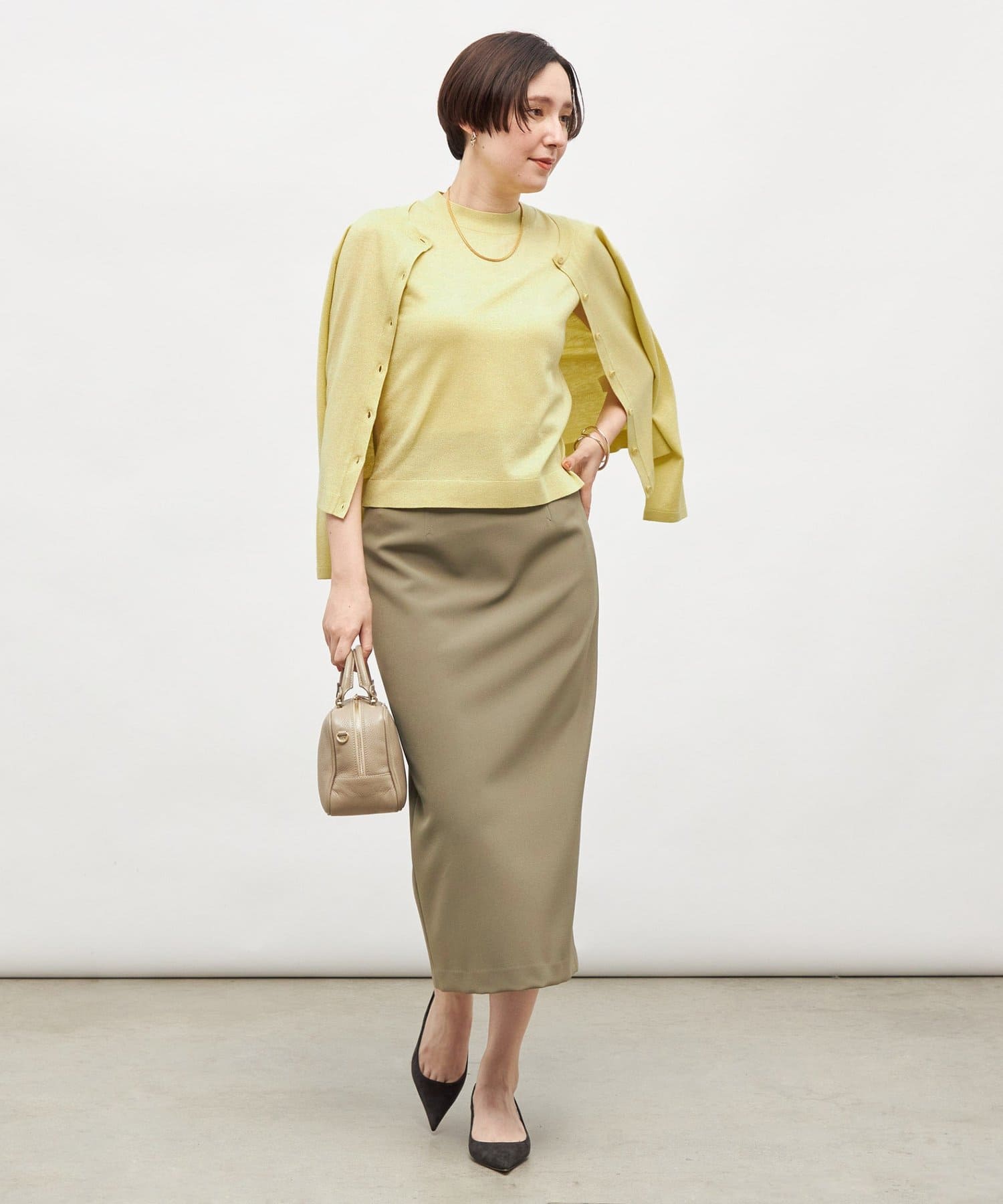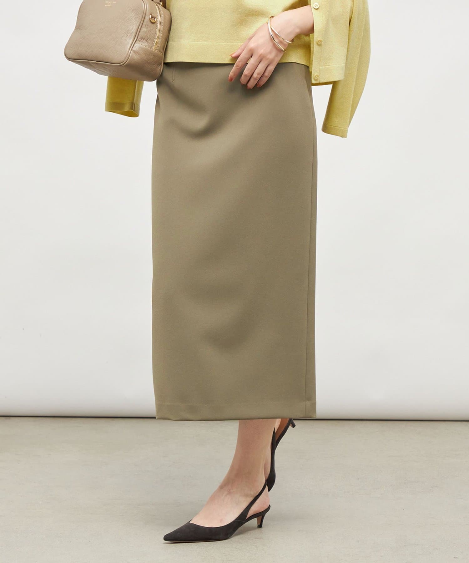 ・しっかりとした肉感のある素材で、身体のラインを拾いにくく、すっきりと大人っぽく着用できるタイトライン