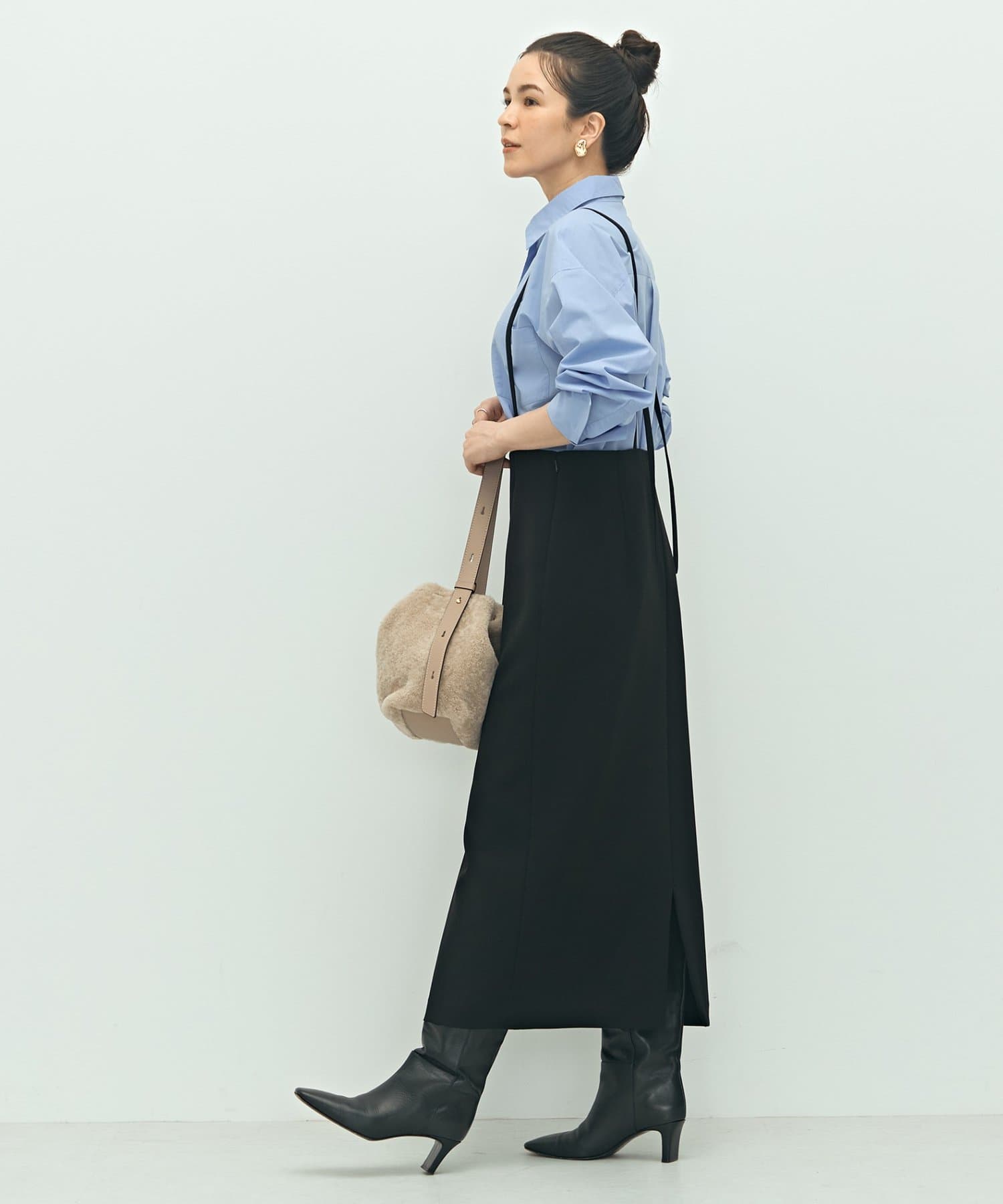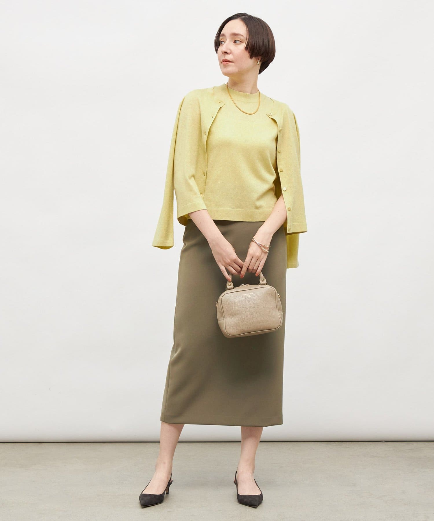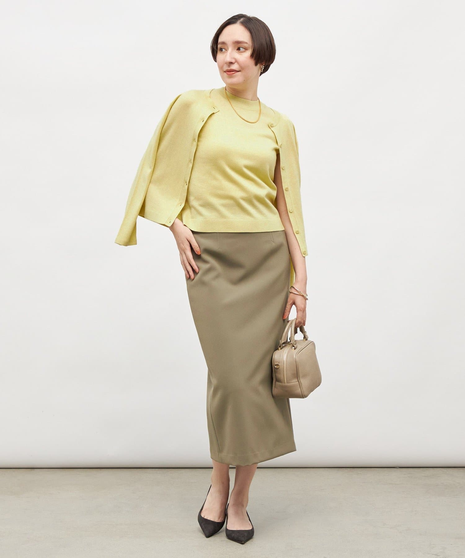 ・しっかりとした肉感のある素材で、身体のラインを拾いにくく、すっきりと大人っぽく着用できるタイトライン