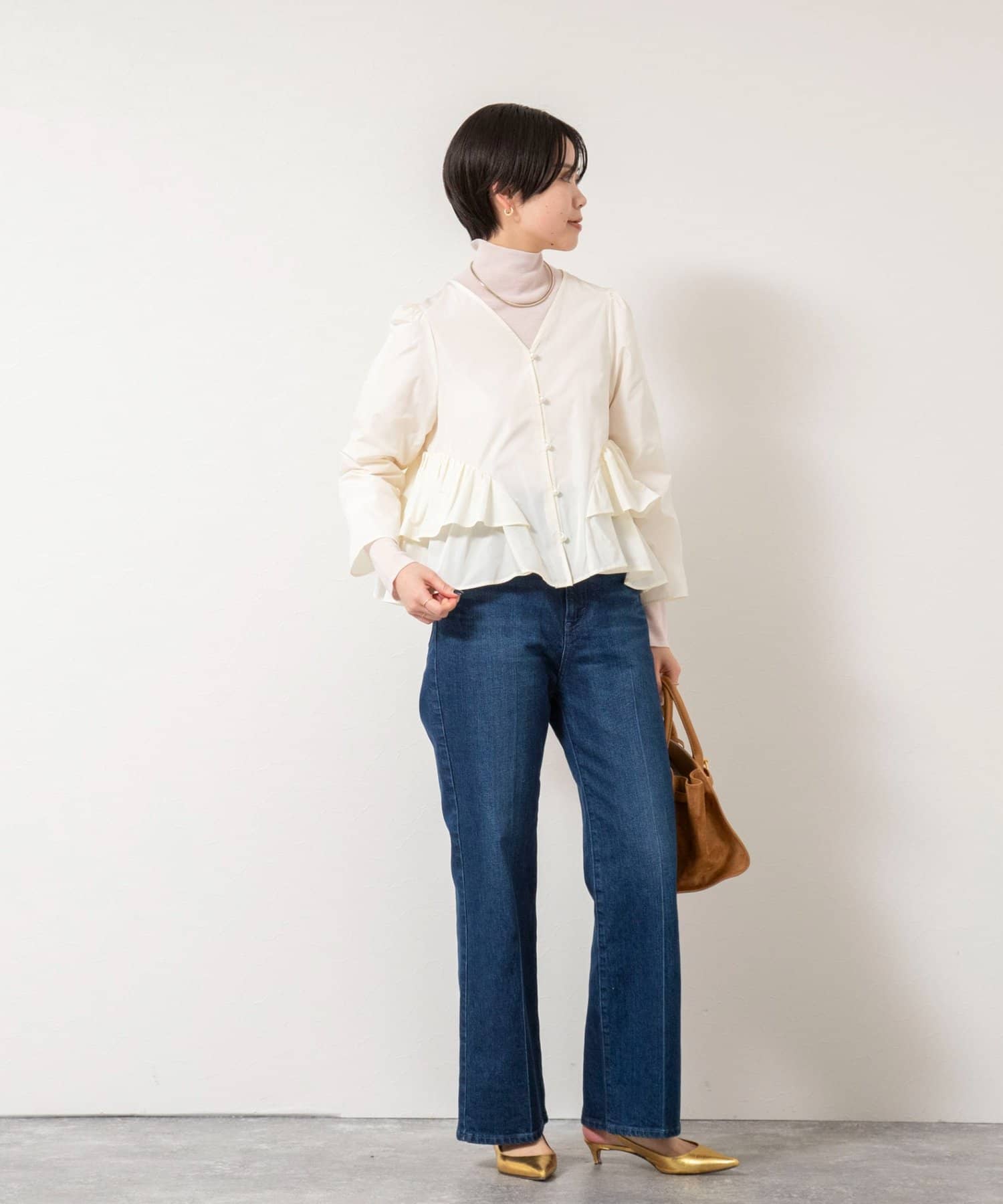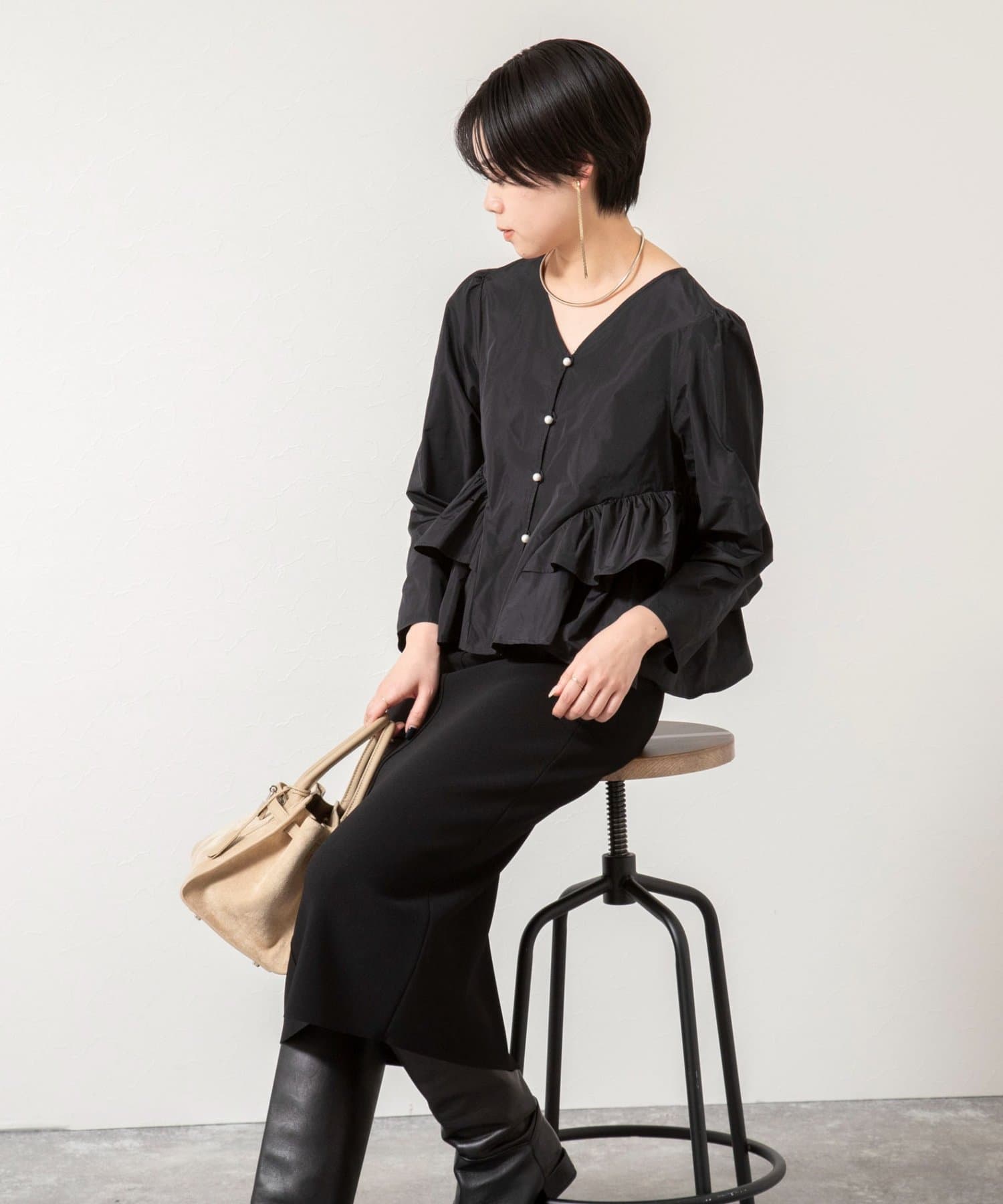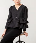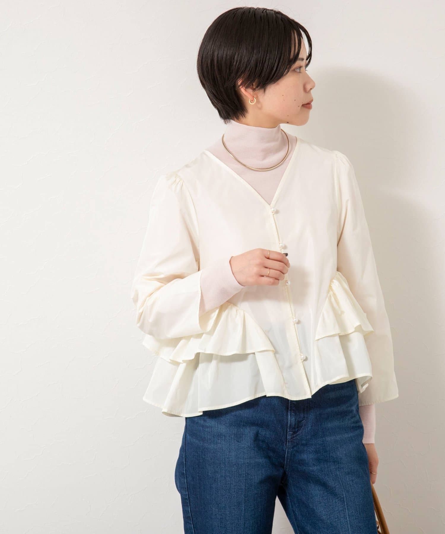 ・裾の切り替えとパール釦で、一枚でも華やかなブラウス