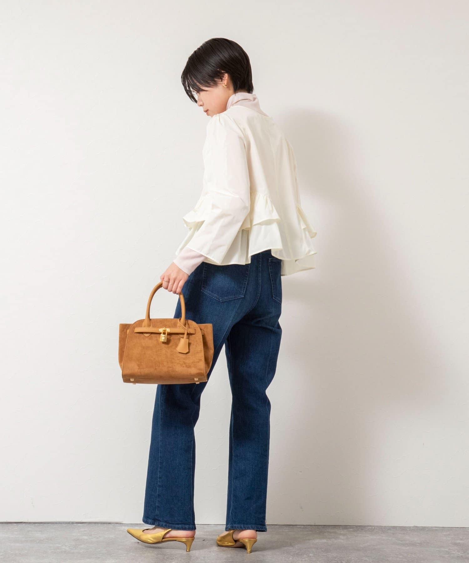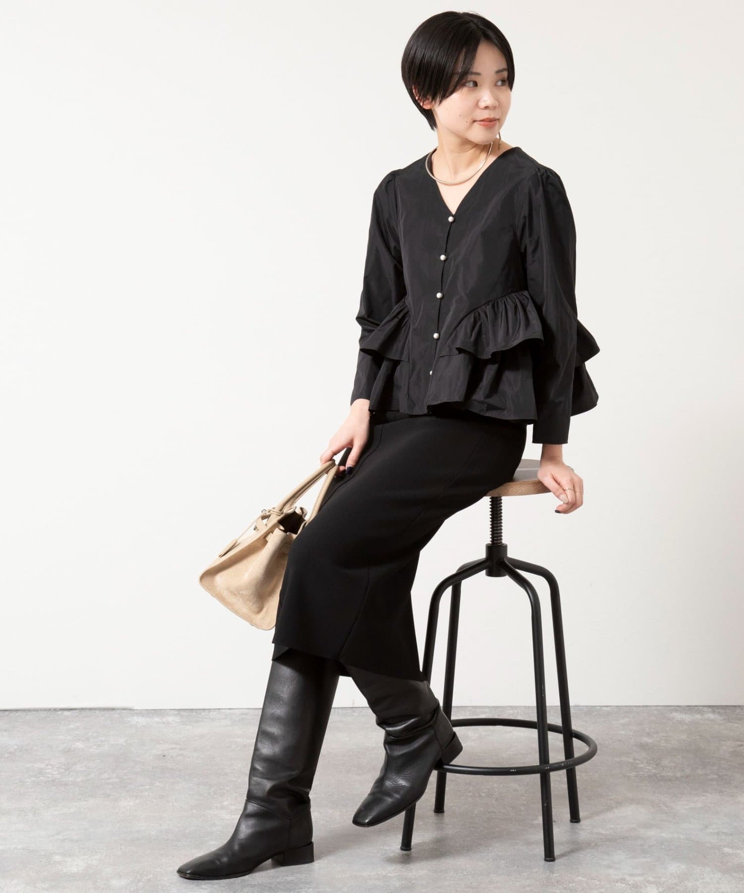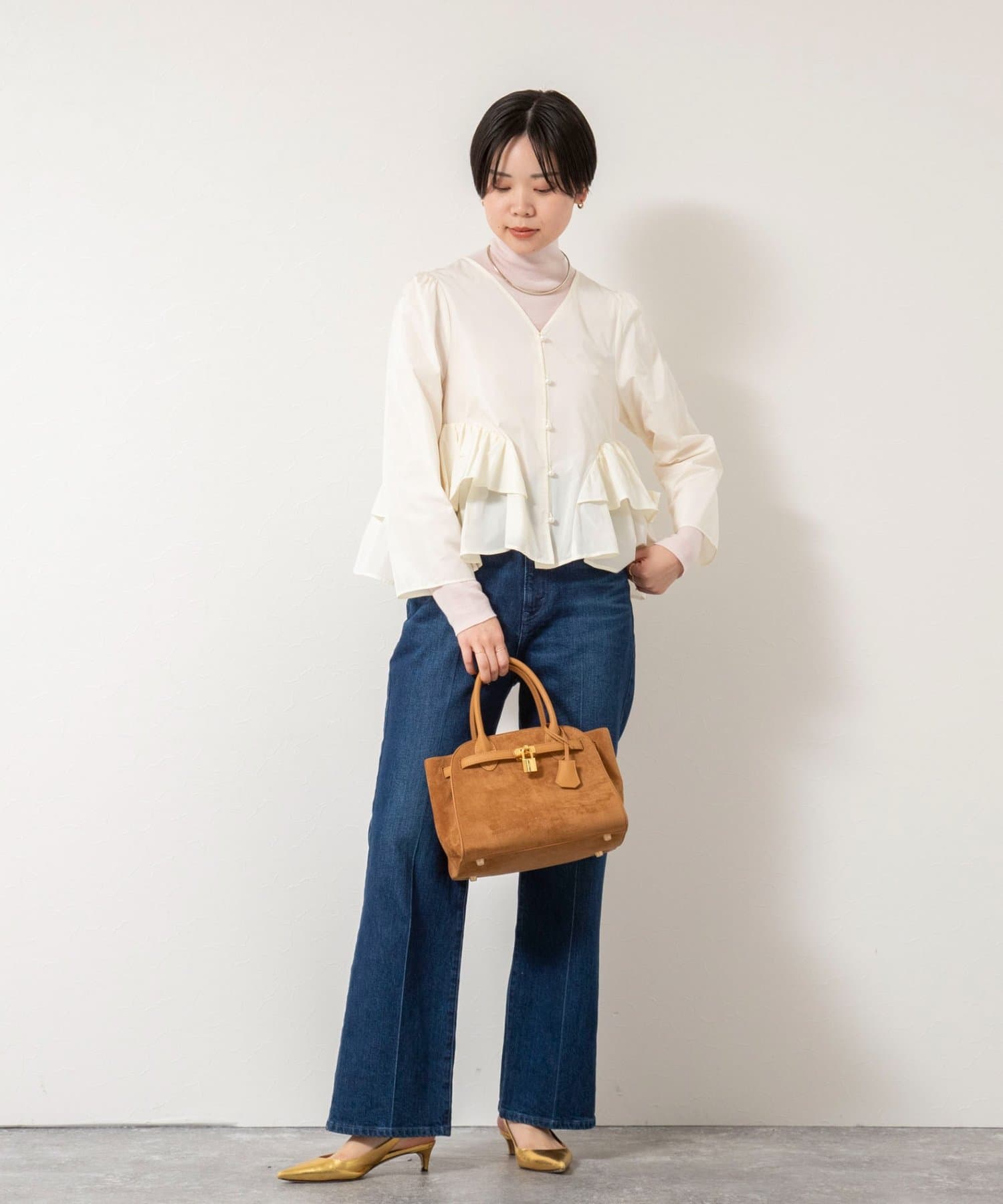 ・裾の切り替えとパール釦で、一枚でも華やかなブラウス