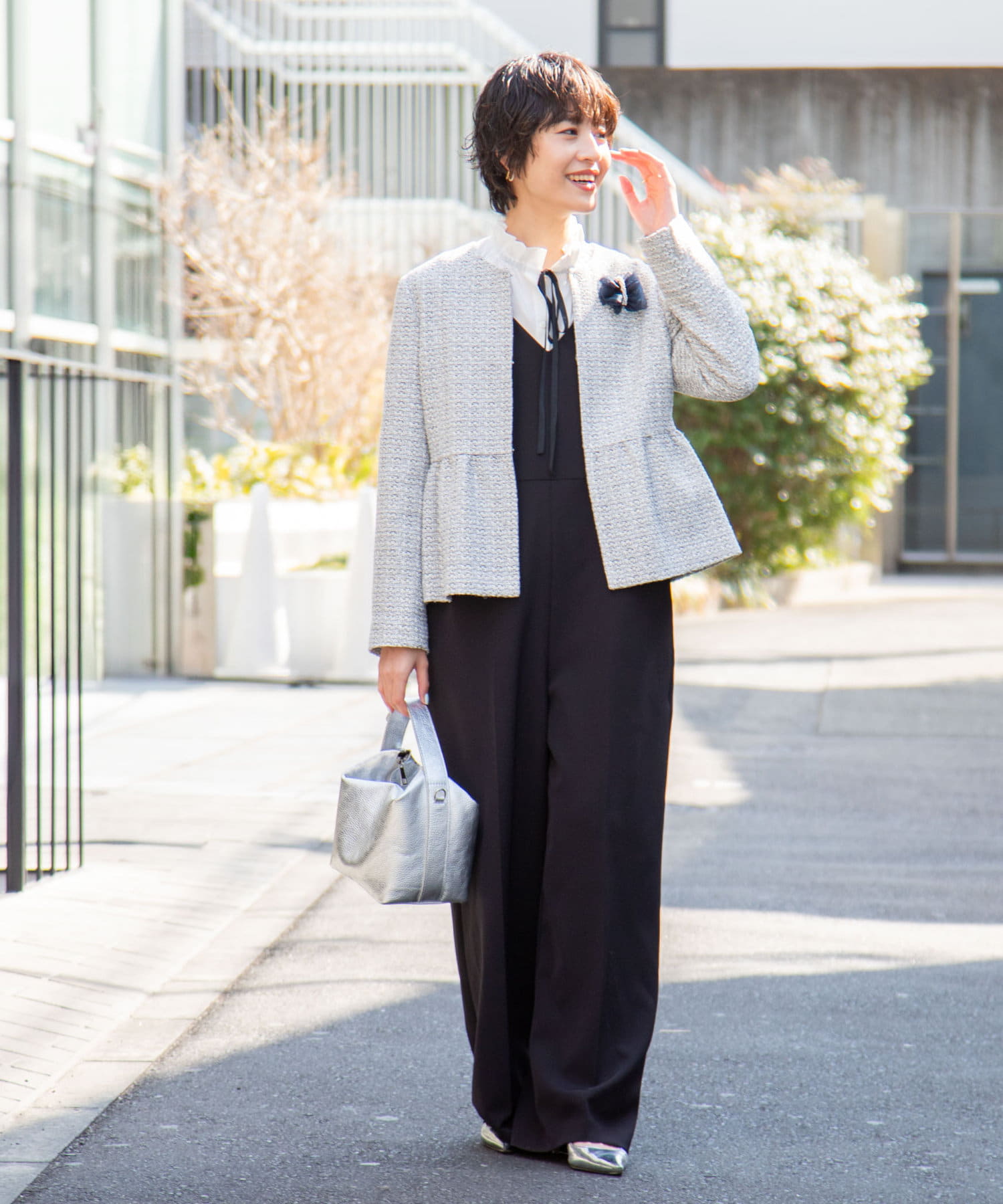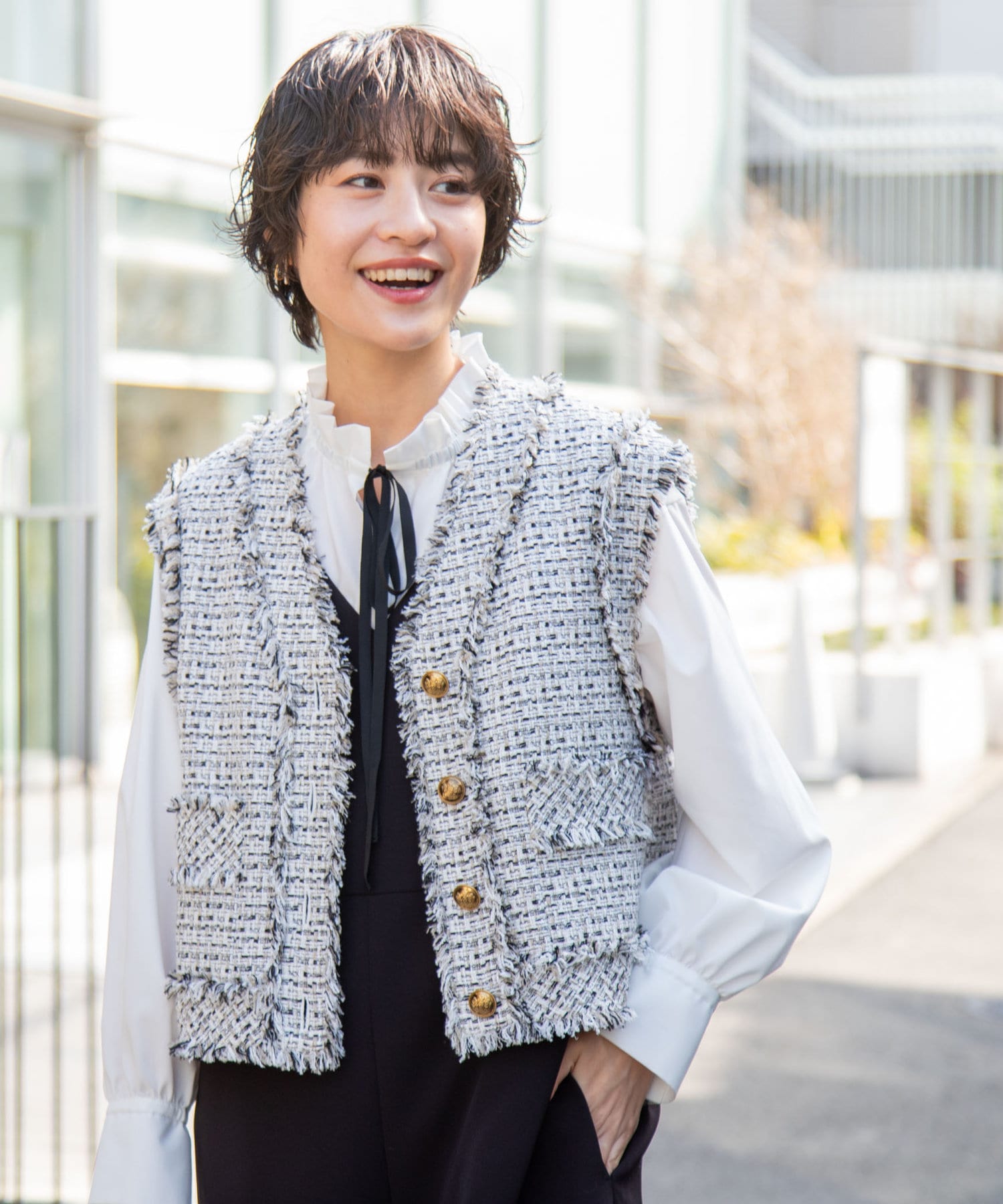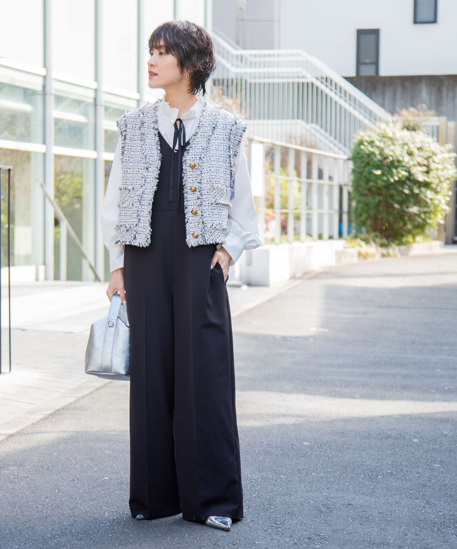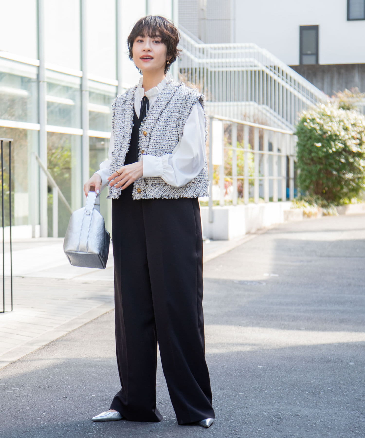 ・ニットやスウェットの衿からフリルをのぞかせた着こなしもおすすめ