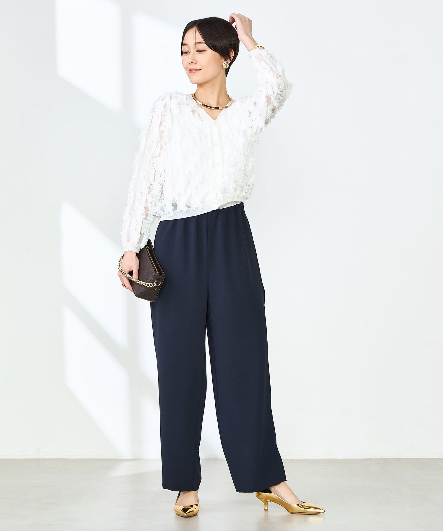 ・デニム、ワイドパンツ、スカートなど、様々なアイテムとコーディネートを楽しめる1枚