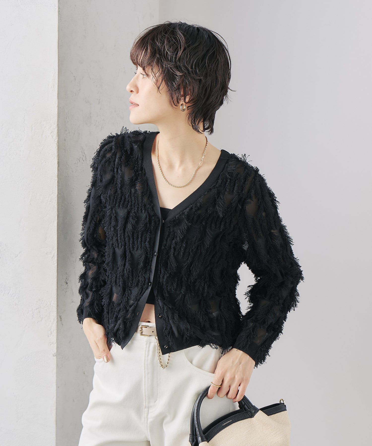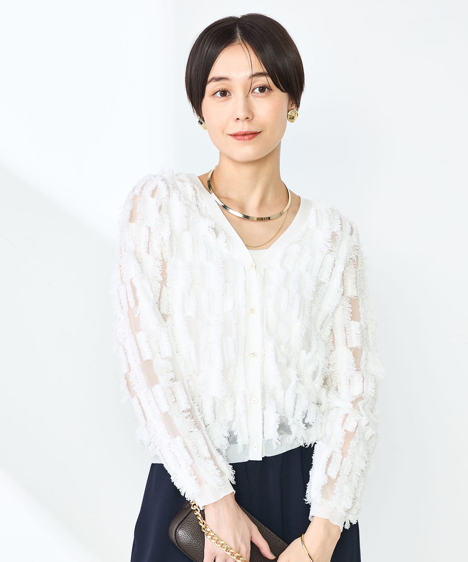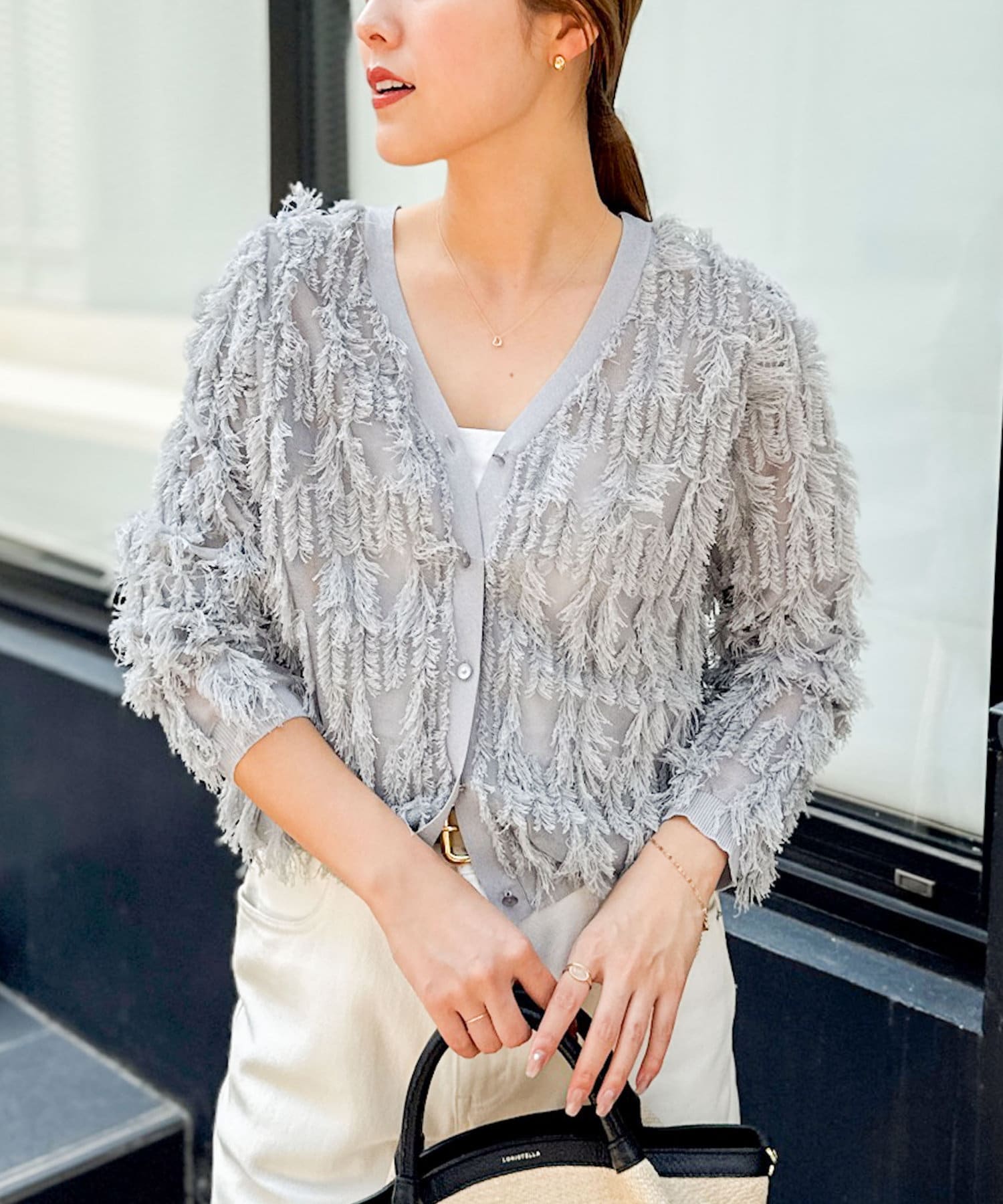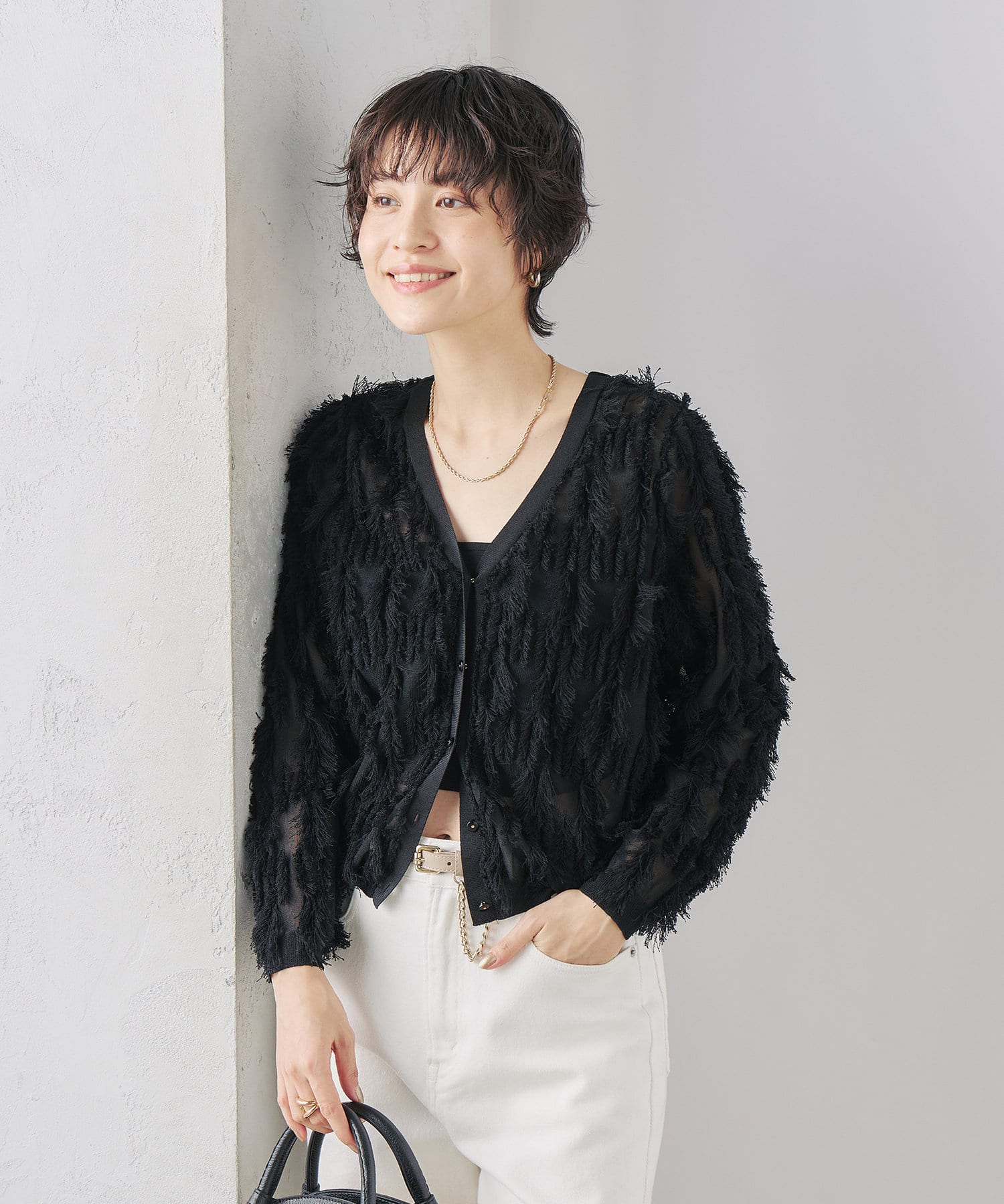 ・爽やかさと華やかさのあるカットフリンジのVネックカーディガン
