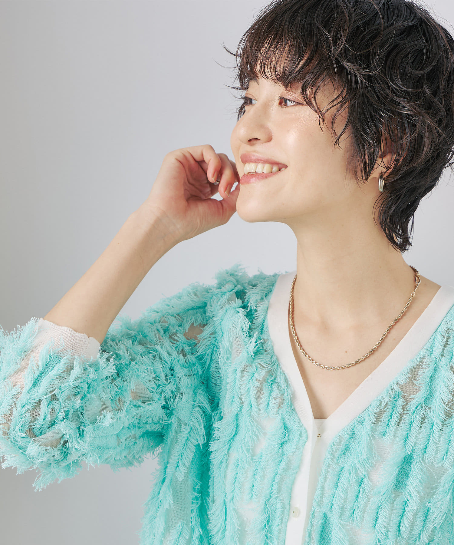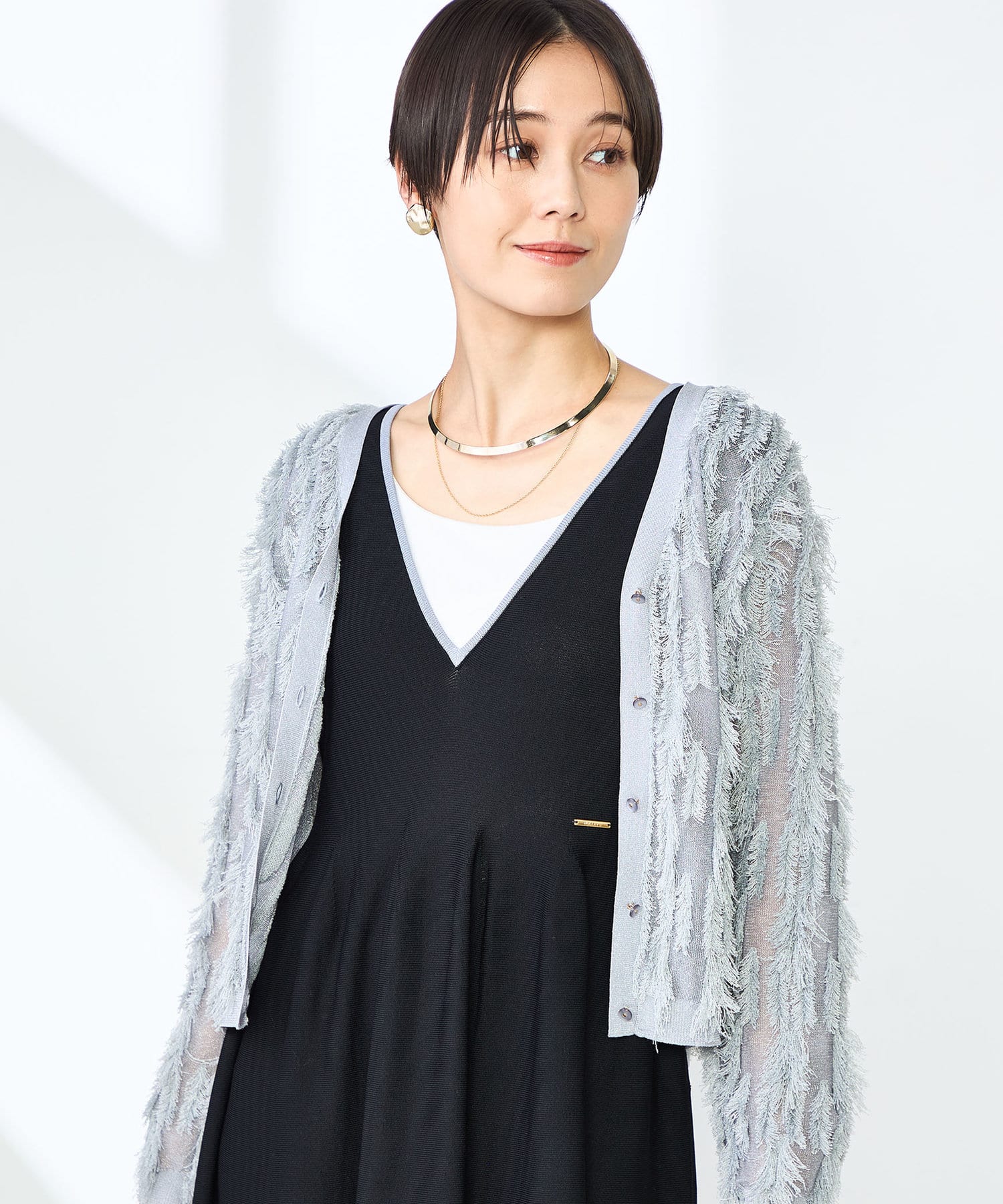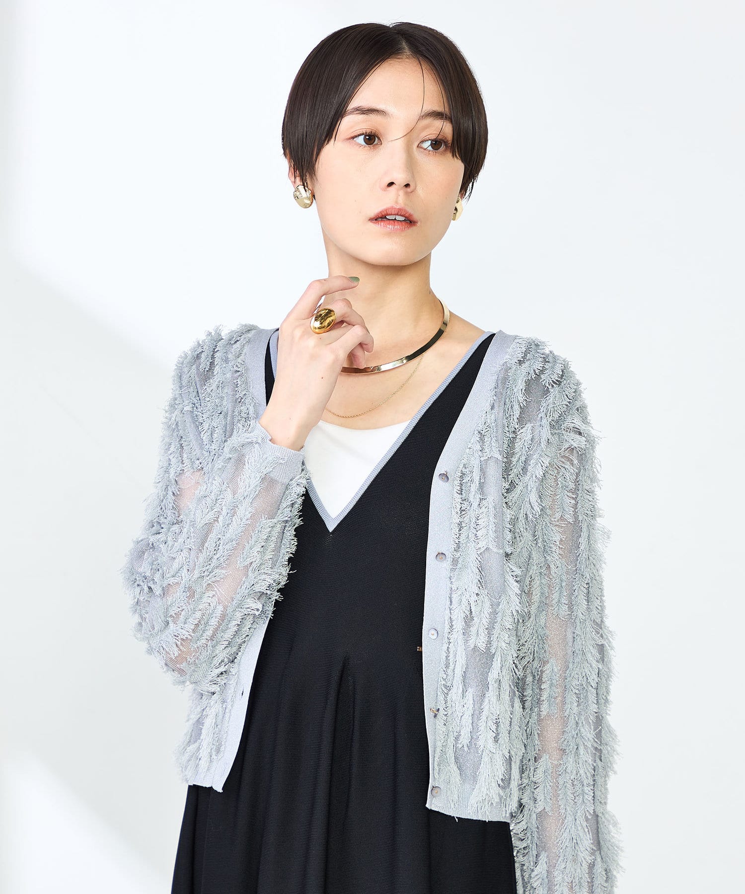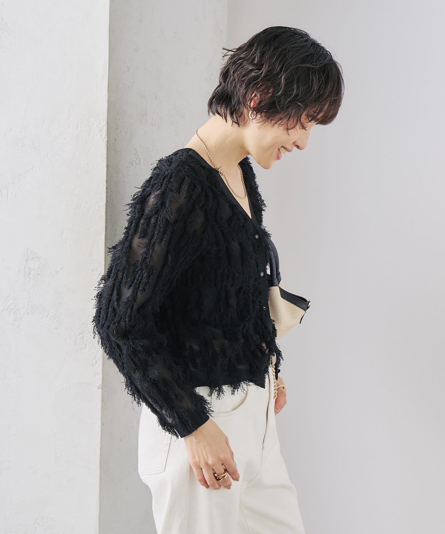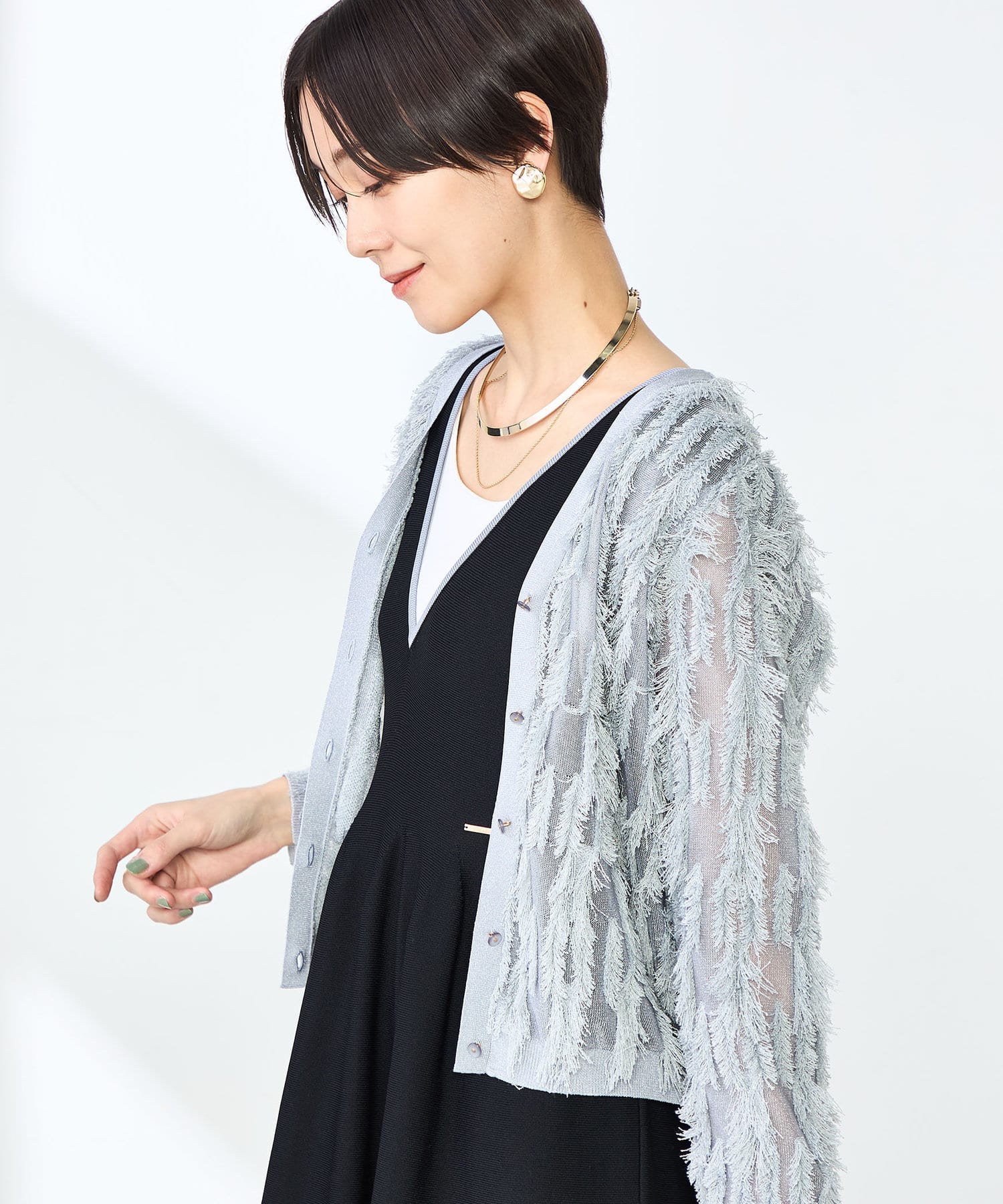 ・爽やかさと華やかさのあるカットフリンジのVネックカーディガン