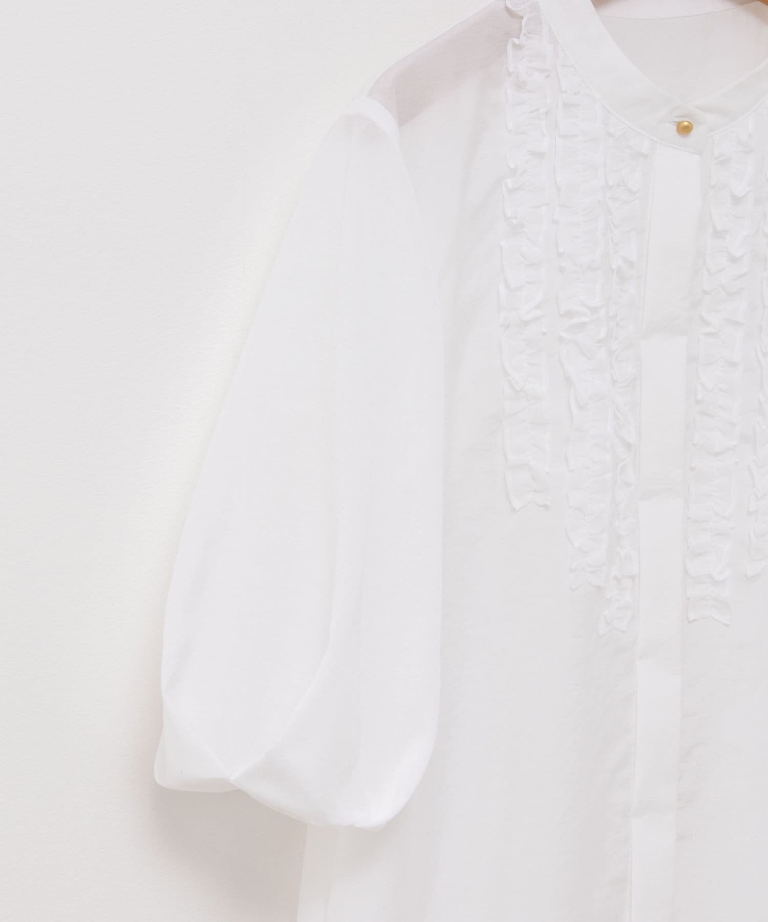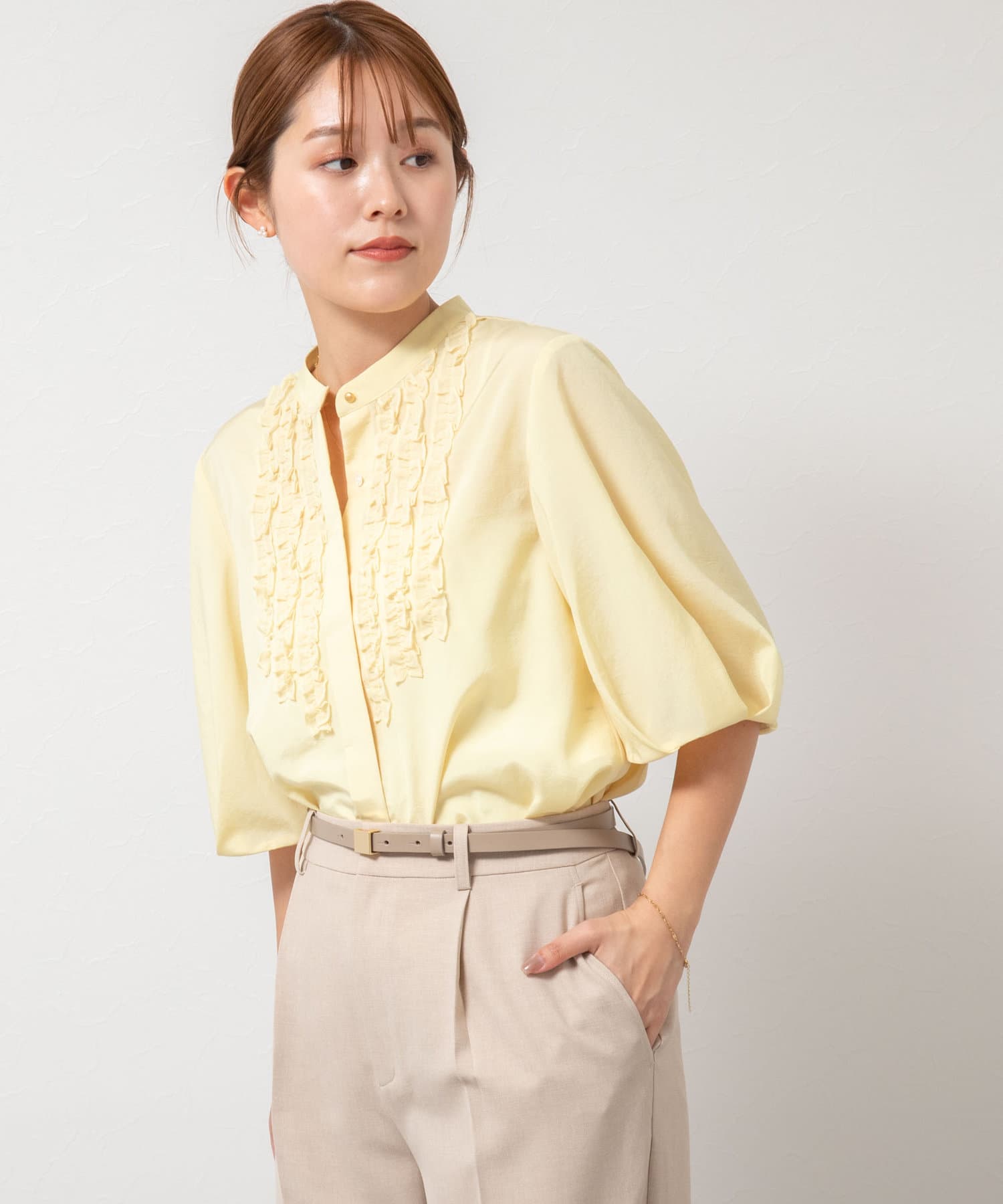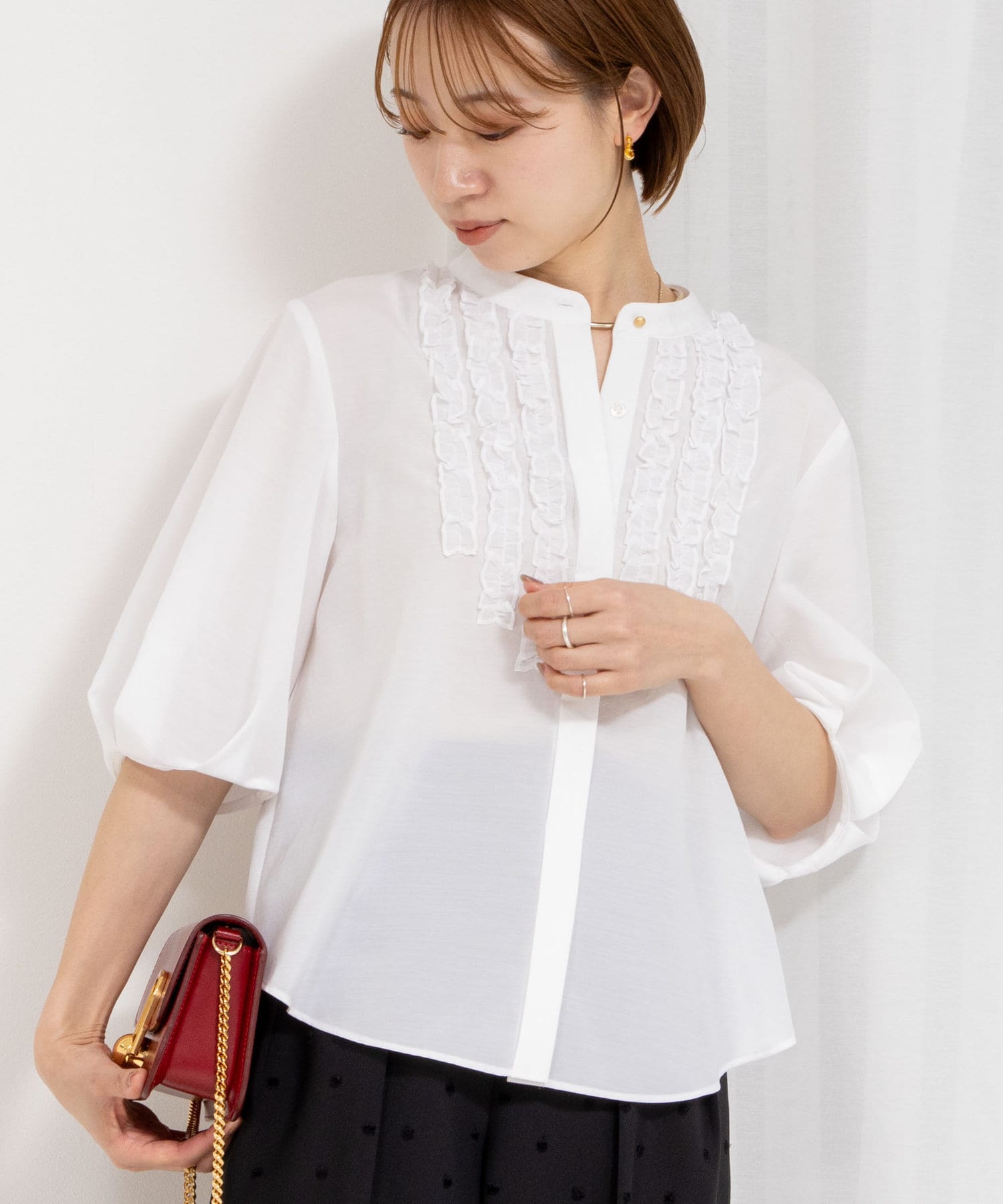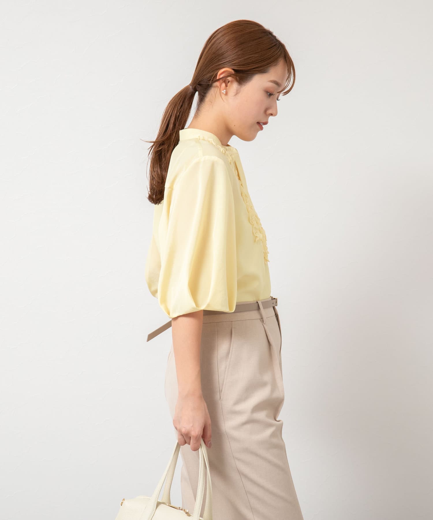 ・透け感のあるジョーゼット素材でフリルが程よい甘さのブラウス