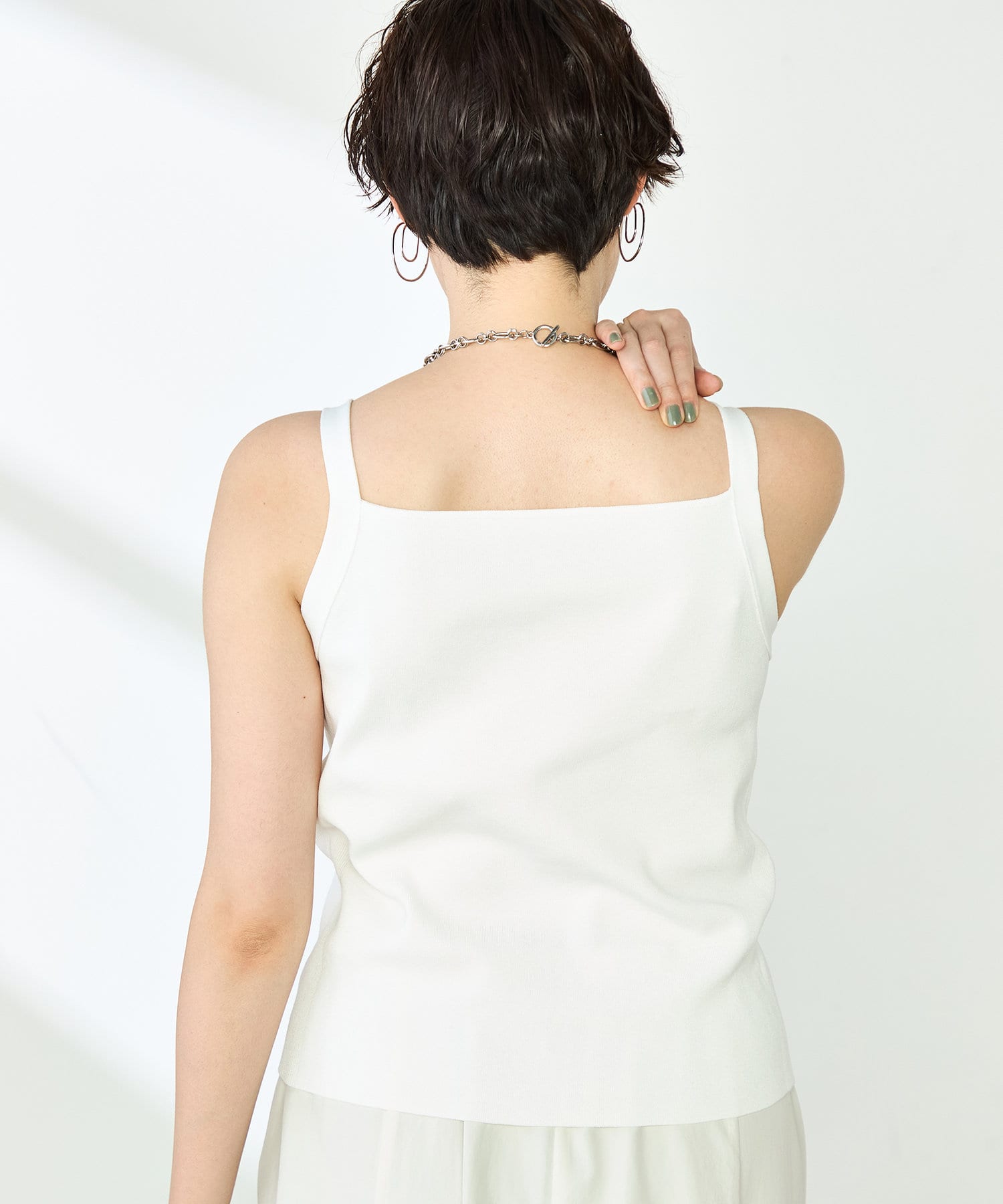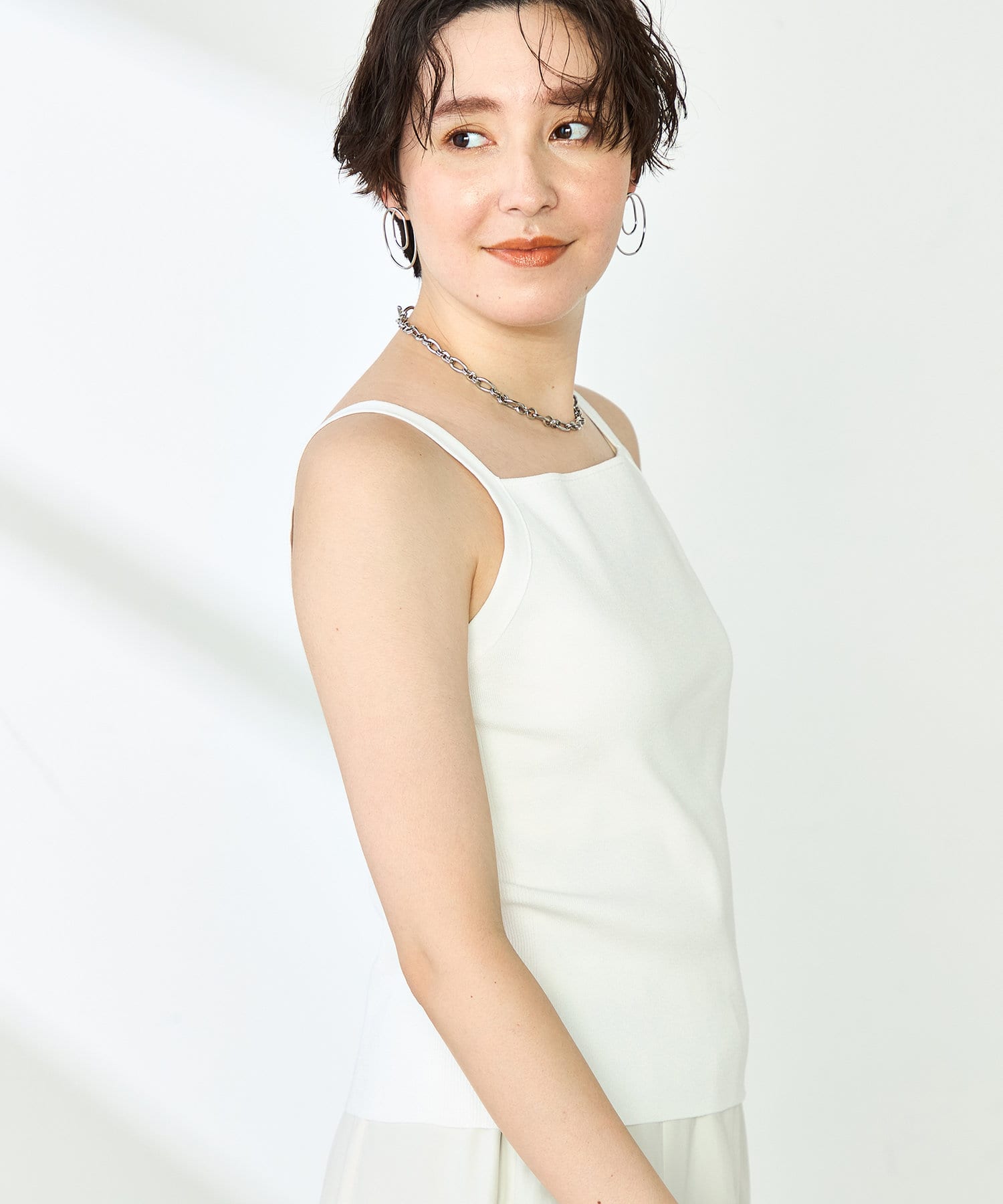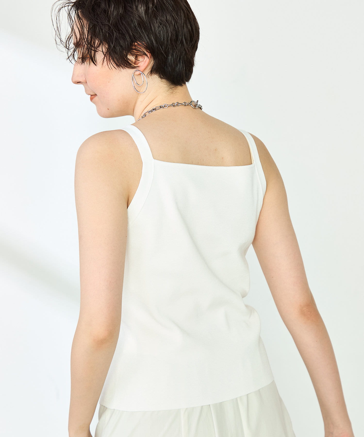 ・スクエアネックが特徴のヘルシーなタンクトップ