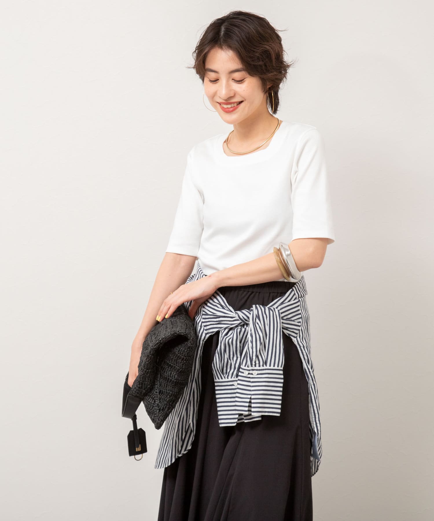 デコルテがキレイに見えるスクエアネックで、ジャケットやジレのインナーにすると丁度ストレートなラインで見えるのでとても気に入ってます。カジュアル見えしないので仕事用にヘビロテしてます!