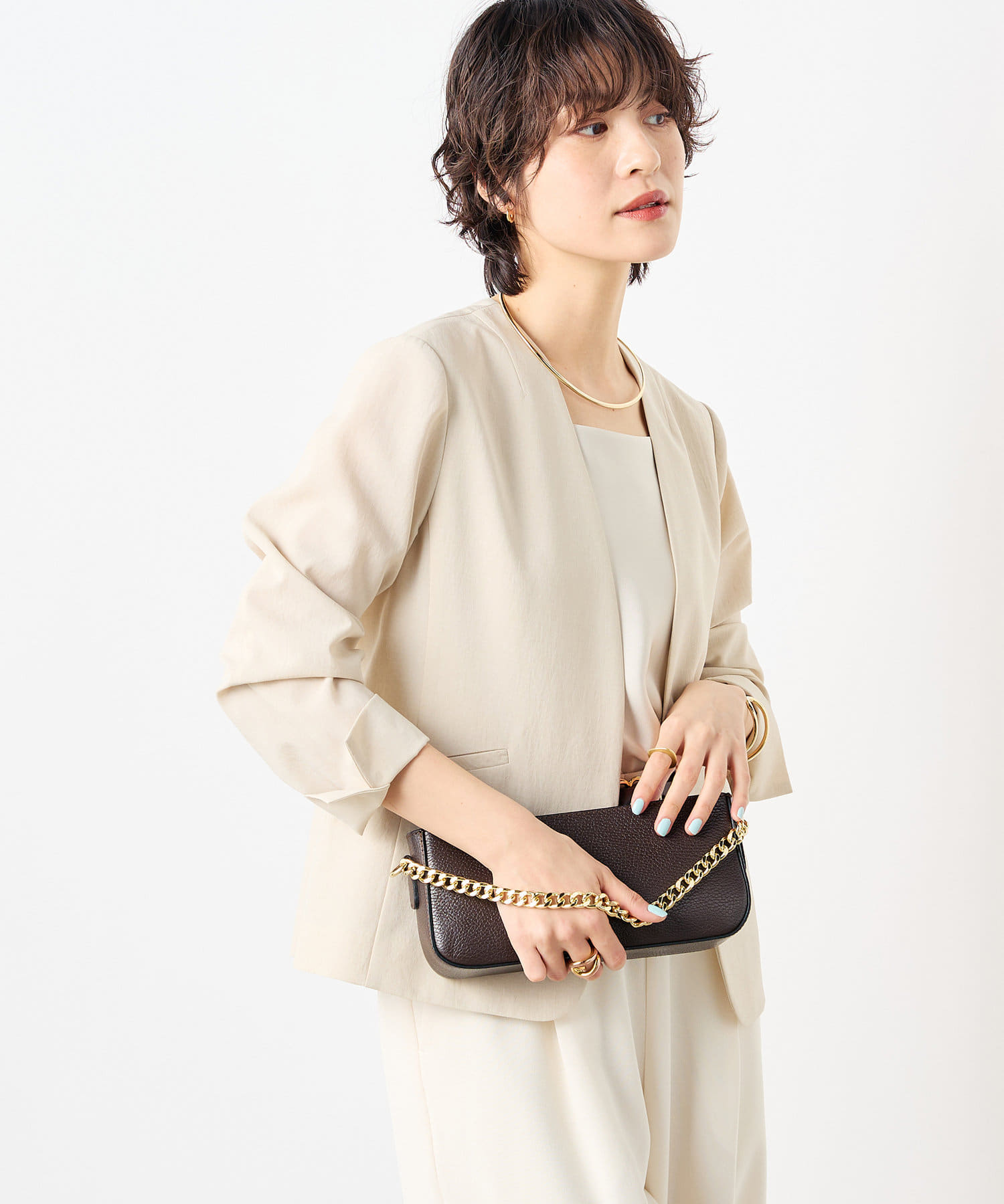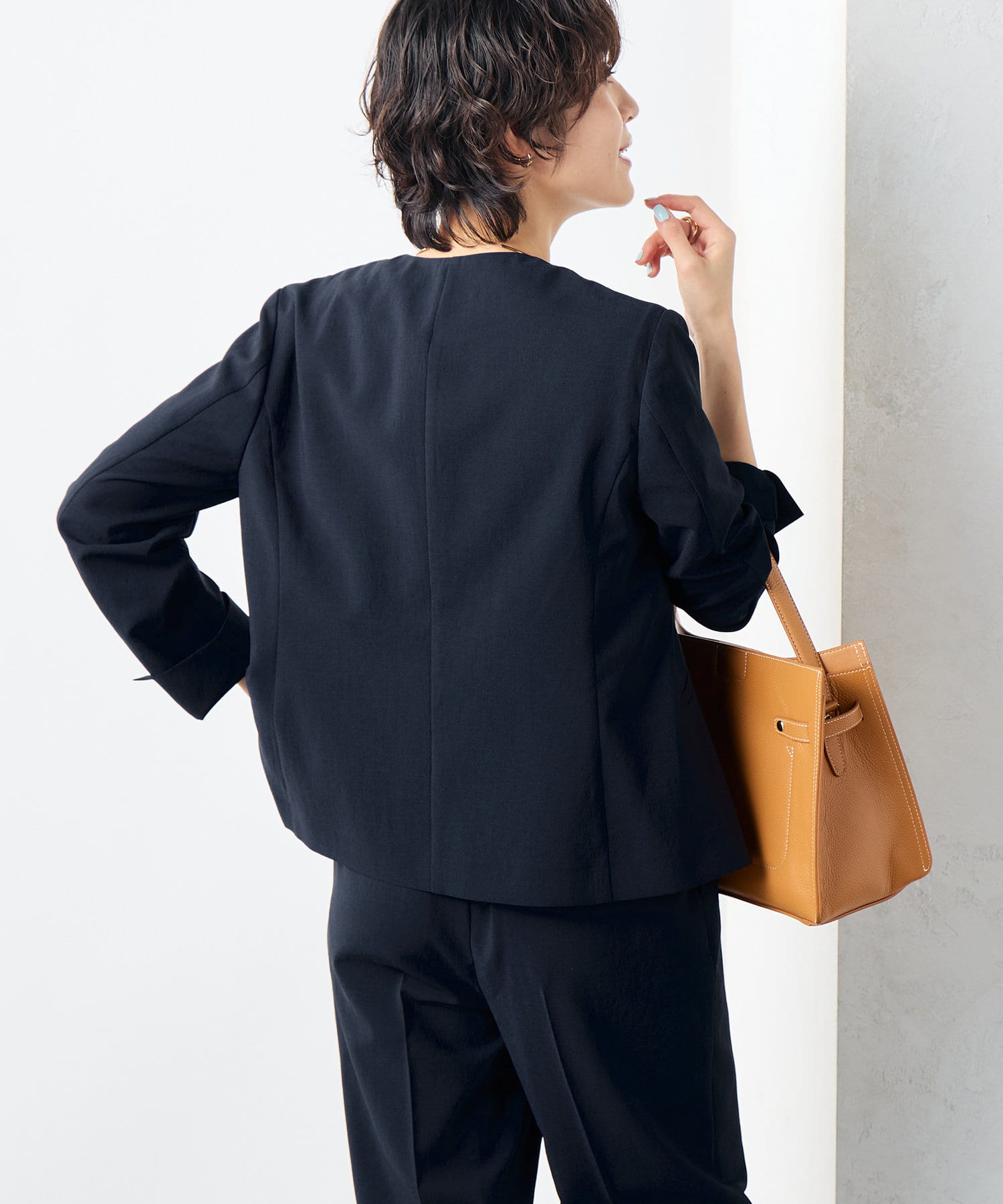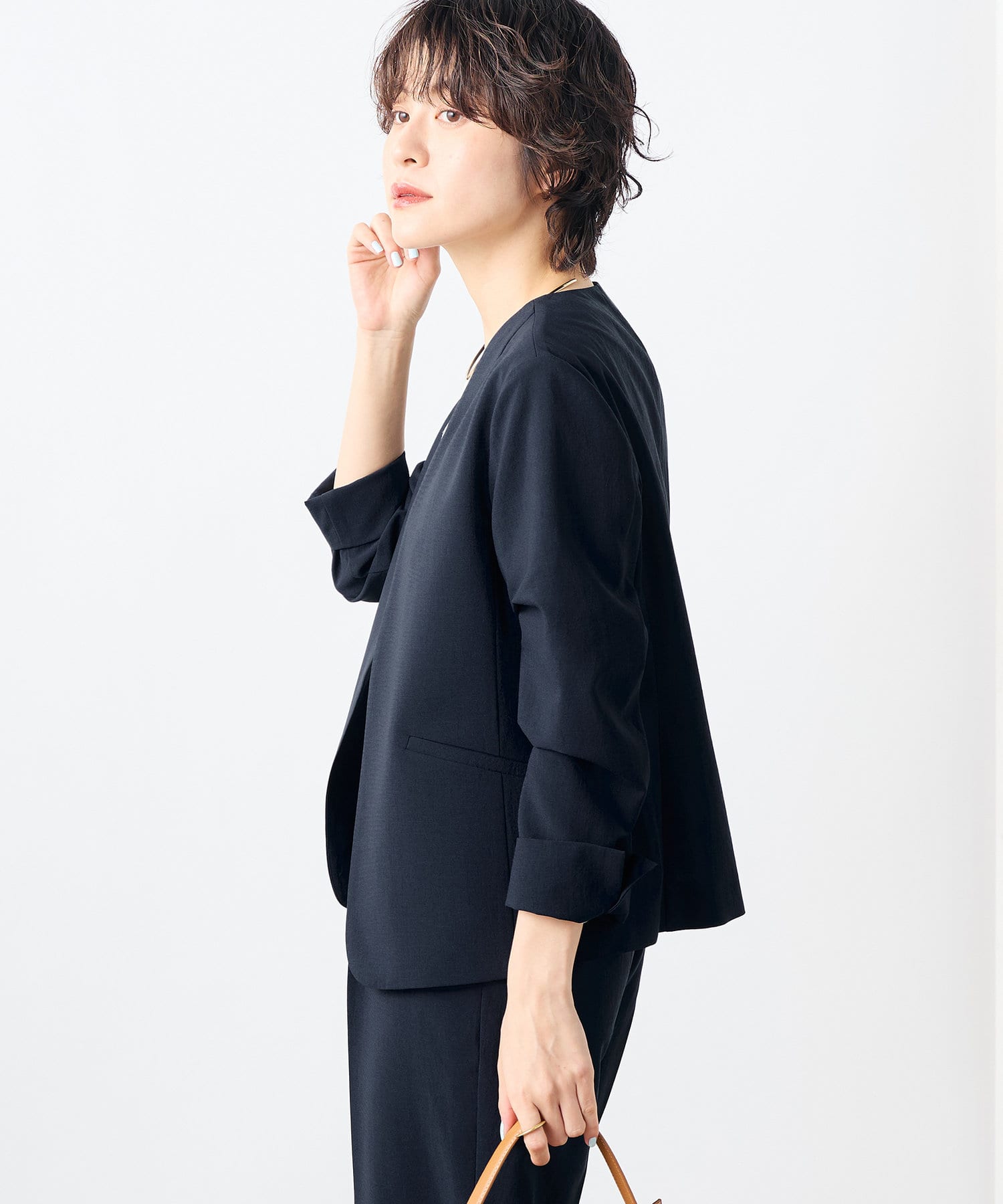 ・ドライタッチのトロ風素材を使用したノーカラージャケット