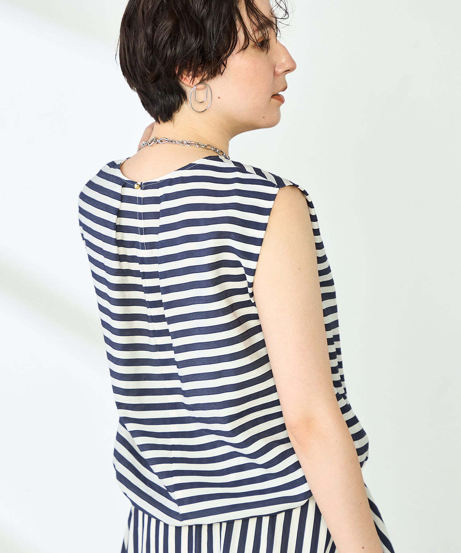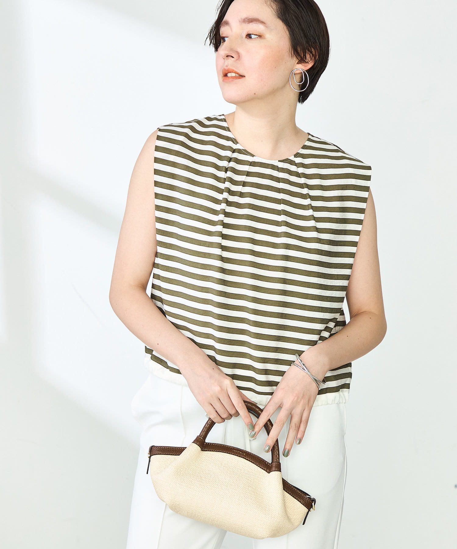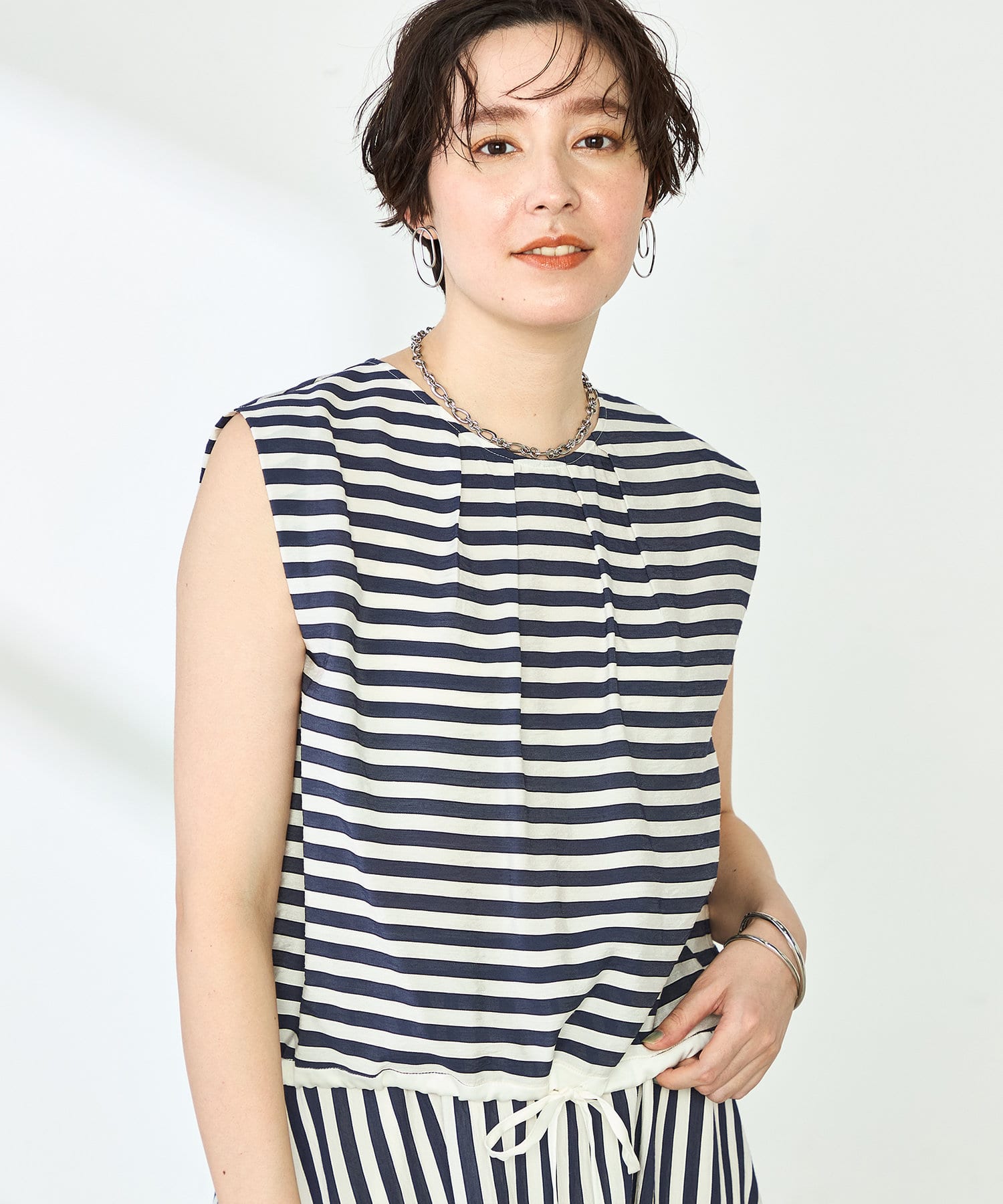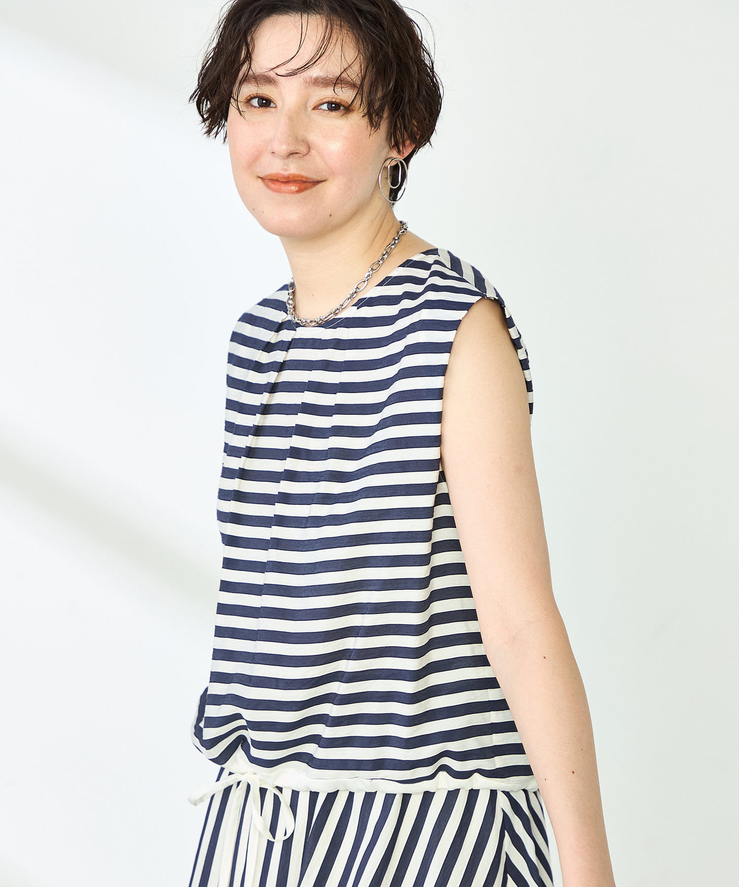 ・夏らしい爽やかさのあるボーダーノースリーブブラウス