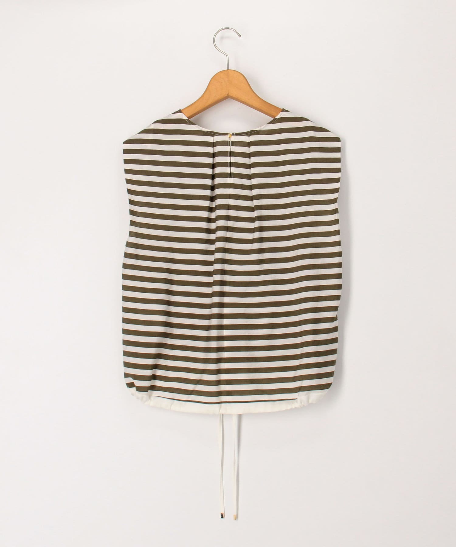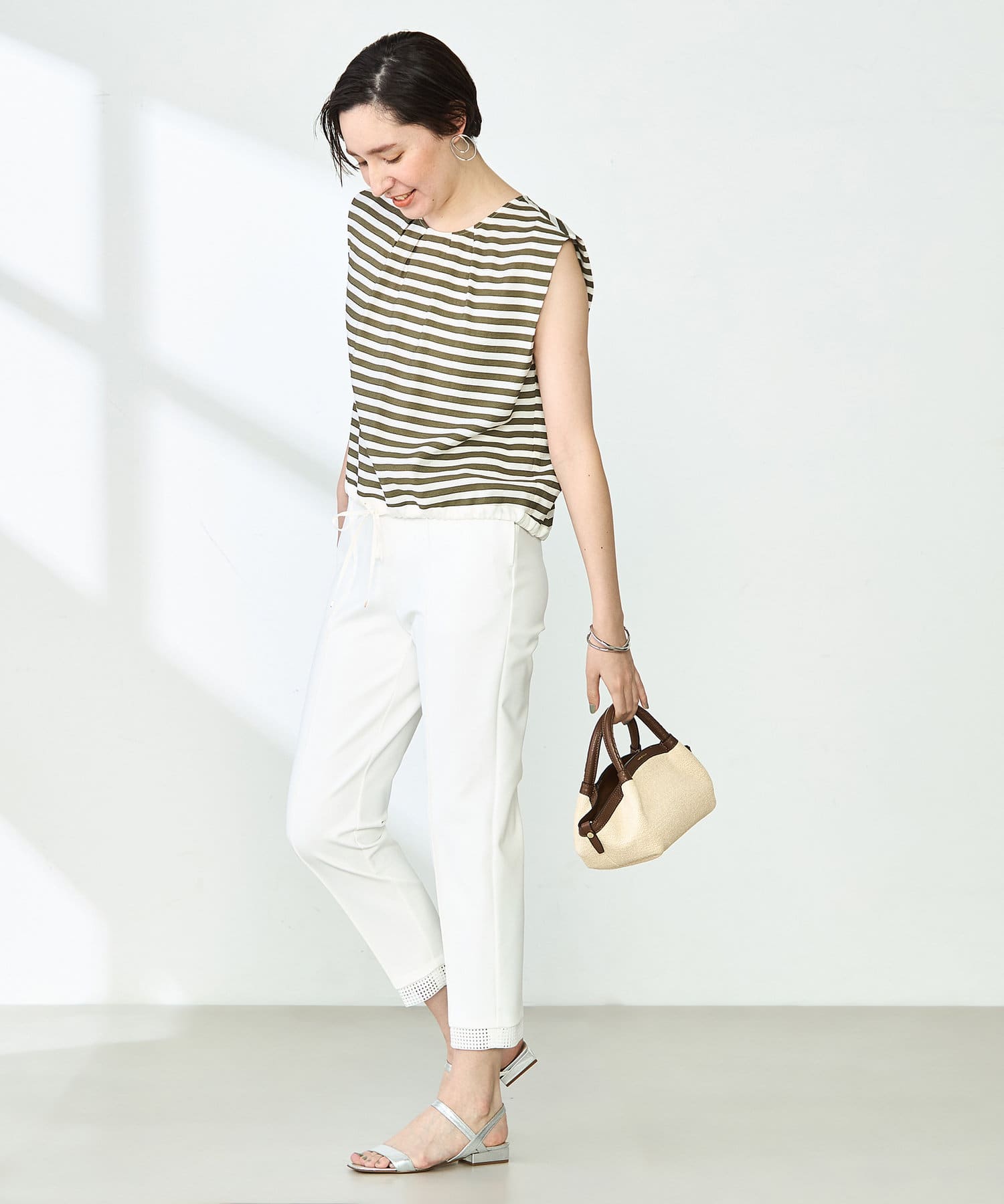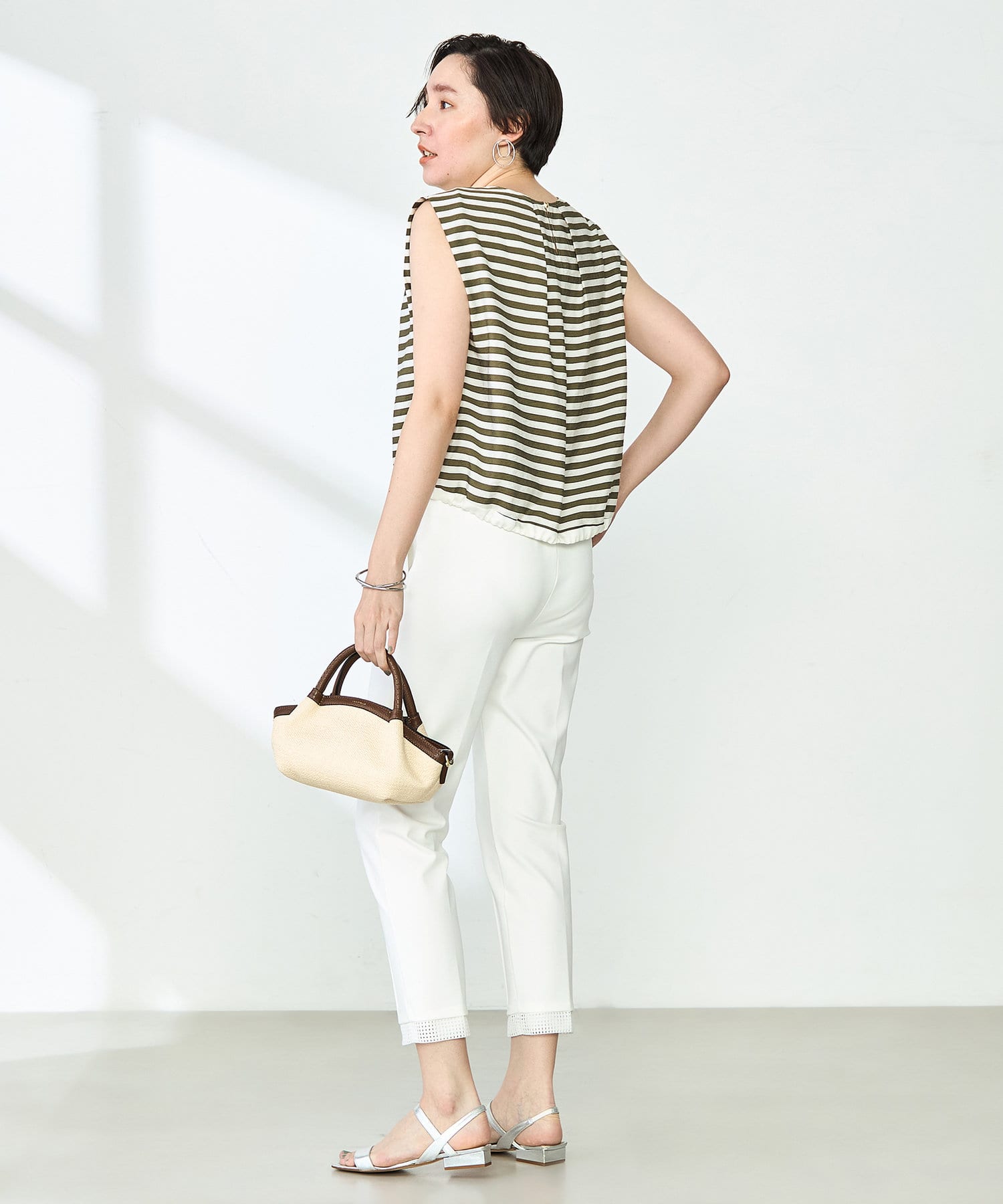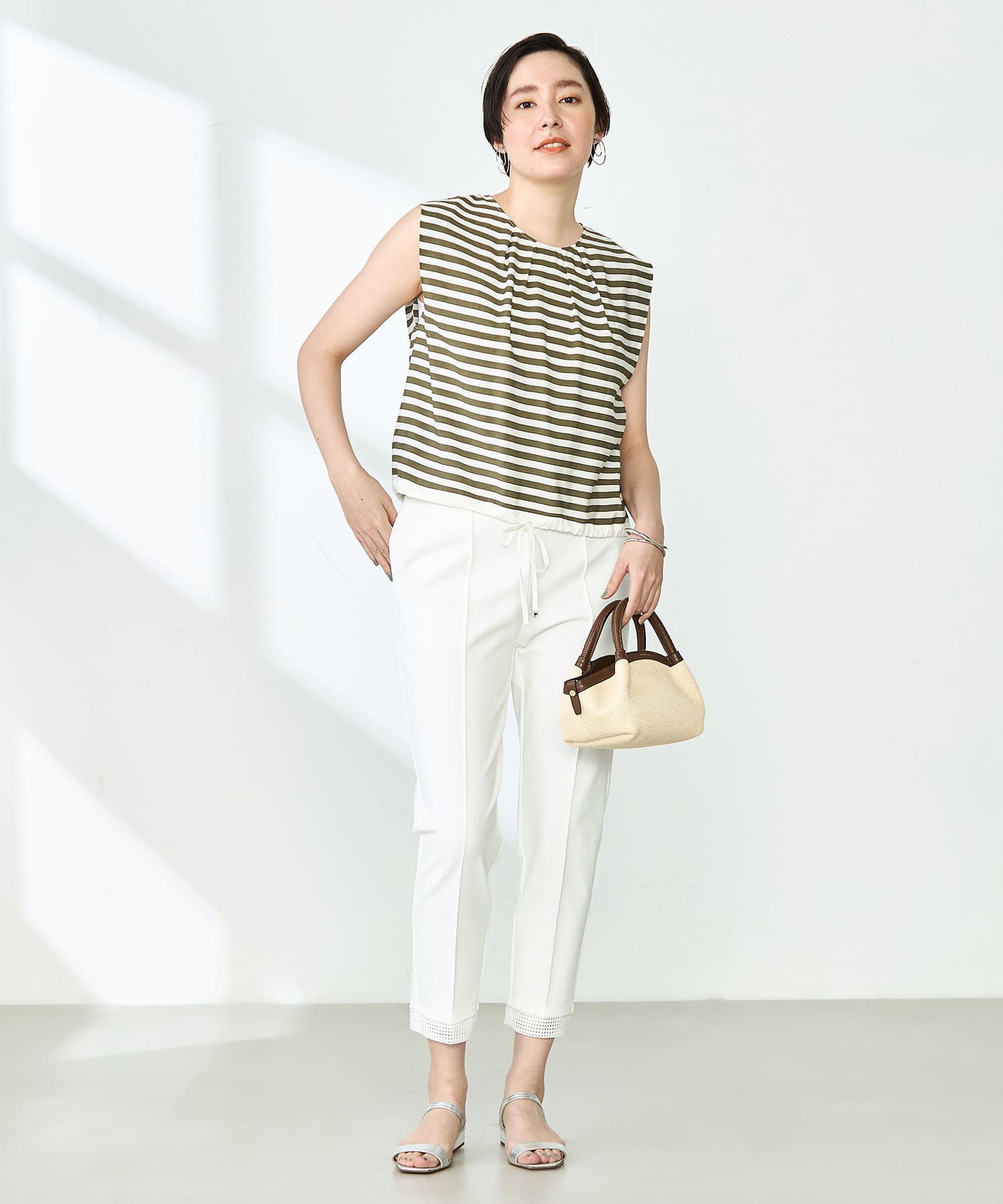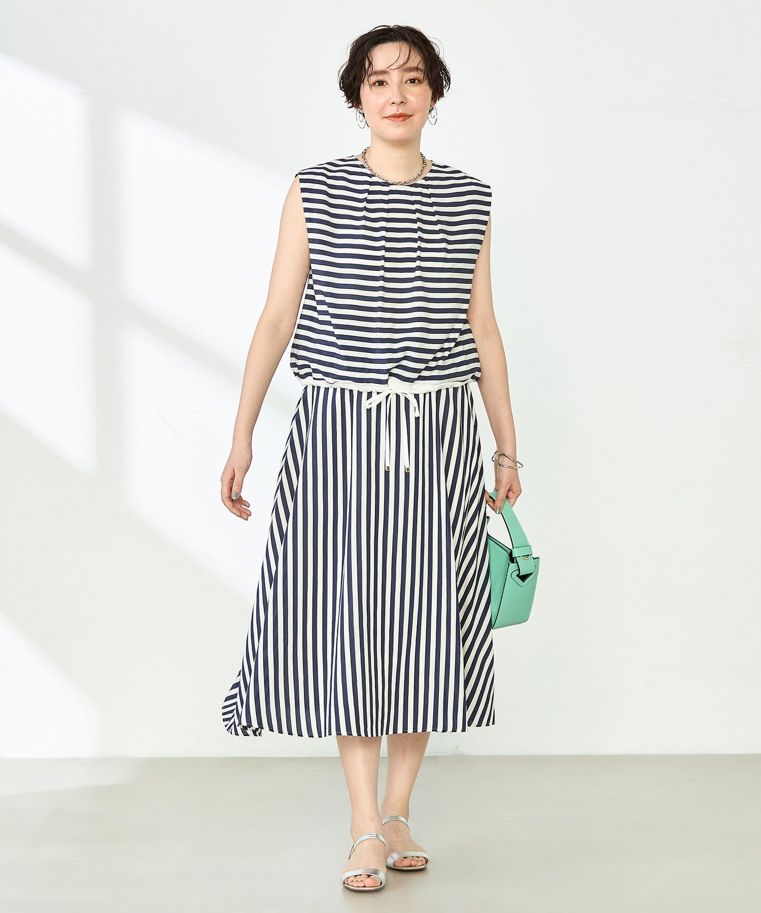 ・夏らしい爽やかさのあるボーダーノースリーブブラウス