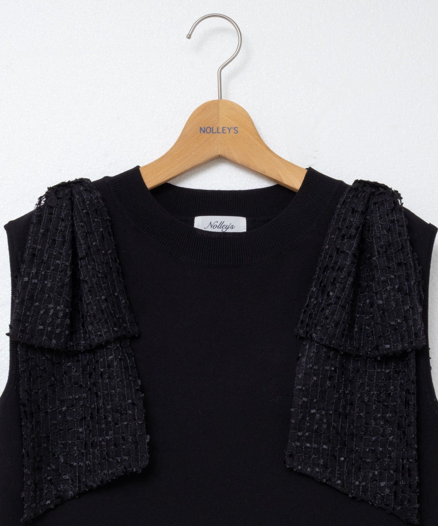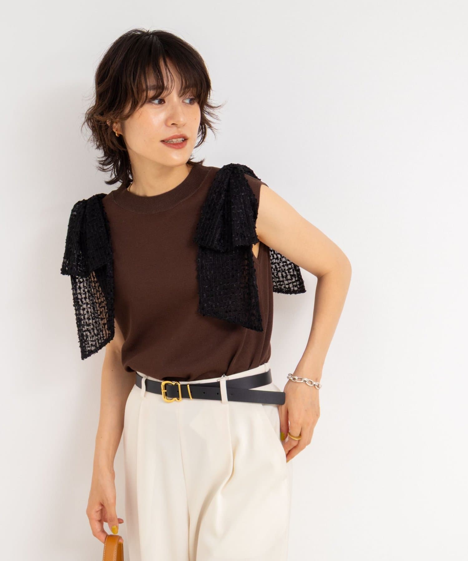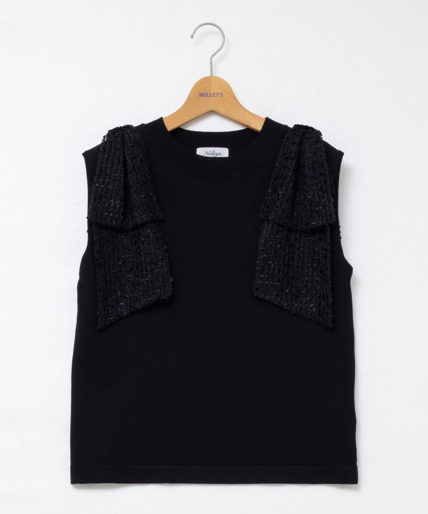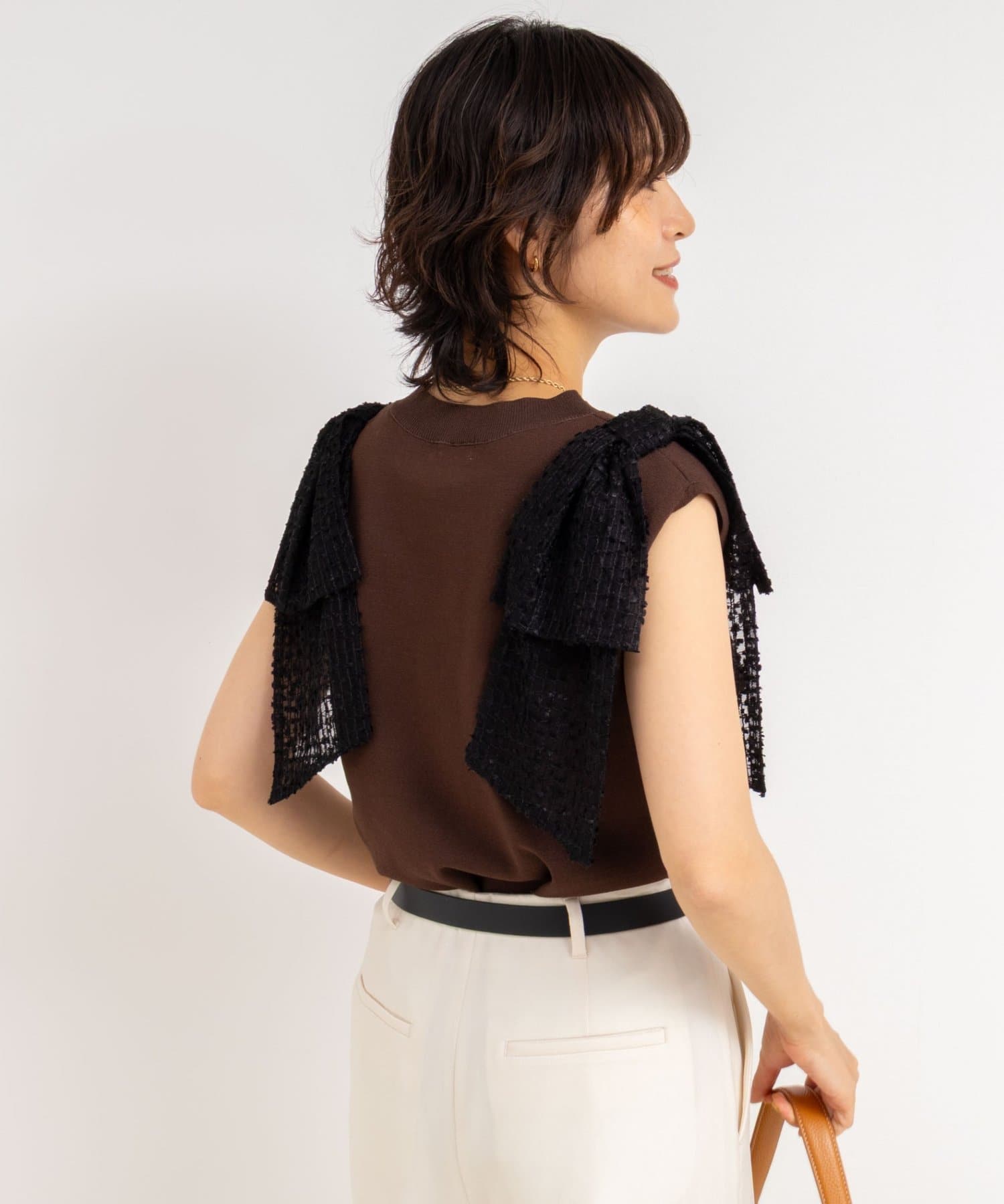 ・シアーなファンシー生地のリボンが肩を華やかに彩る、ノースリーブのニットプルオーバーニット