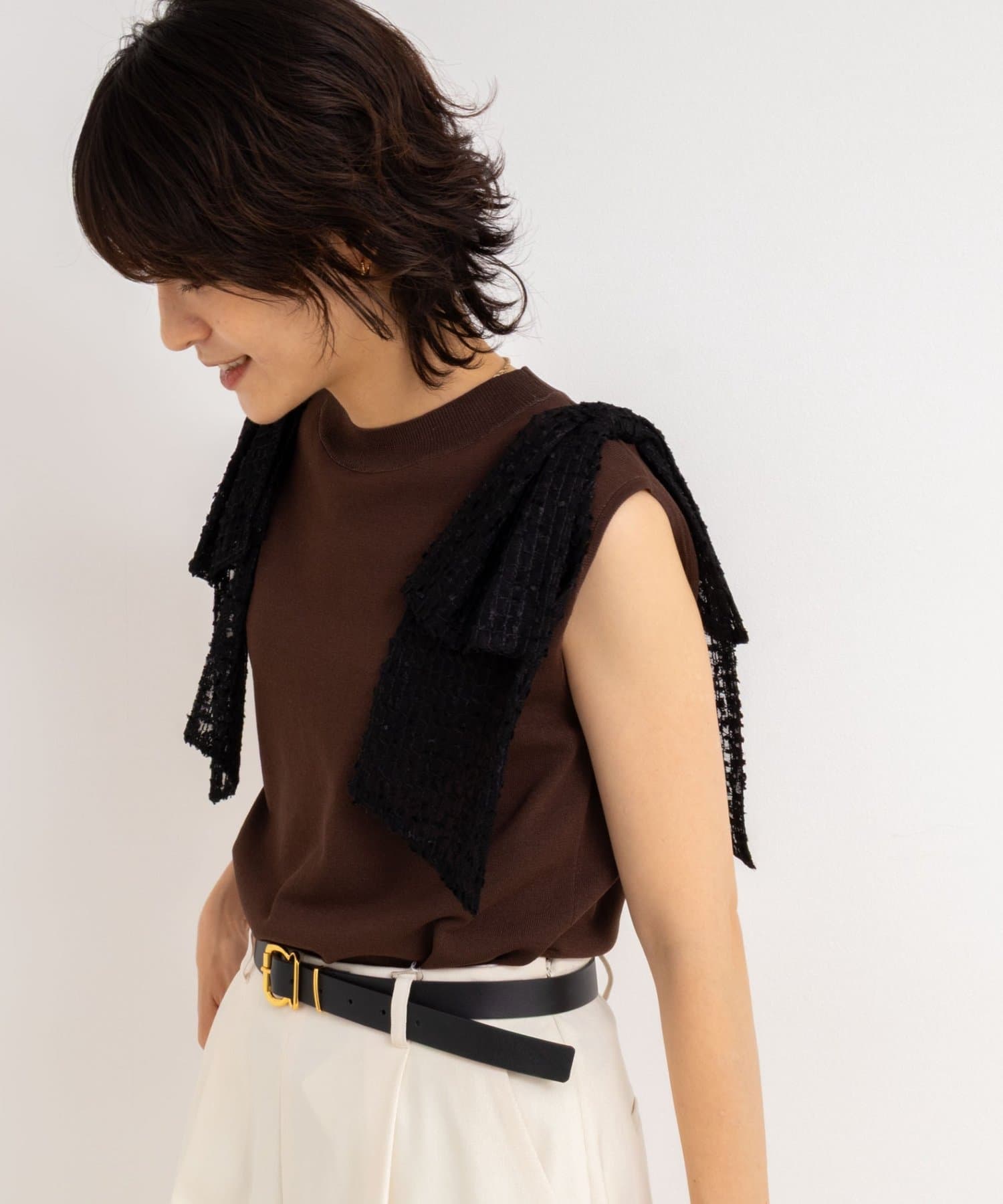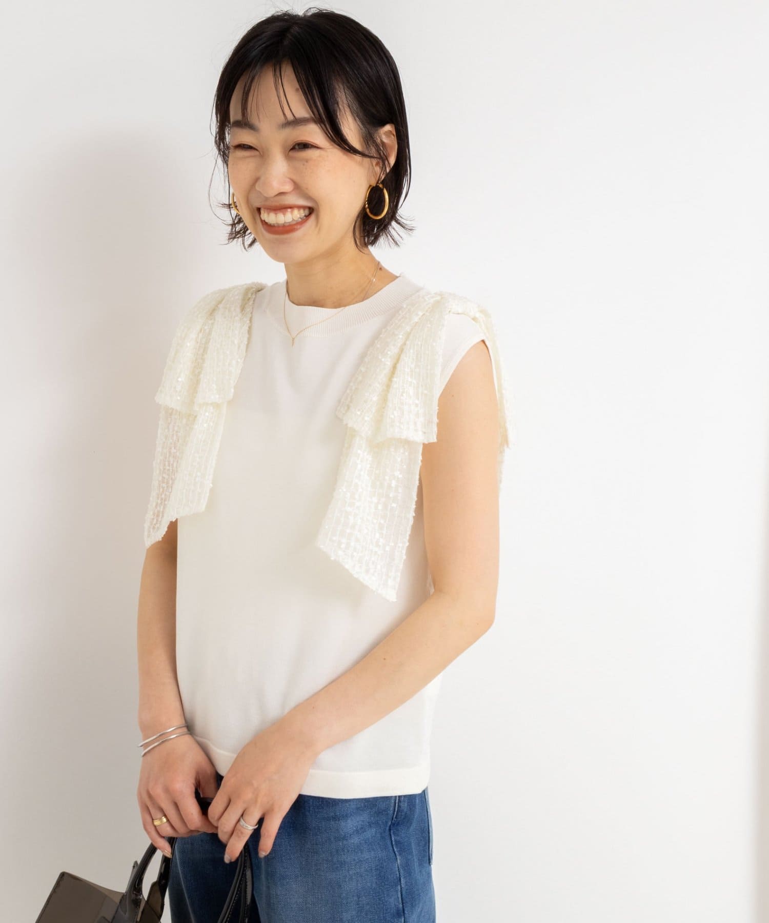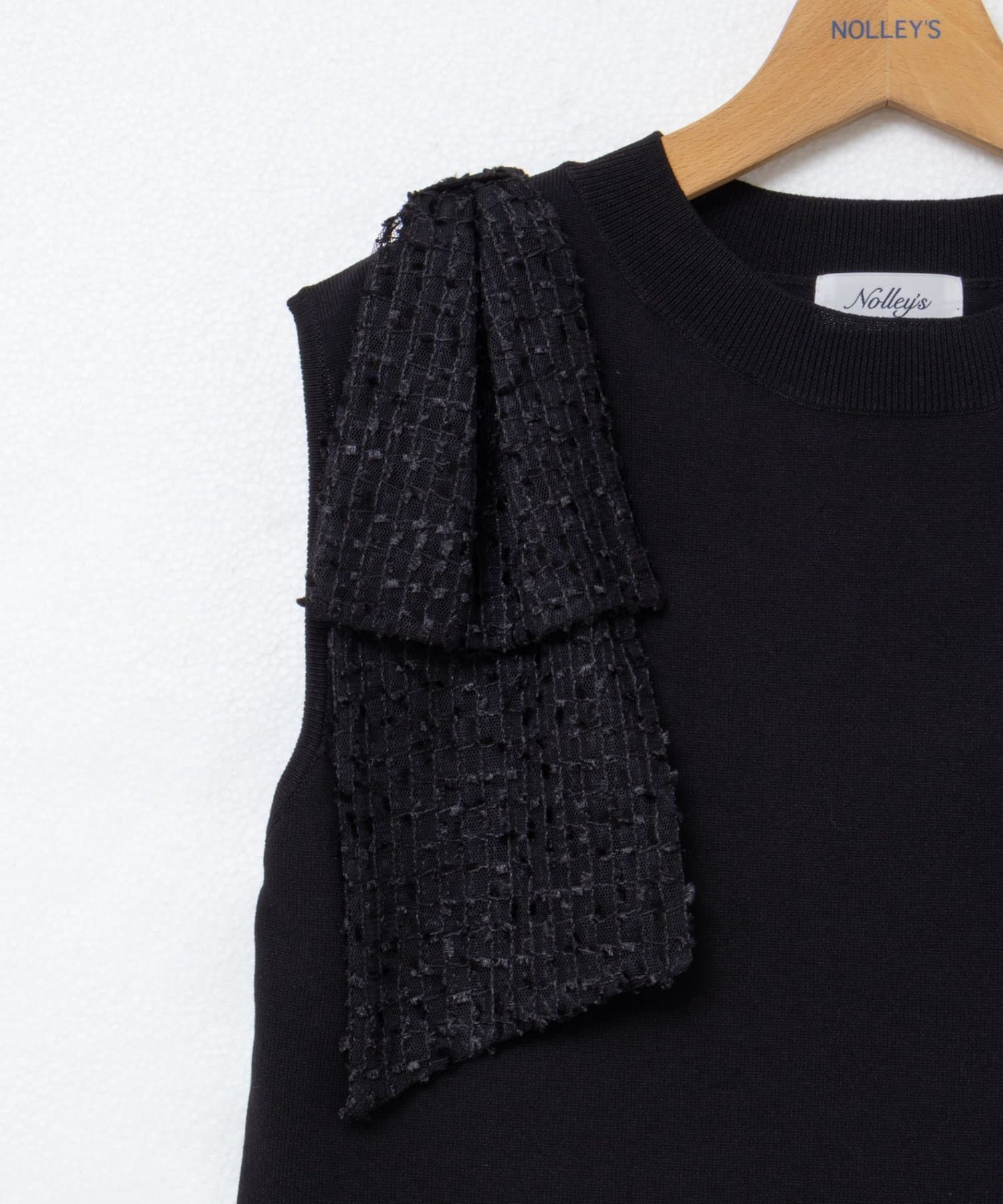 ・シアーなファンシー生地のリボンが肩を華やかに彩る、ノースリーブのニットプルオーバーニット