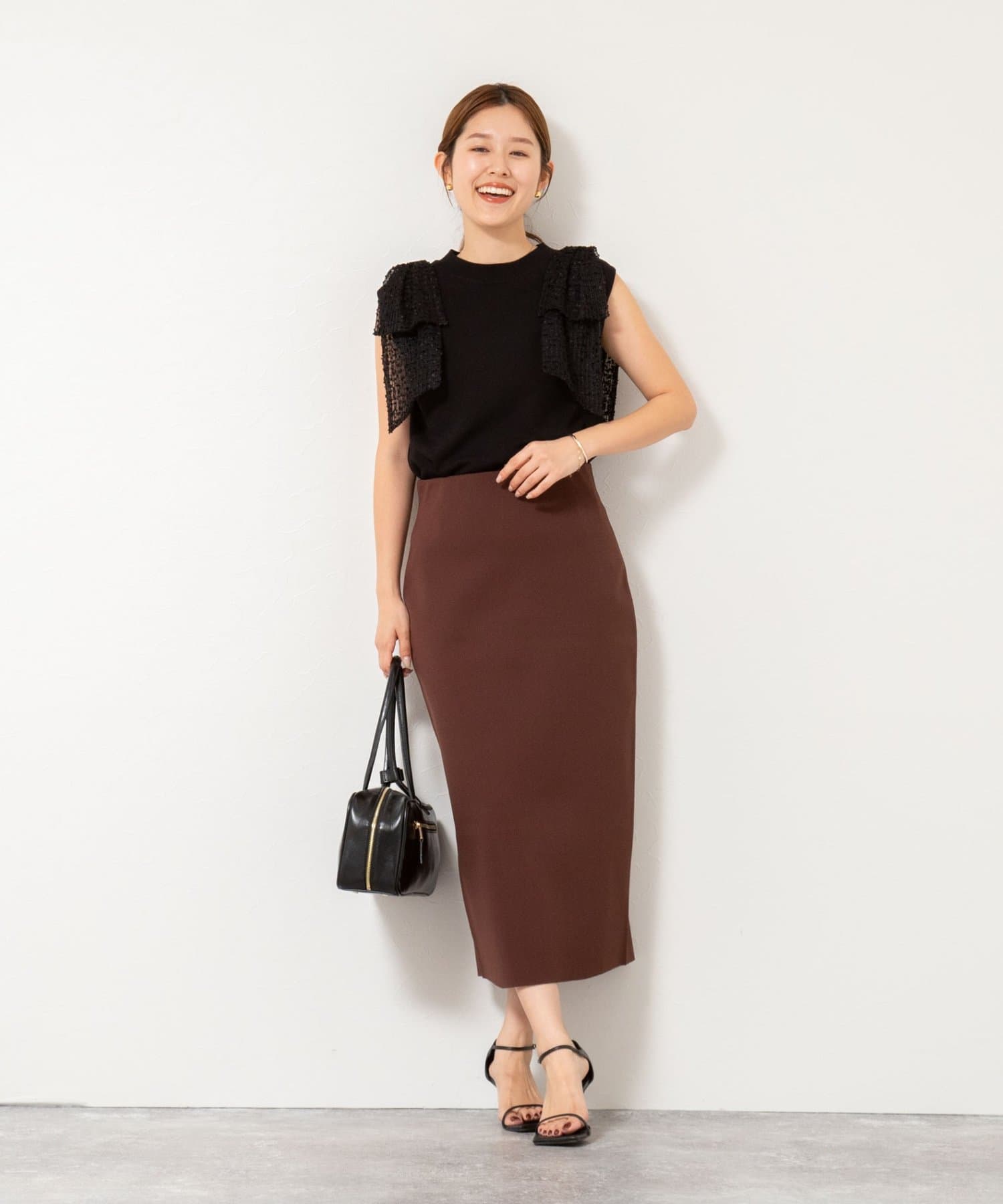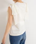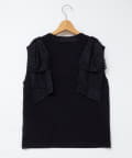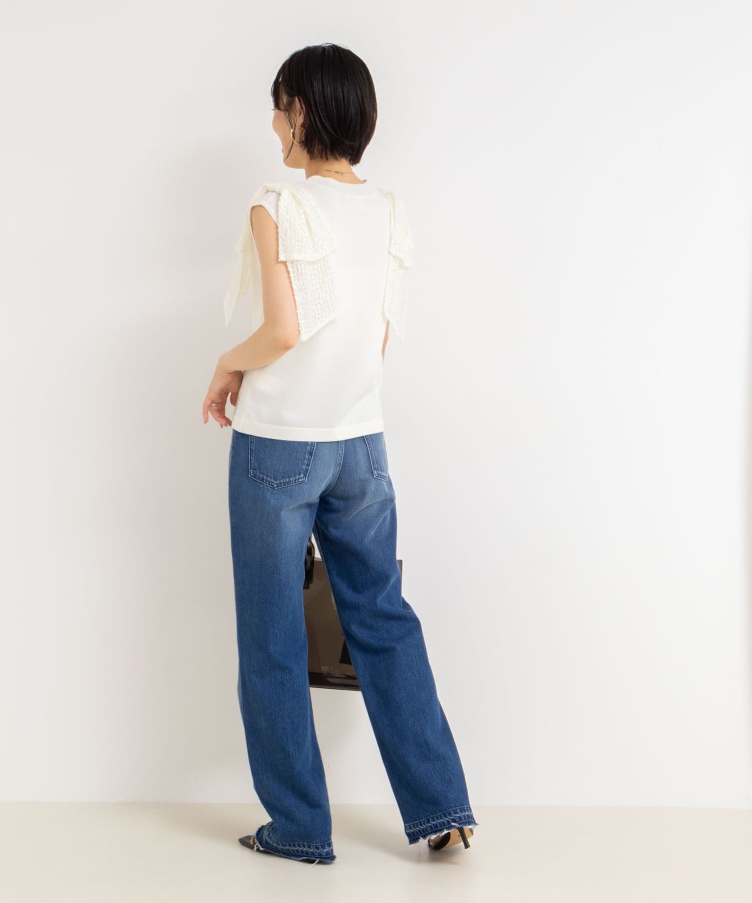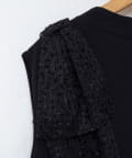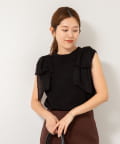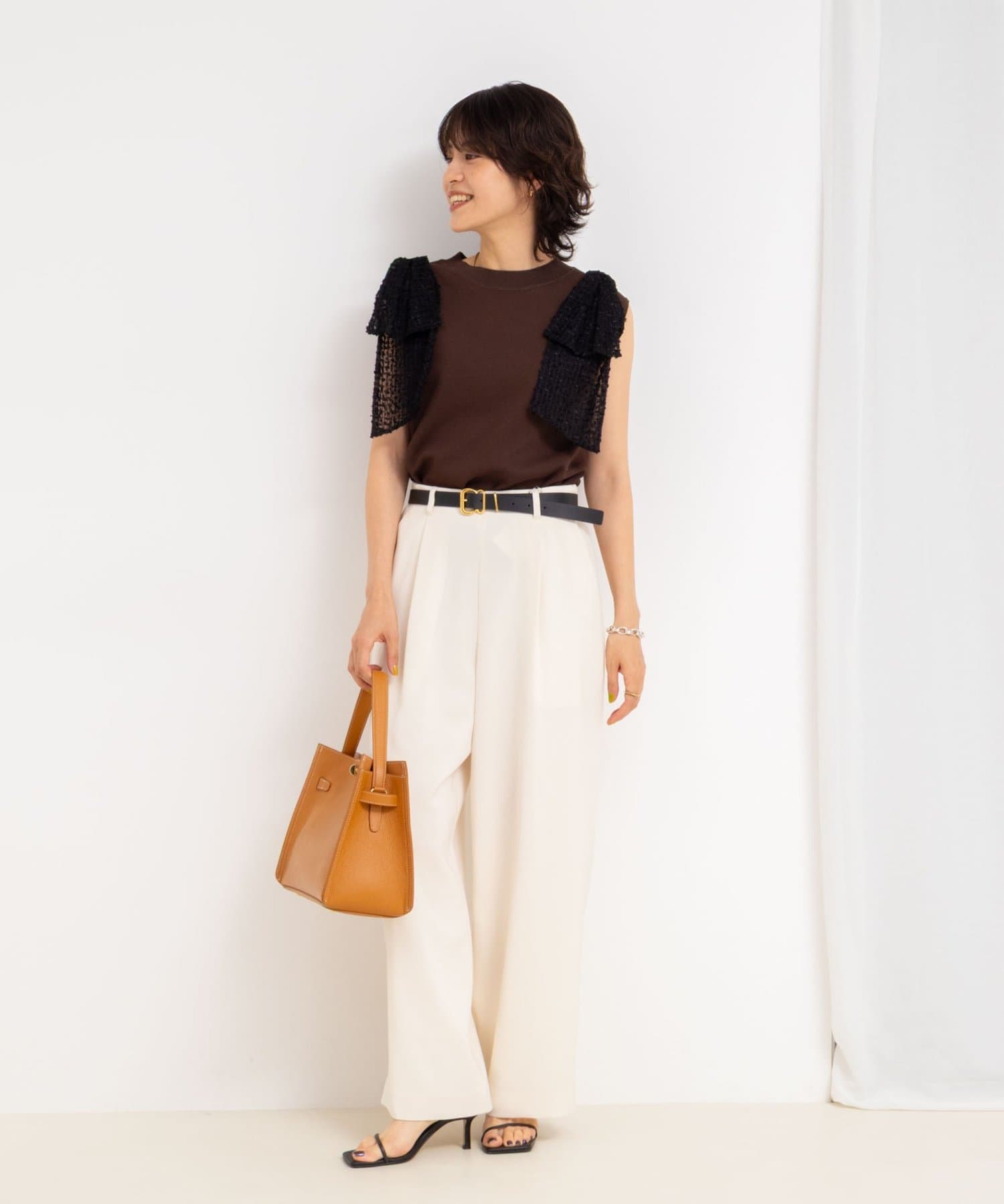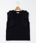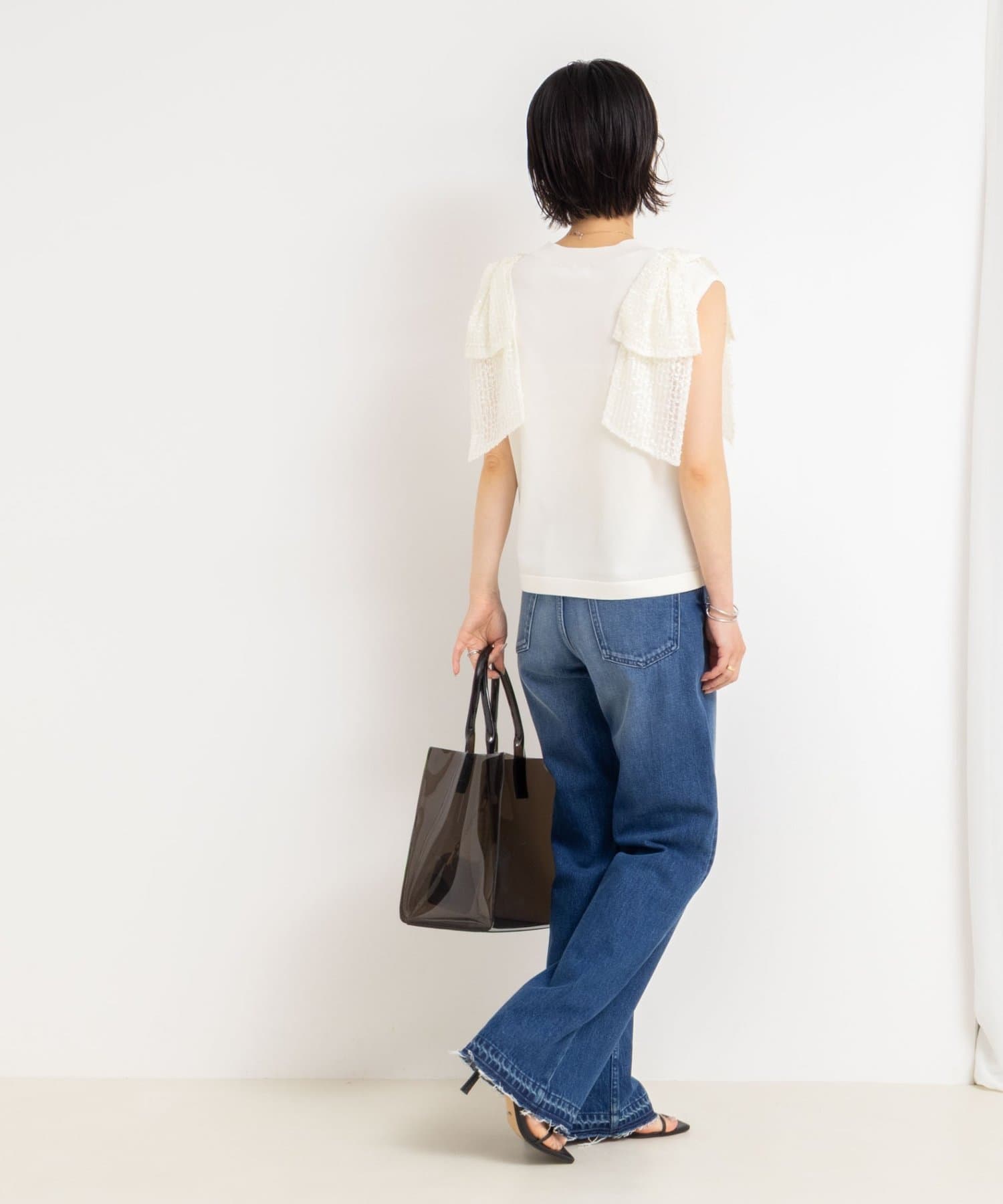 ・シアーなファンシー生地のリボンが肩を華やかに彩る、ノースリーブのニットプルオーバーニット