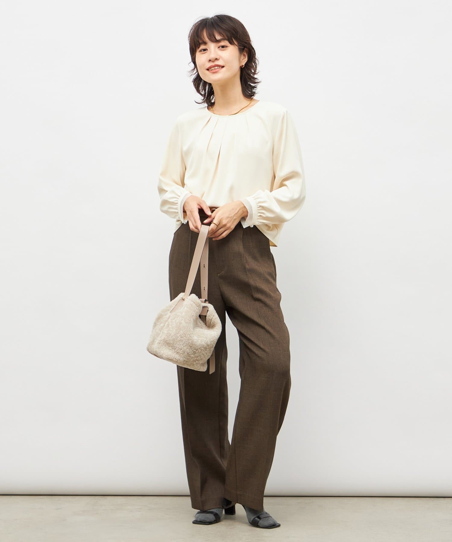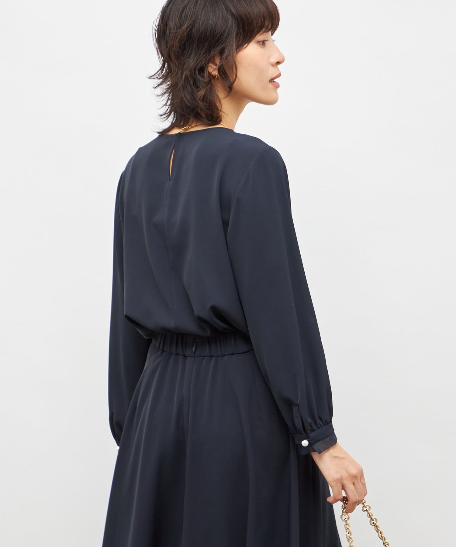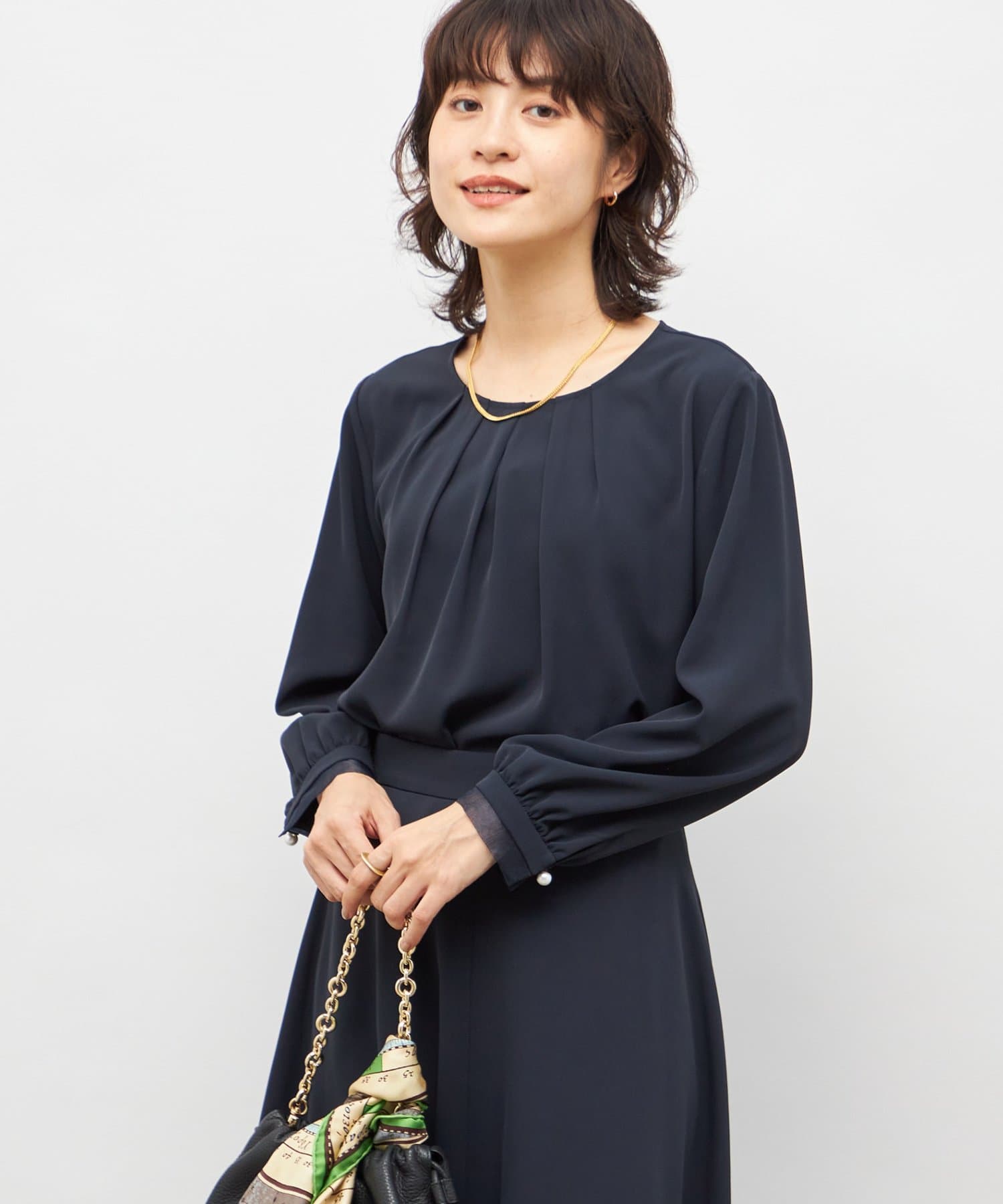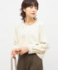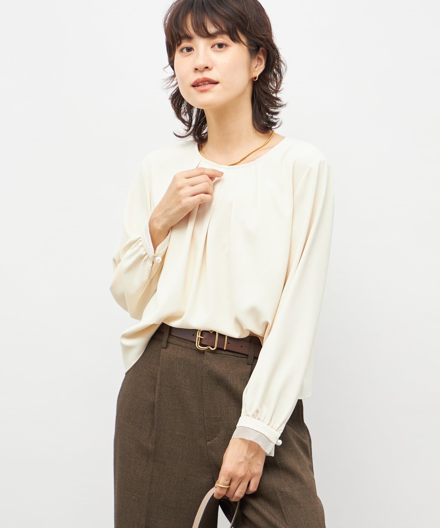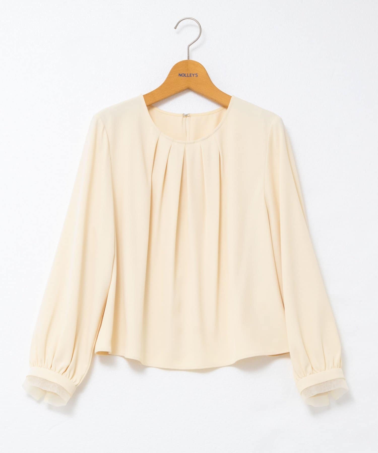 ・袖口のオーガンジーデザインとパール釦がポイントのきれいめブラウス
