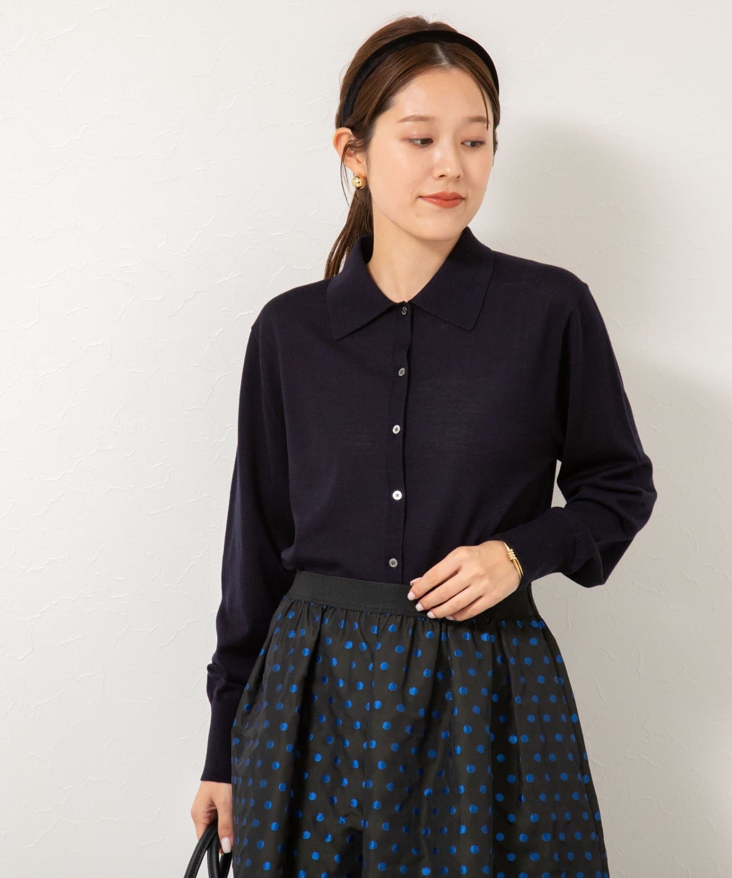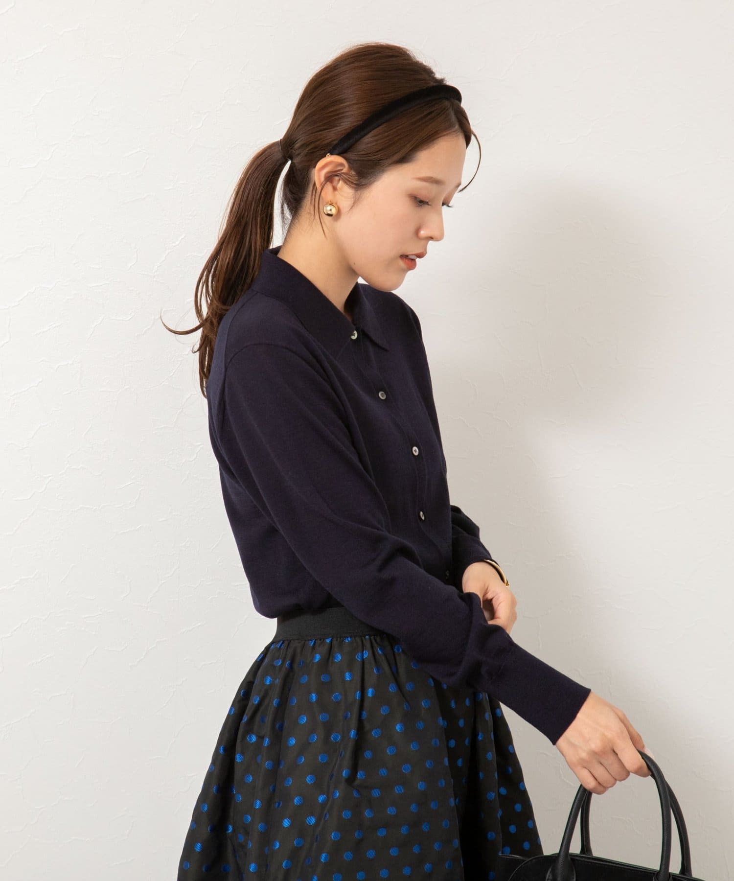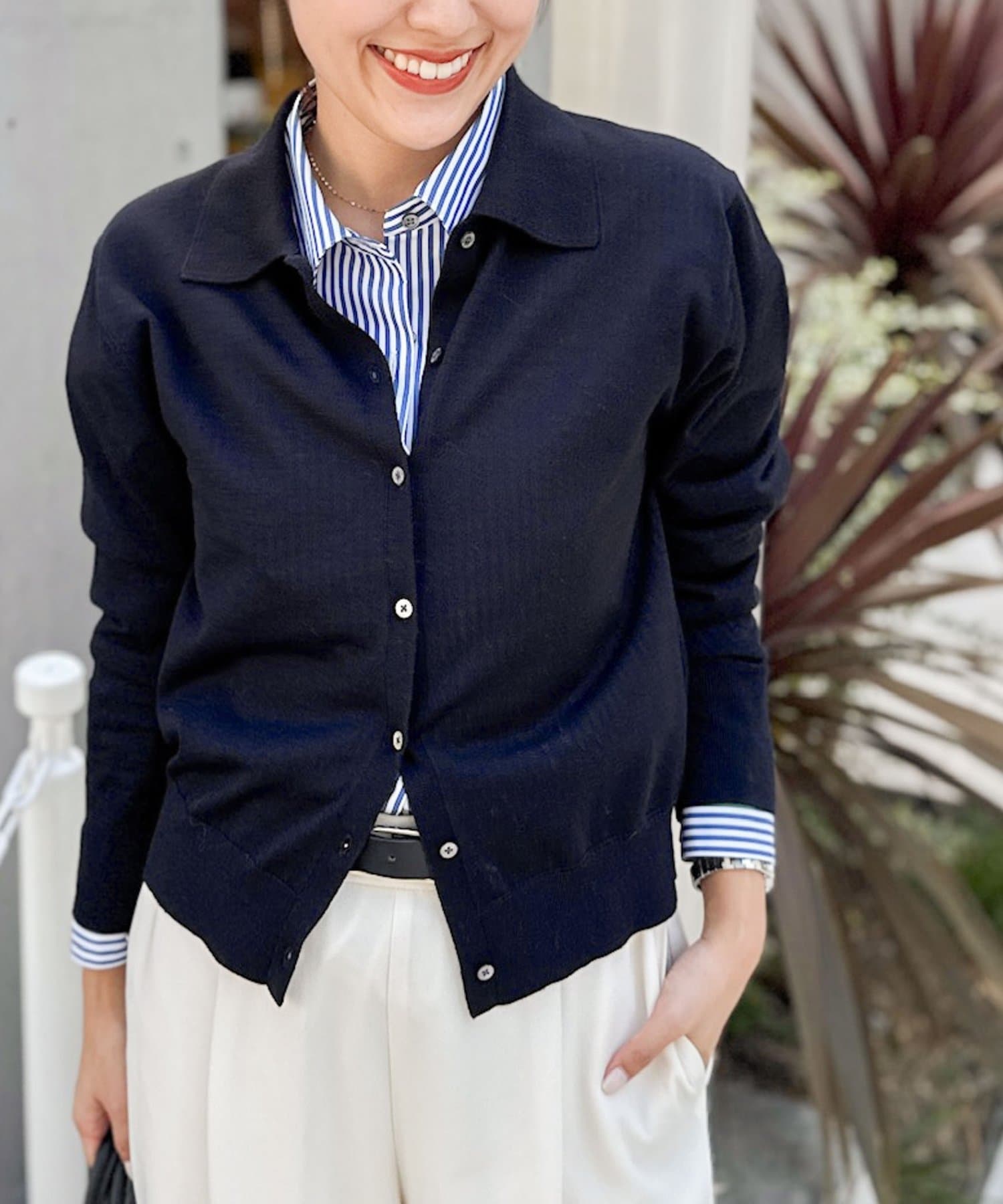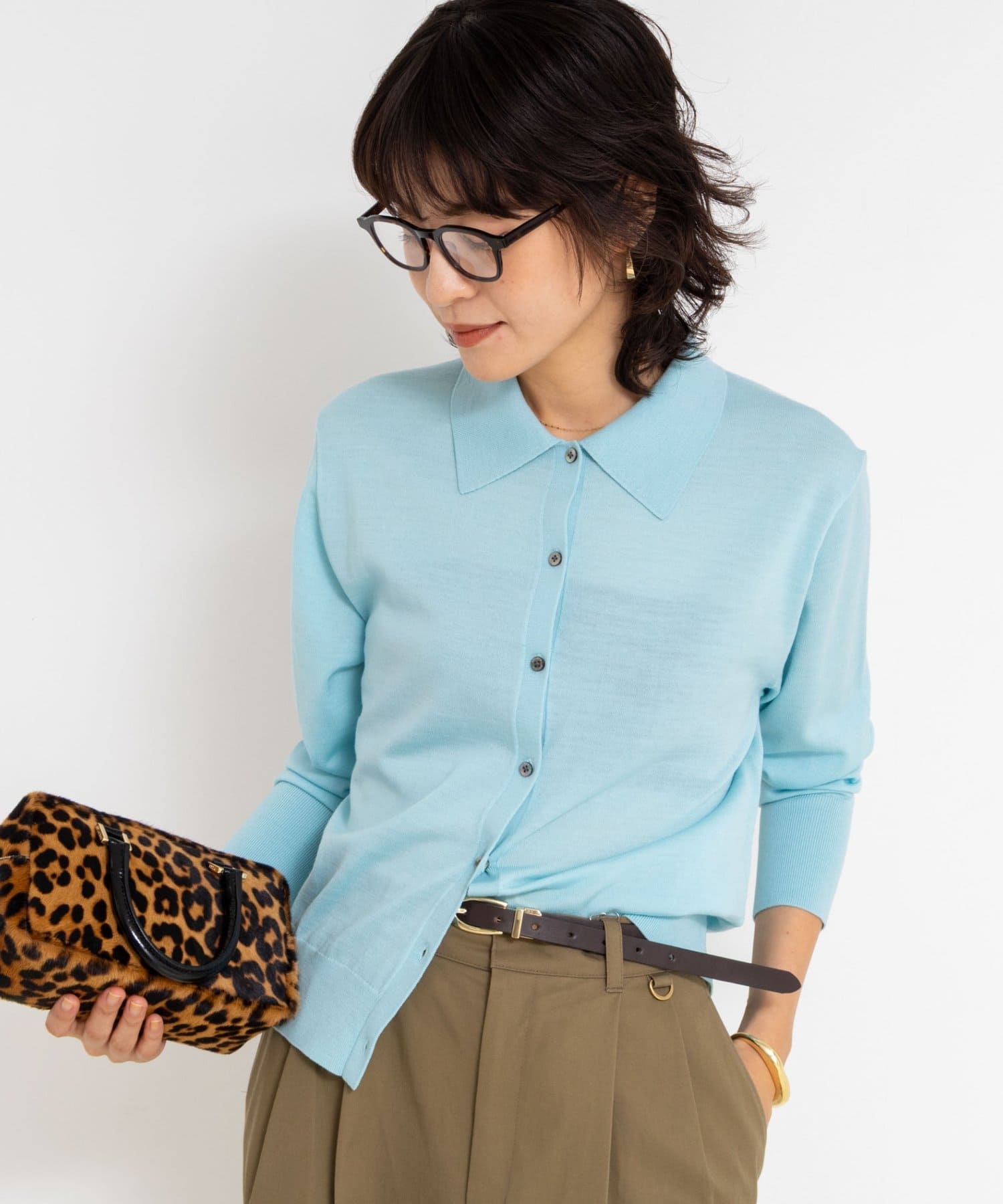 ・襟付きカーディガンは前を開けてはおりとしても、前を閉めてポロニット風の着用もおすすめ