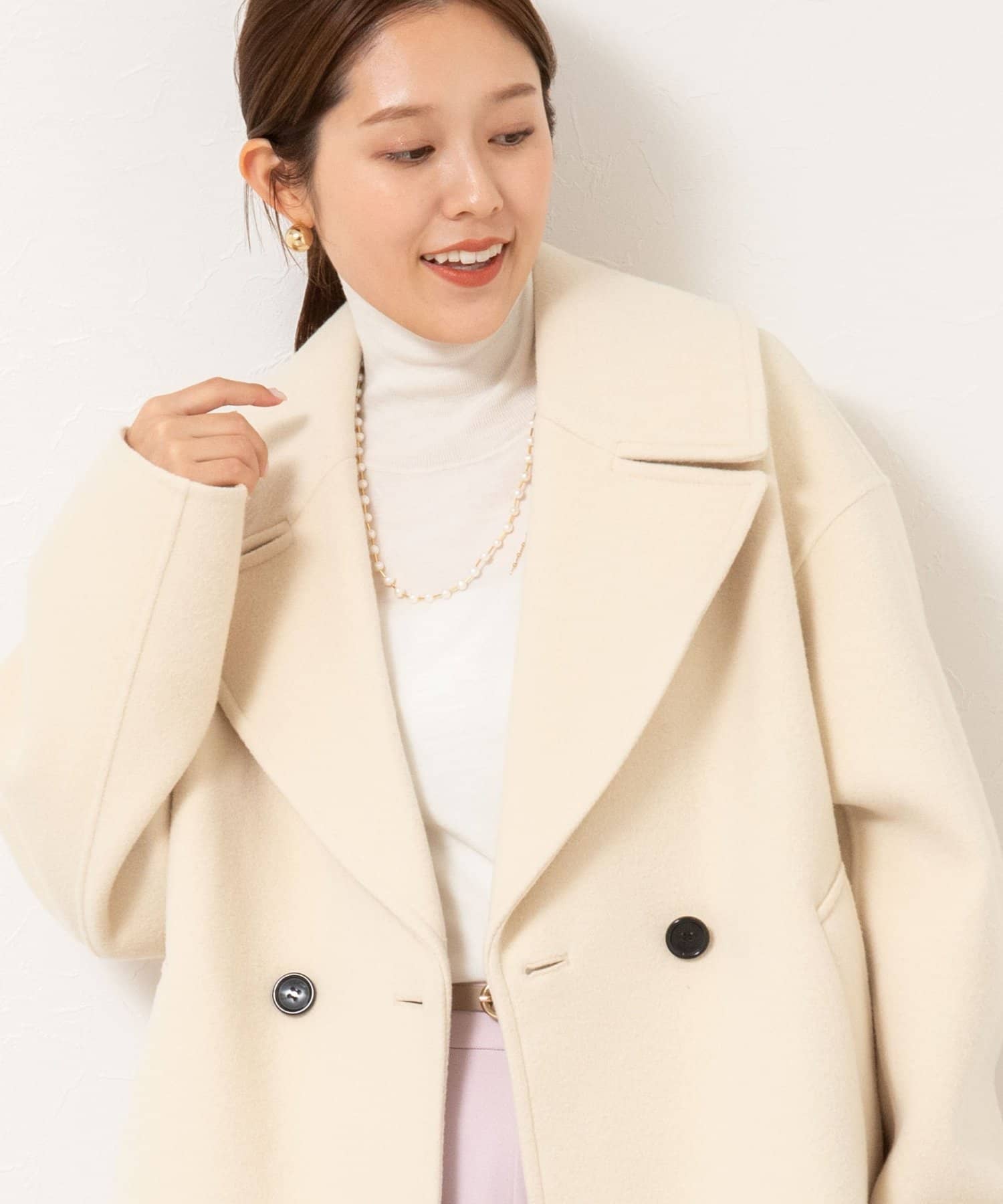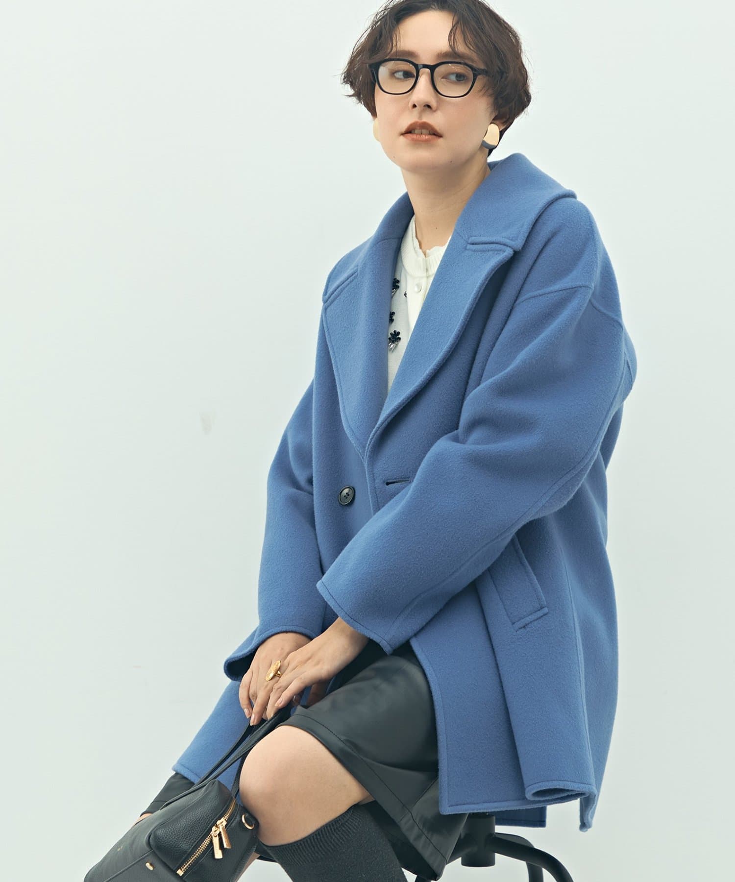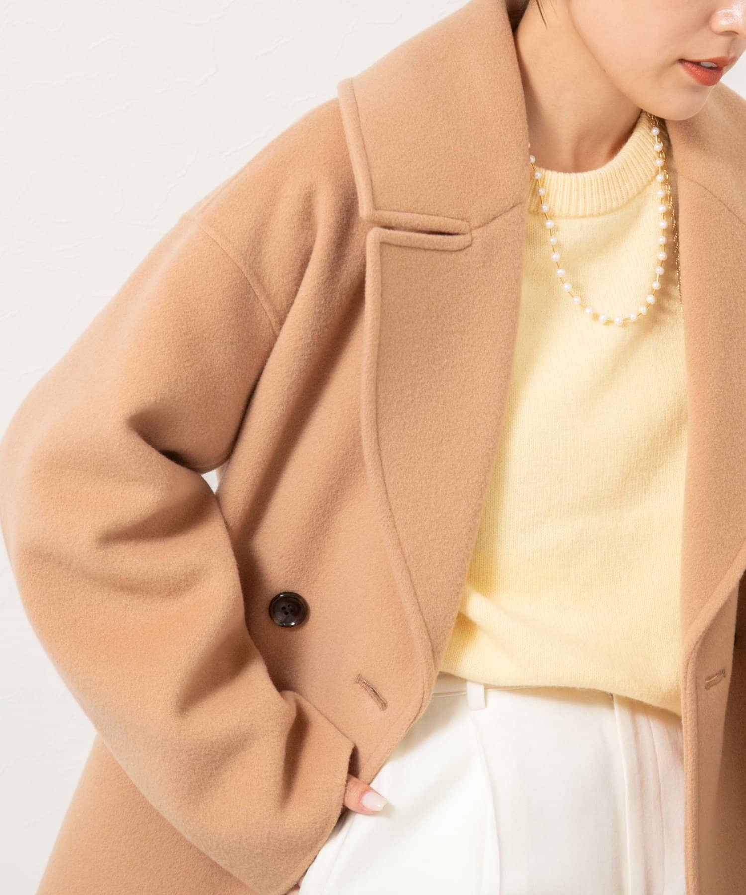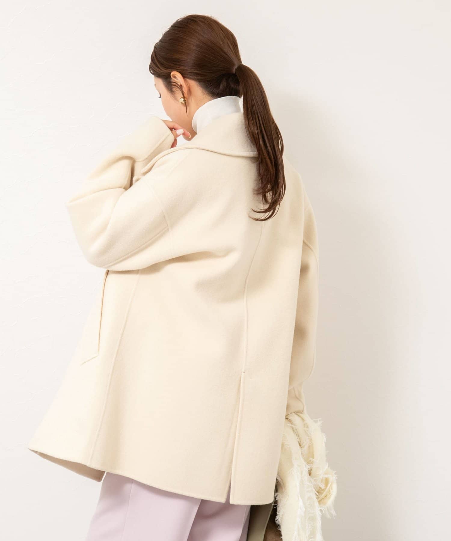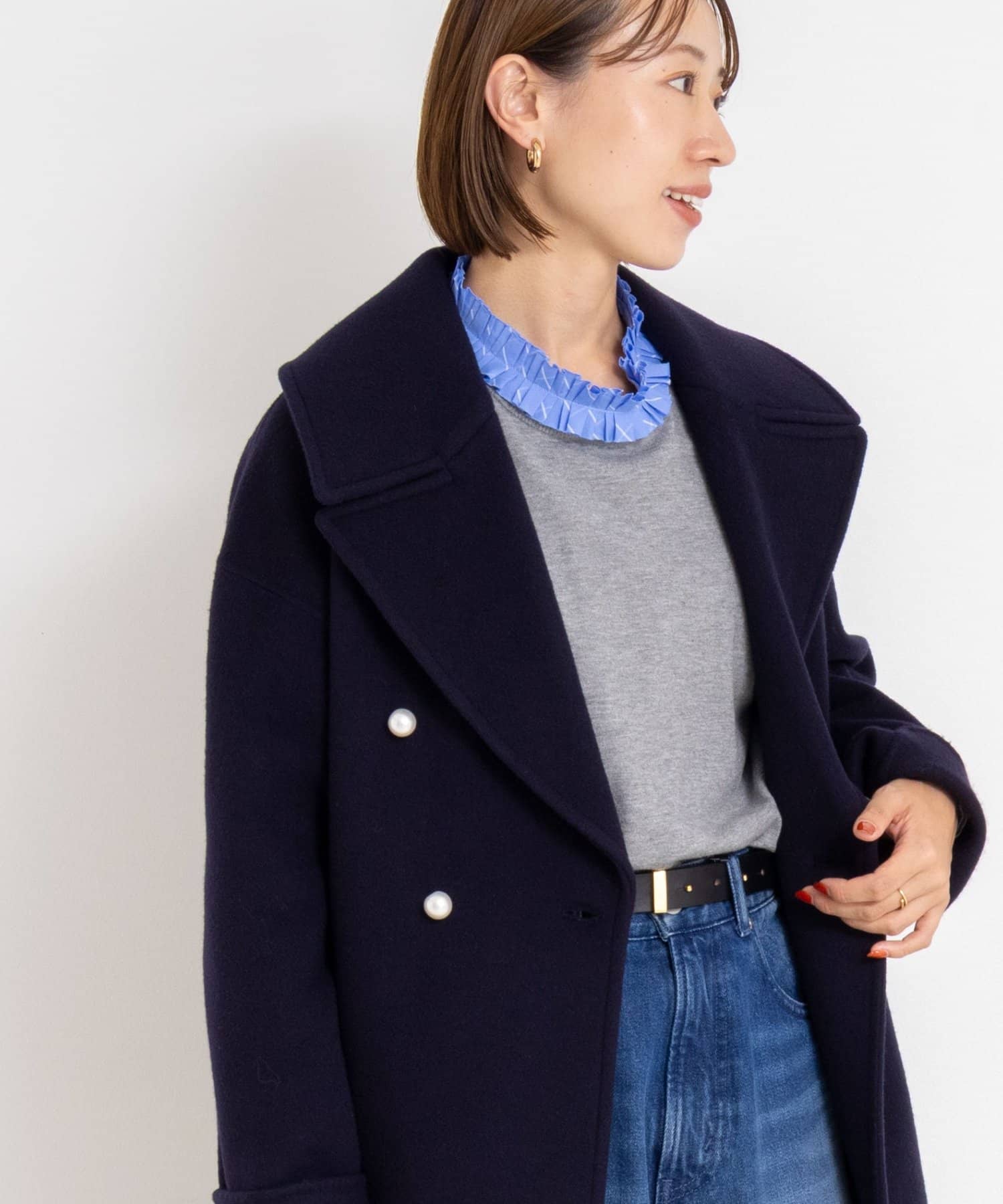 ・大き目の衿で顔周りにアクセントをつけて、小顔効果も◎