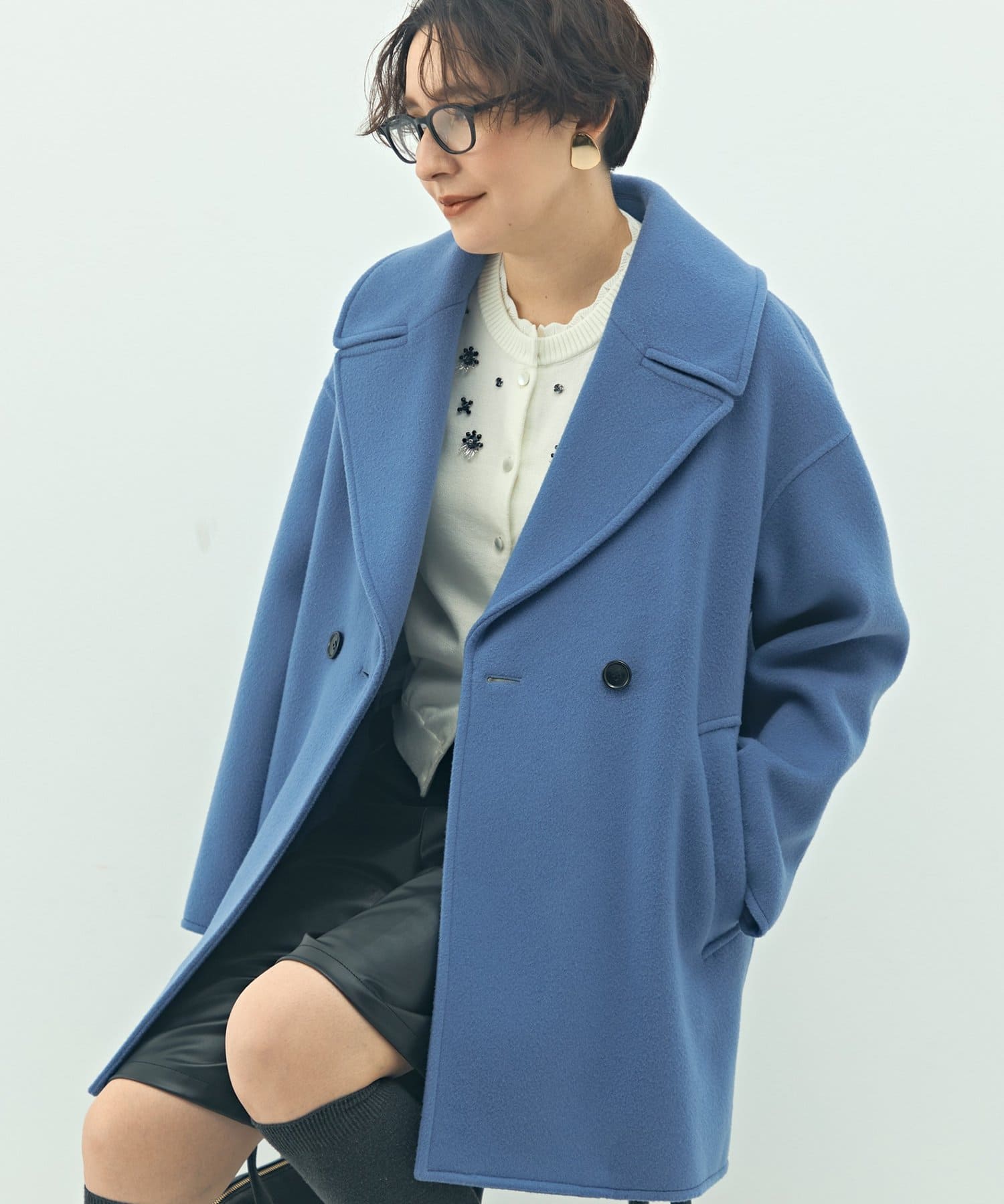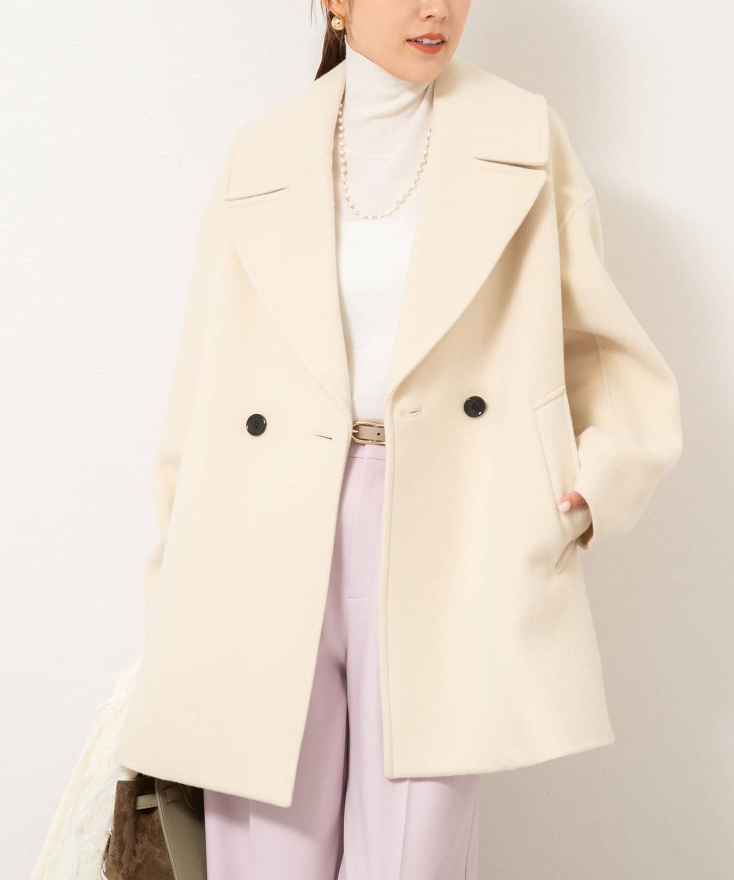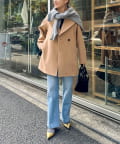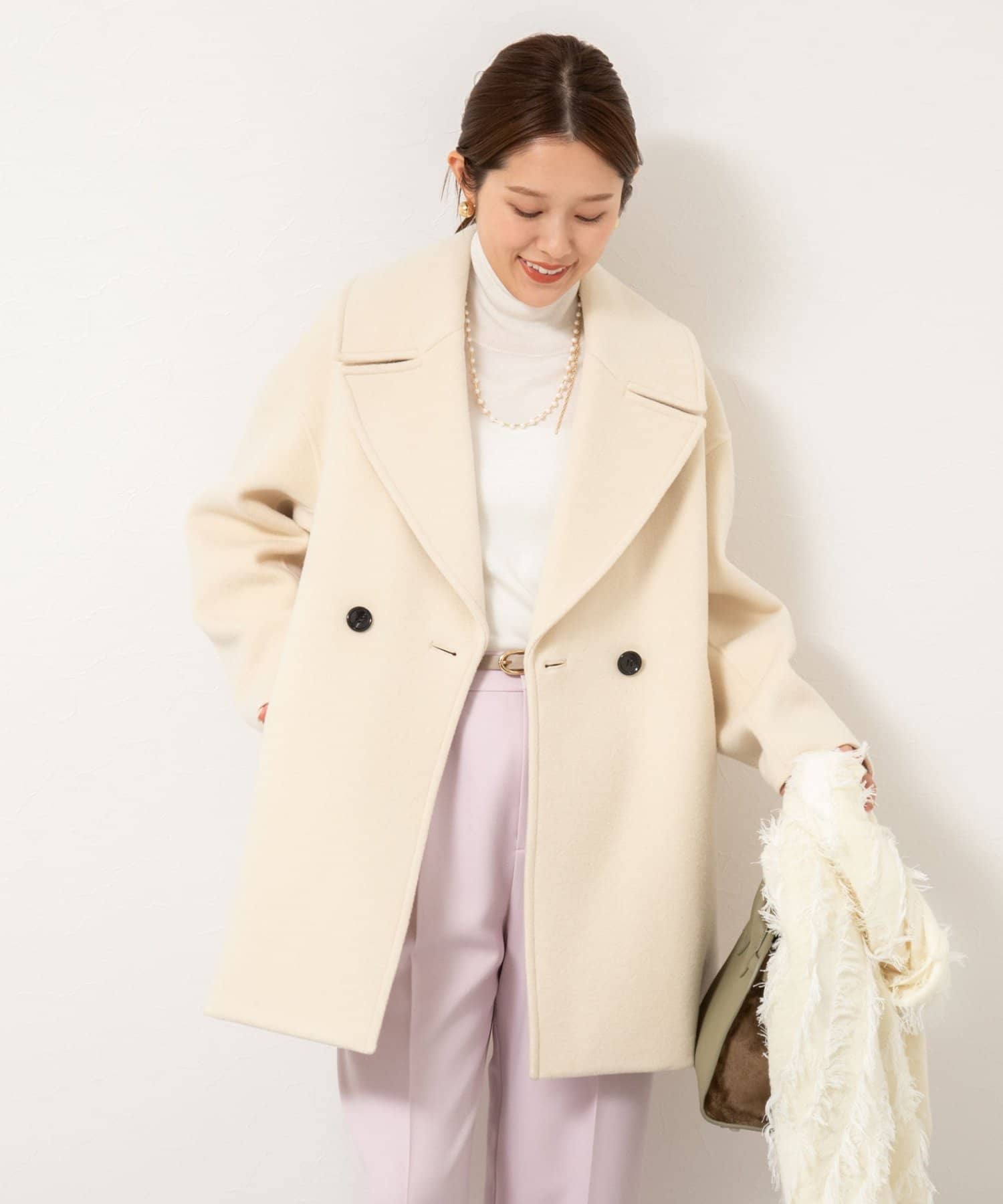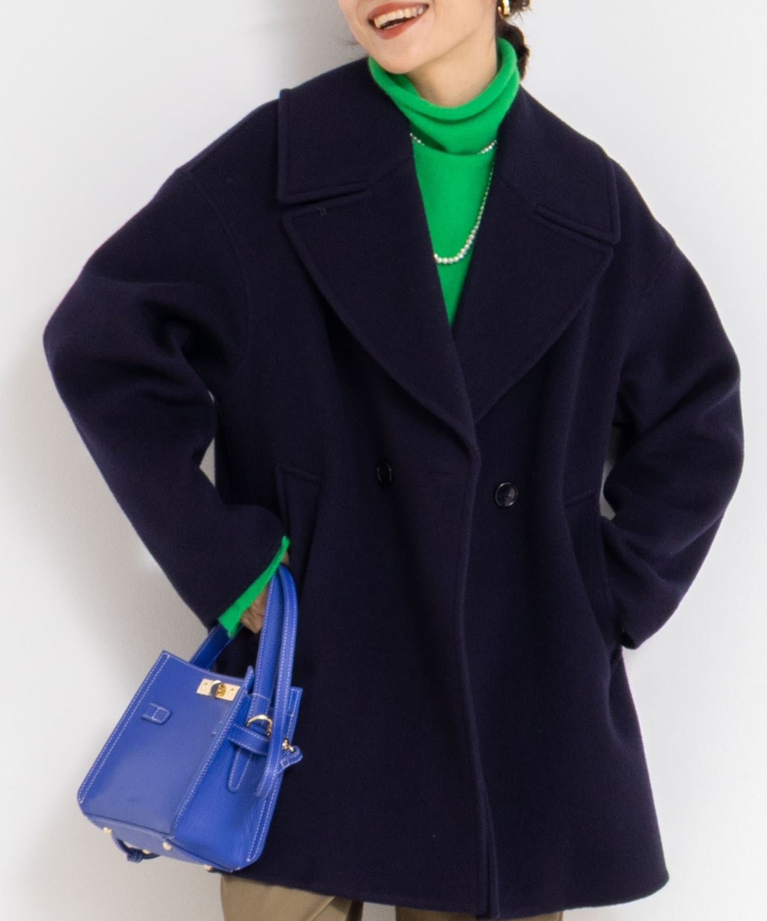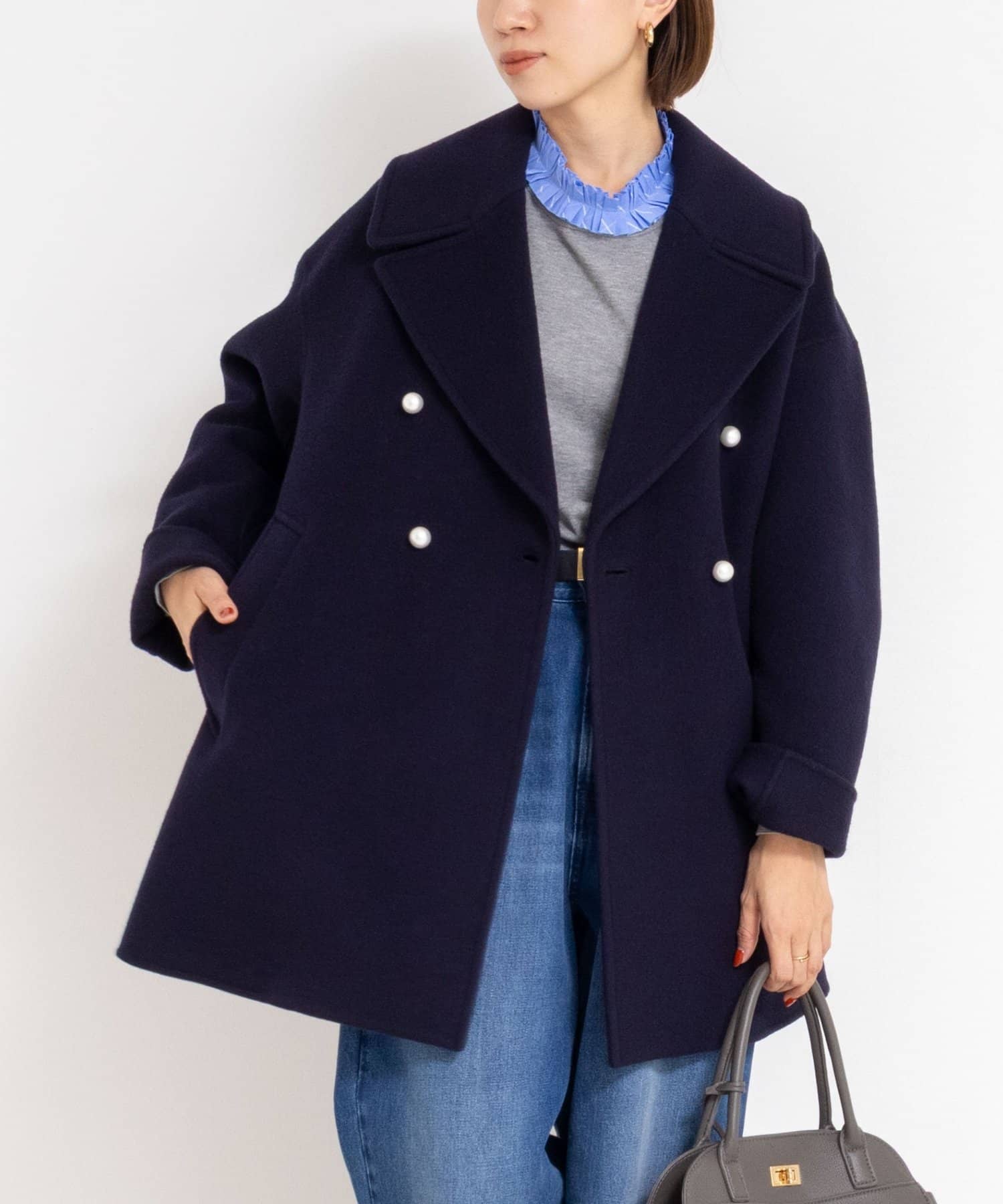 ・大き目の衿で顔周りにアクセントをつけて、小顔効果も◎