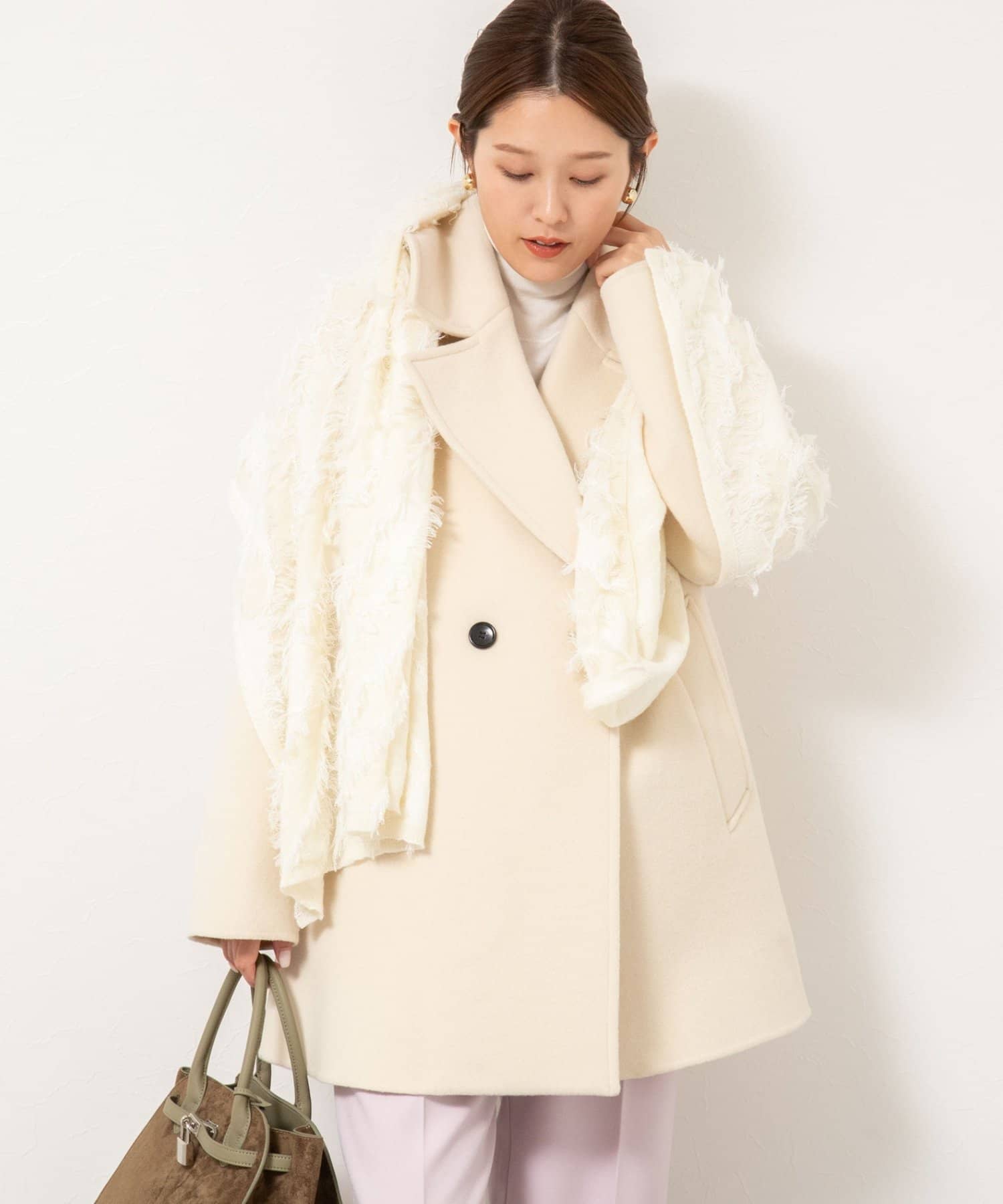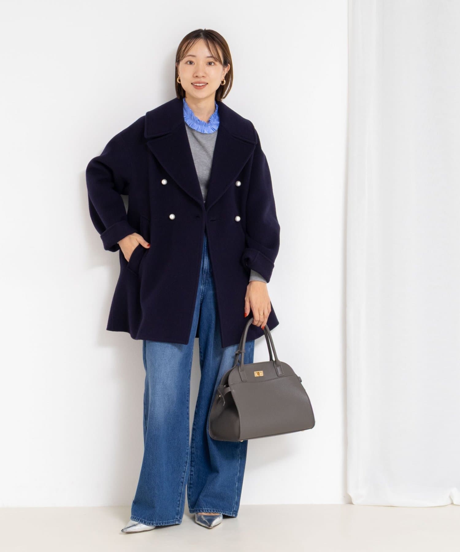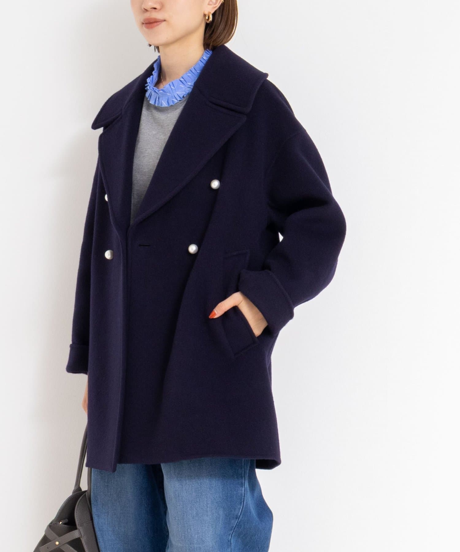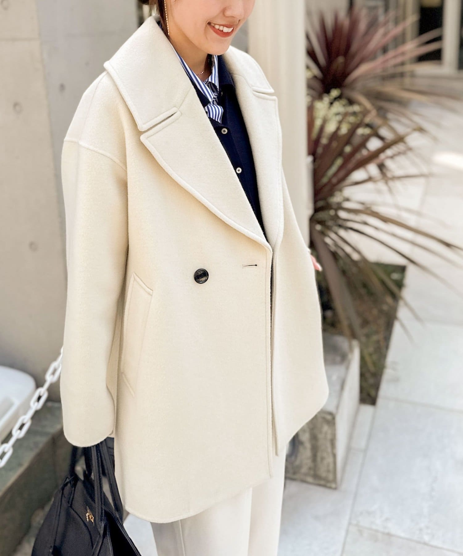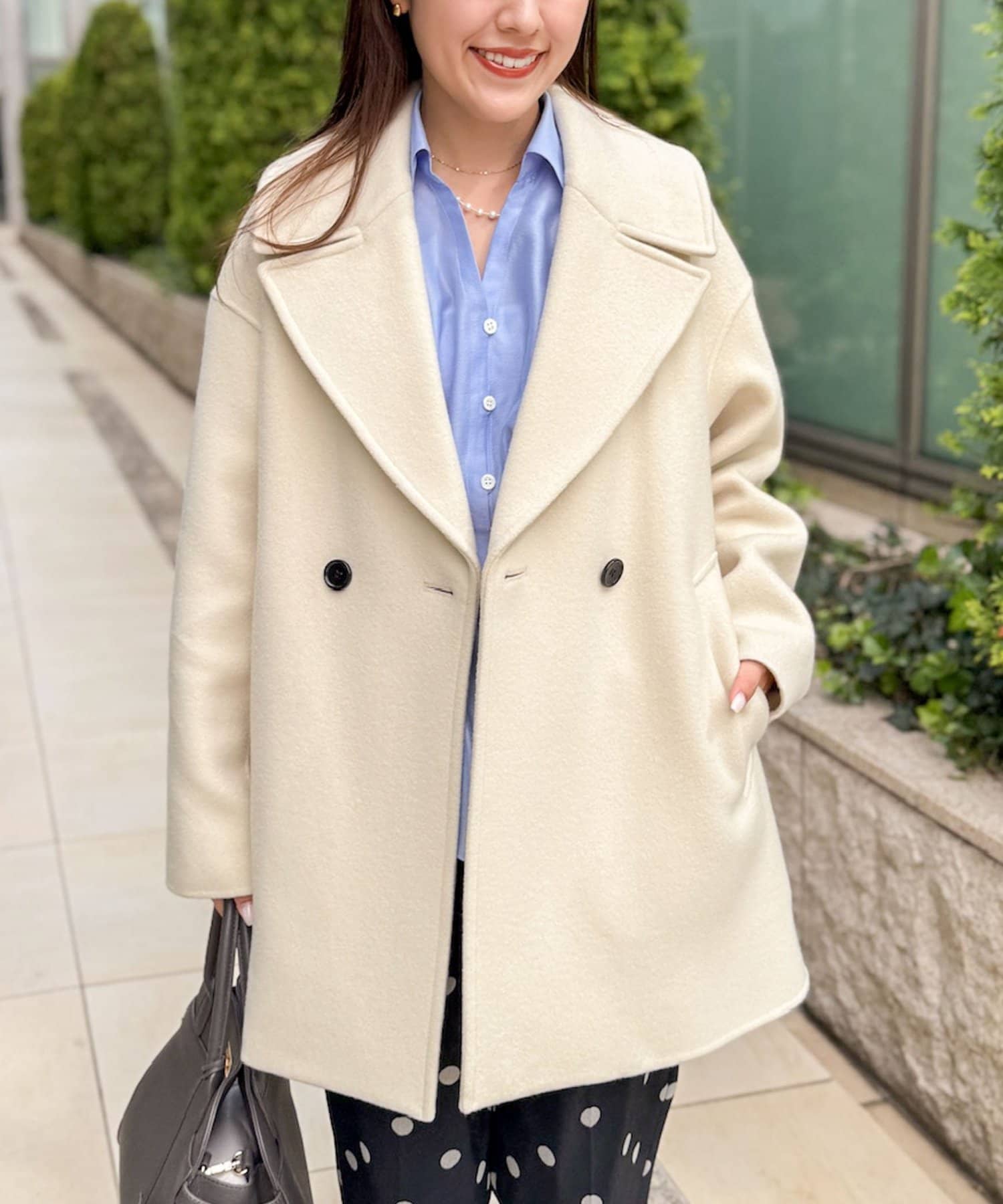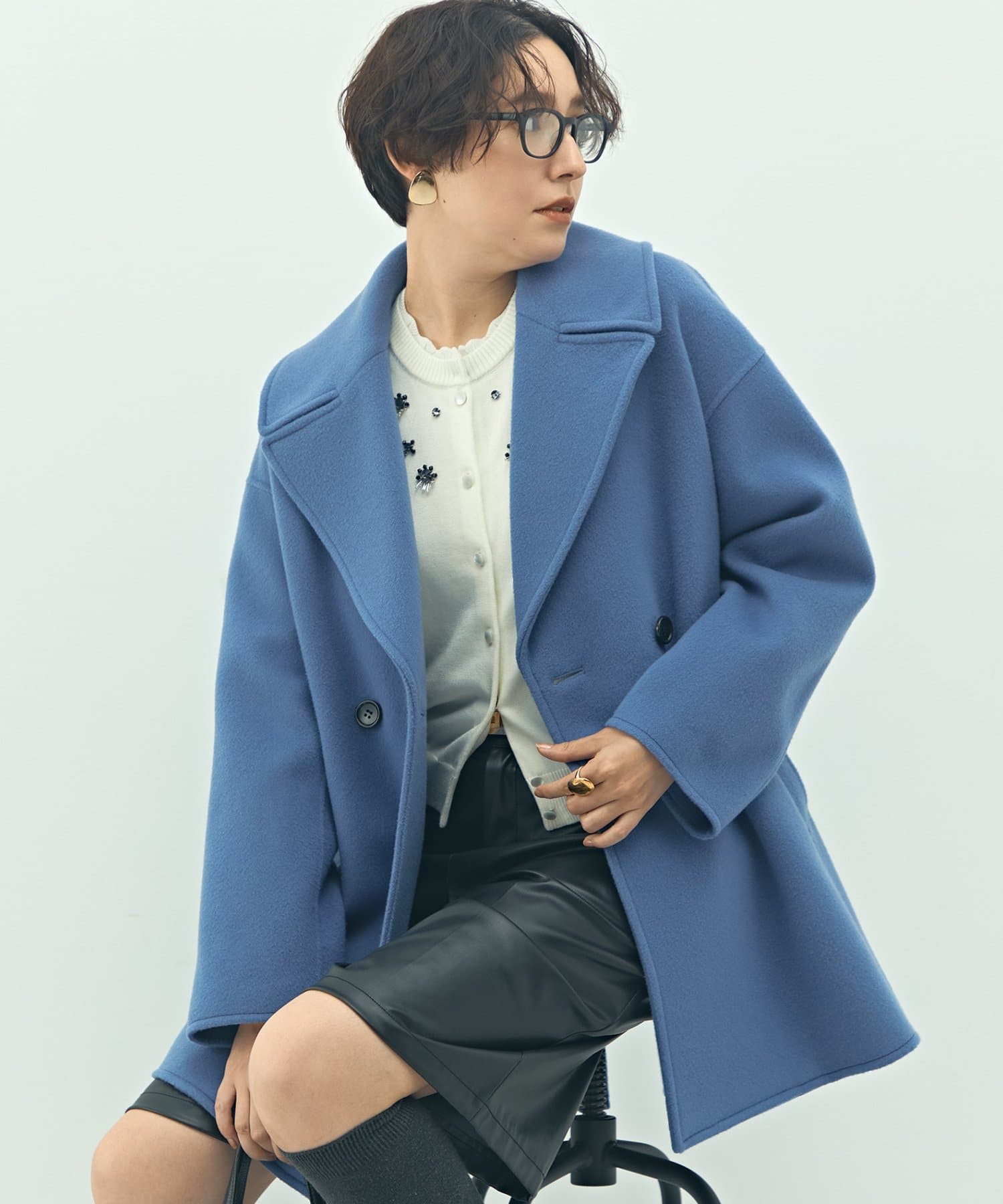 ・大き目の衿で顔周りにアクセントをつけて、小顔効果も◎