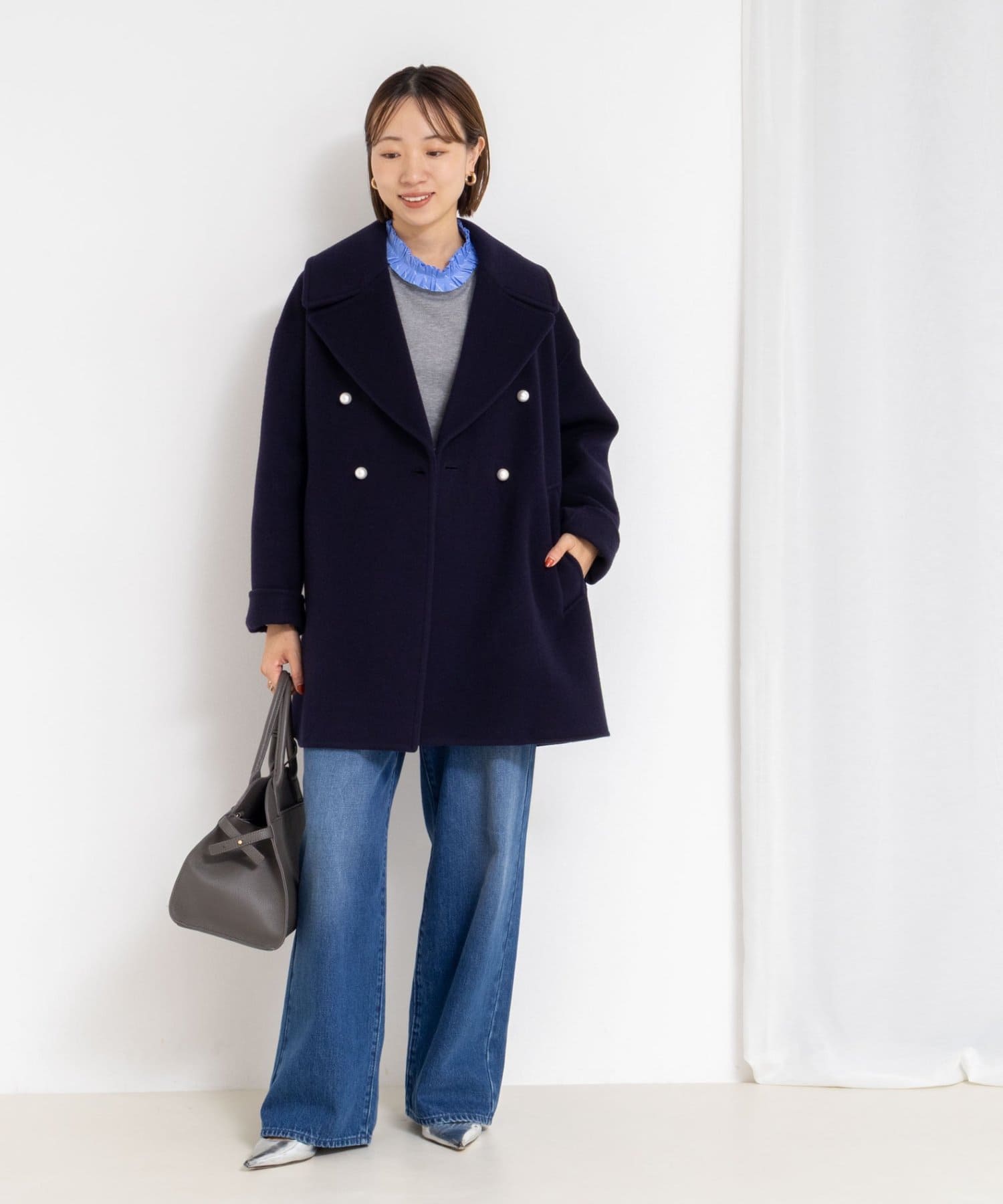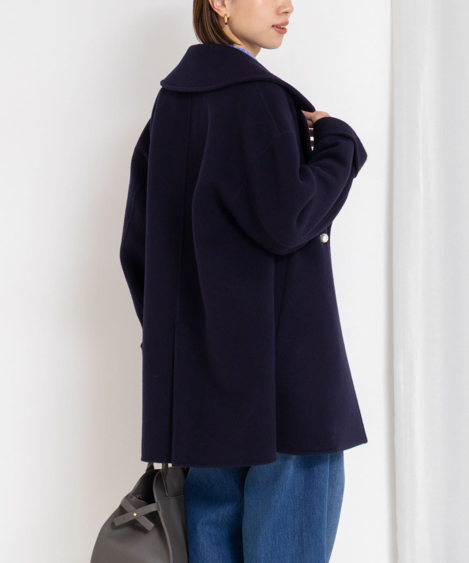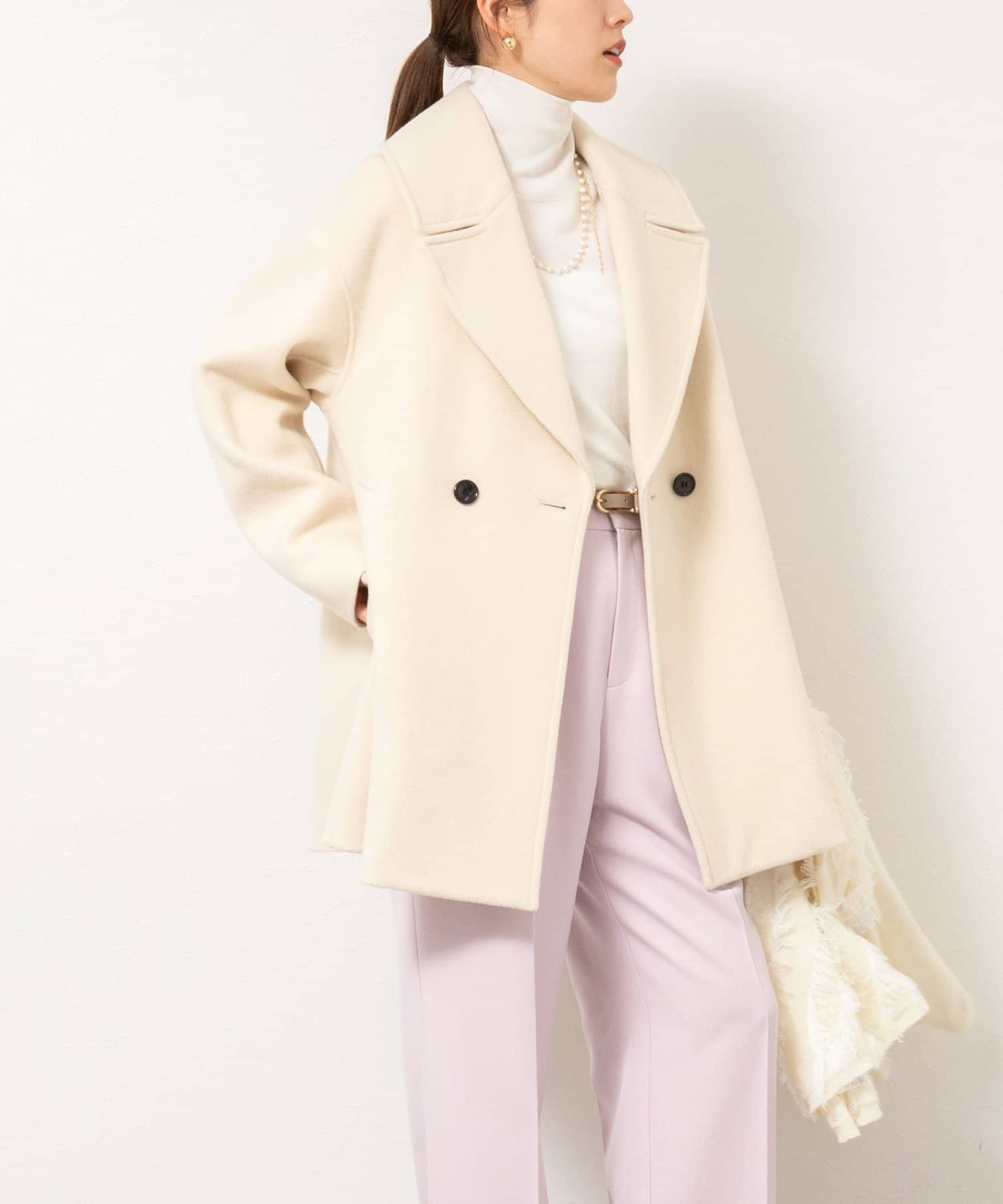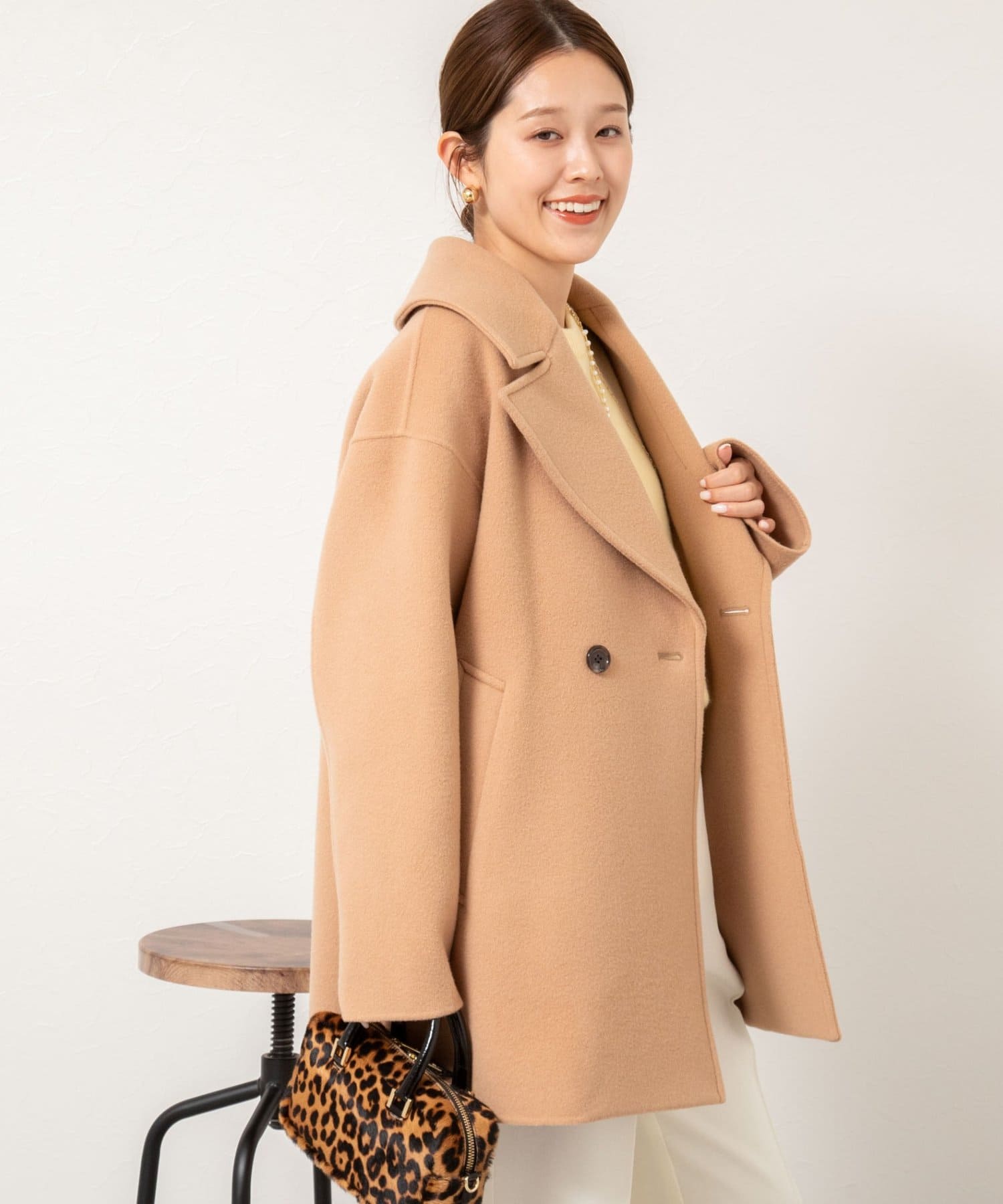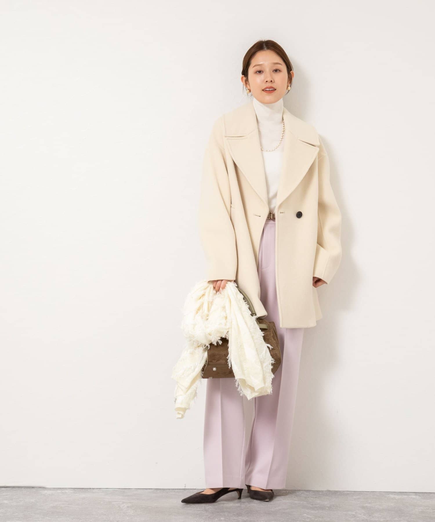 ・大き目の衿で顔周りにアクセントをつけて、小顔効果も◎
