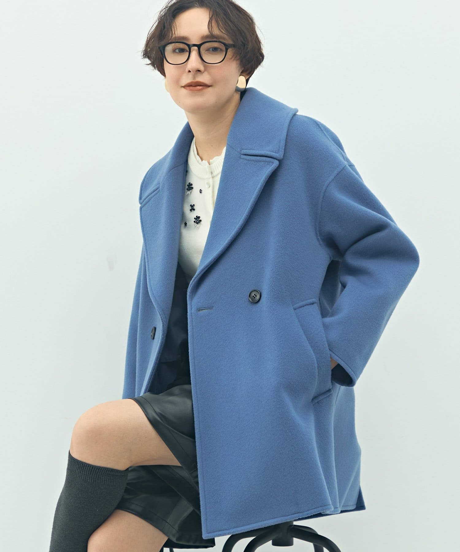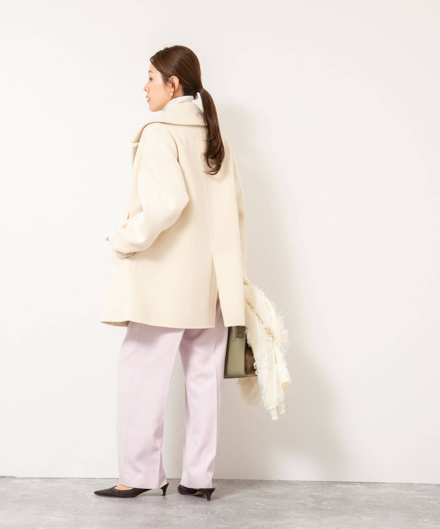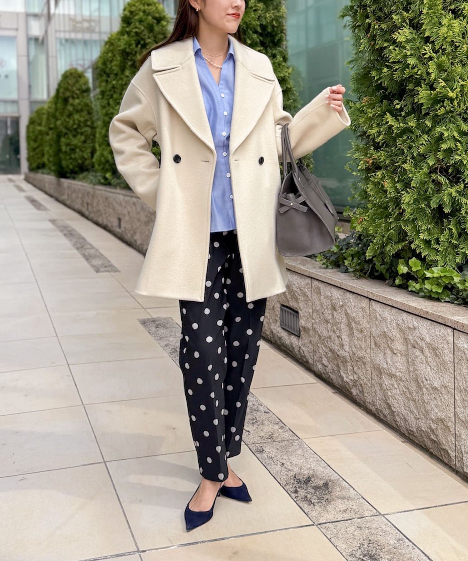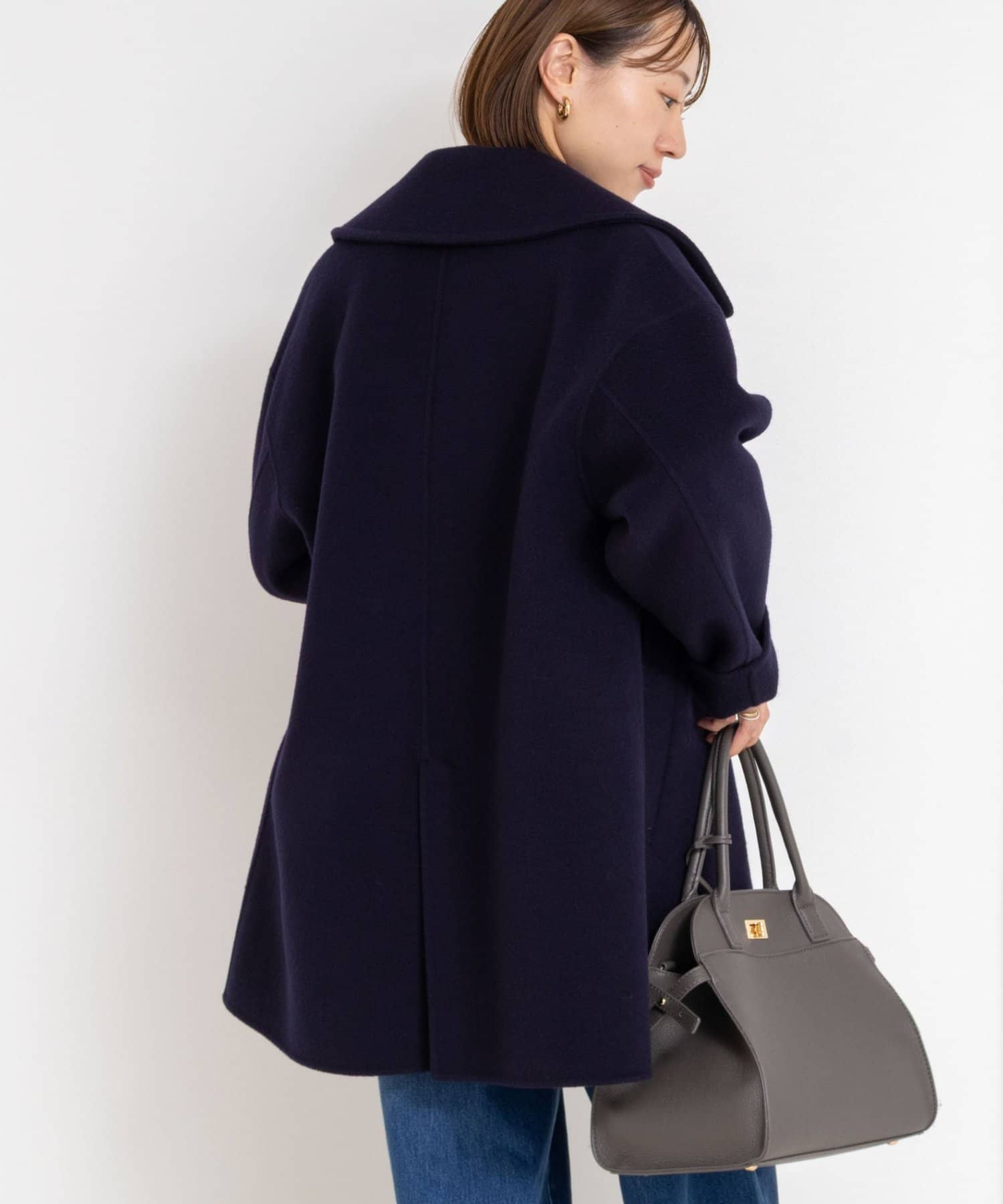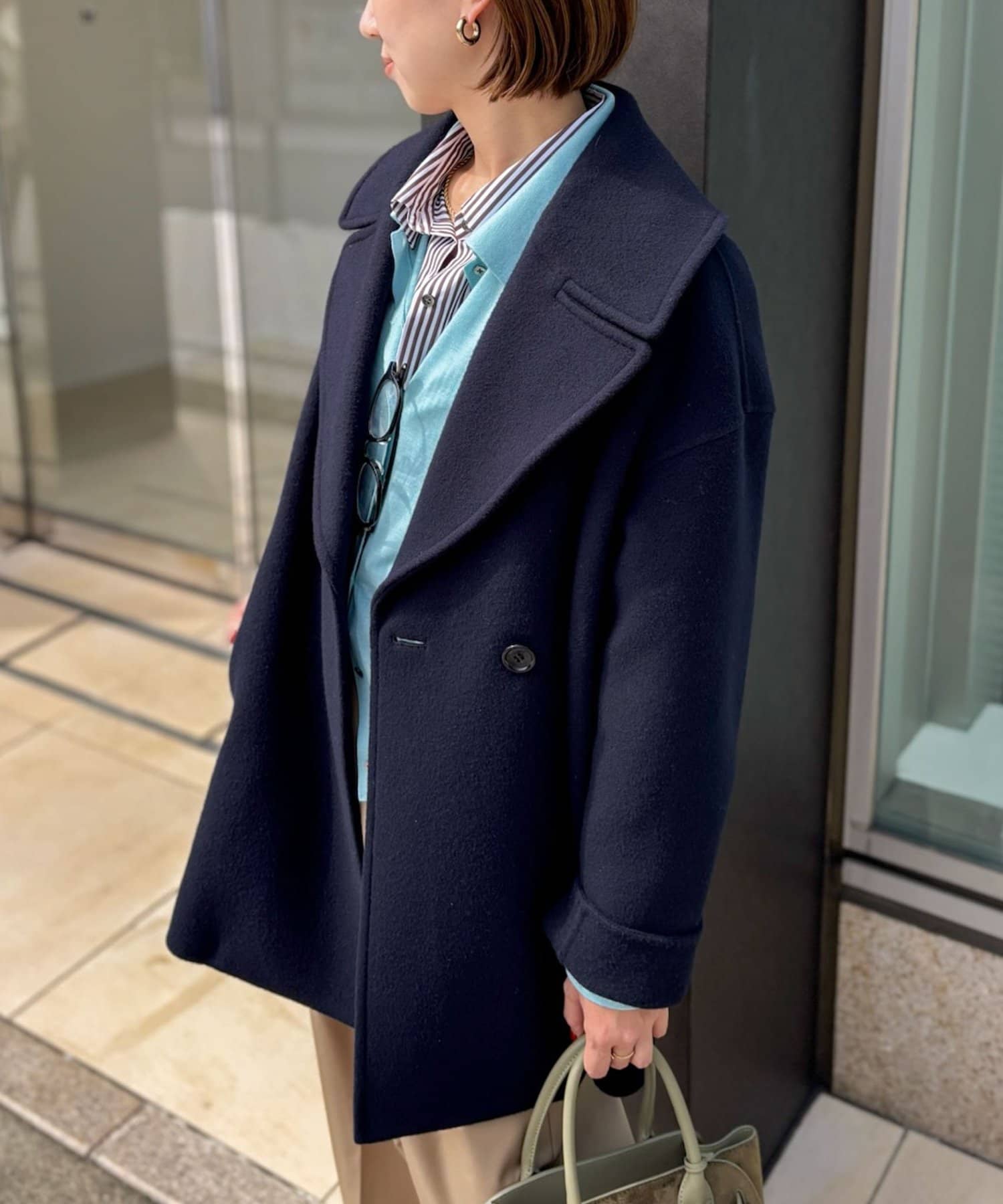 ・大き目の衿で顔周りにアクセントをつけて、小顔効果も◎