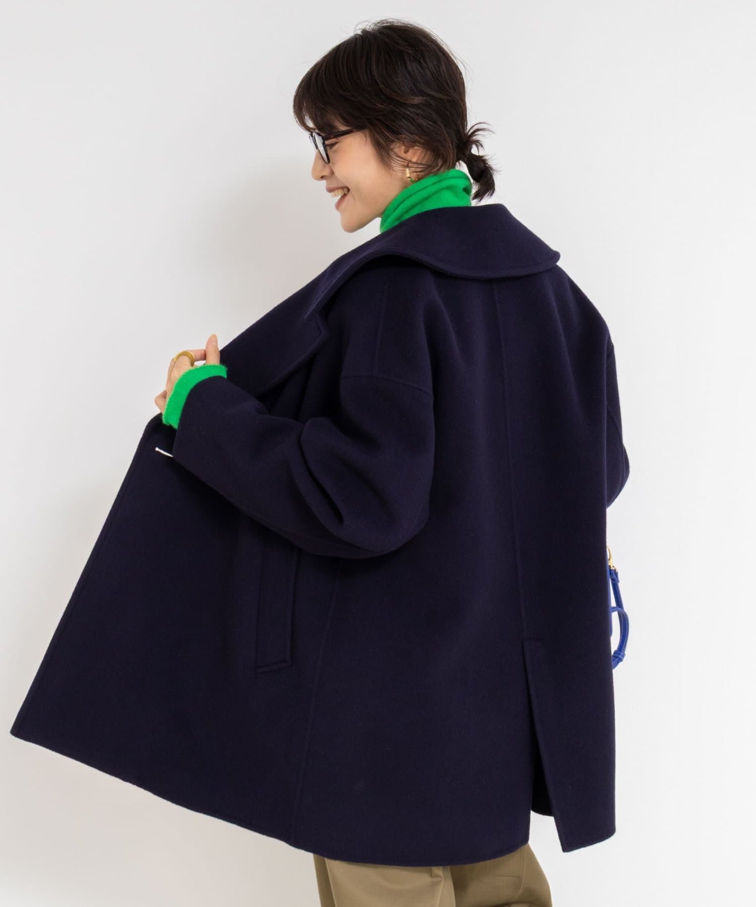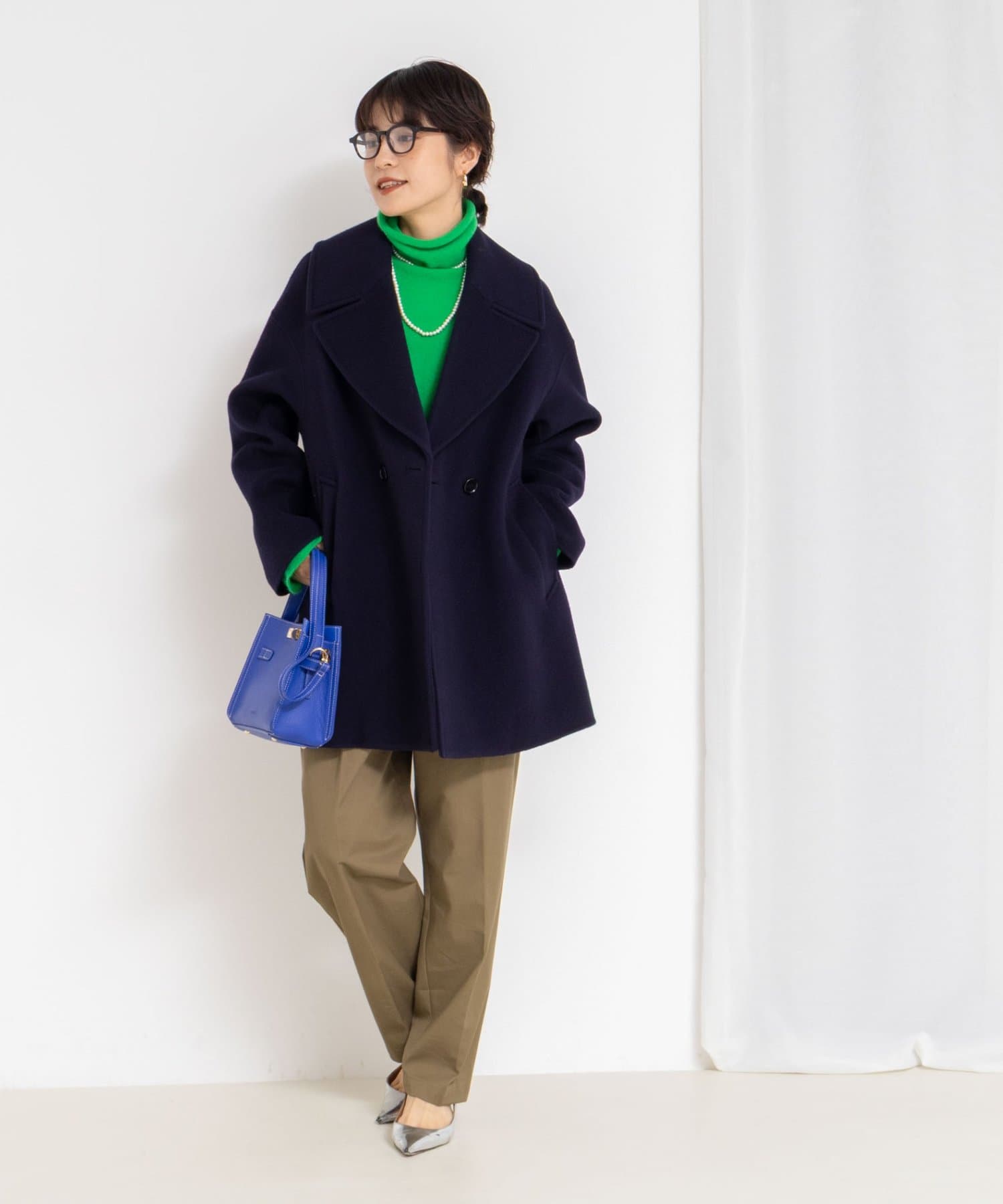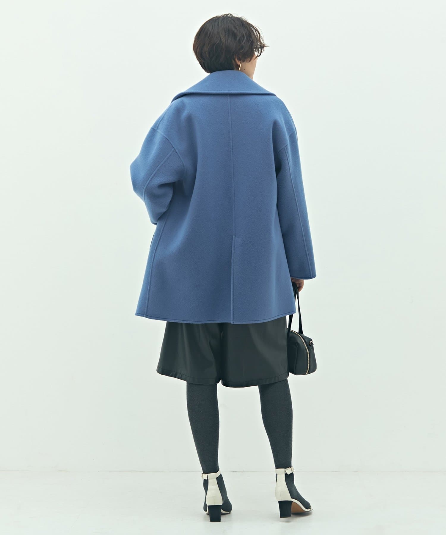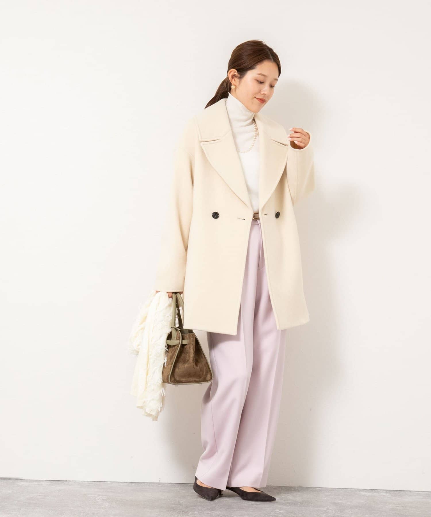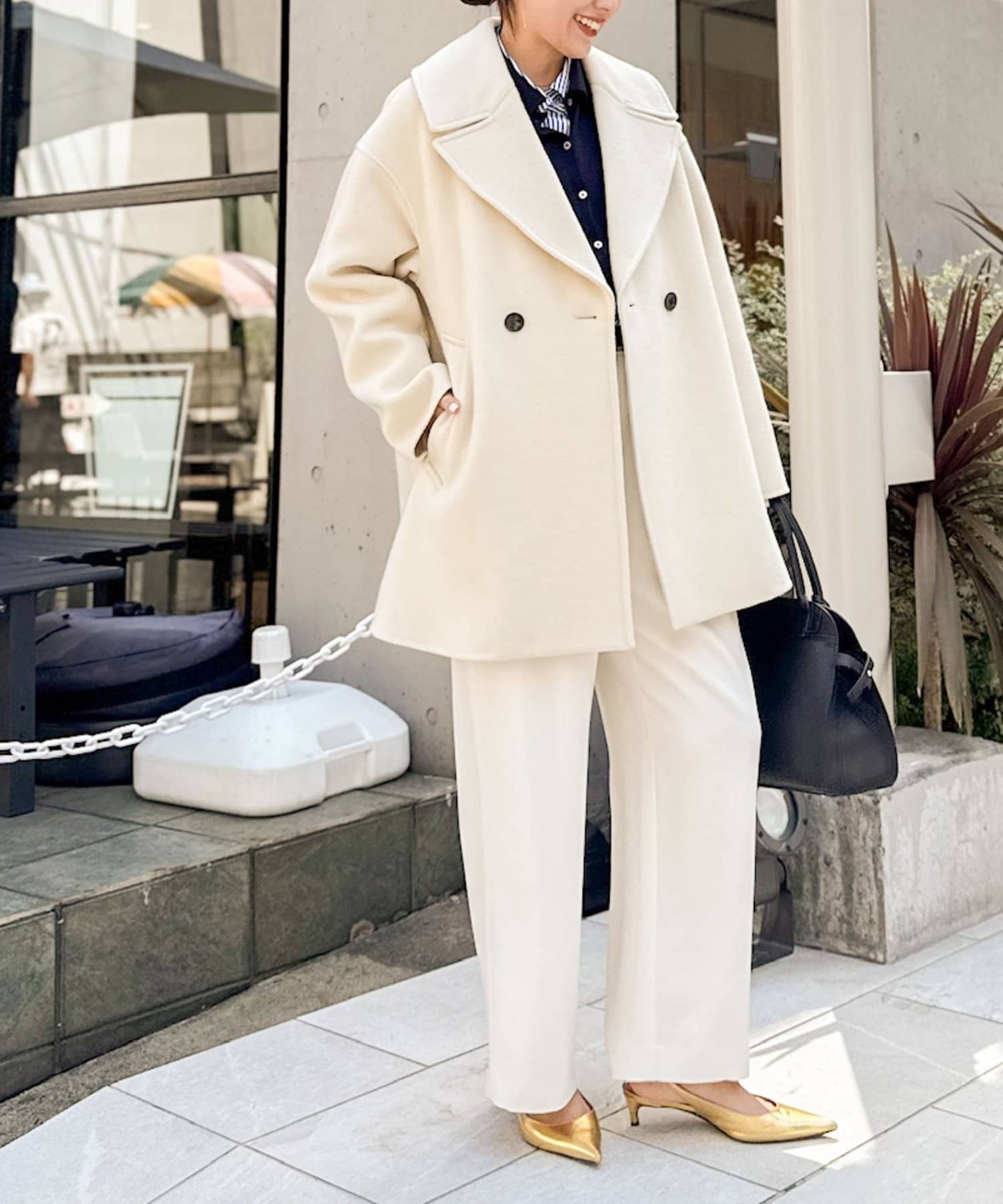 ・大き目の衿で顔周りにアクセントをつけて、小顔効果も◎