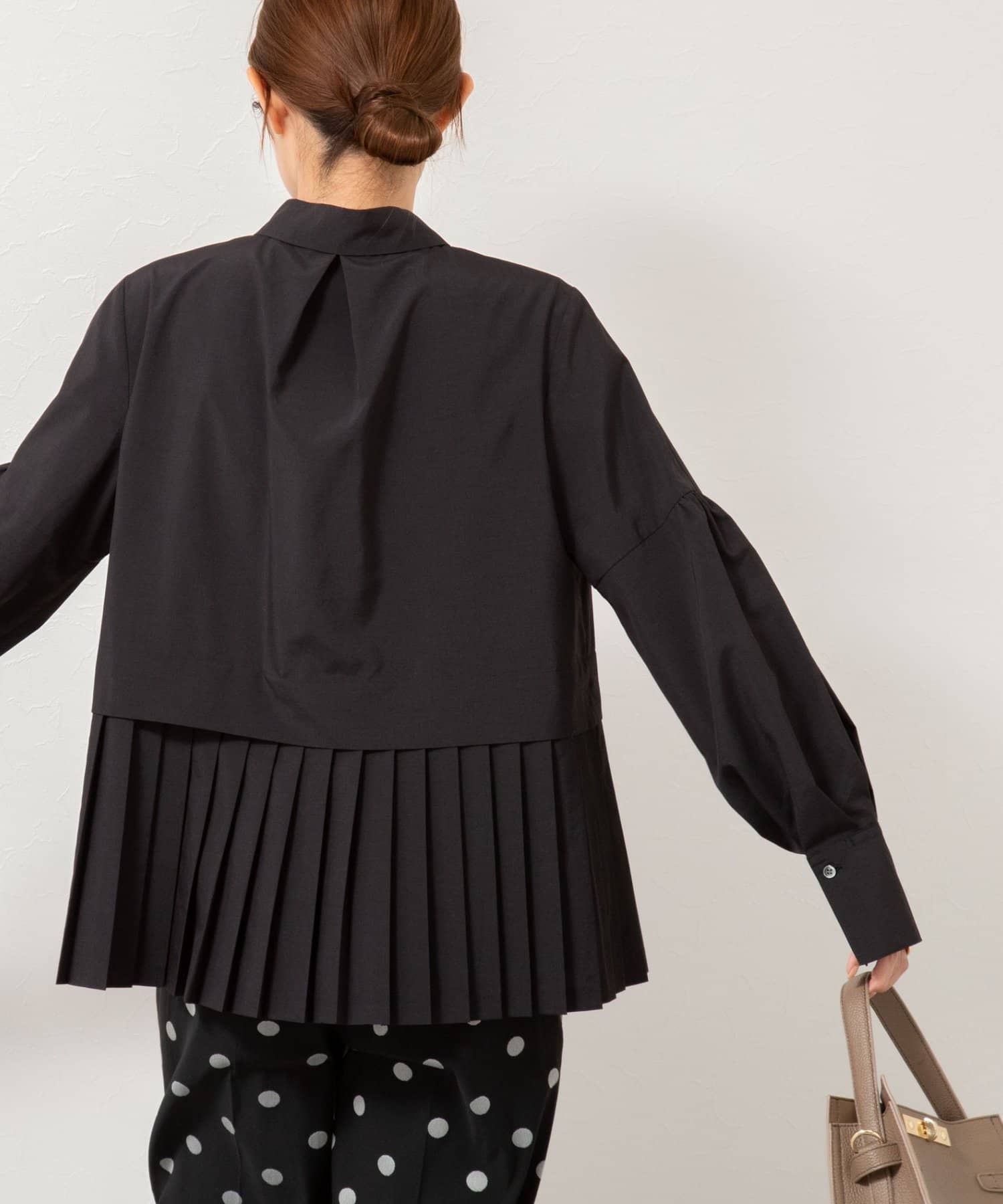 ・裾のプリーツデザインが、華やかで動きのあるシャツ