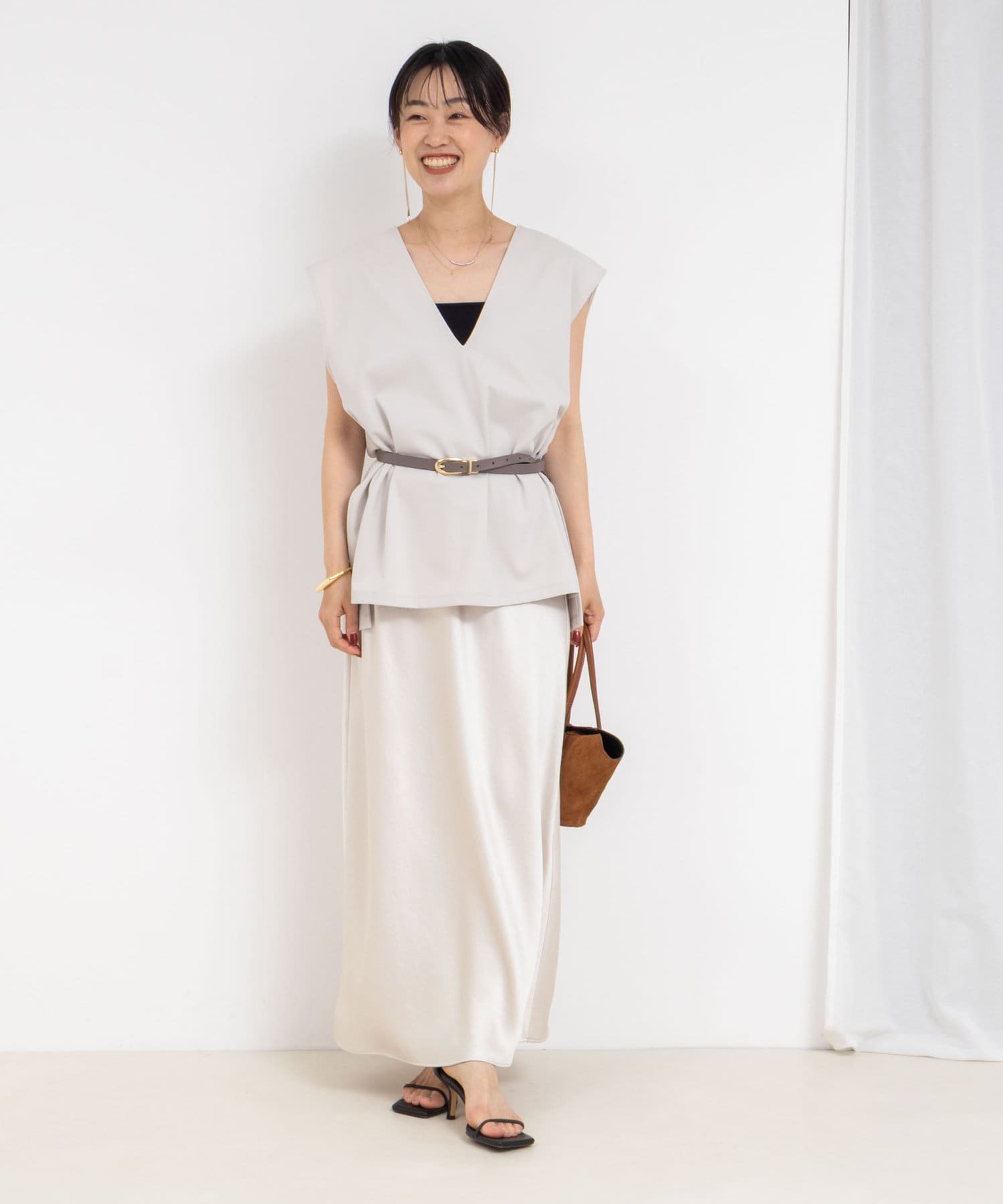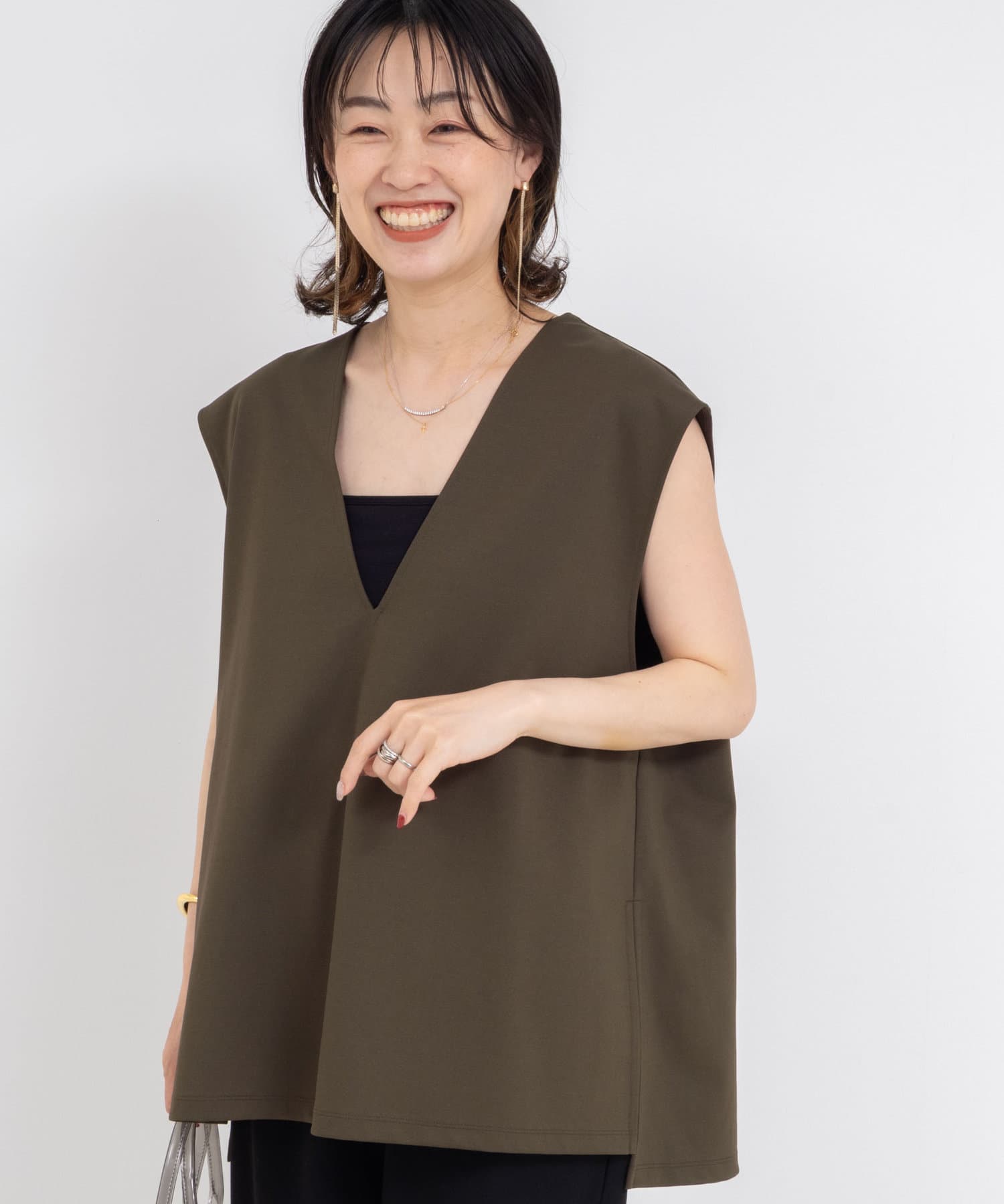 ・深めのVネックが女性らしい抜け感のあるプルオーバーベスト