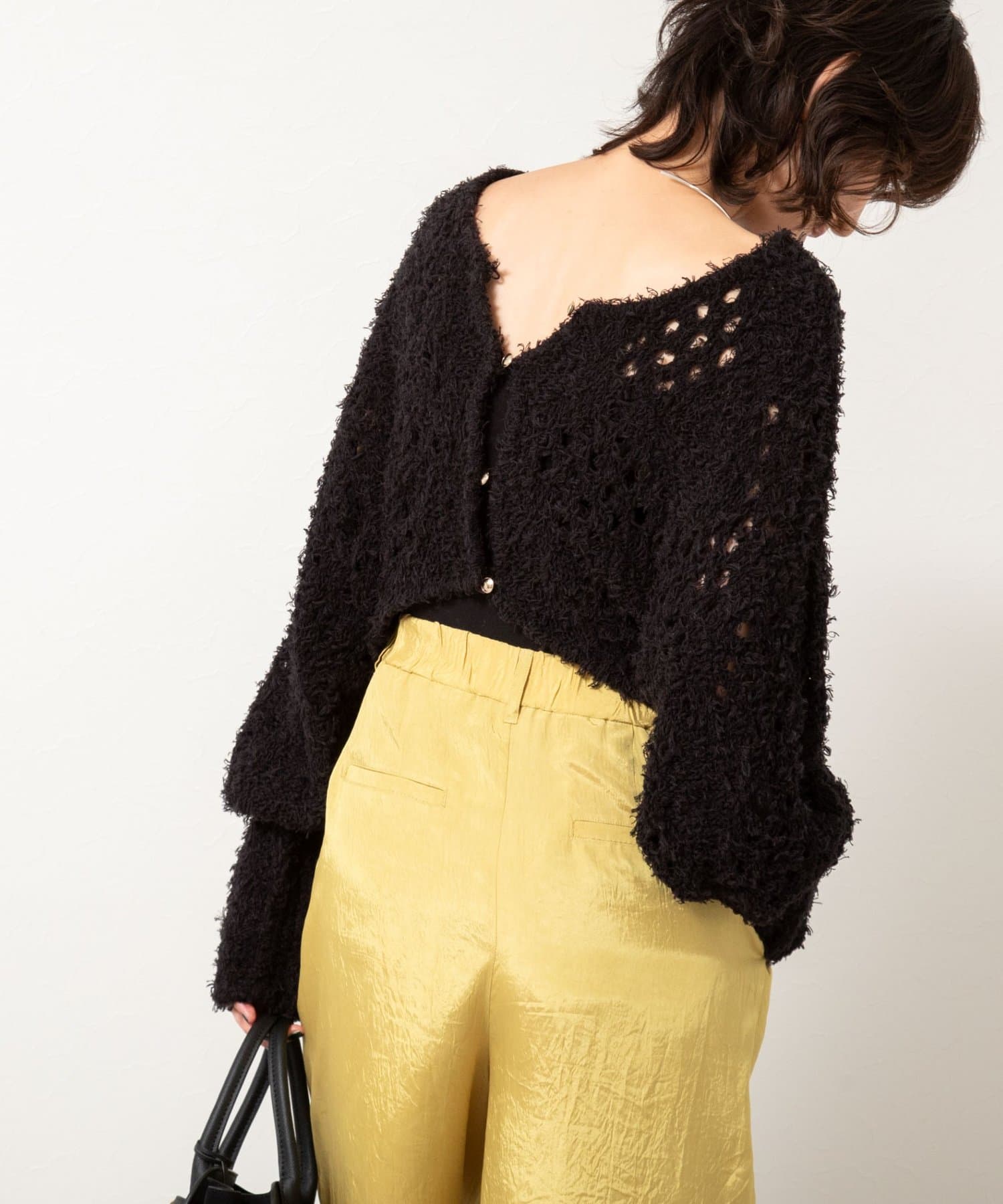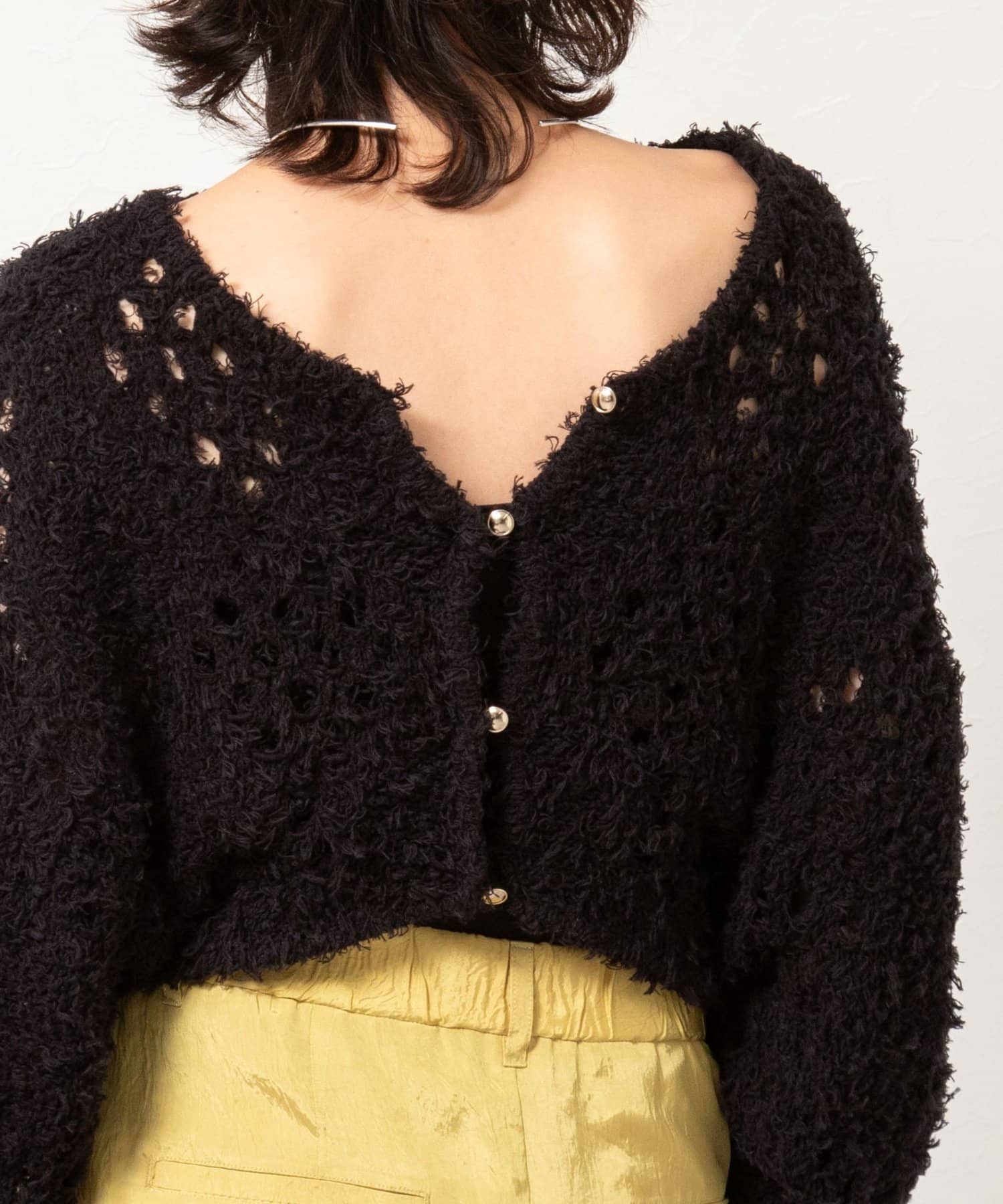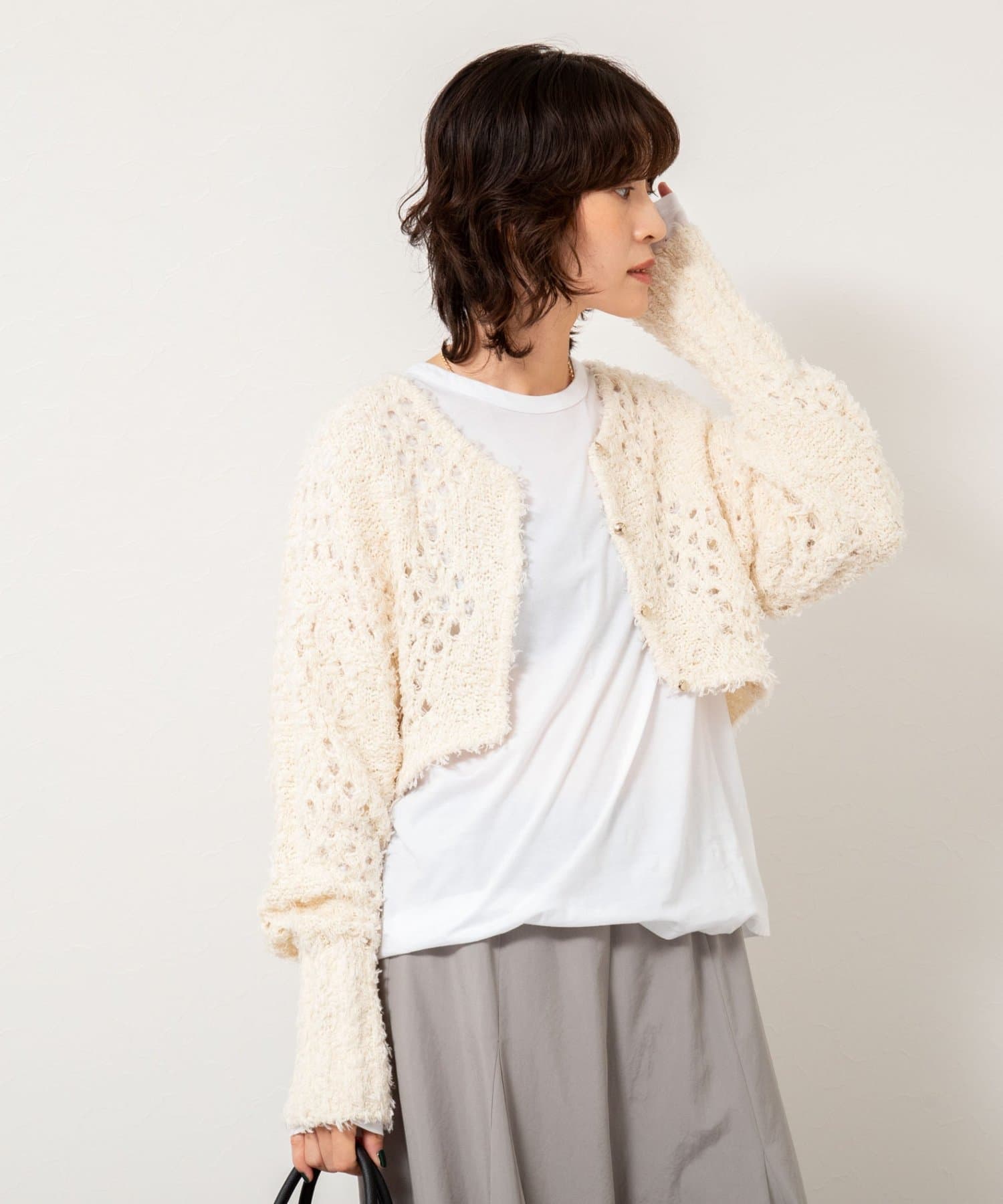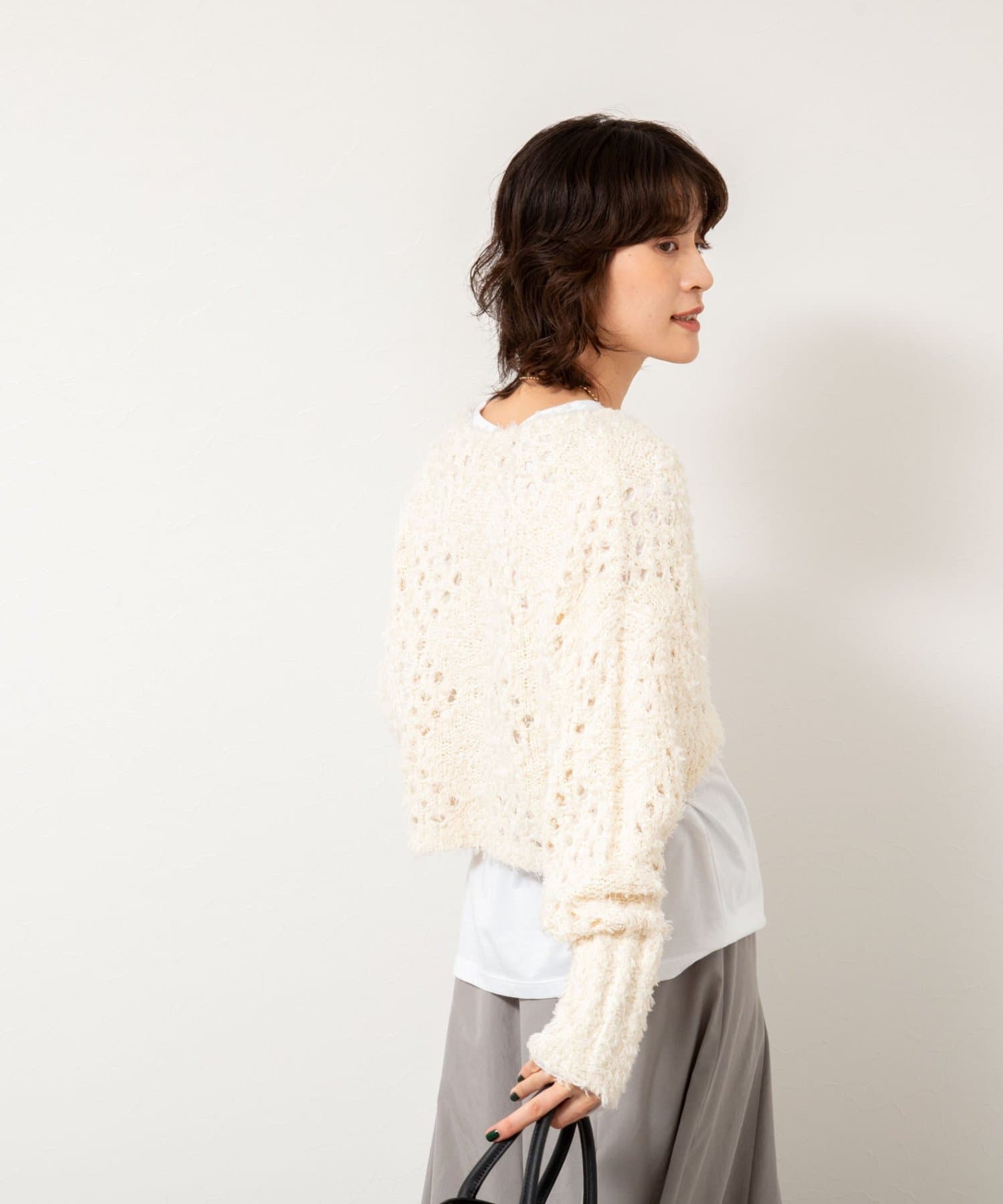 ・表面感のあるカットフェザーヤーンとストレートヤーンをMIXした素材のショートボレロ