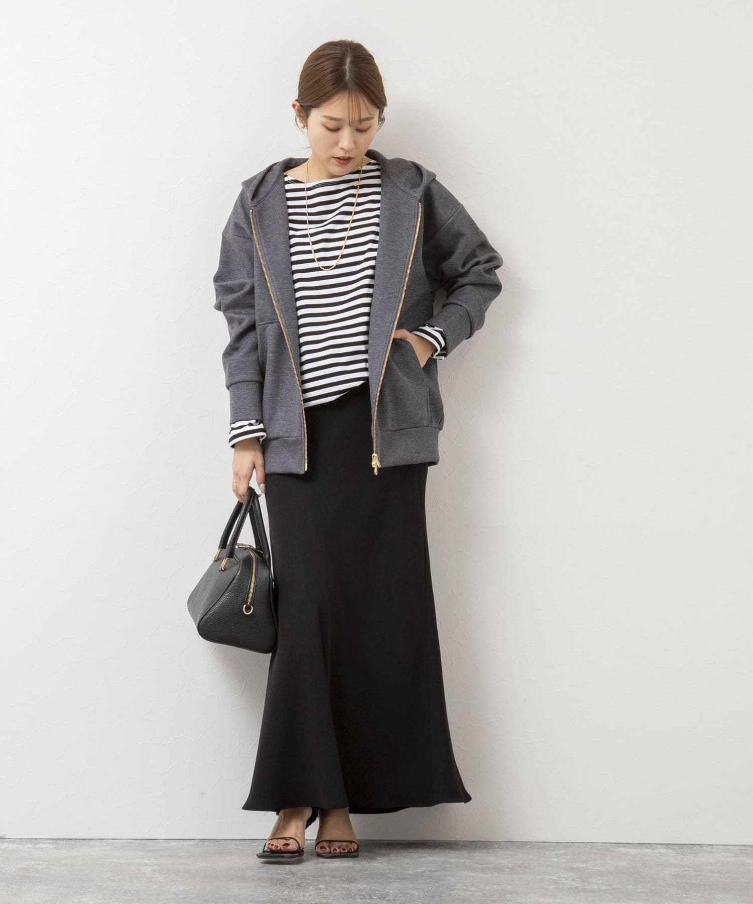 ・しっかりシルエットが保てる程よいハリ感のある素材で、カジュアルすぎずきれい見え