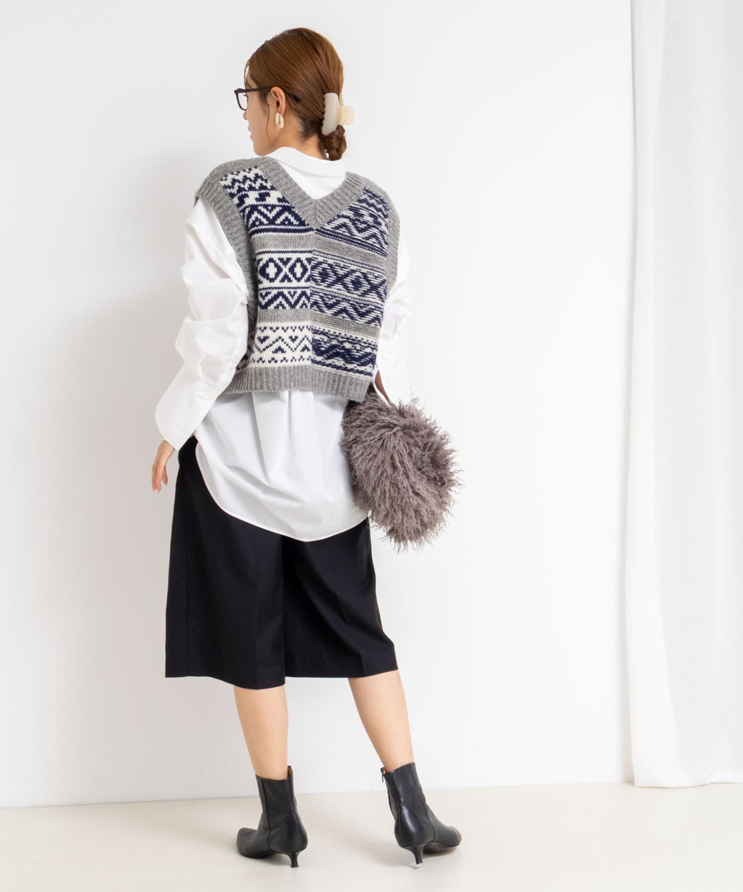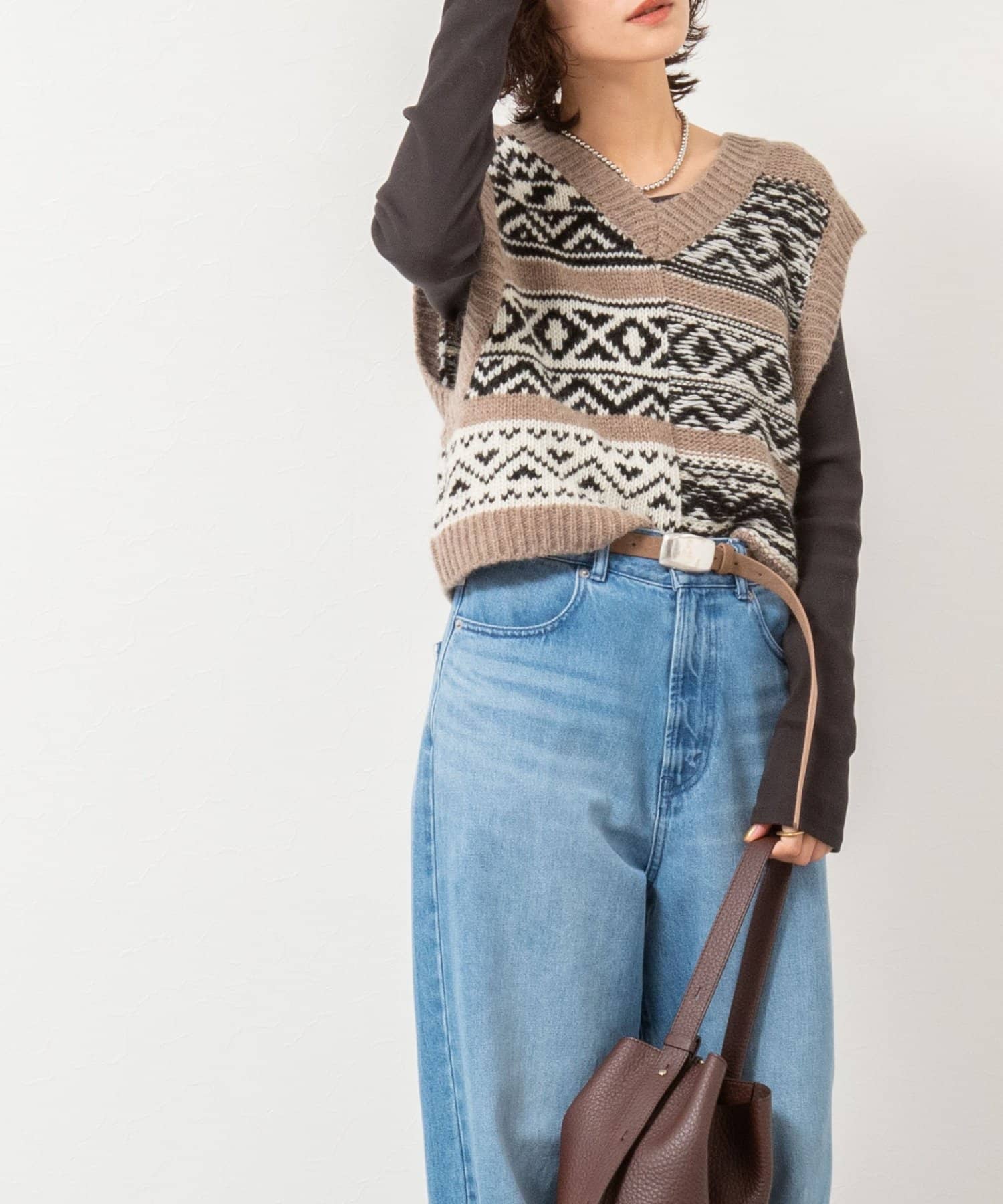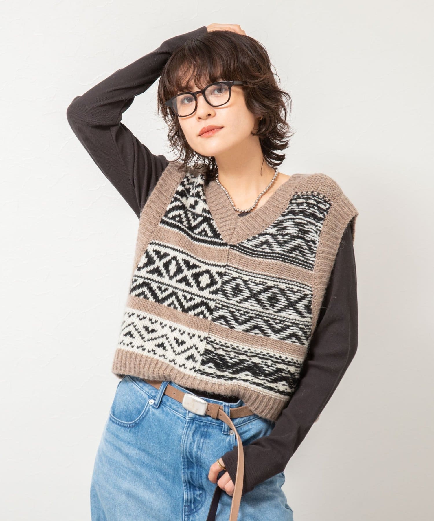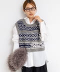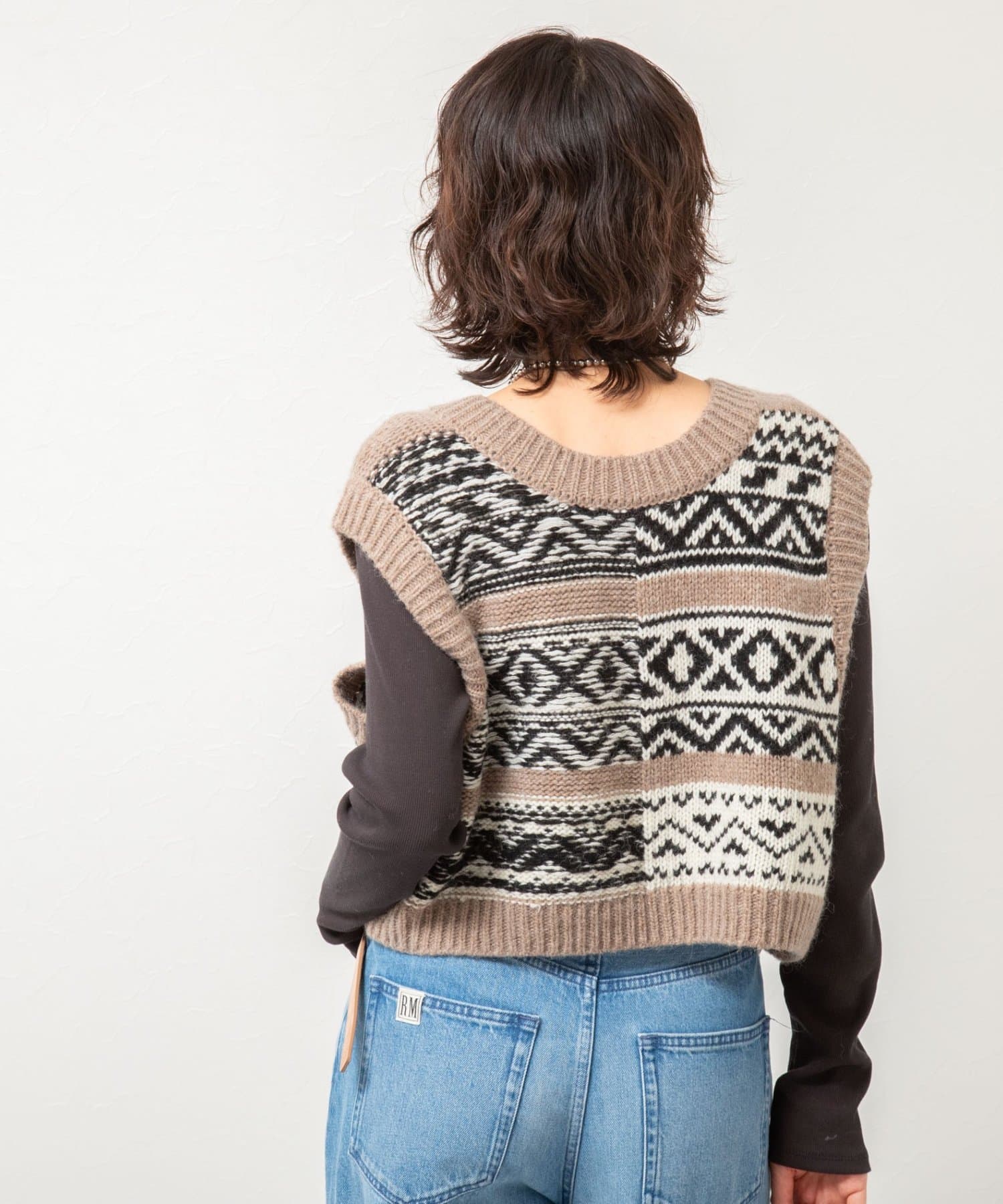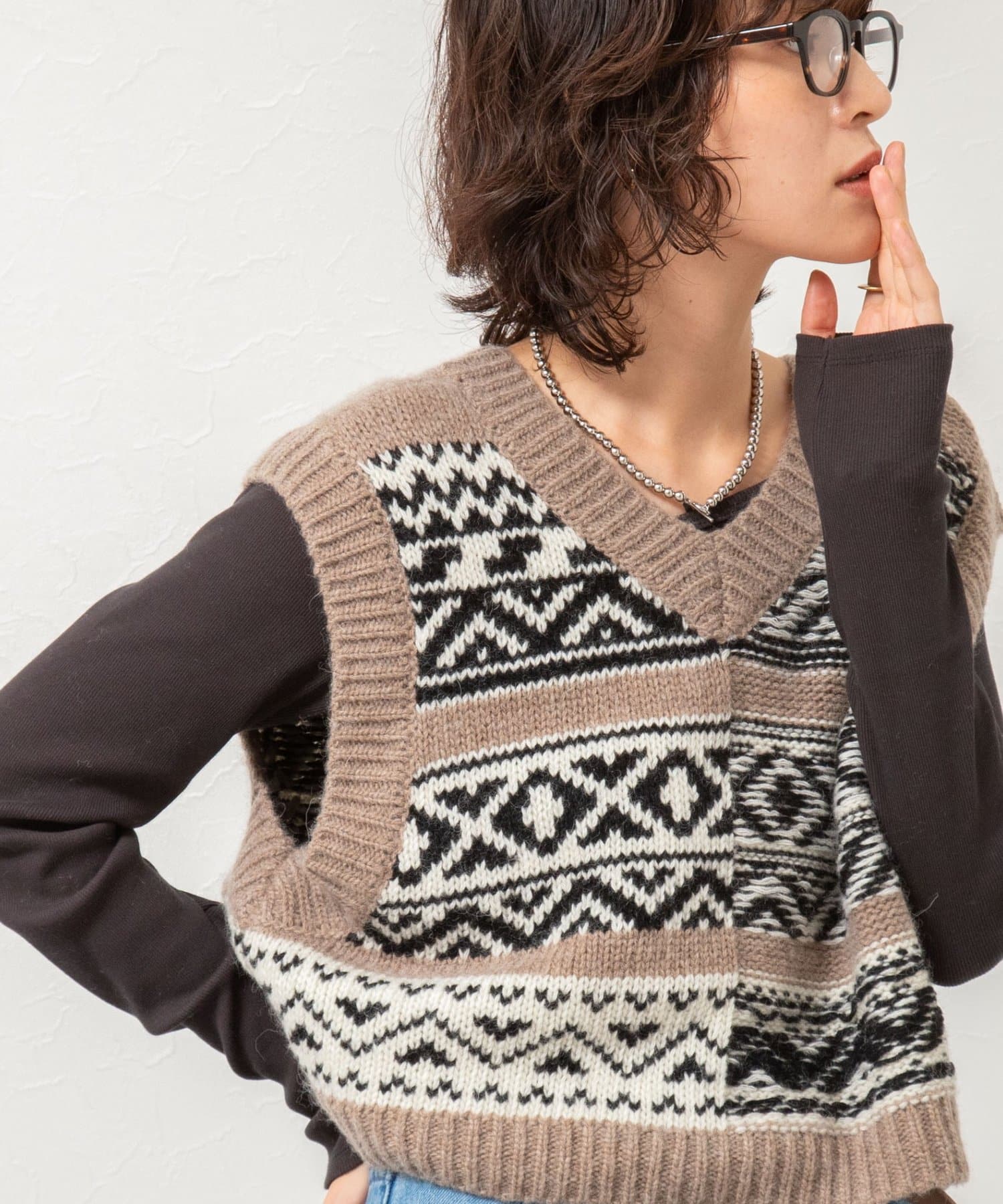 ・シェットランドウール混の糸を使用し、アシンメトリーデザインにしたノルディック柄のベスト