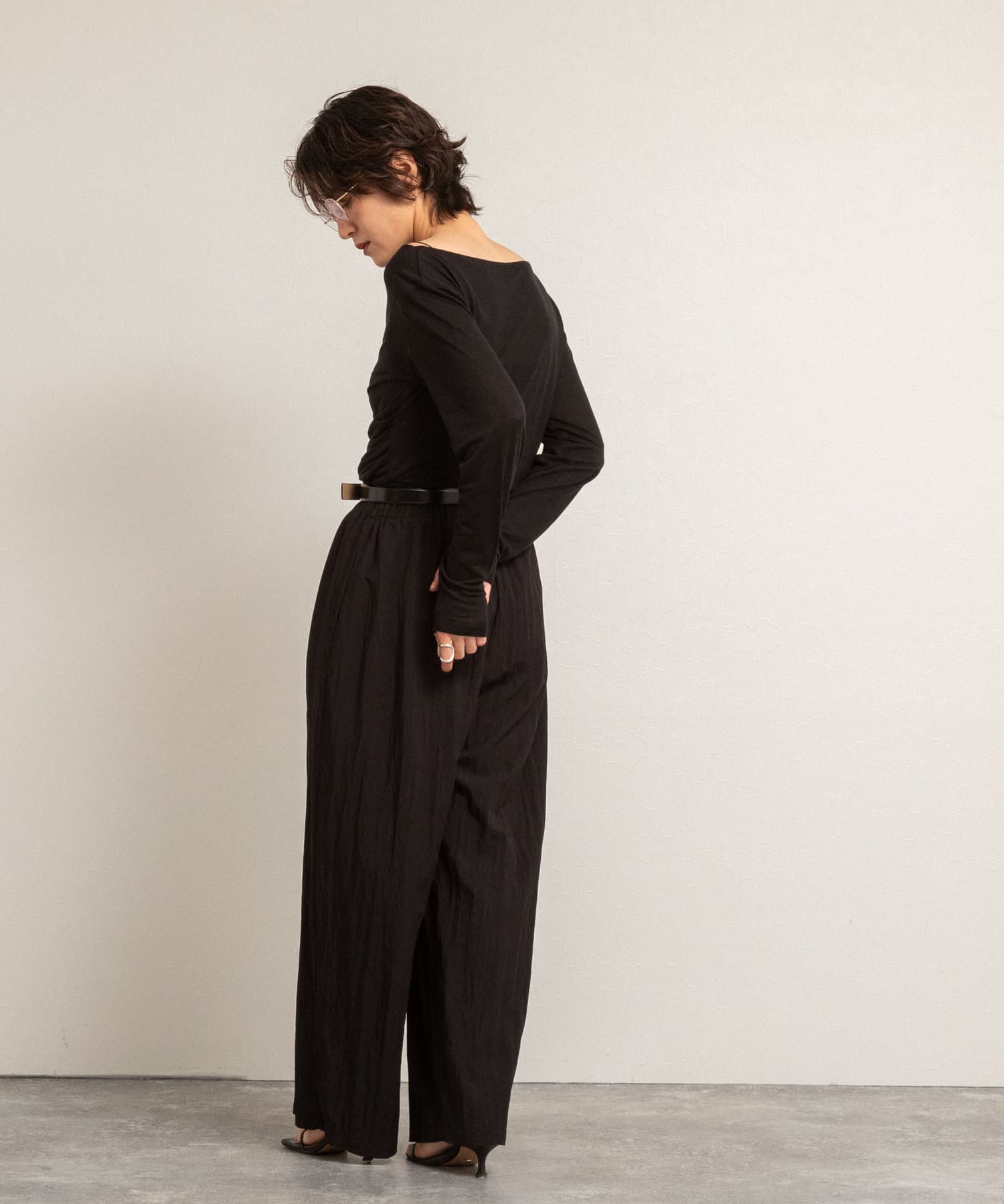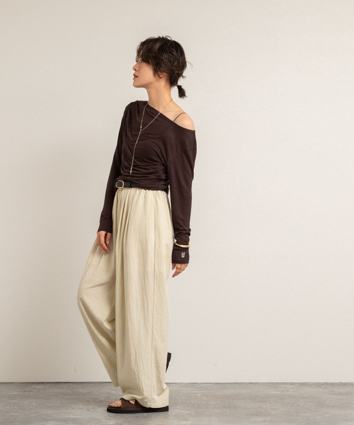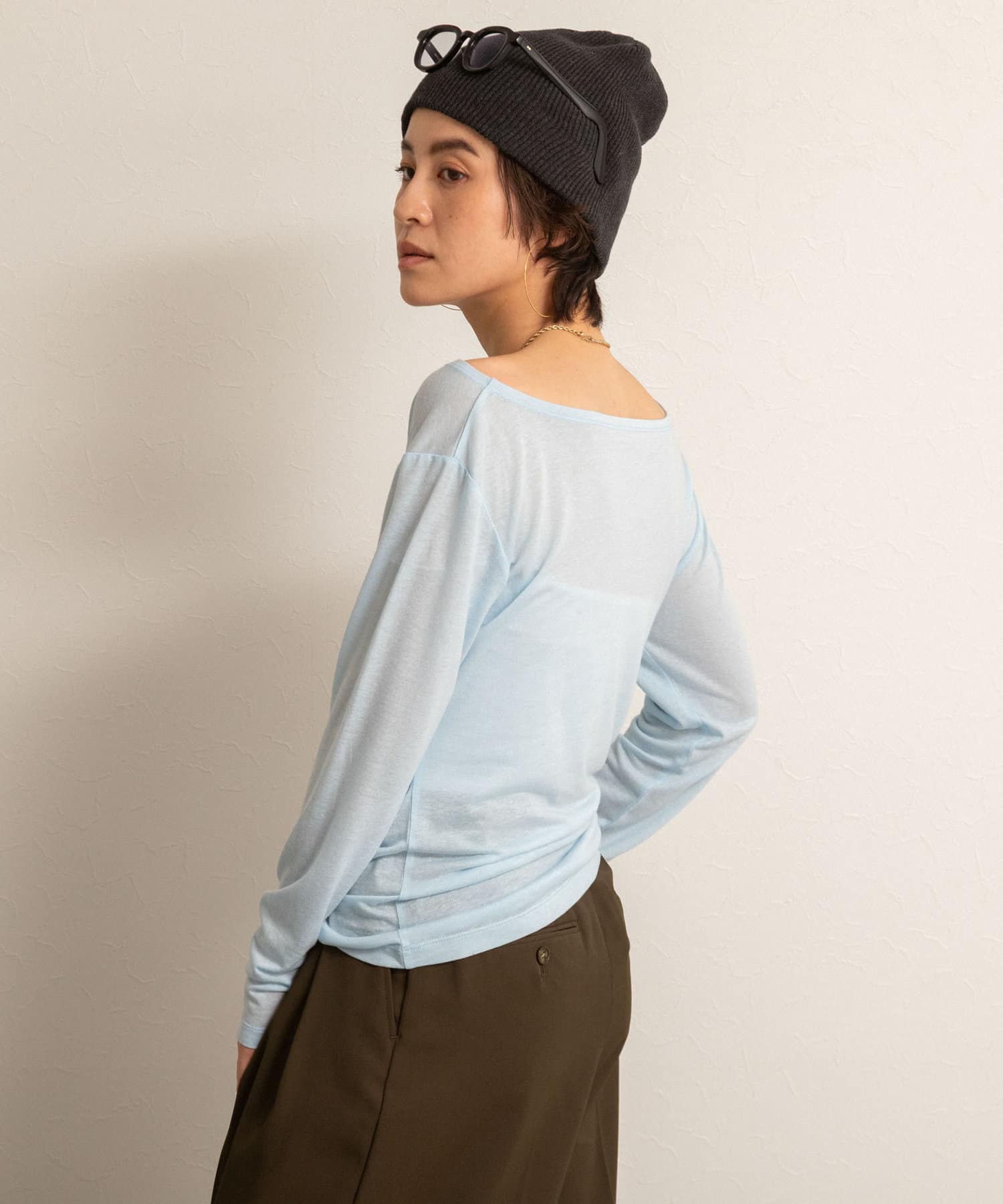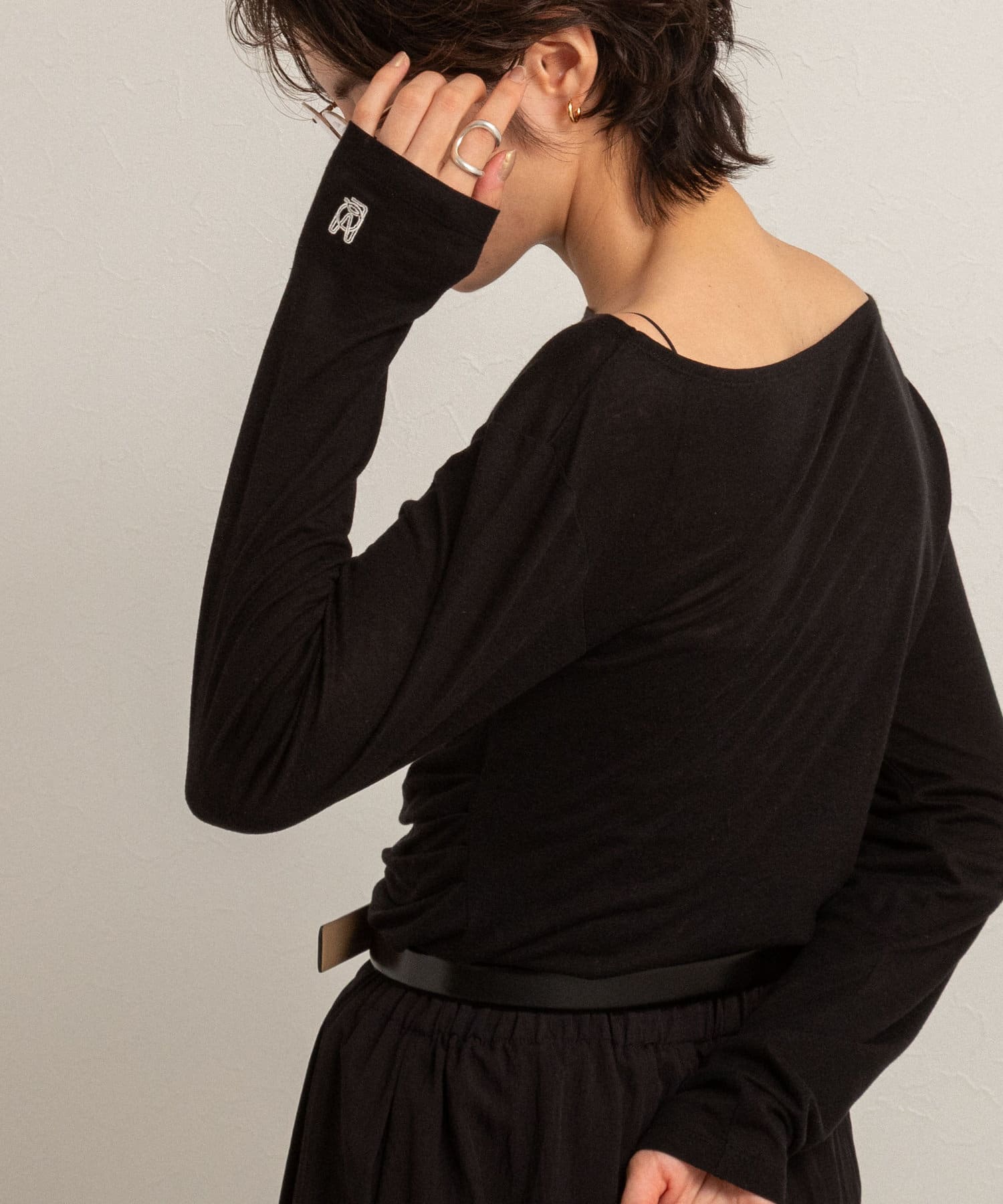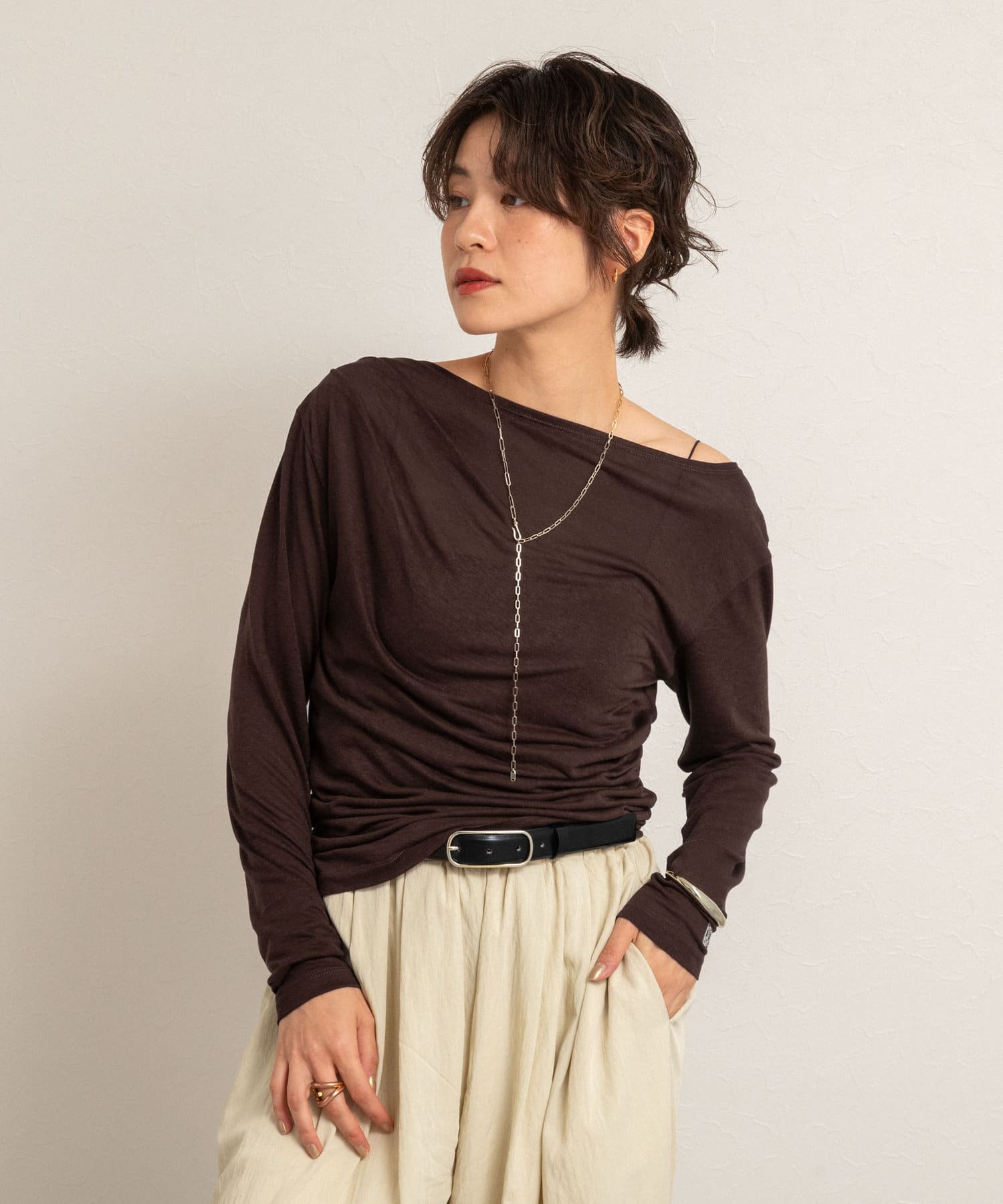 ・右肩と左ウエストにタックを入れることで、1枚でシンプルに着たときにも軽やかで動きのあるこなれた印象に