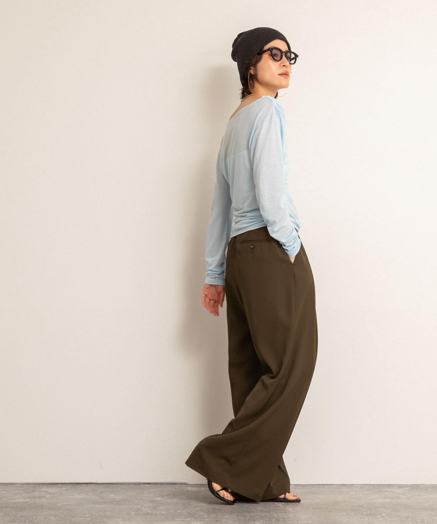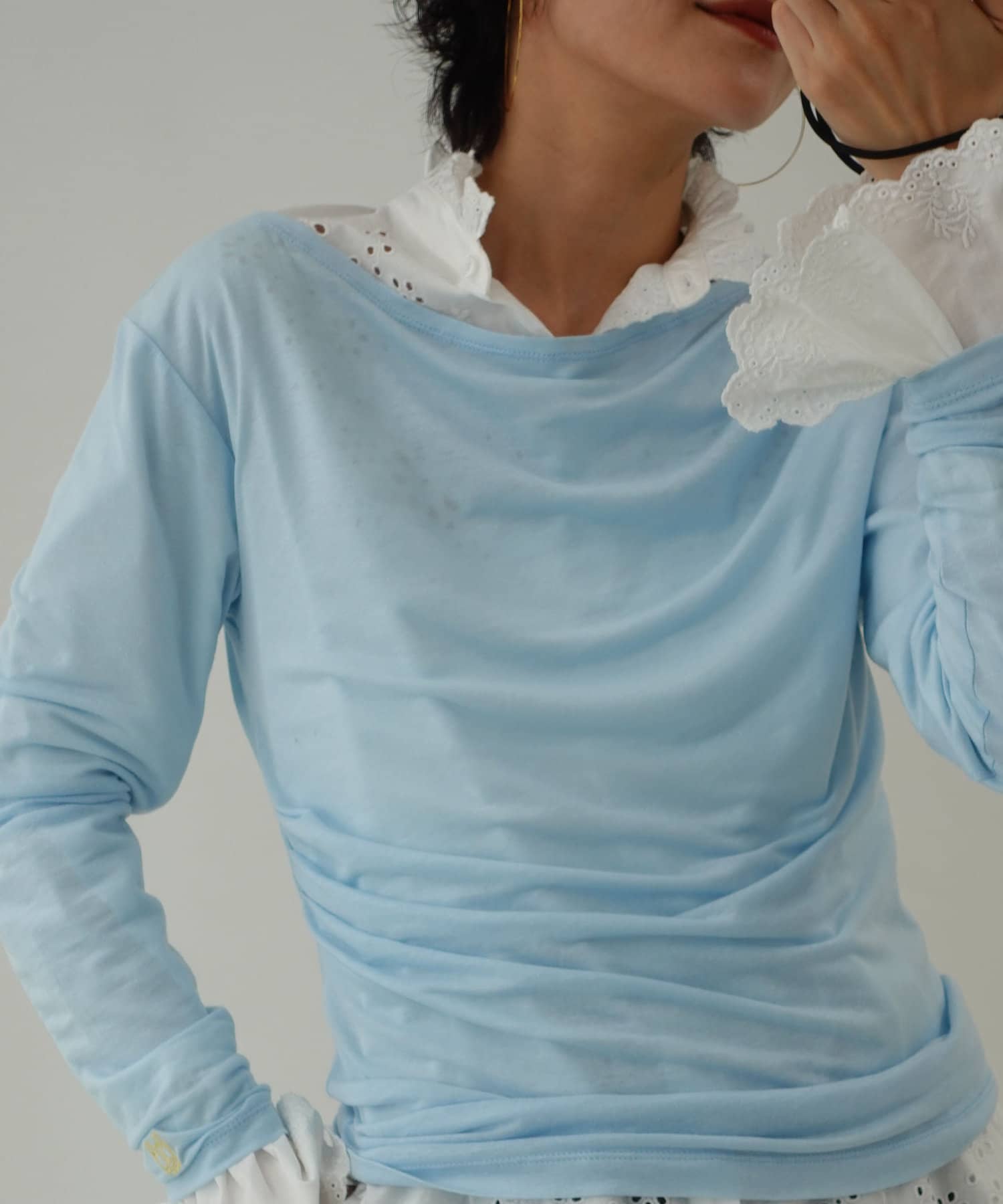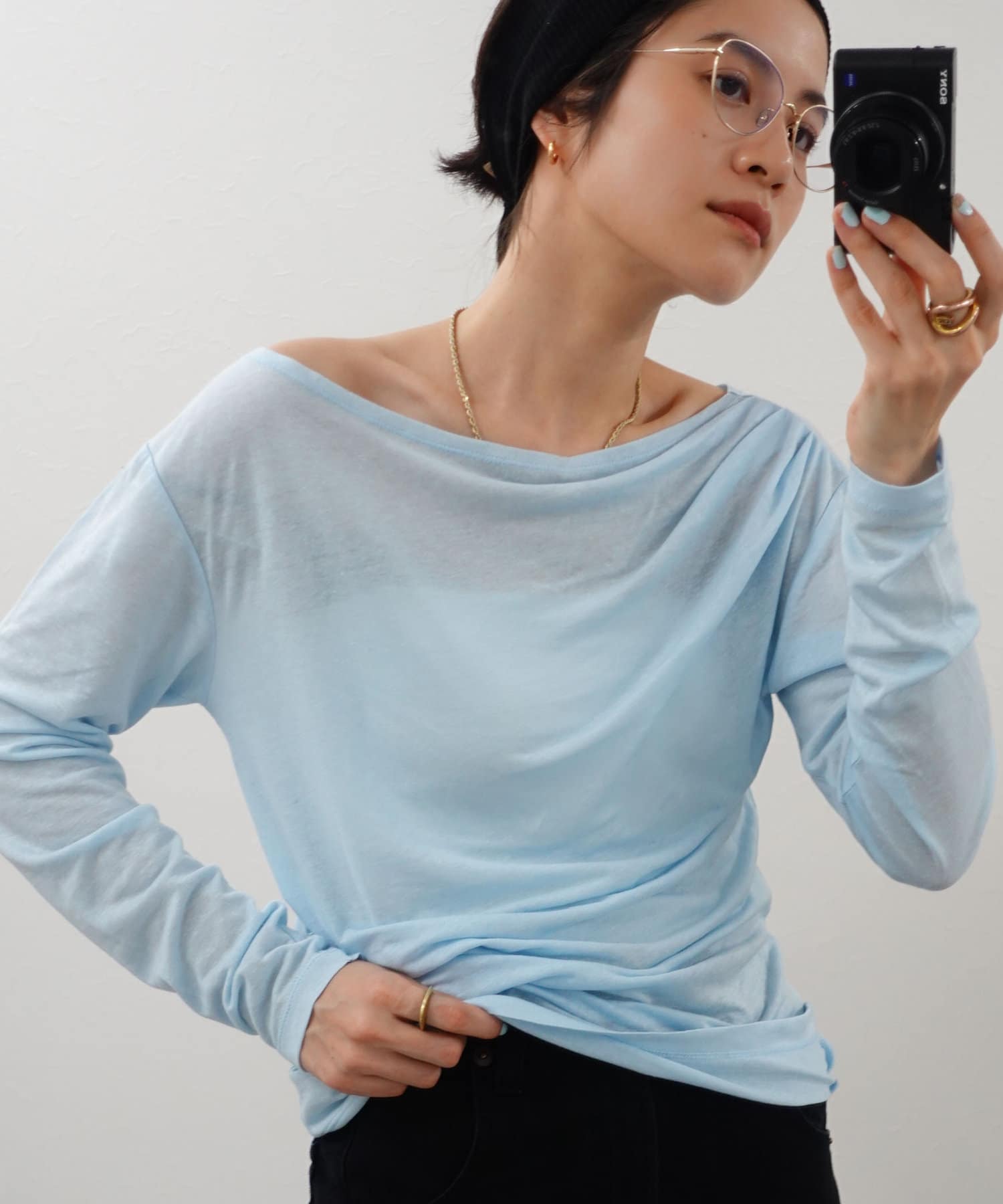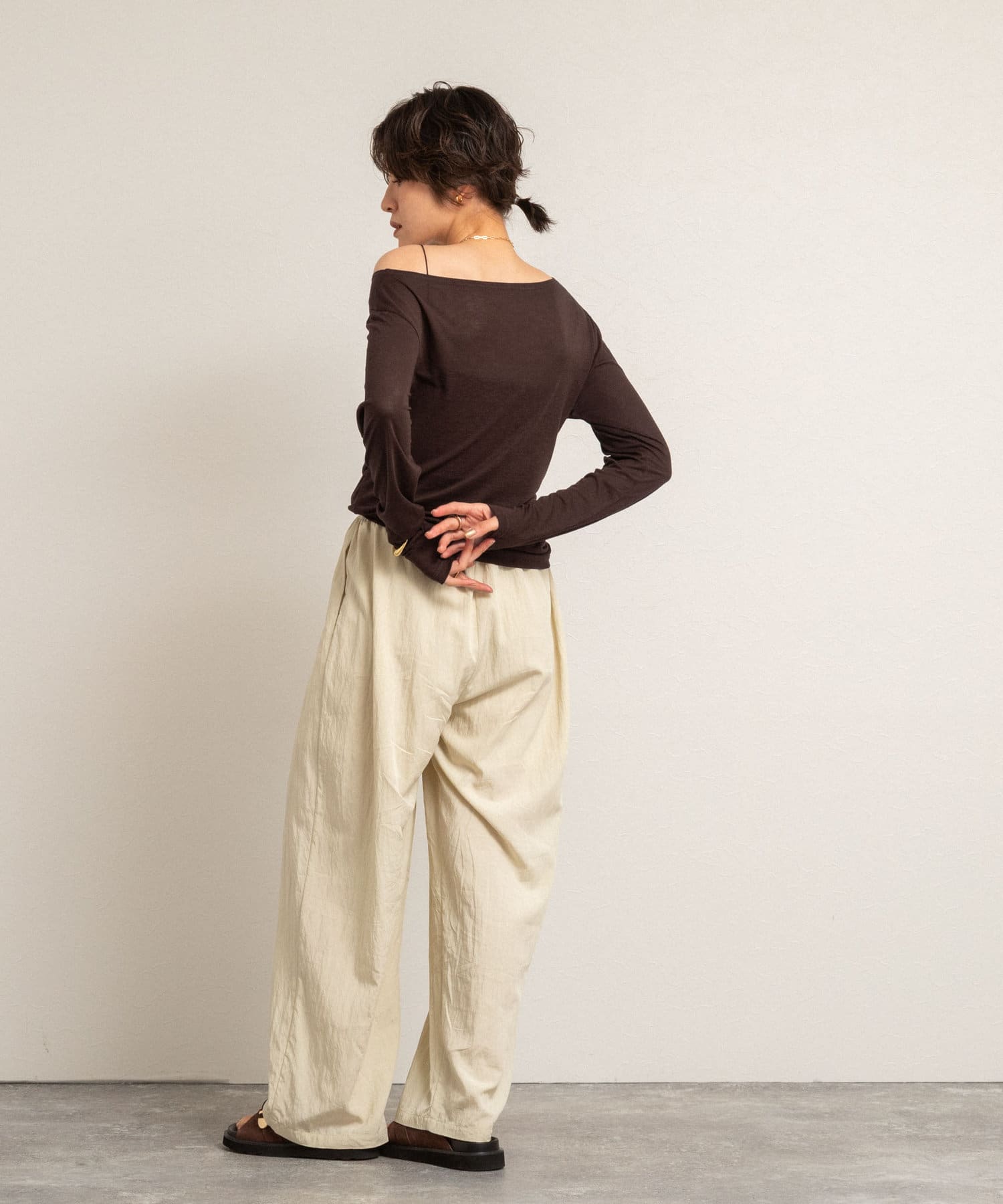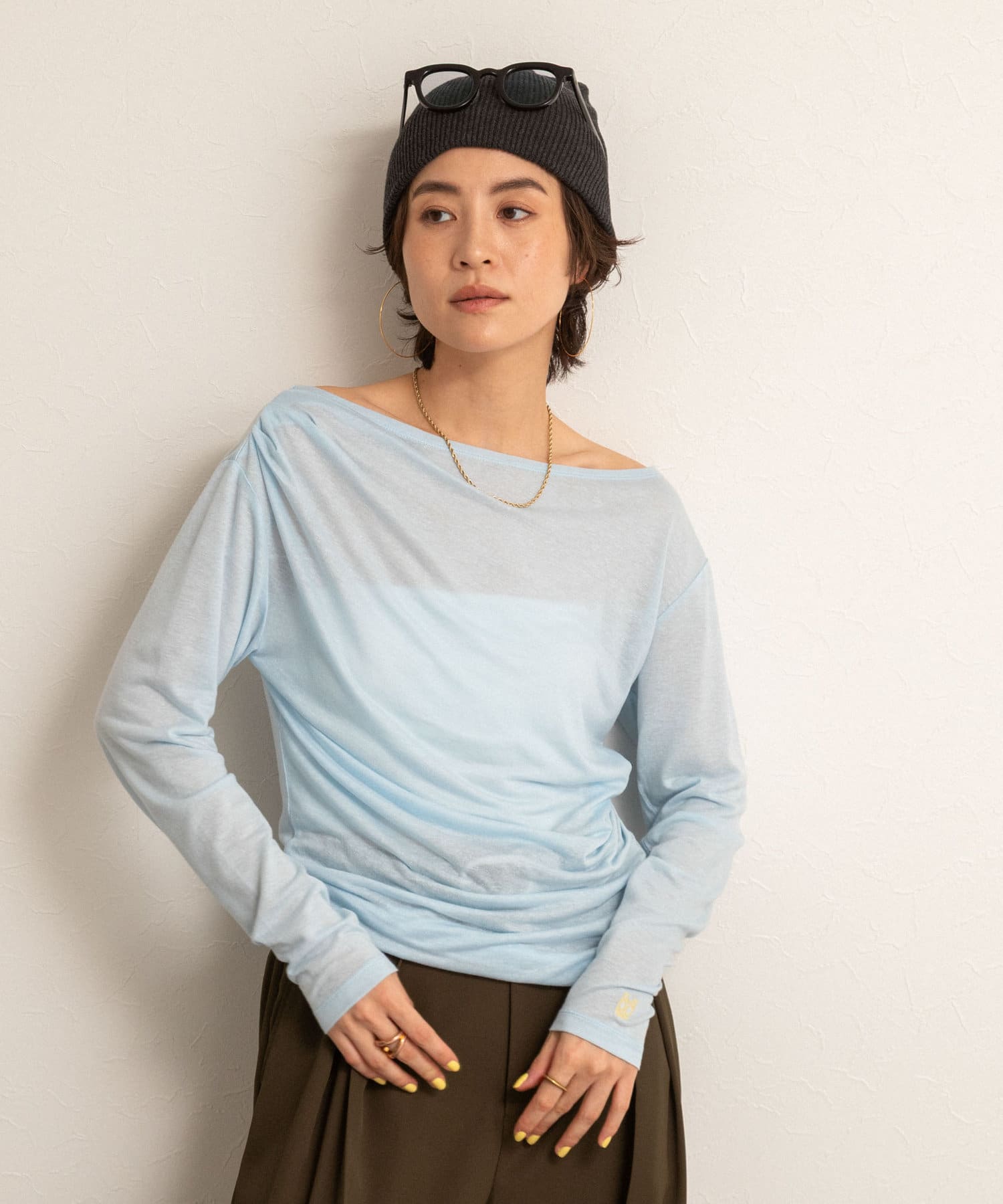 ・右肩と左ウエストにタックを入れることで、1枚でシンプルに着たときにも軽やかで動きのあるこなれた印象に