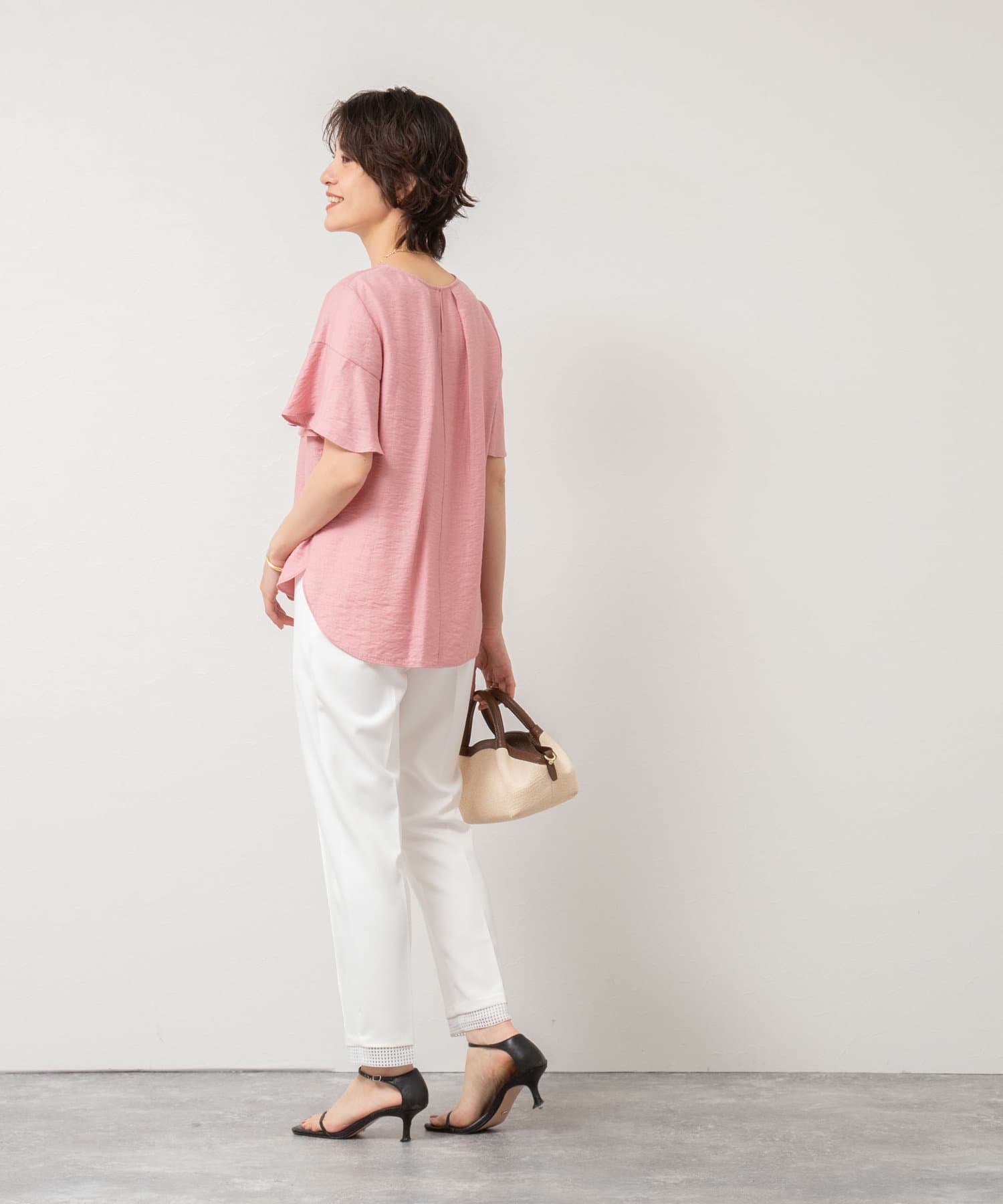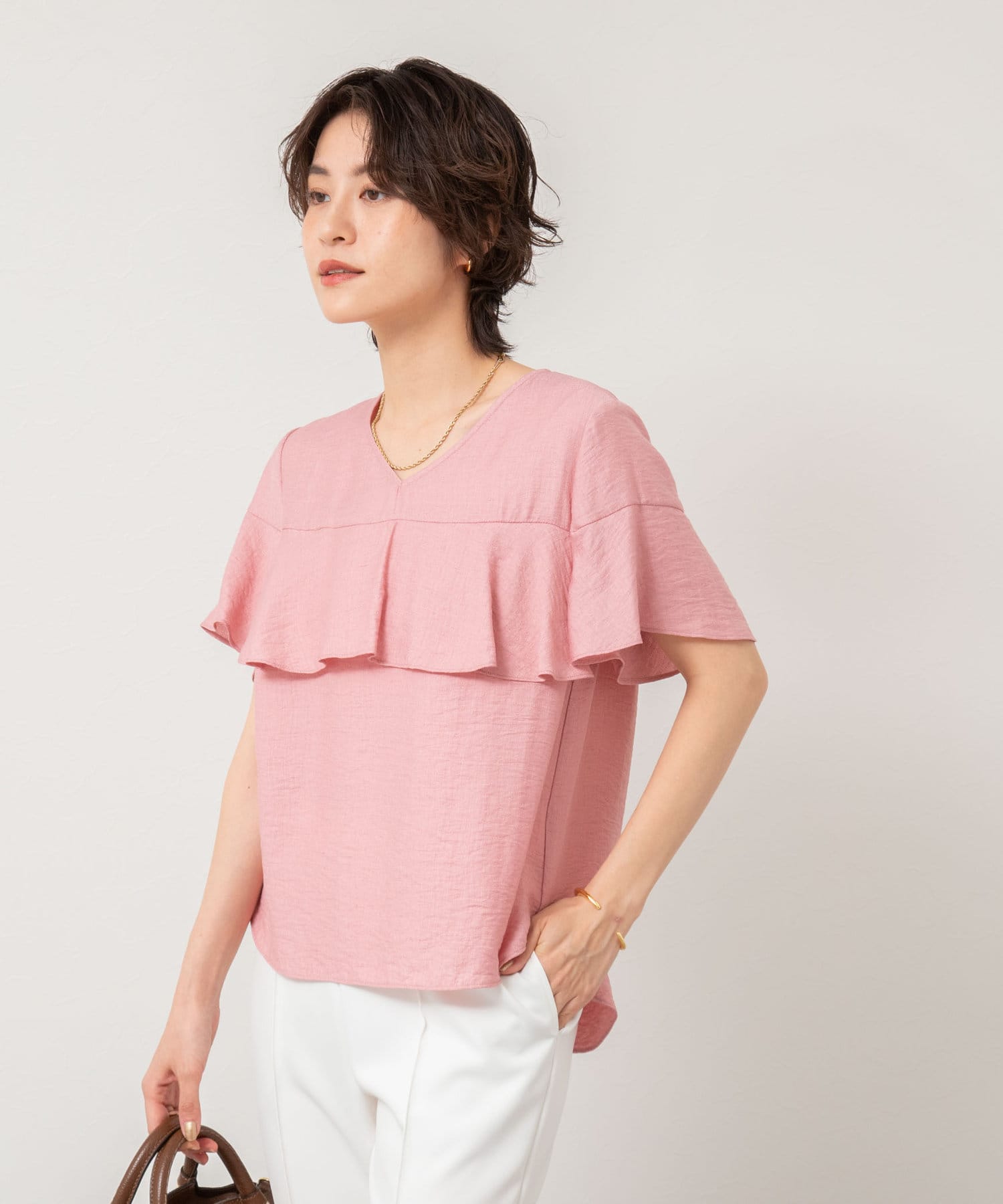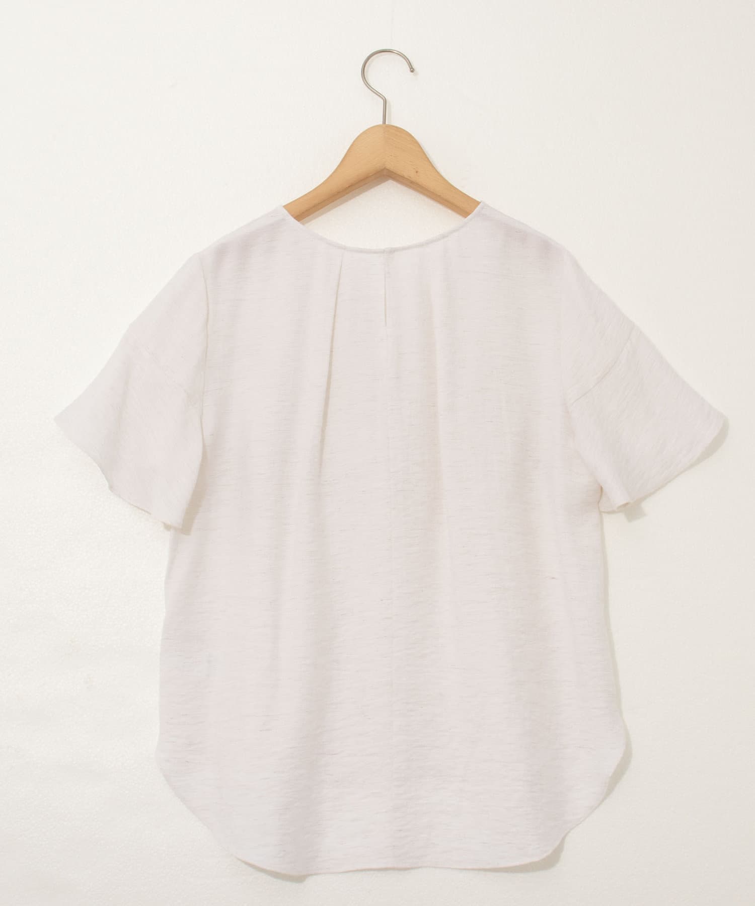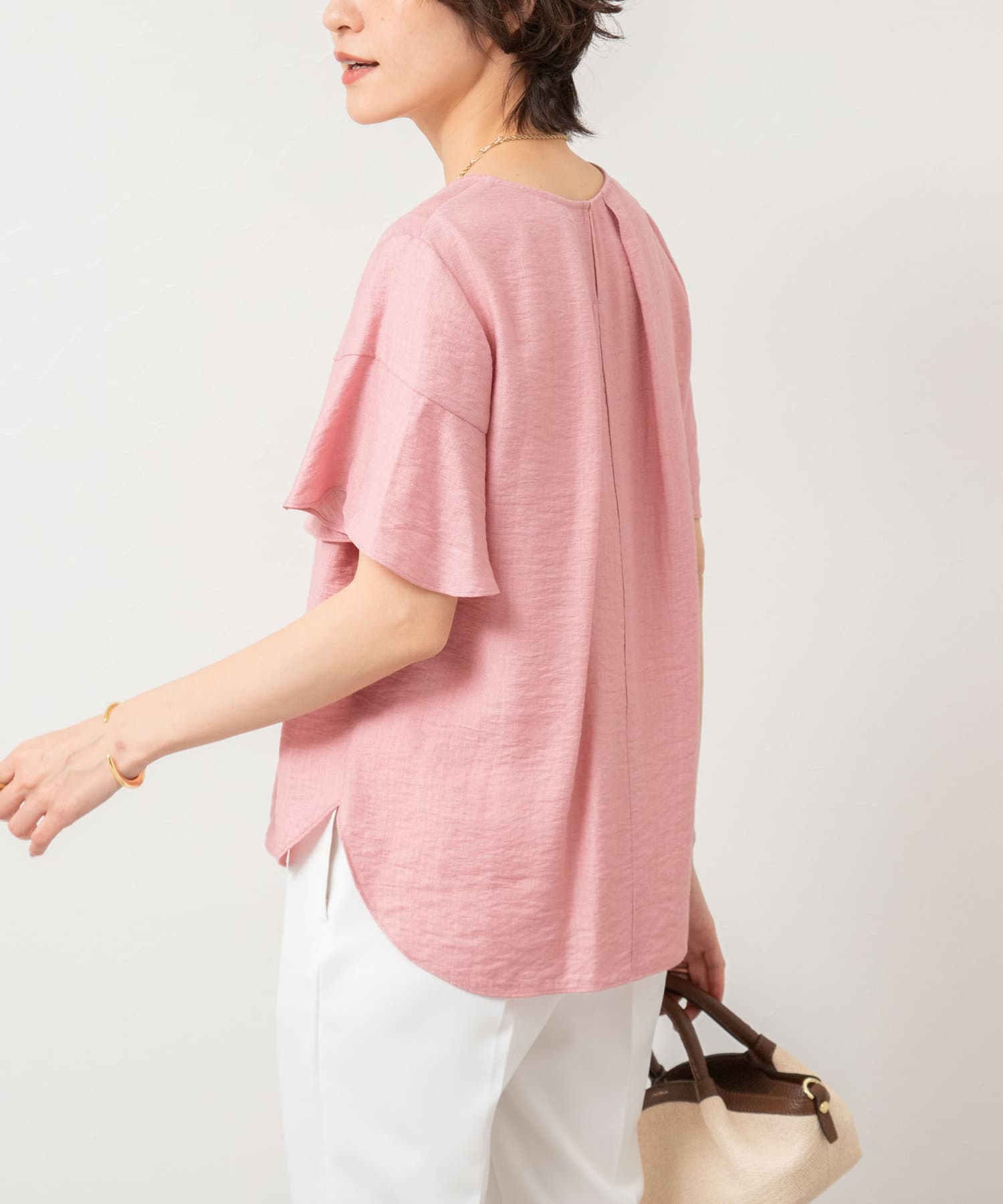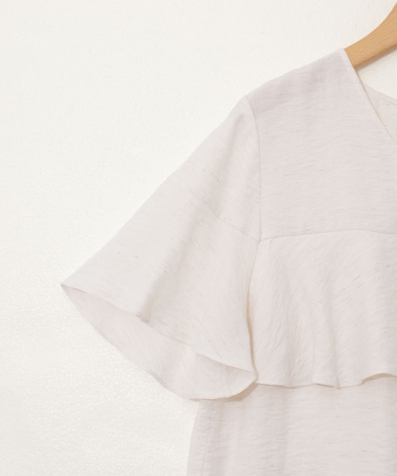 ・袖と胸元のフレアデザインが程よい甘さの半袖ブラウス