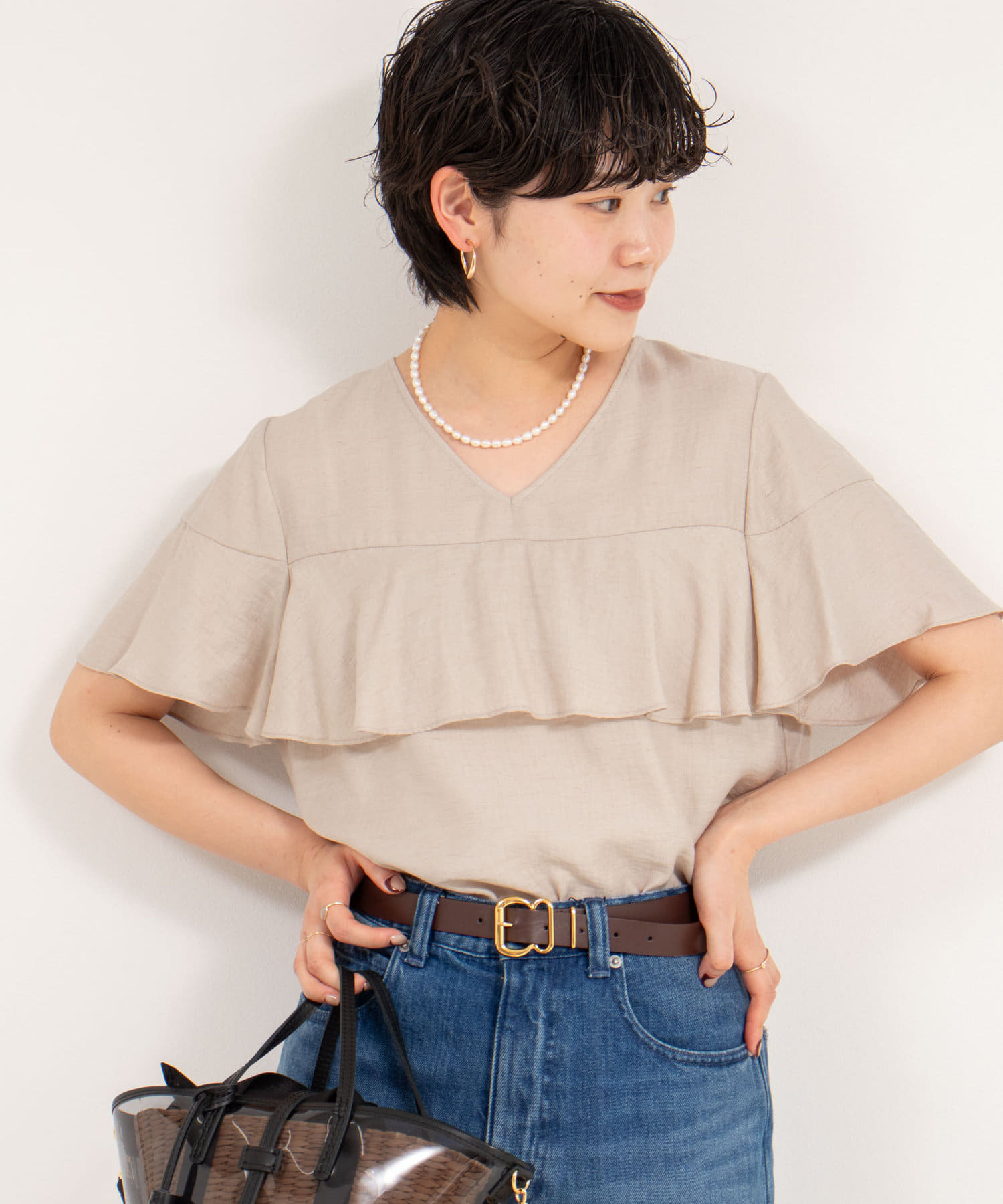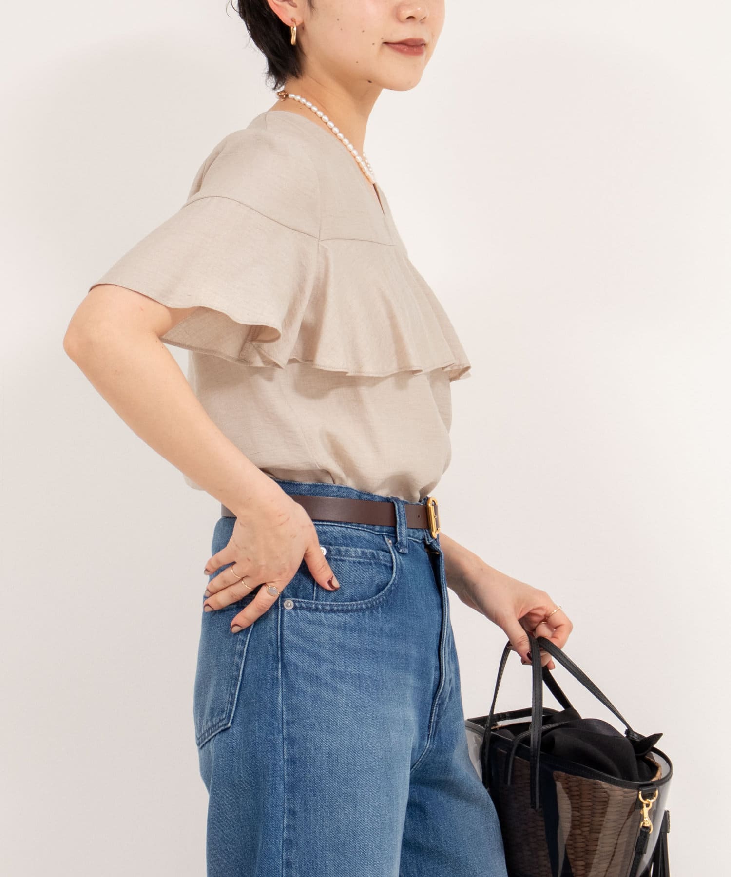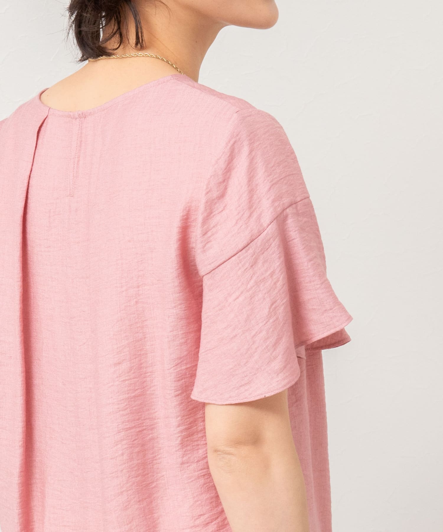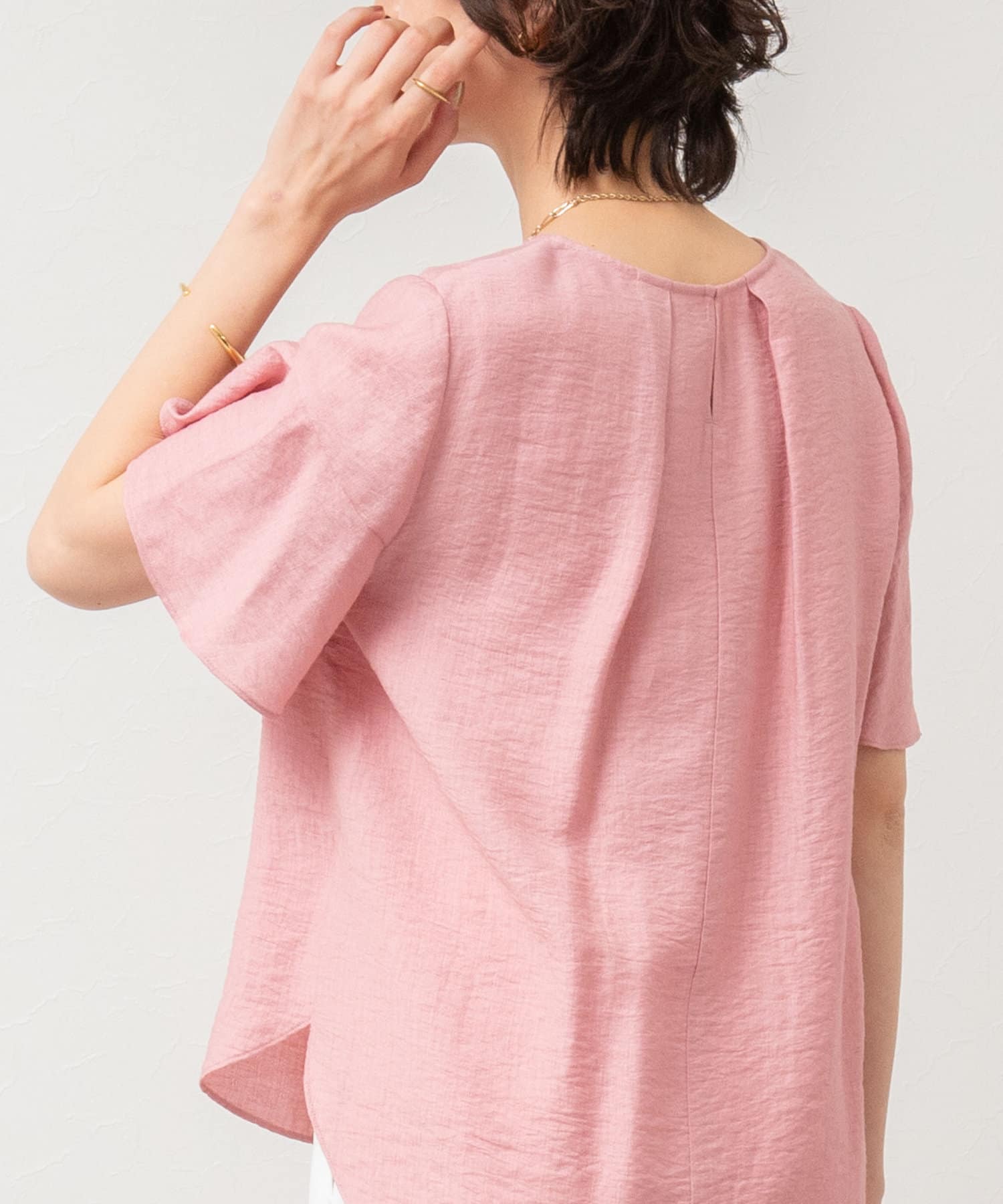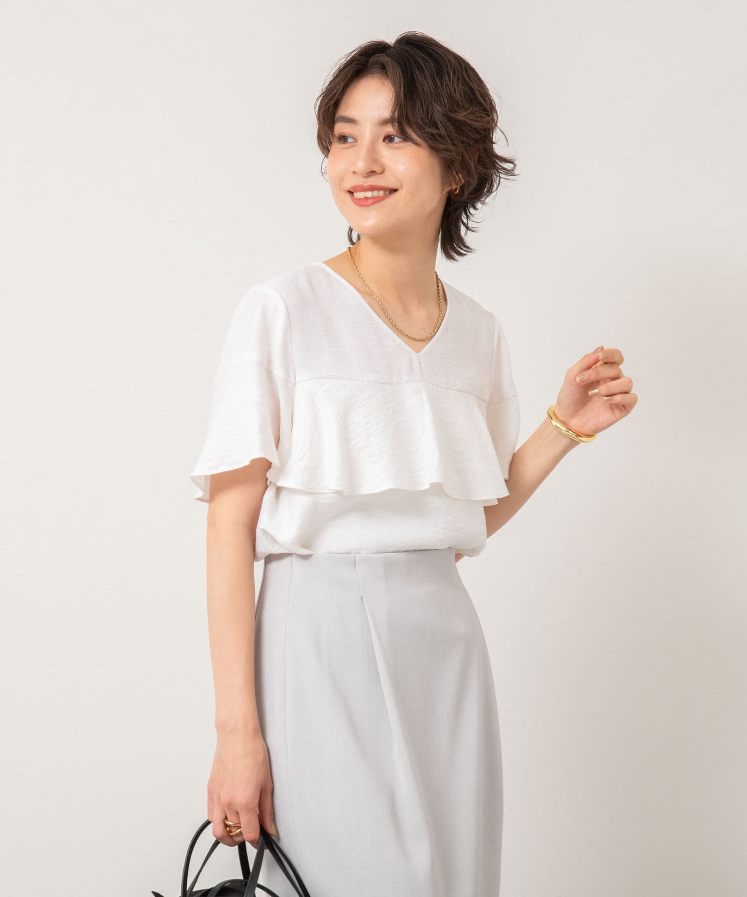 ・袖と胸元のフレアデザインが程よい甘さの半袖ブラウス