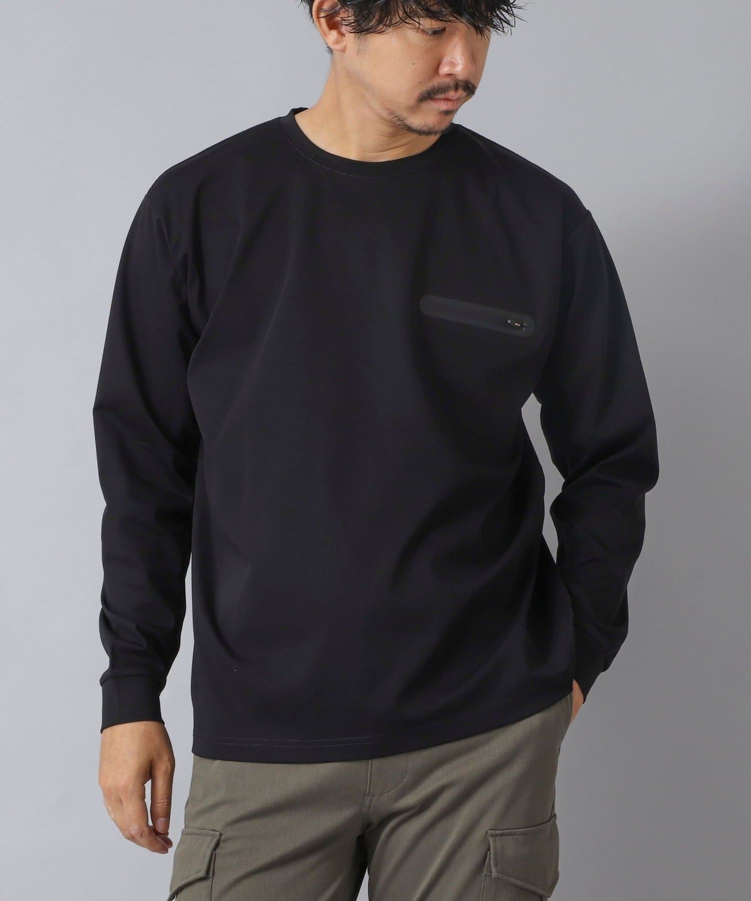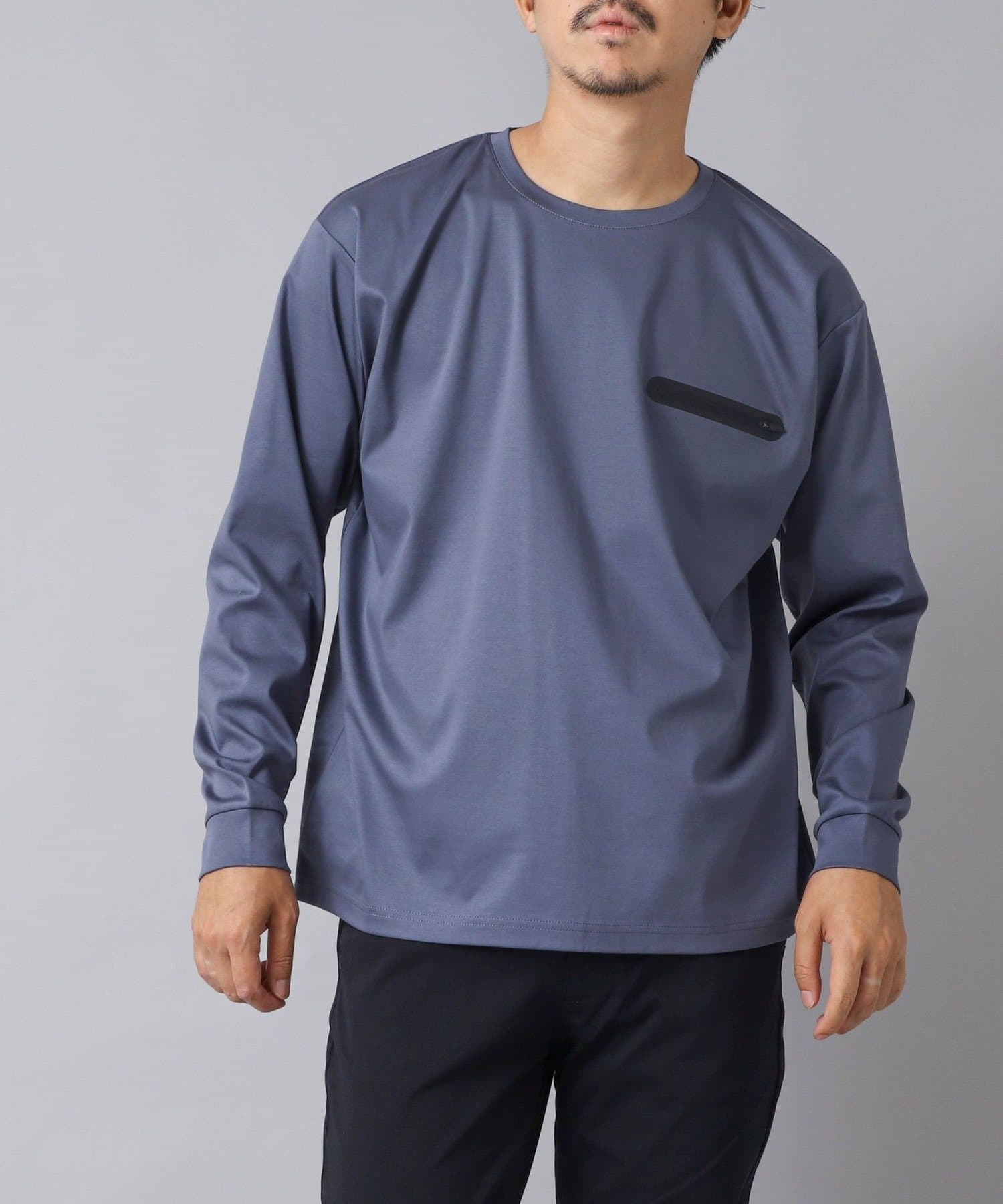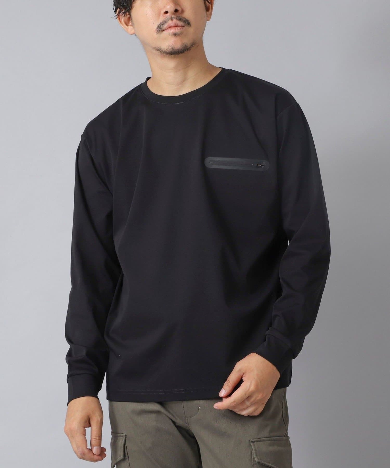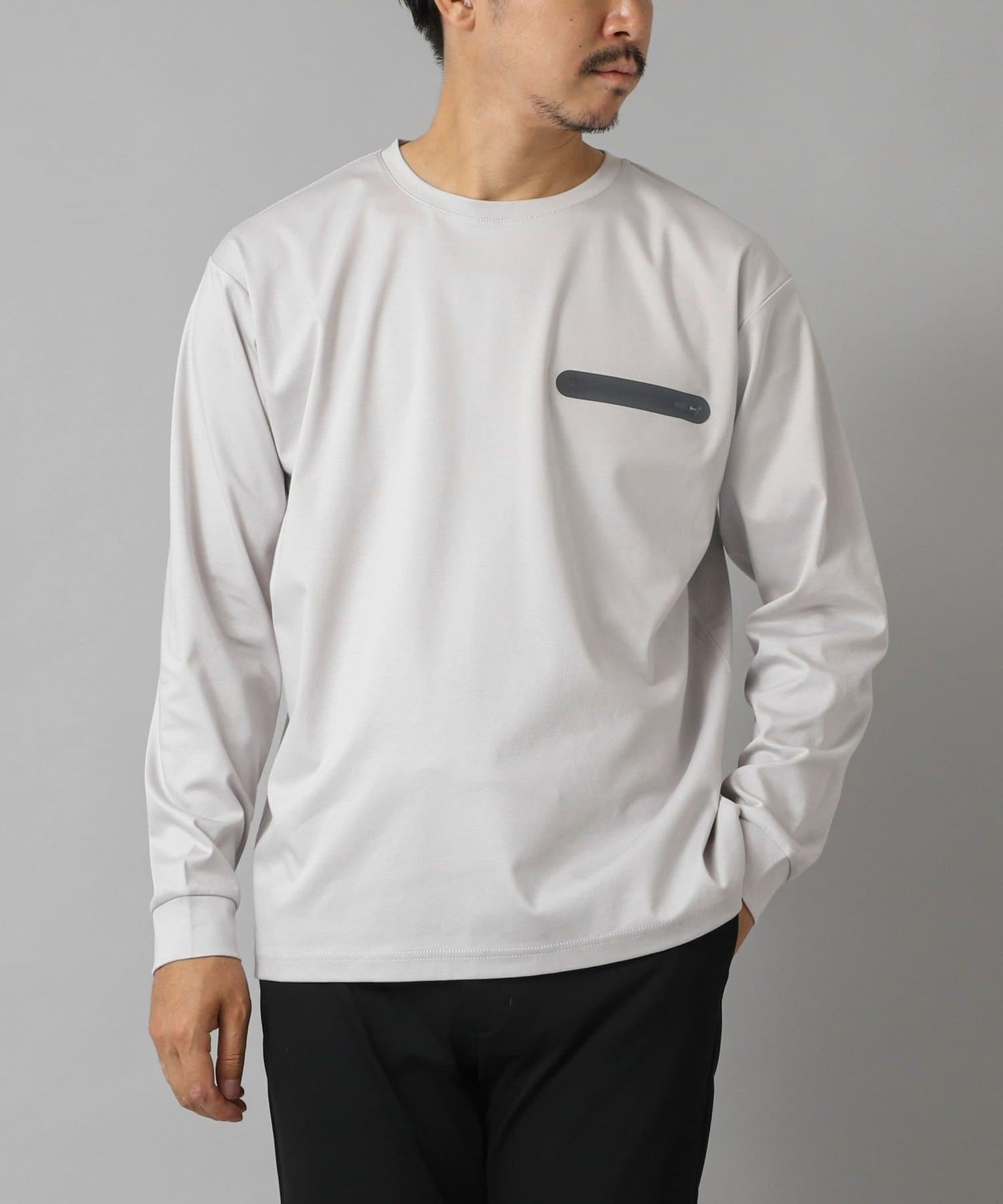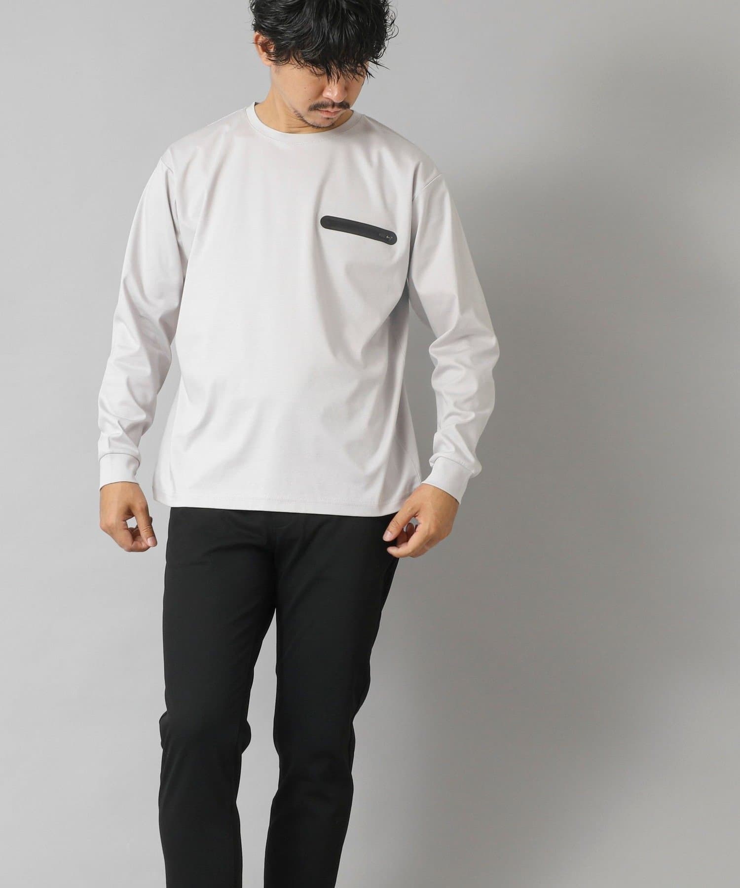 シンプルなクルーネックロンTの左胸に、シーリングポケットを配置。
