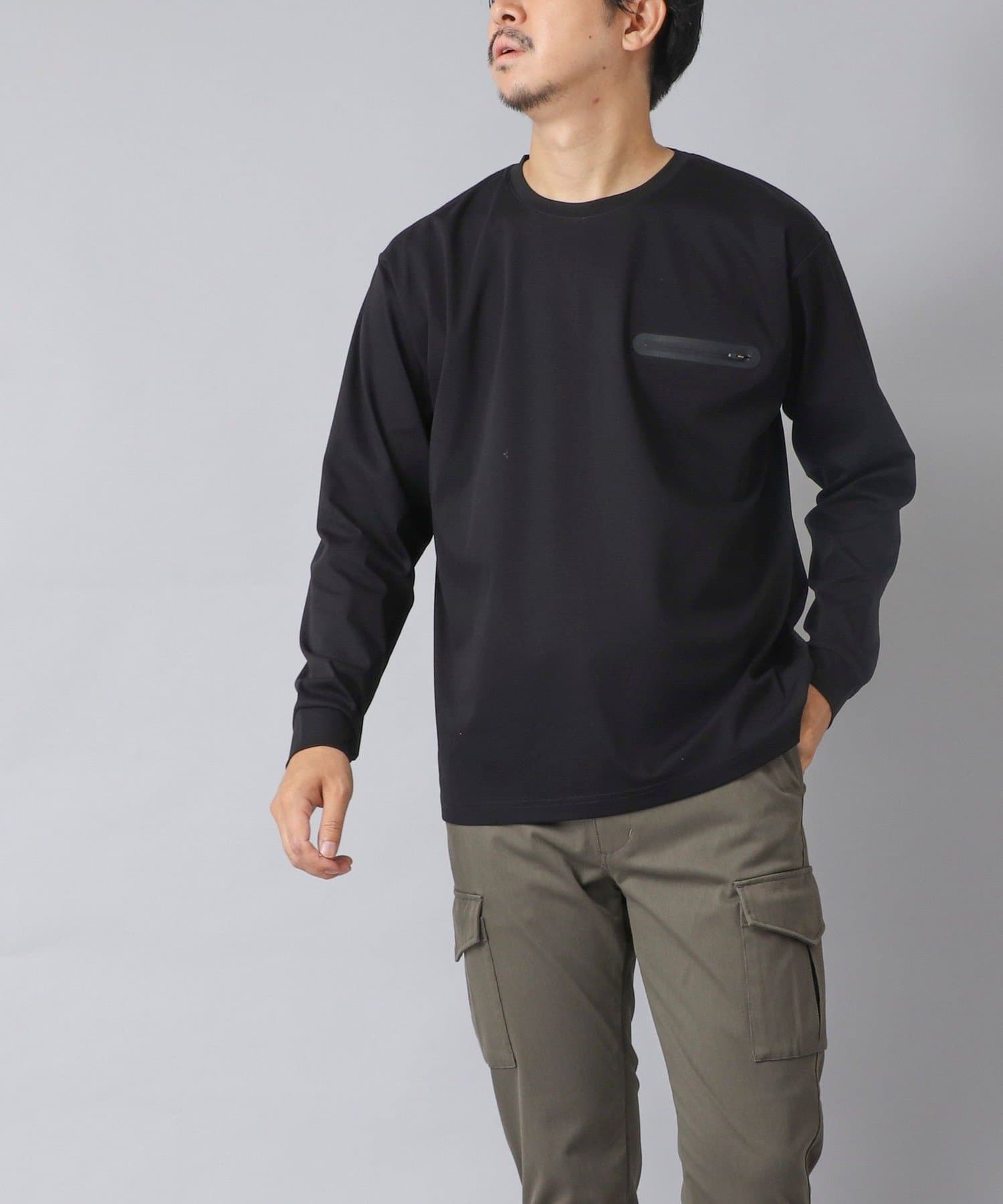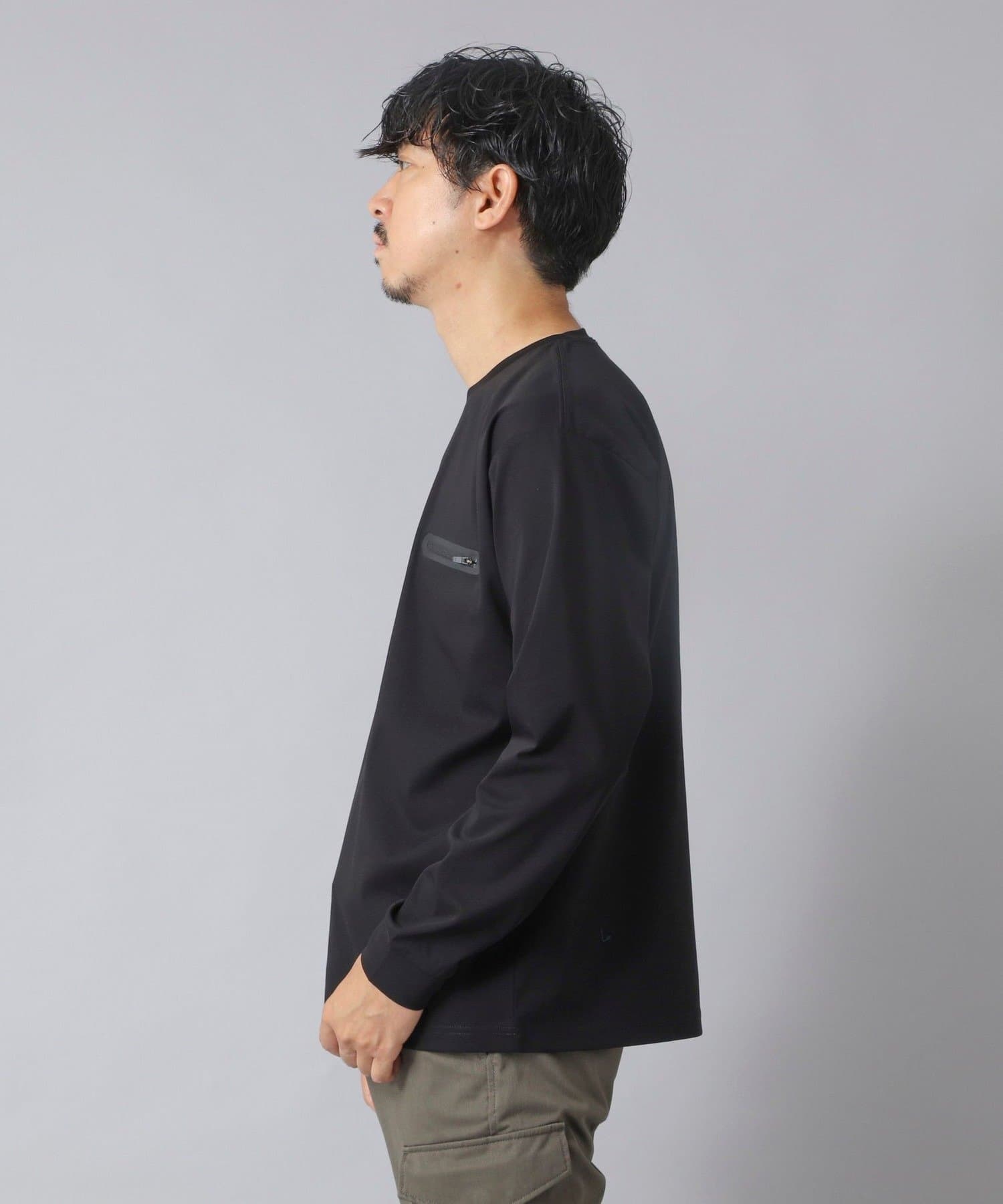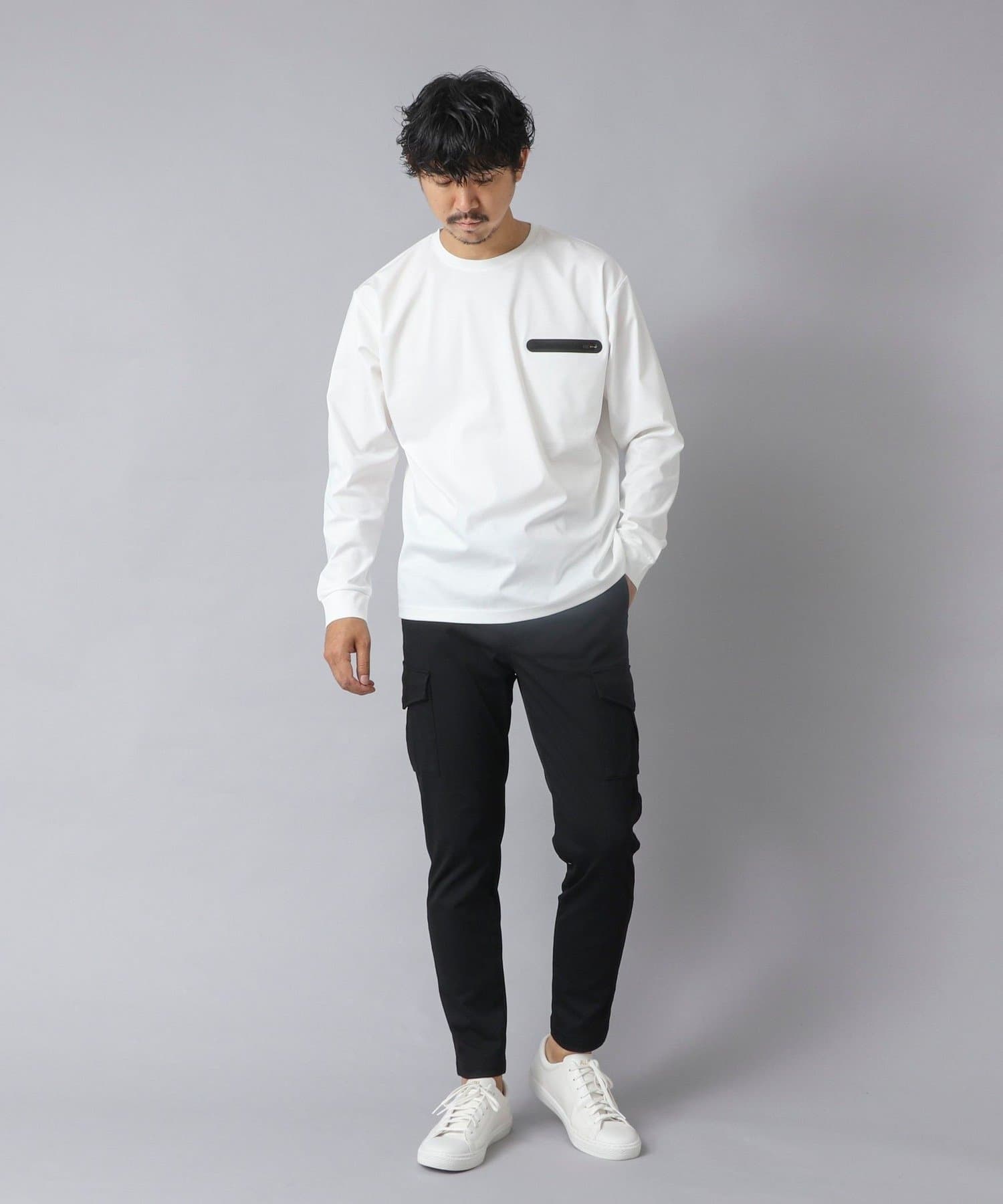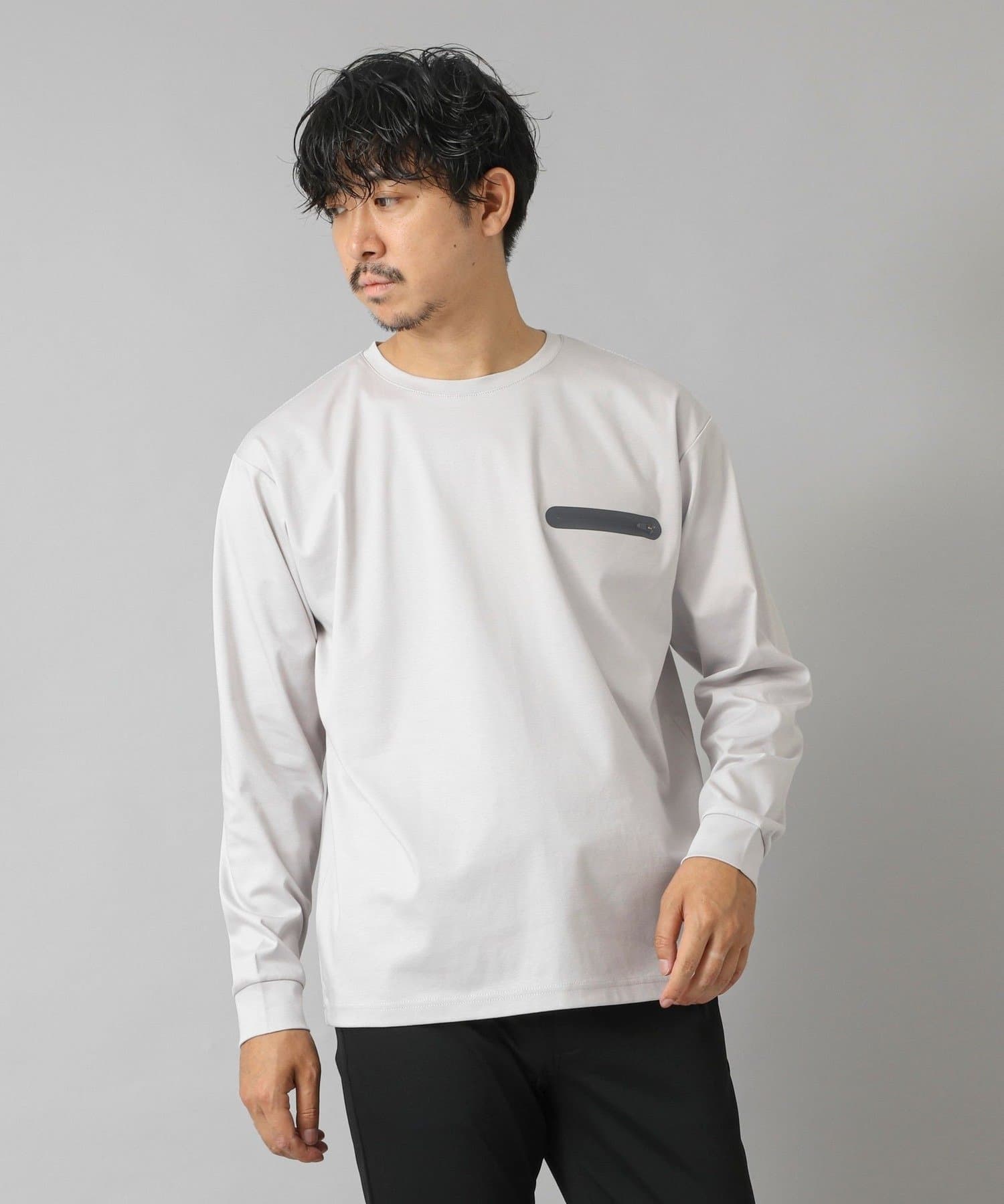 シンプルなクルーネックロンTの左胸に、シーリングポケットを配置。