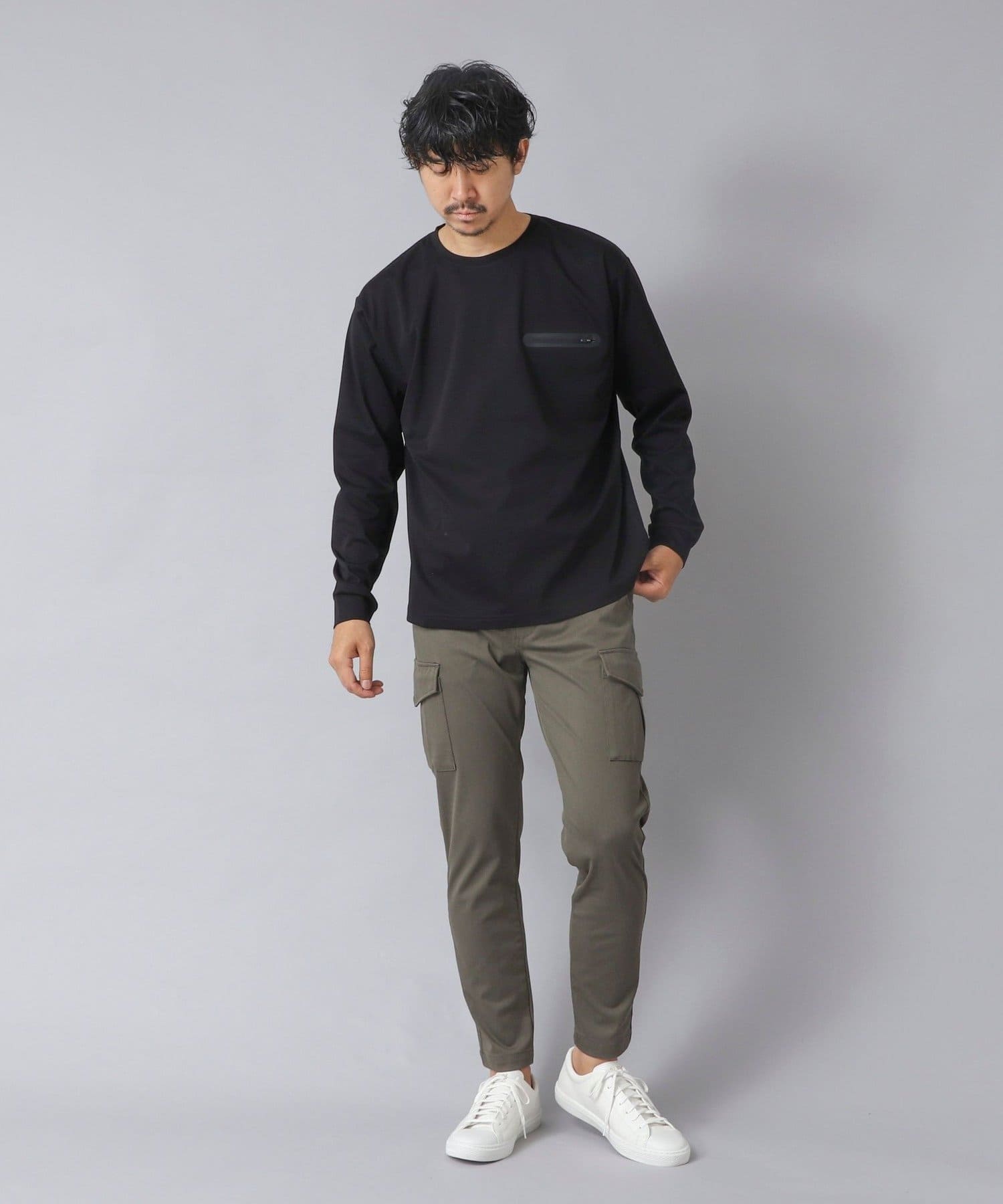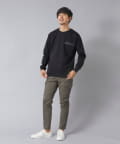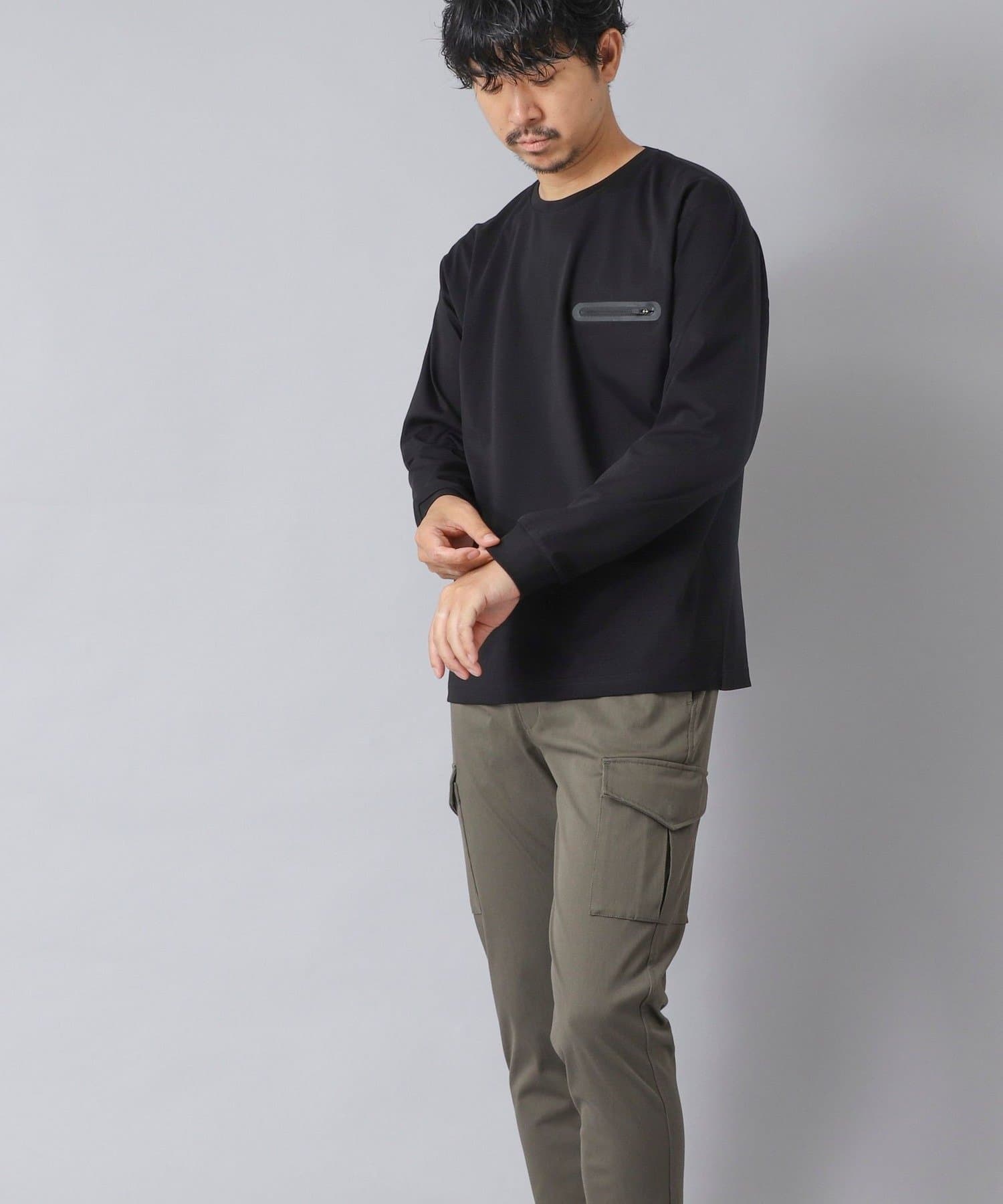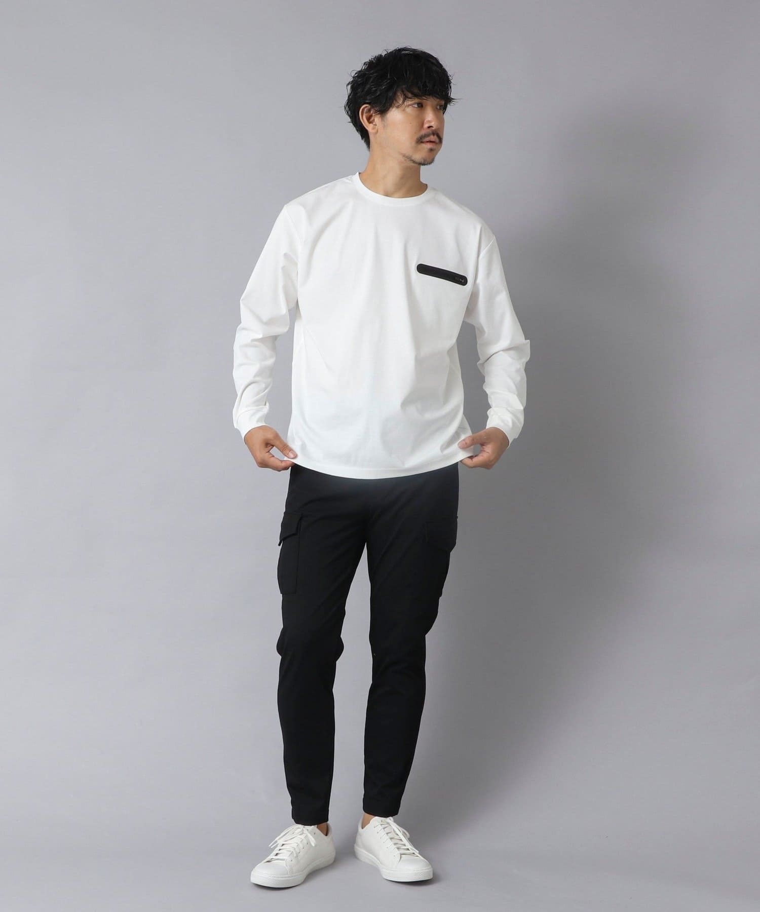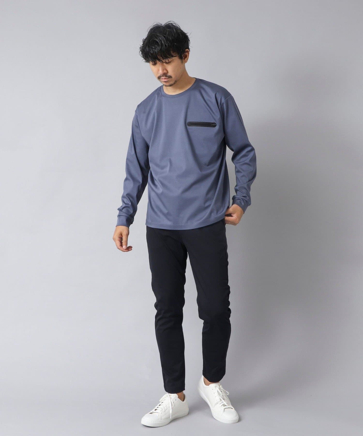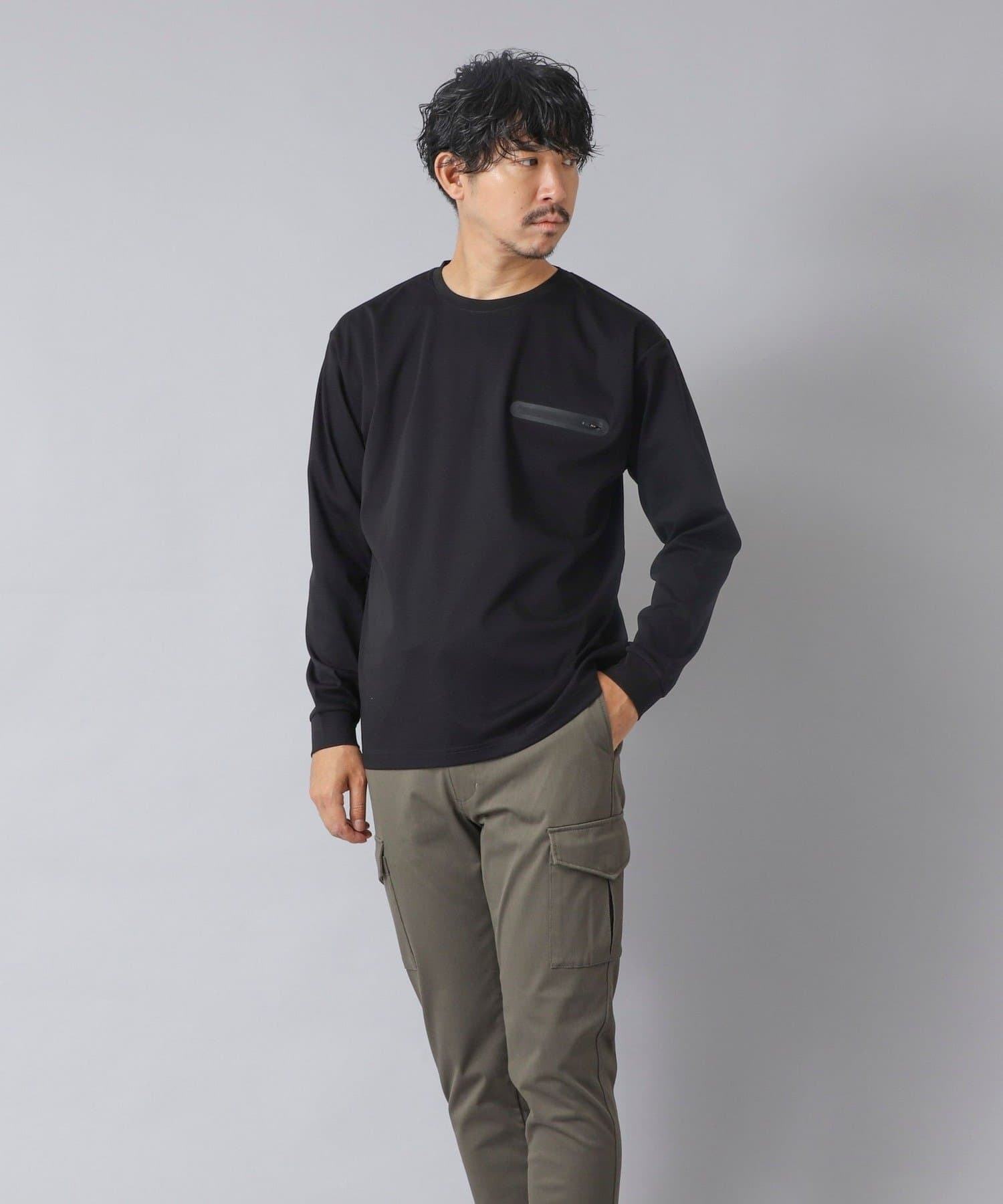 シンプルなクルーネックロンTの左胸に、シーリングポケットを配置。