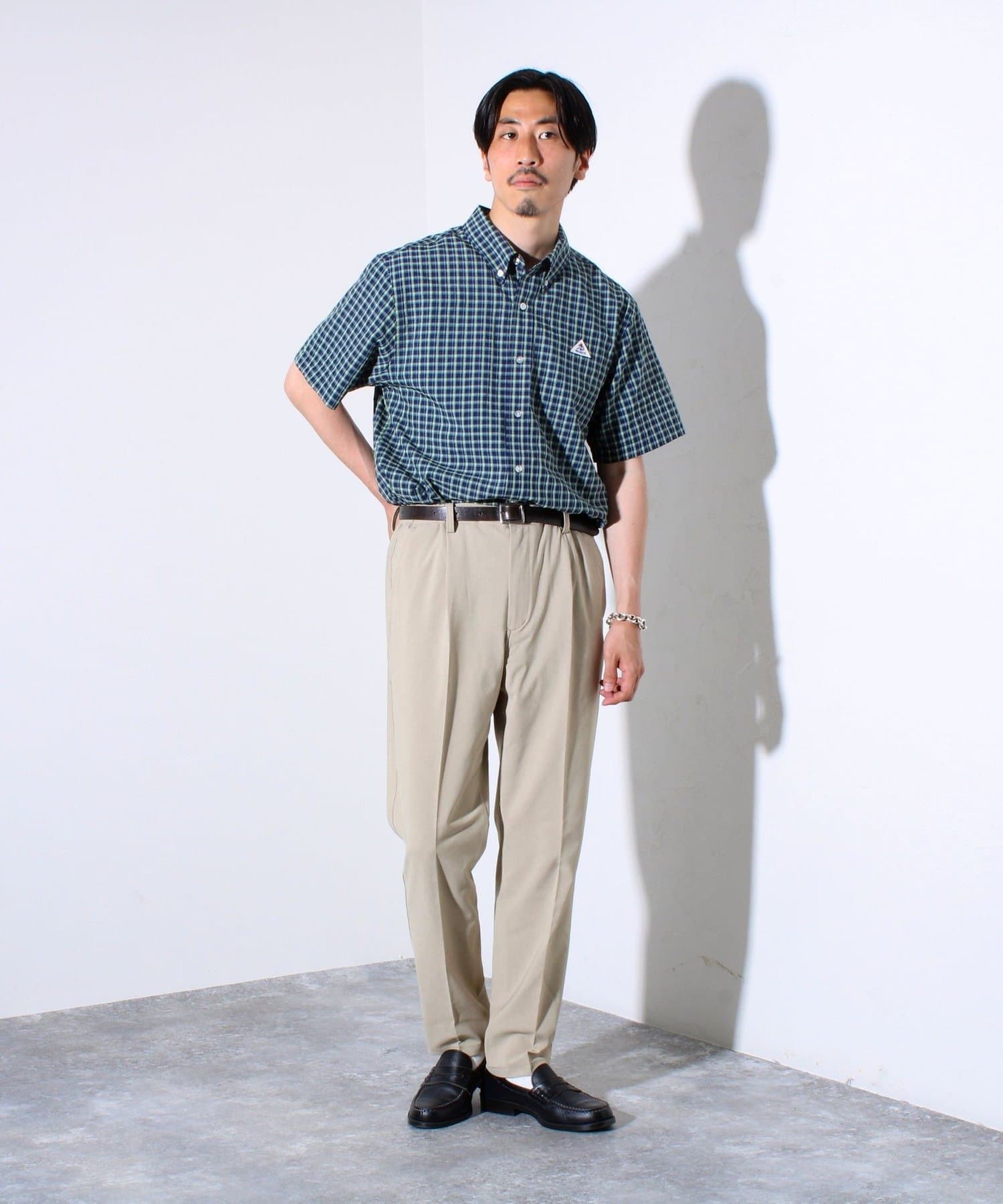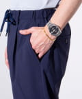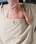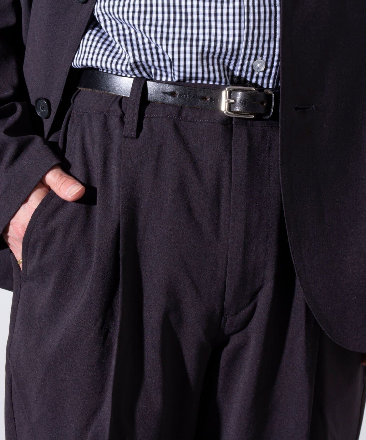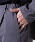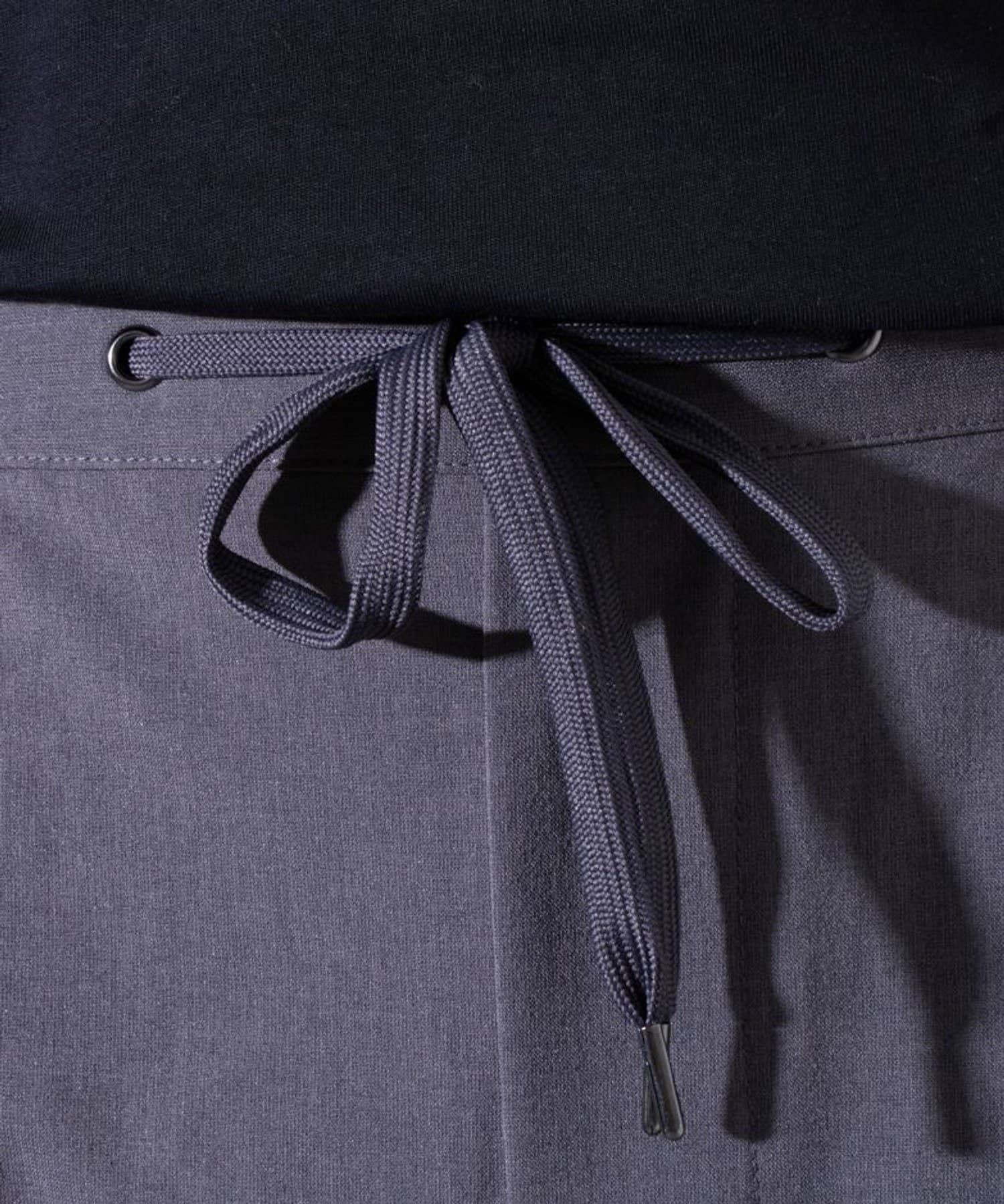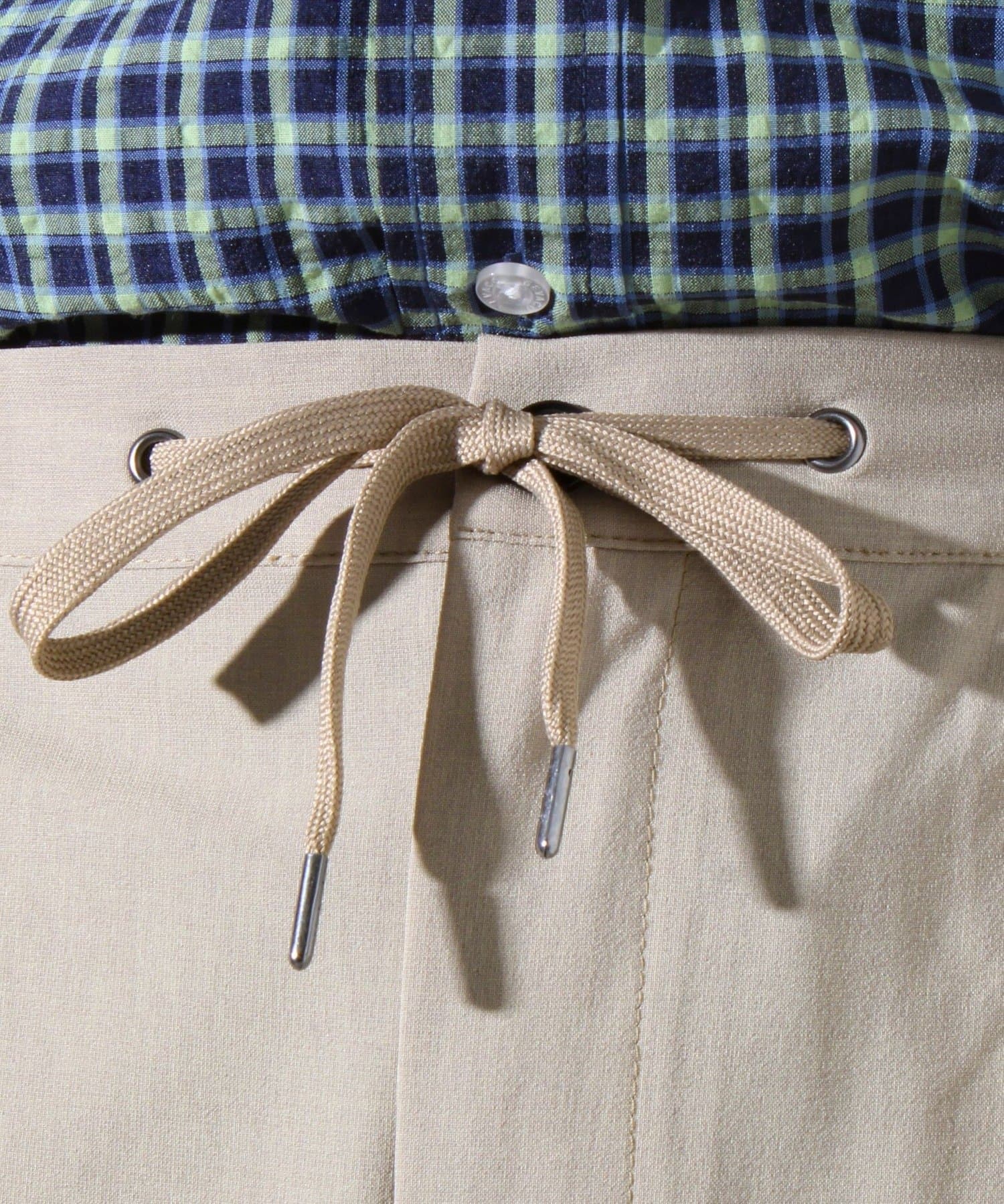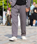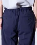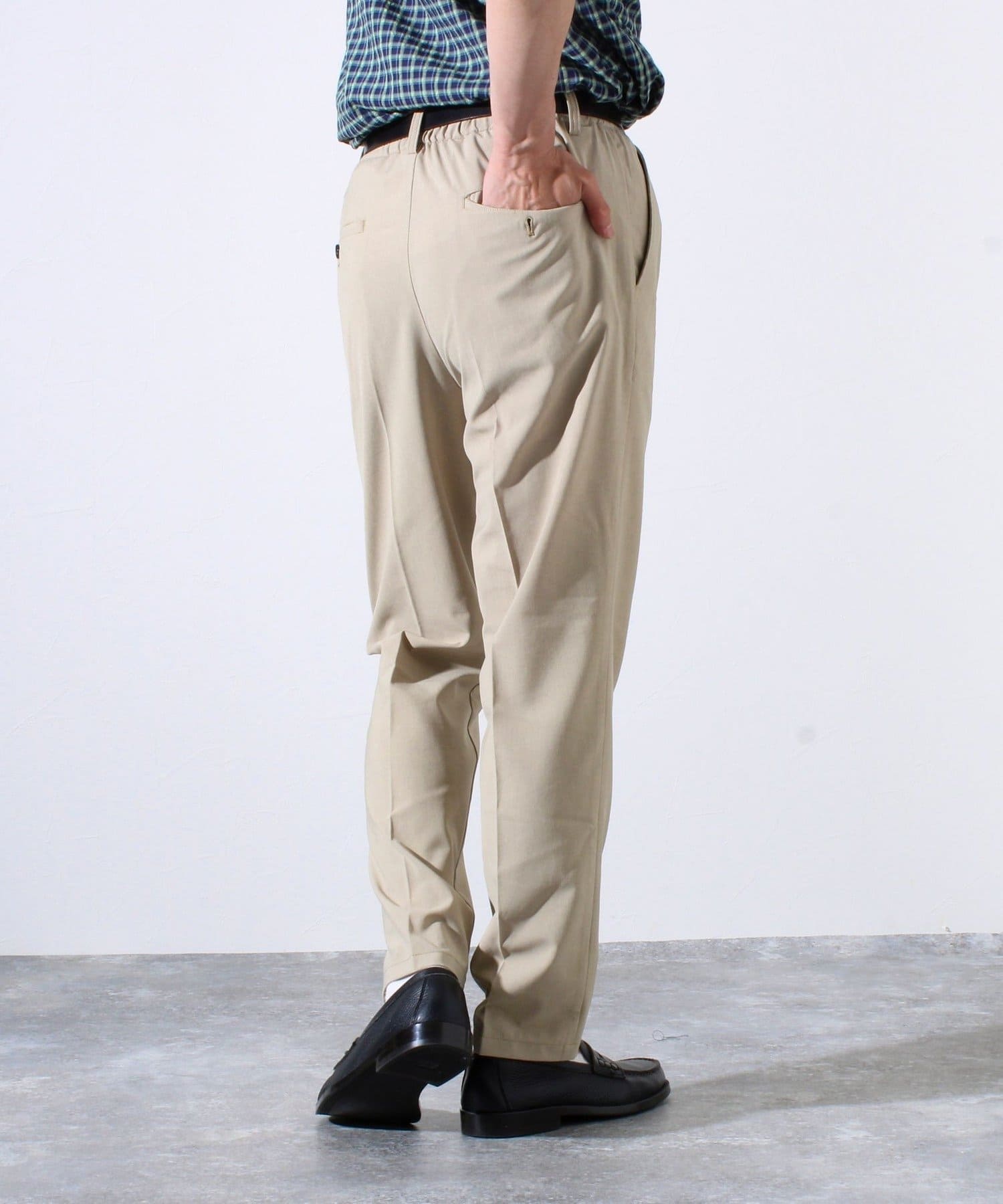 ウエストにはゴム、ベルトループをそれぞれ採用し、イージーパンツの様なリラックスした着用からベルトを使ったトップスインの着こなしまで、幅広く対応可能。
