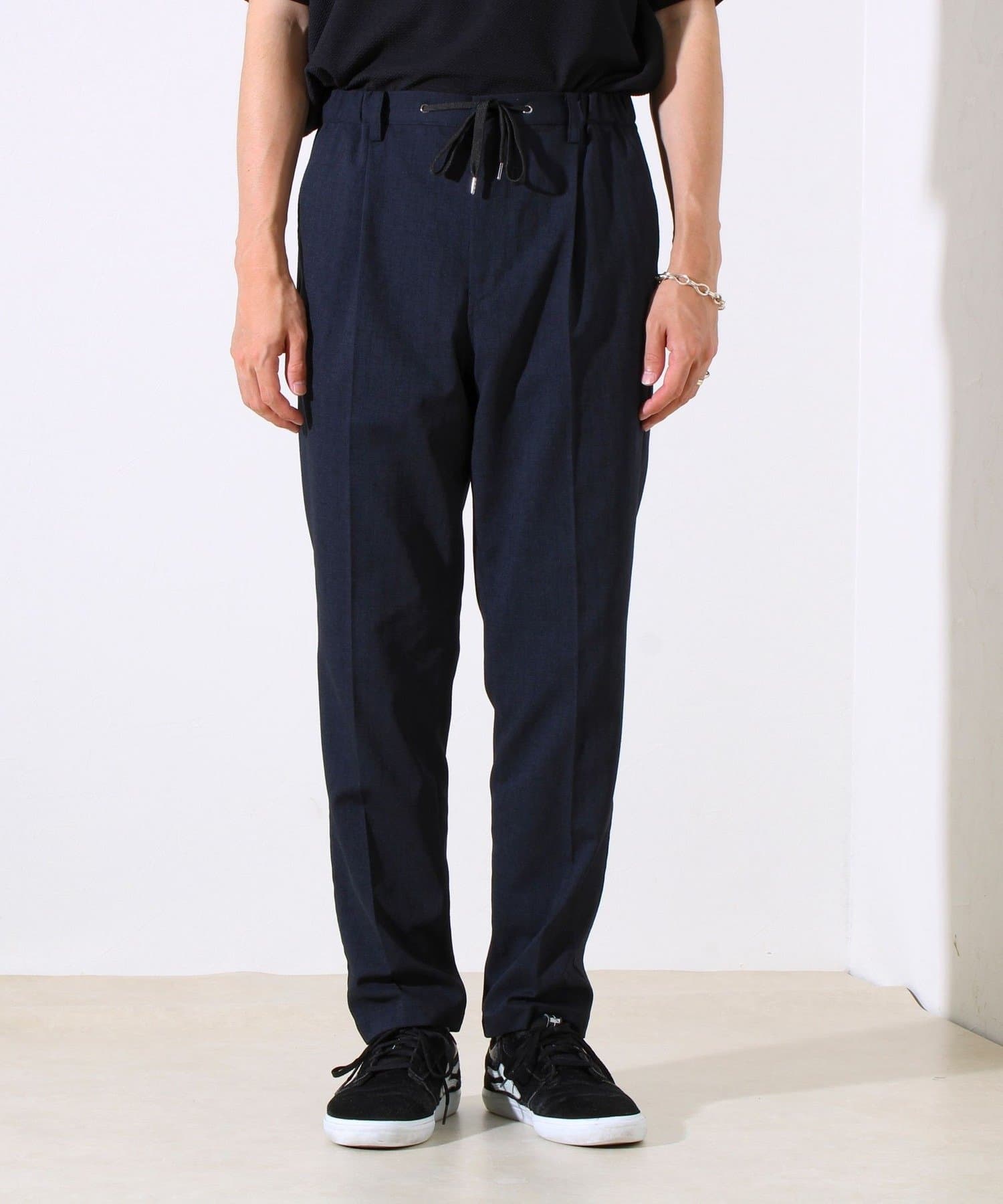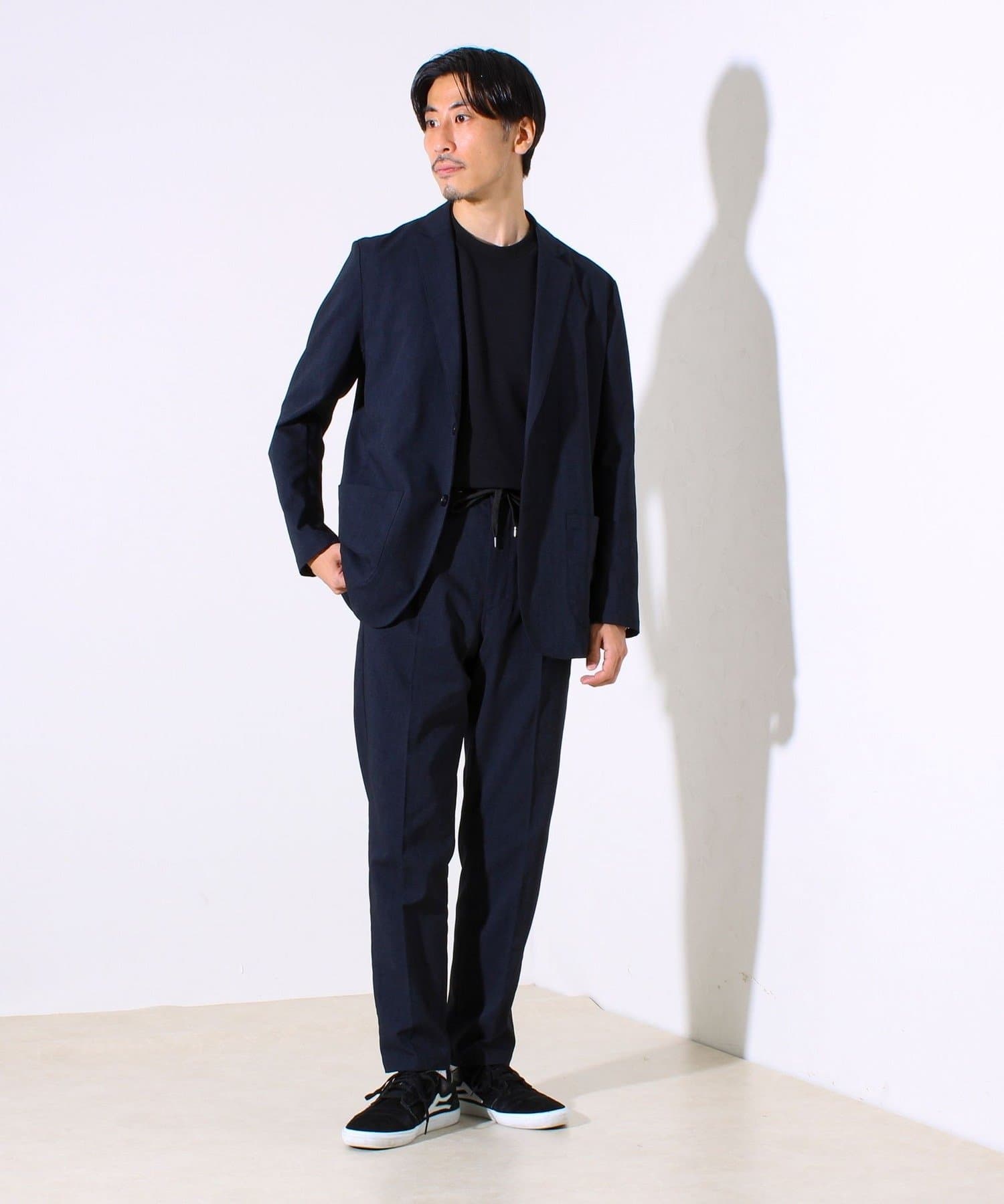 Tシャツ+スニーカーで着崩してもOK。シワになりにくく、外出にも最適。