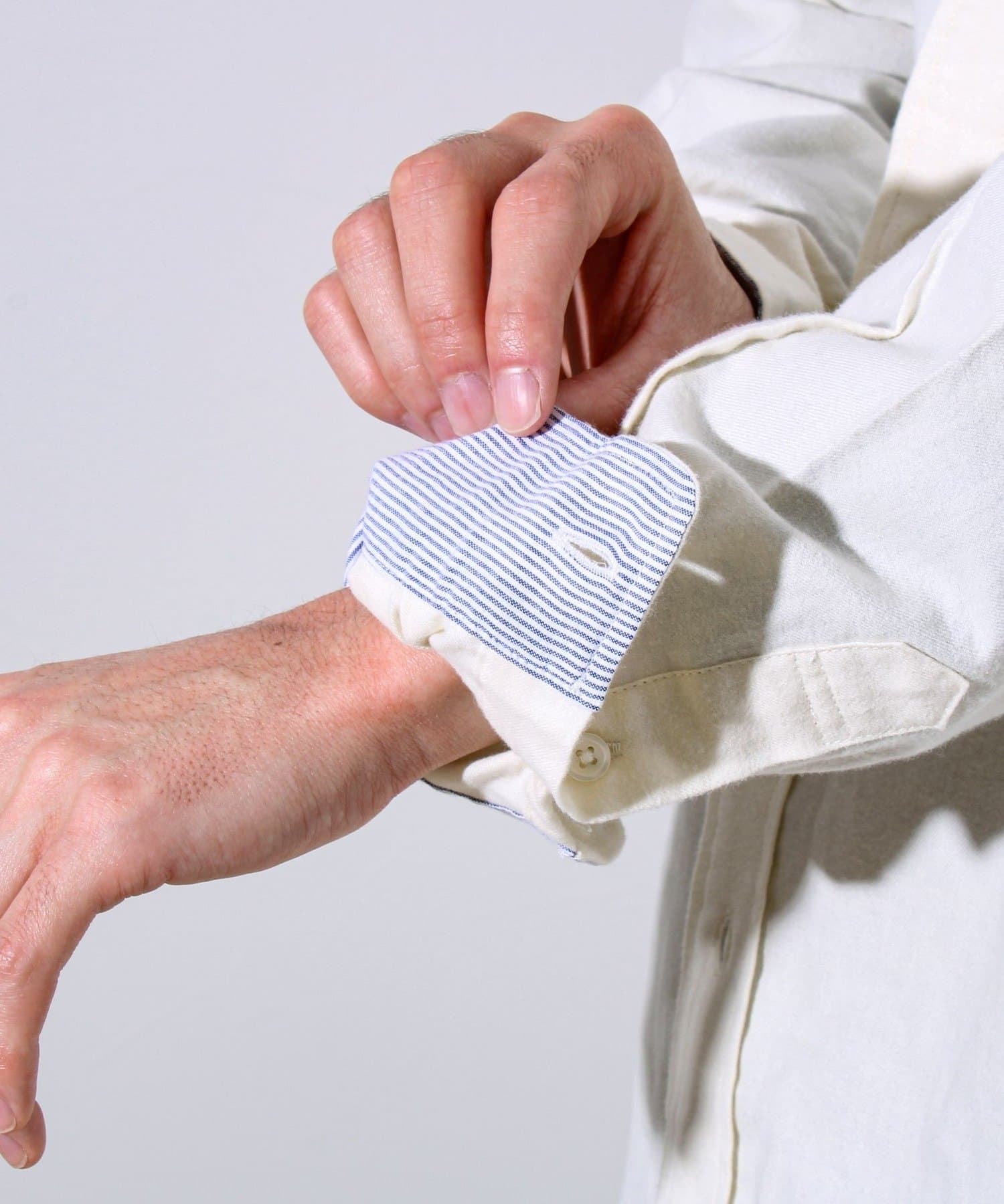 ・袖裏にはストライプ地を配し、ロールアップ時も洒落感を演出