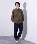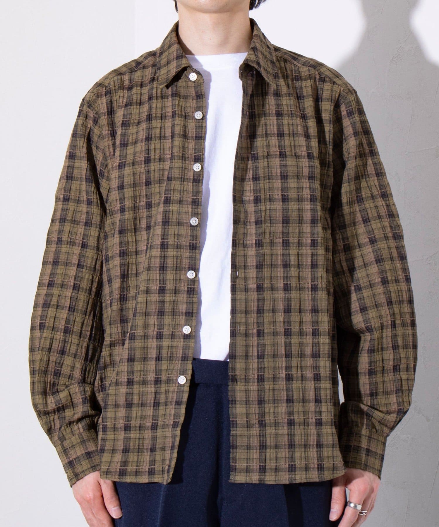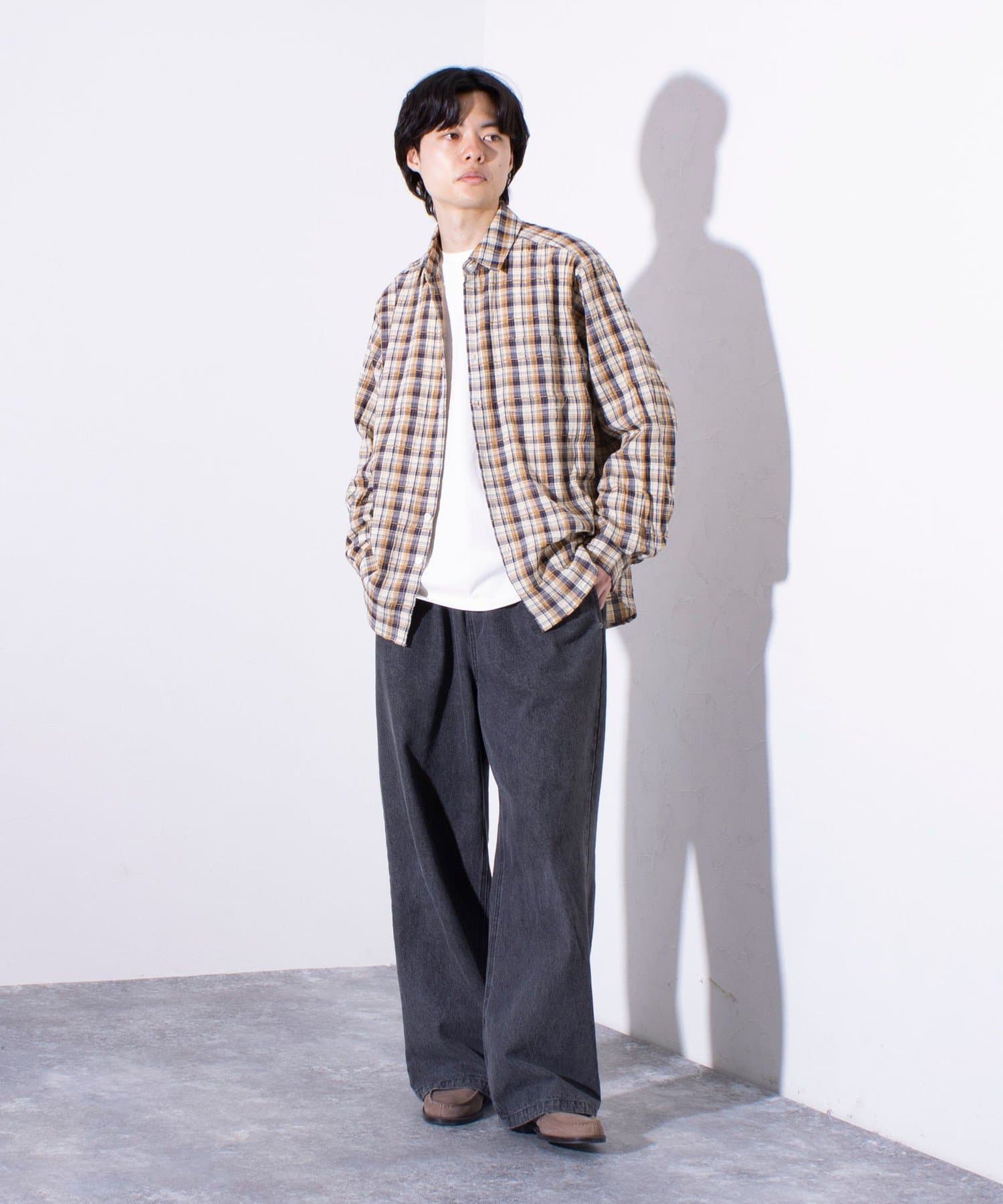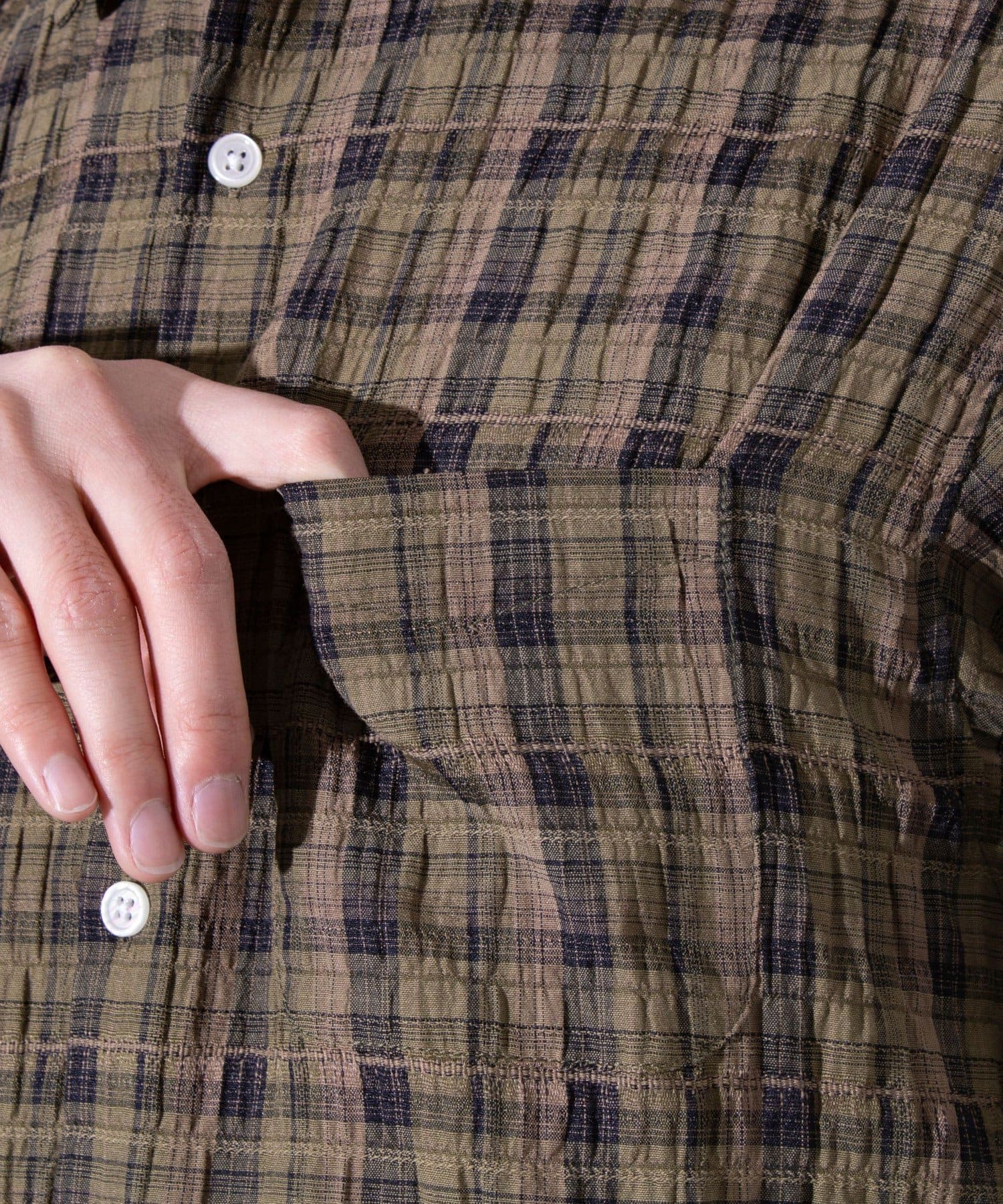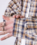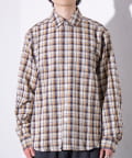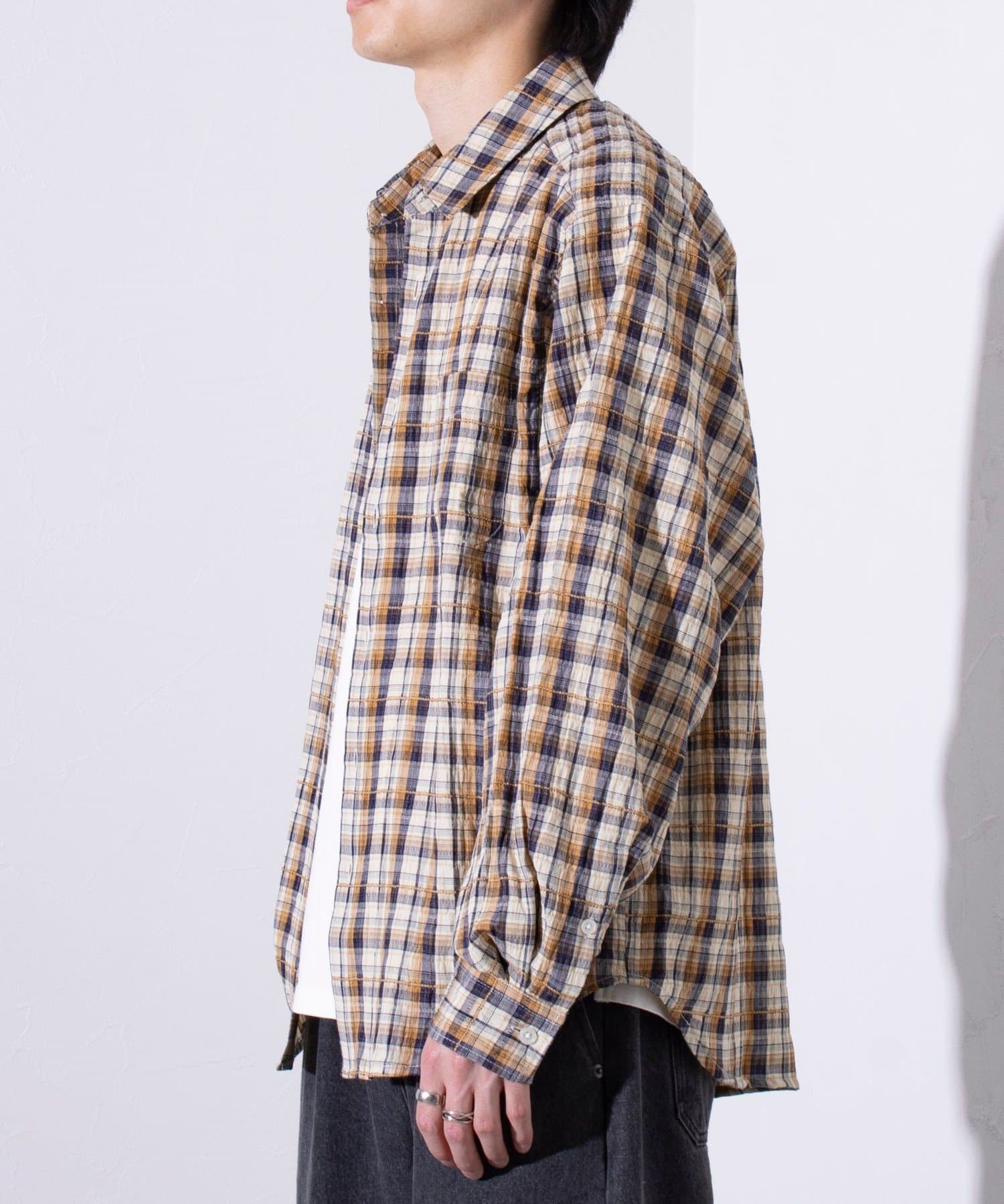 麻のような風合いの生地を使用したチェックシャツ