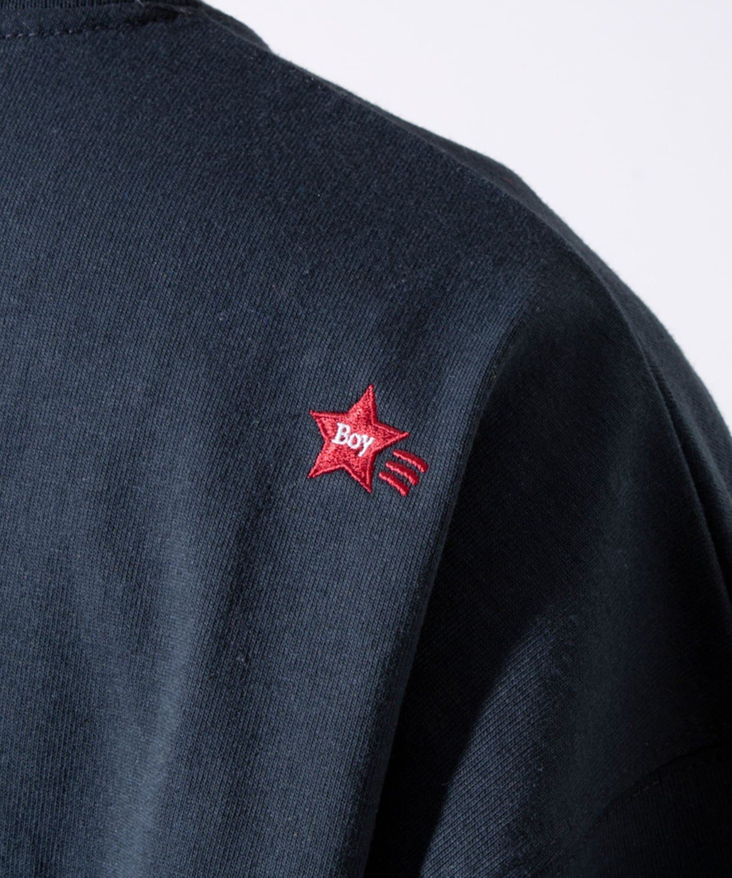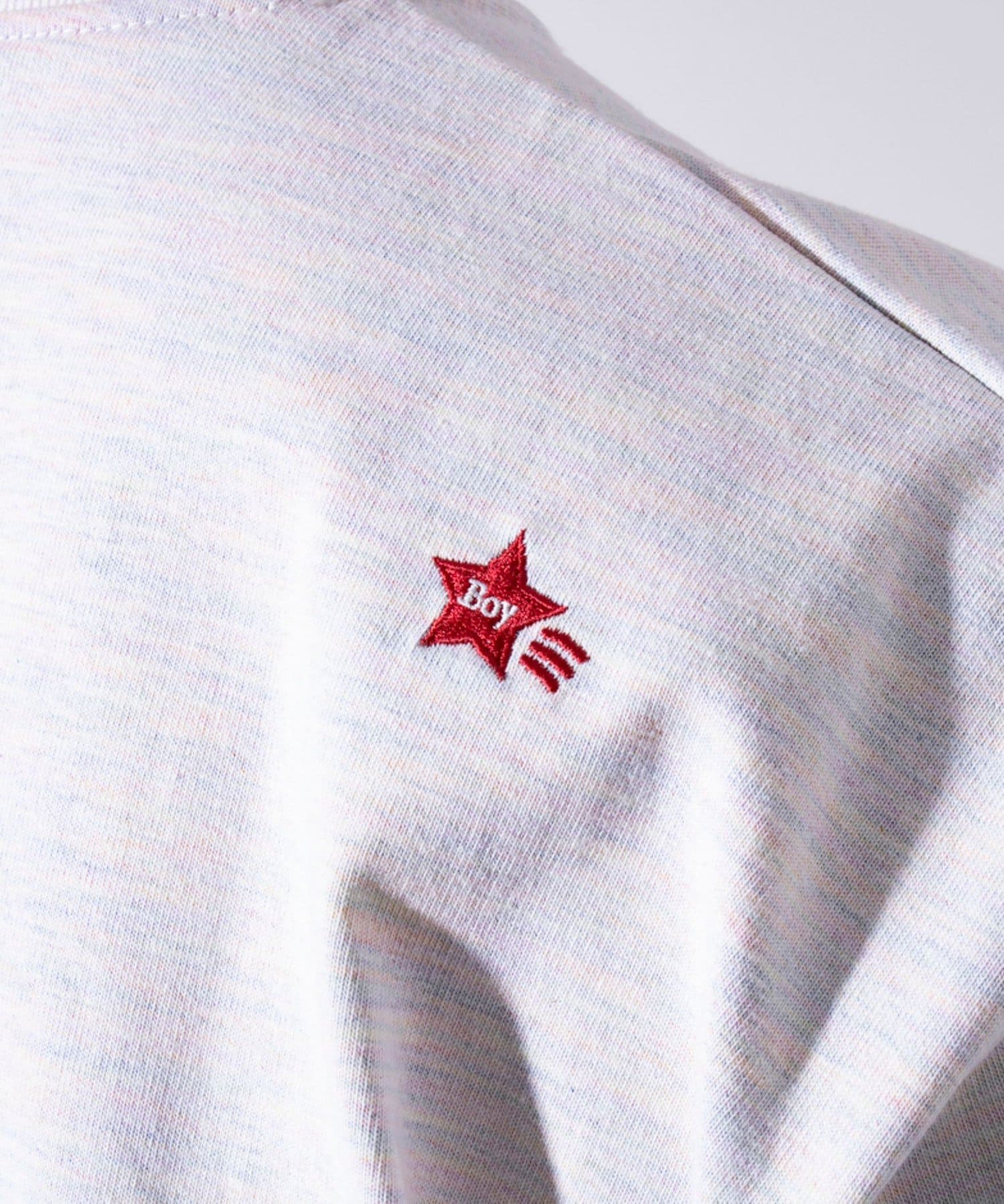 ・胸元にワンポイントBOY刺繍、BOYの指す先、背面肩部分には流れる星が、、