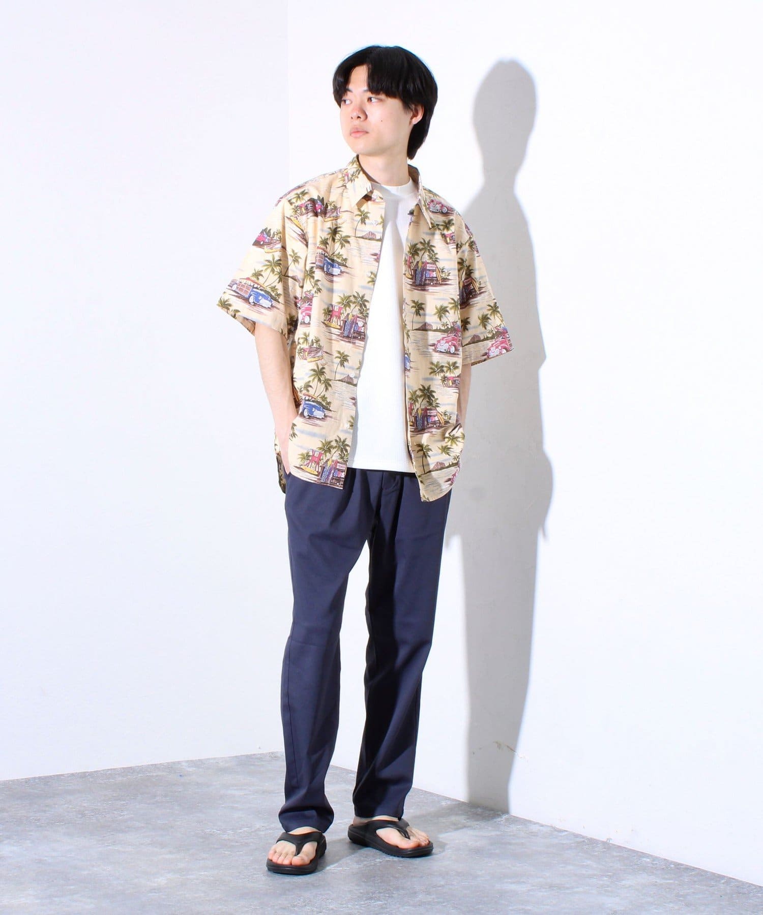 夏定番のアロハシャツをレギュラーカラーを採用することで上品な印象に仕上がりました。