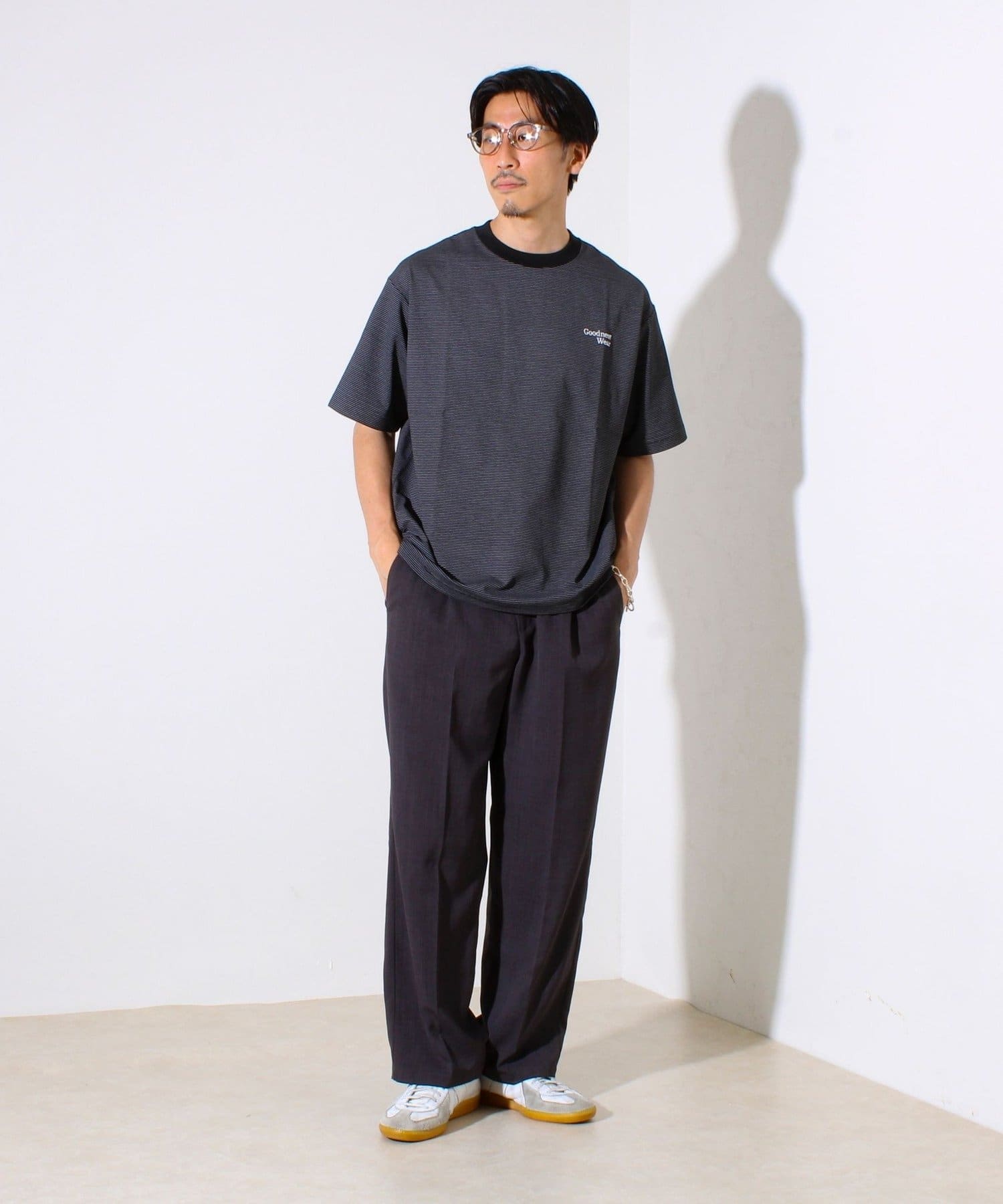 ・シティライクに:テーパードパンツ+レザー小物で、都会的なきれいめカジュアルに。
